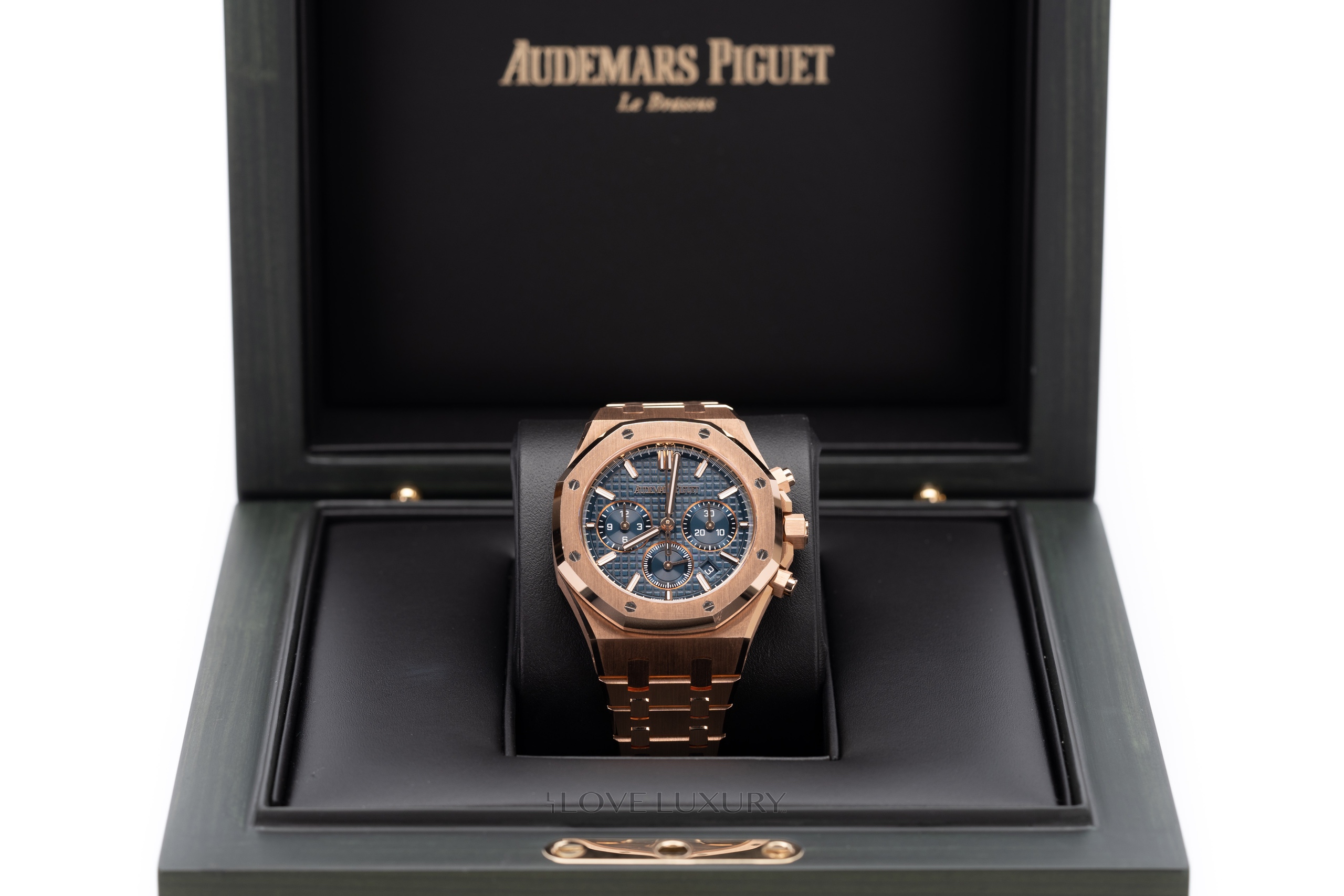 Dial: “Bleu nuit nuage 50” dial with “Grande Tapisserie” pattern, “Bleu nuit nuage 50” counters, pink gold applied hour-markers and Royal Oak hands with luminescent coating.