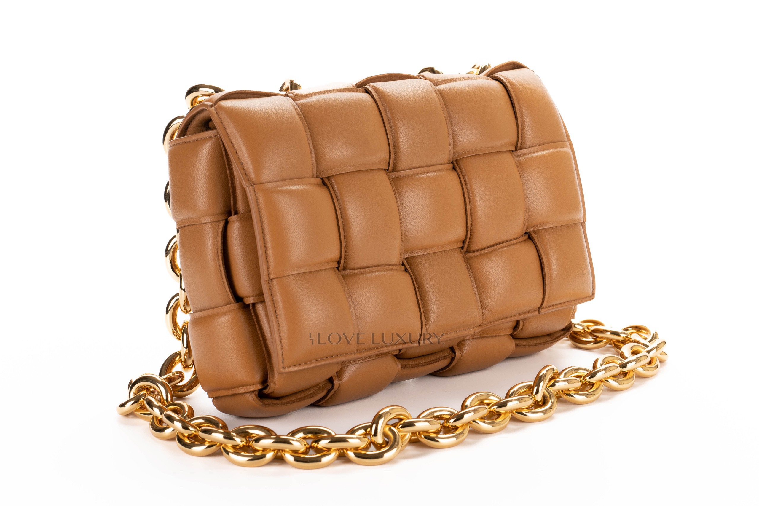 The Bottega Vaneta Cassette bag is a highly sought after bag, this is a jumbo woven leather bag with a thick and chunky chain. The caramel leather is complimented by the gold hardware. This Bottega leather is a sumptious, silky, soft material that is a true representation of the finest italian lether. This bag is in very lightly pre-loved condition.