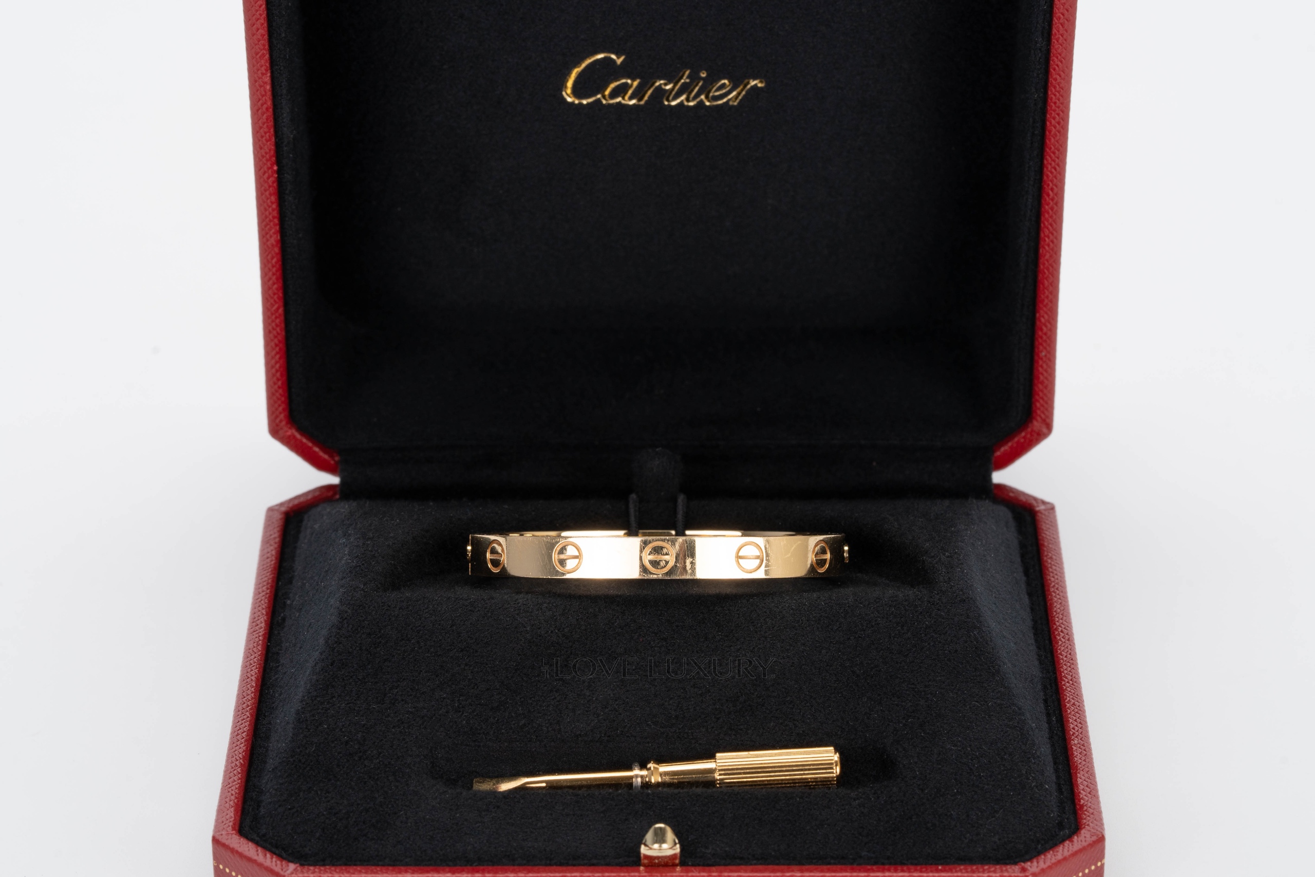 Yellow Gold 18k 750/1000 Love Bangle, Created in New York in 1969. This bangle is fastened with its own specific screwdriver. Size is 15cm. Condition: Excellent preloved condition. This bangle comes as a full set.