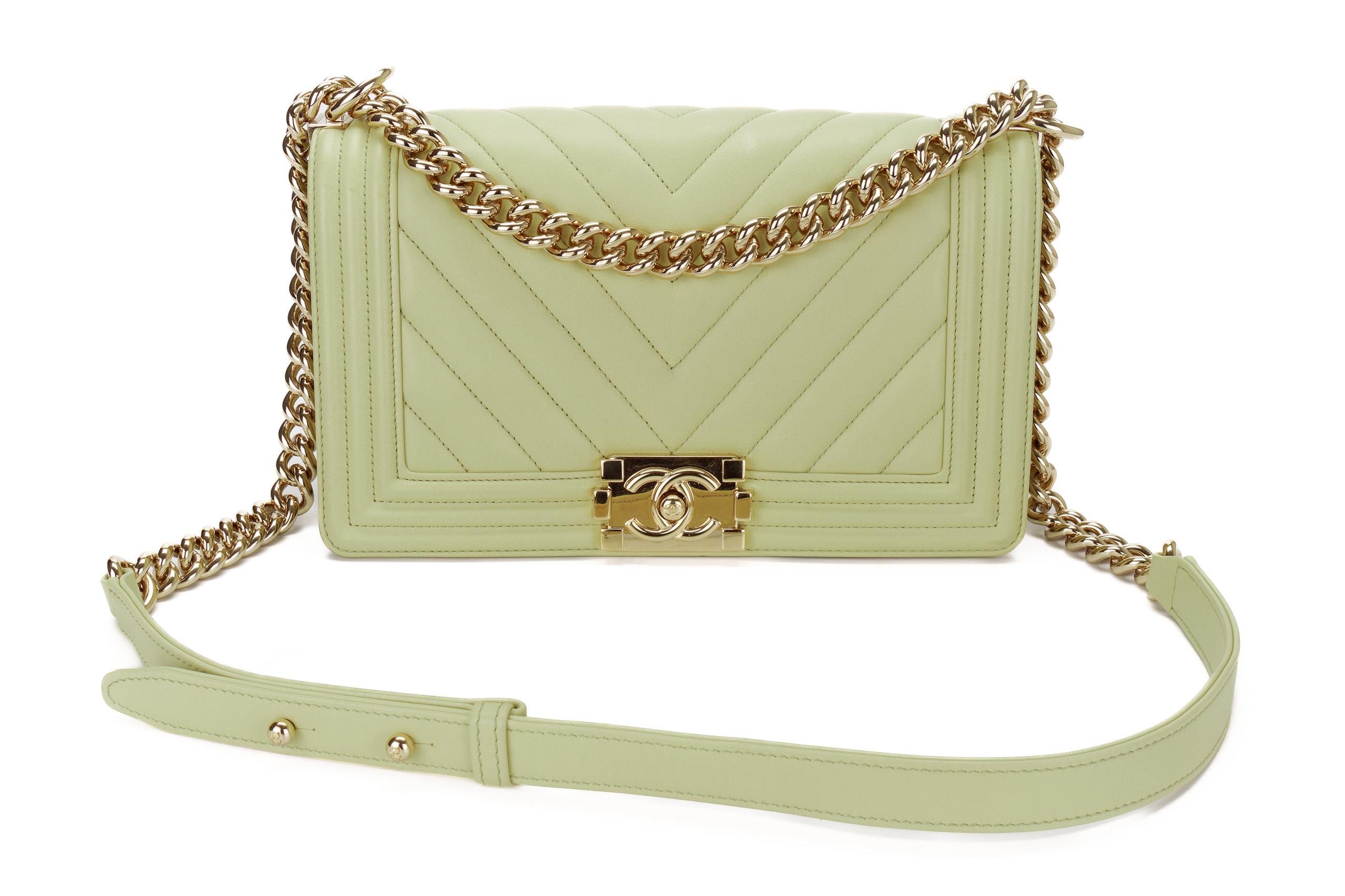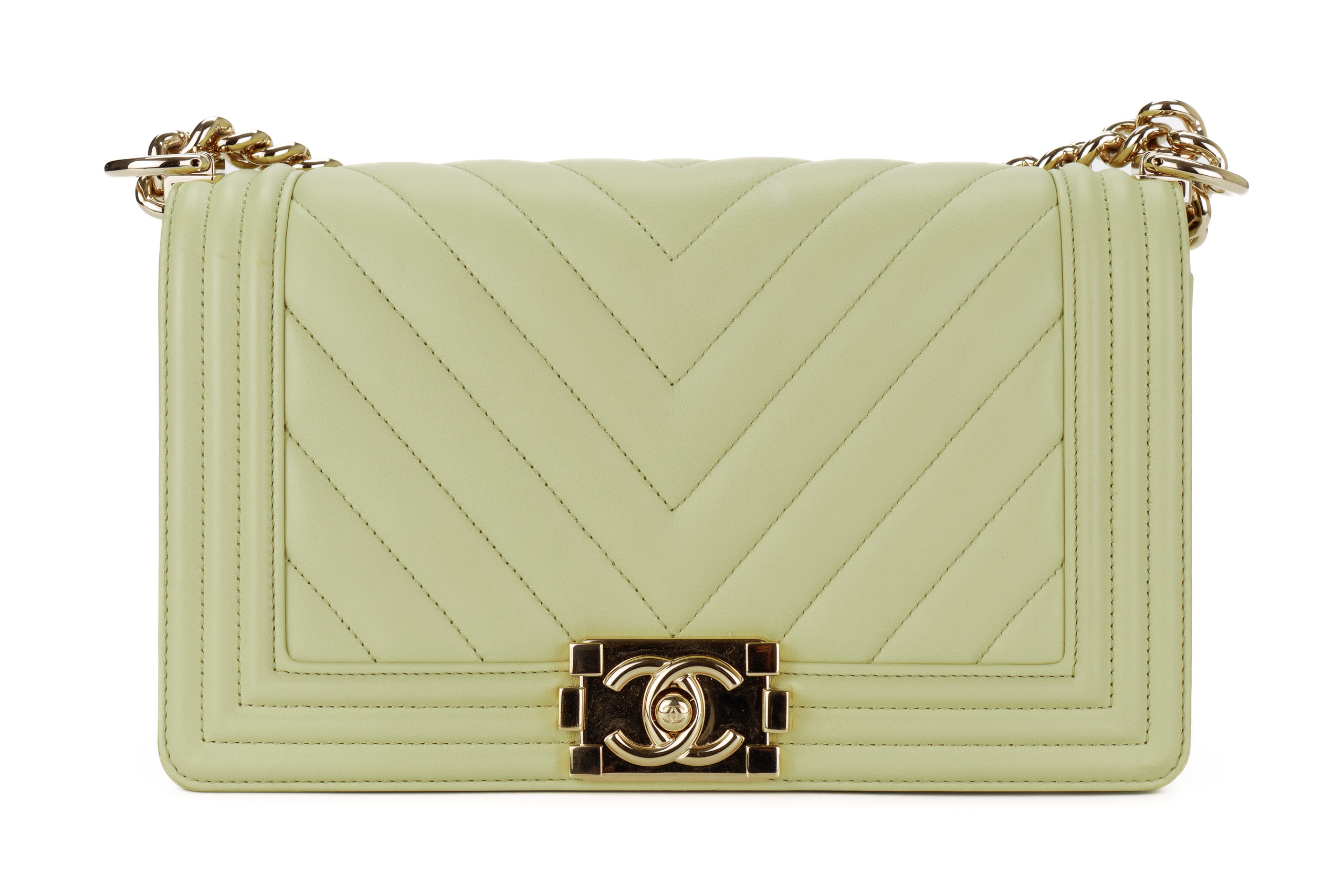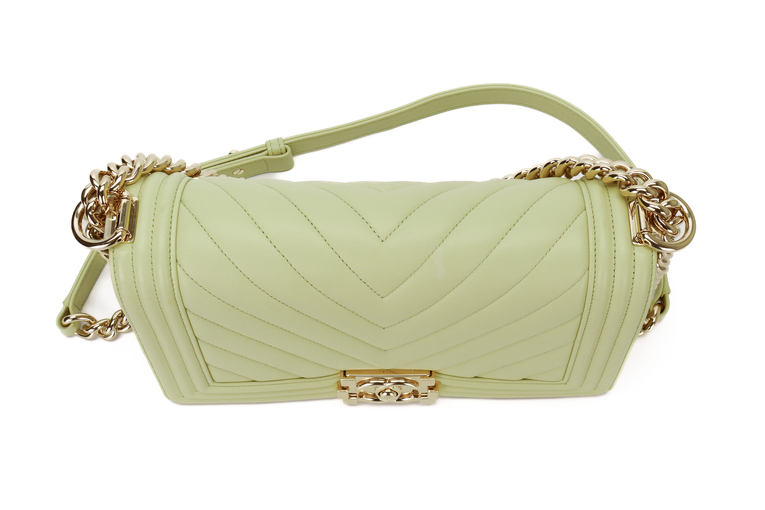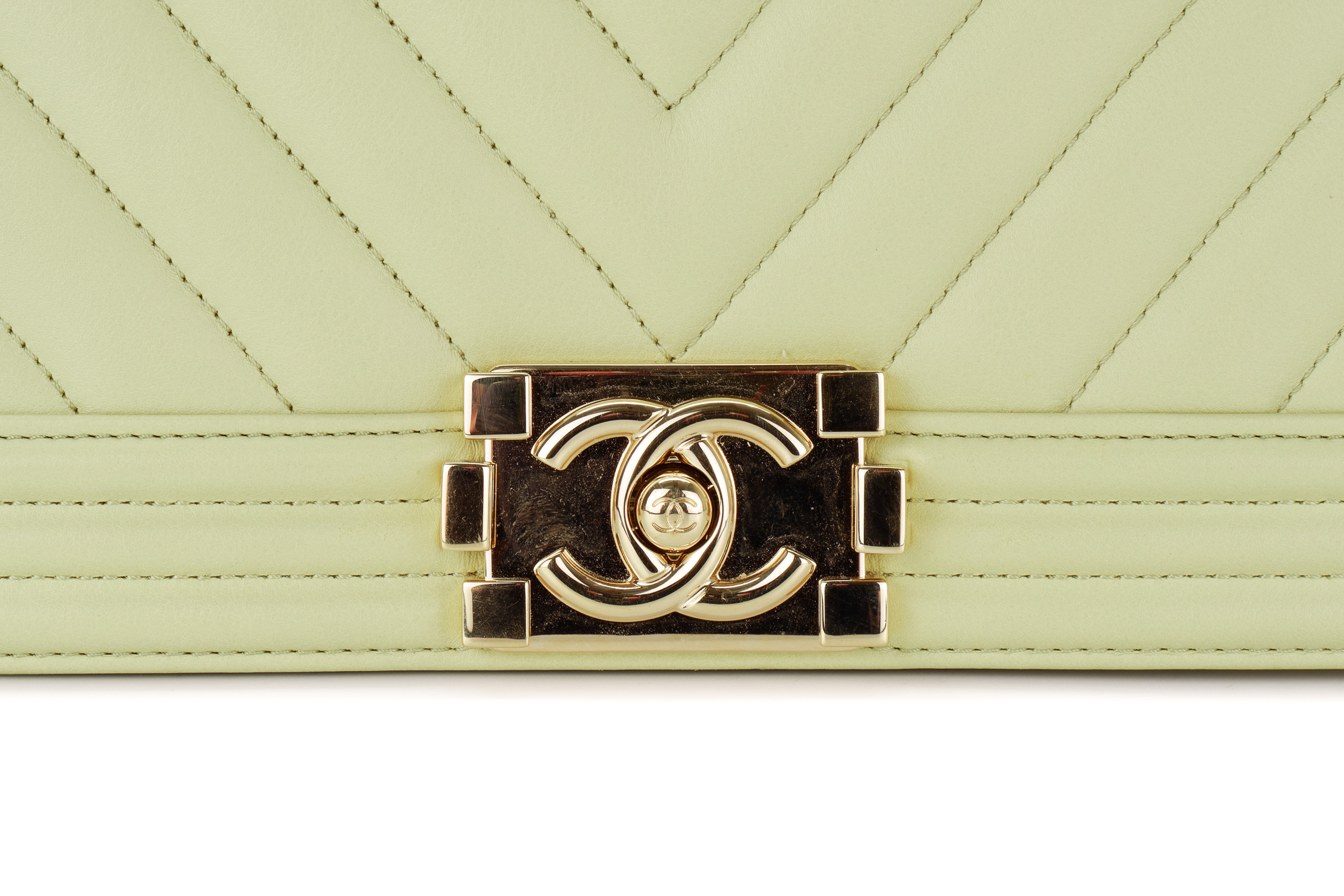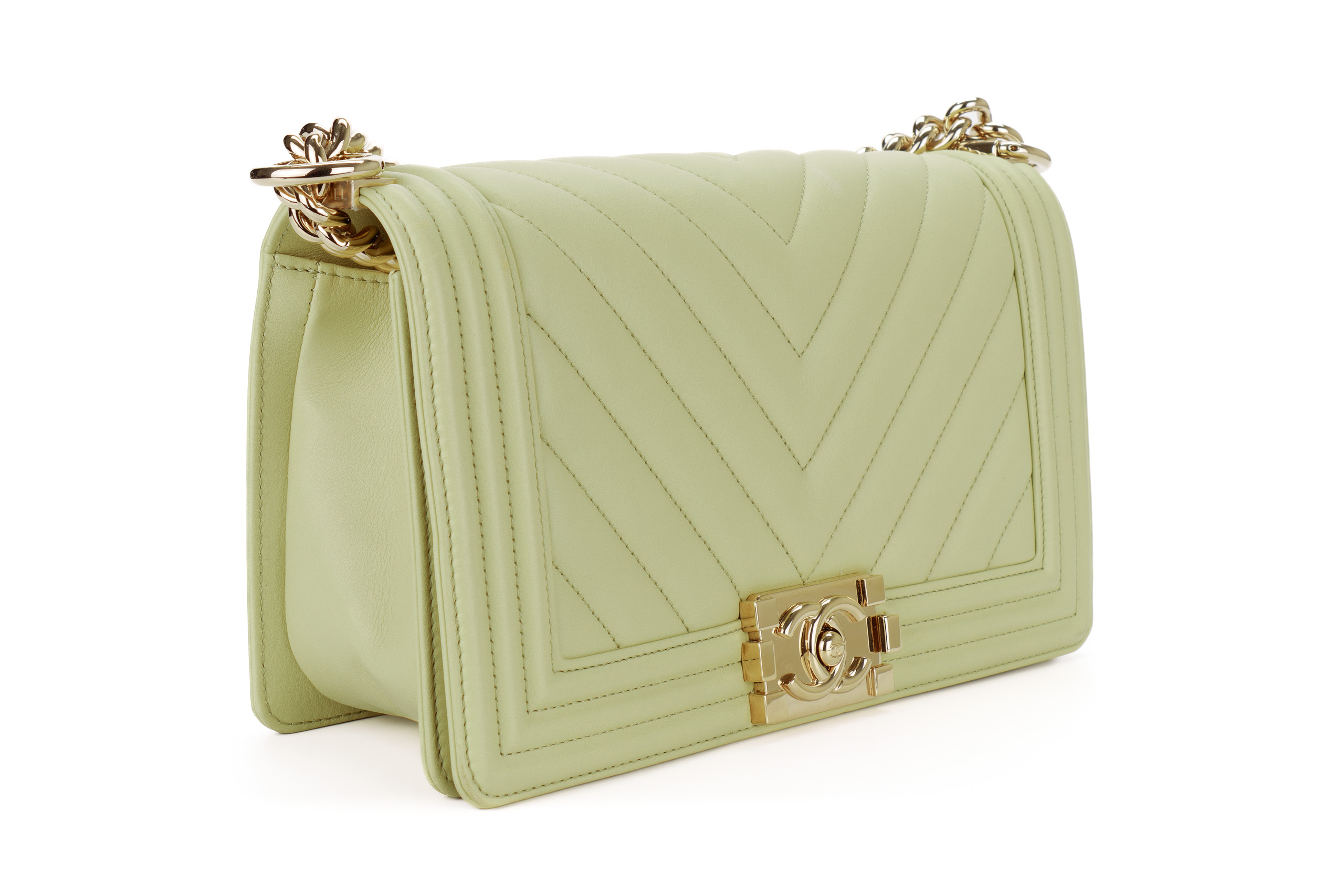 Chanel Boy Medium Lime Yellow Chevron Lambskin Champagne Hardware / Microchipped 2021 Pre-Loved condition