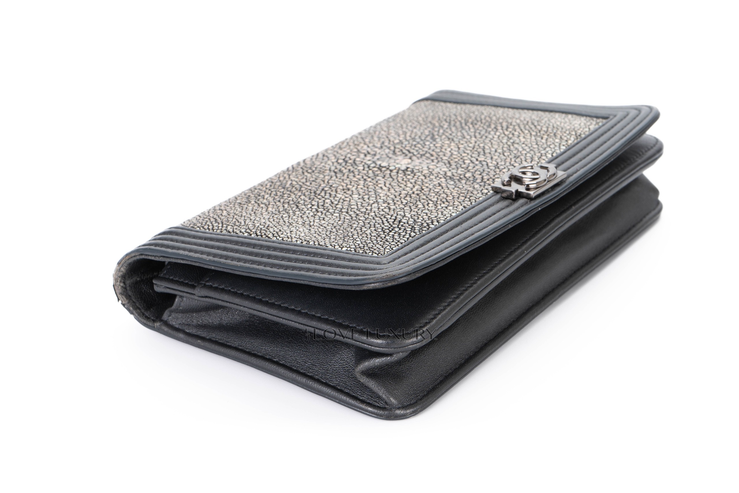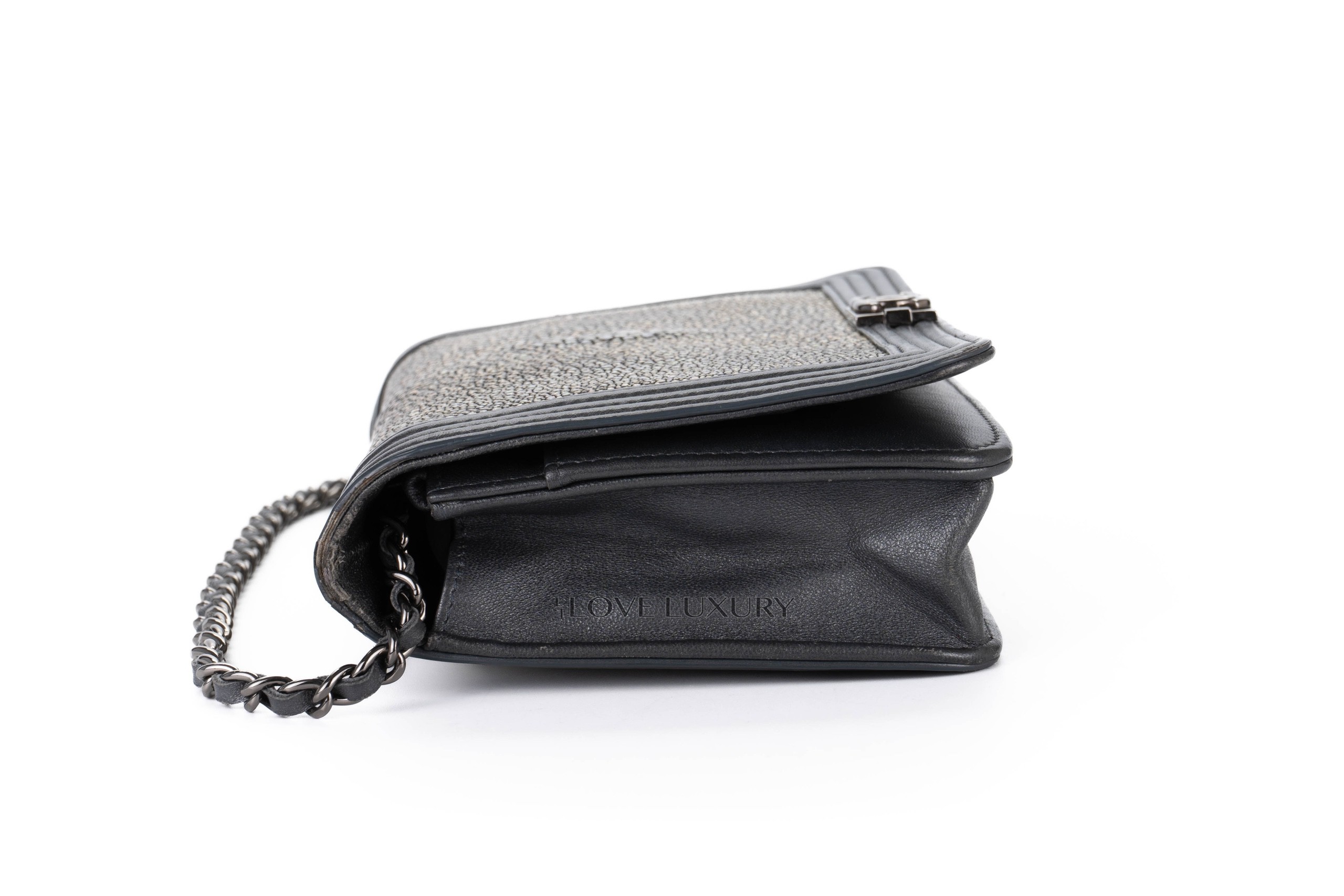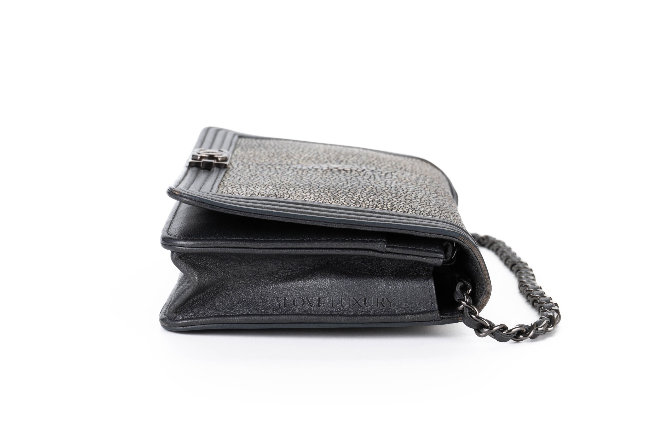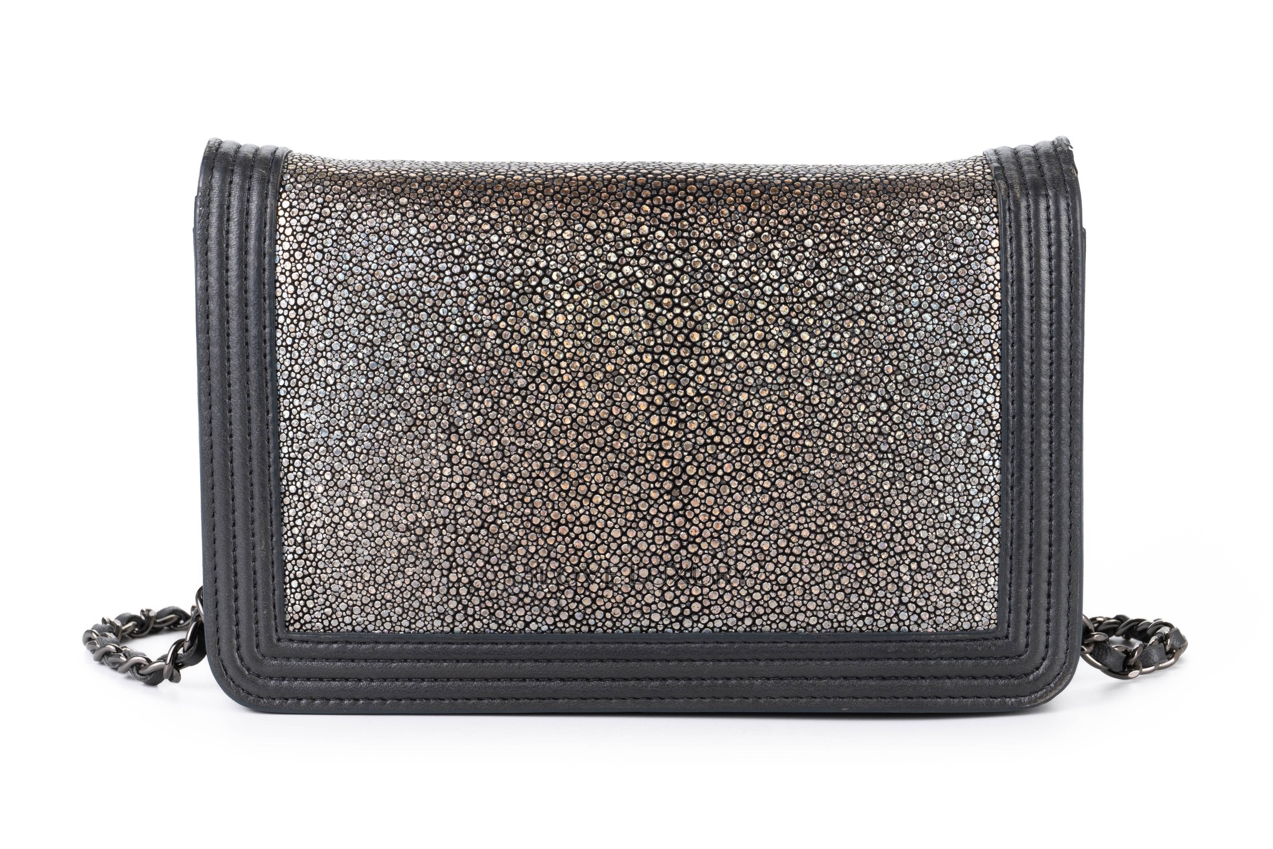 Chanel Boy Wallet on Chain Stingray Lambskin Grey Silver Hardware / 21 series 2015-16 Pre-Loved condition