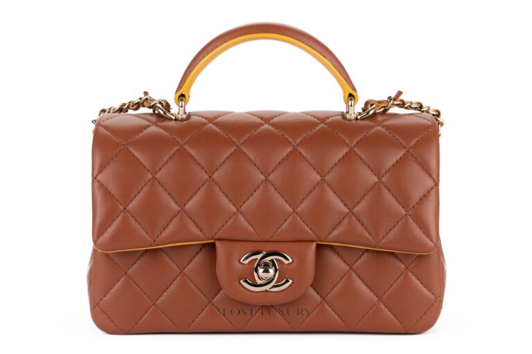 Chanel Mini Flap Bag Top Handle Brown & Yellow Lambskin Light Gold Hardware