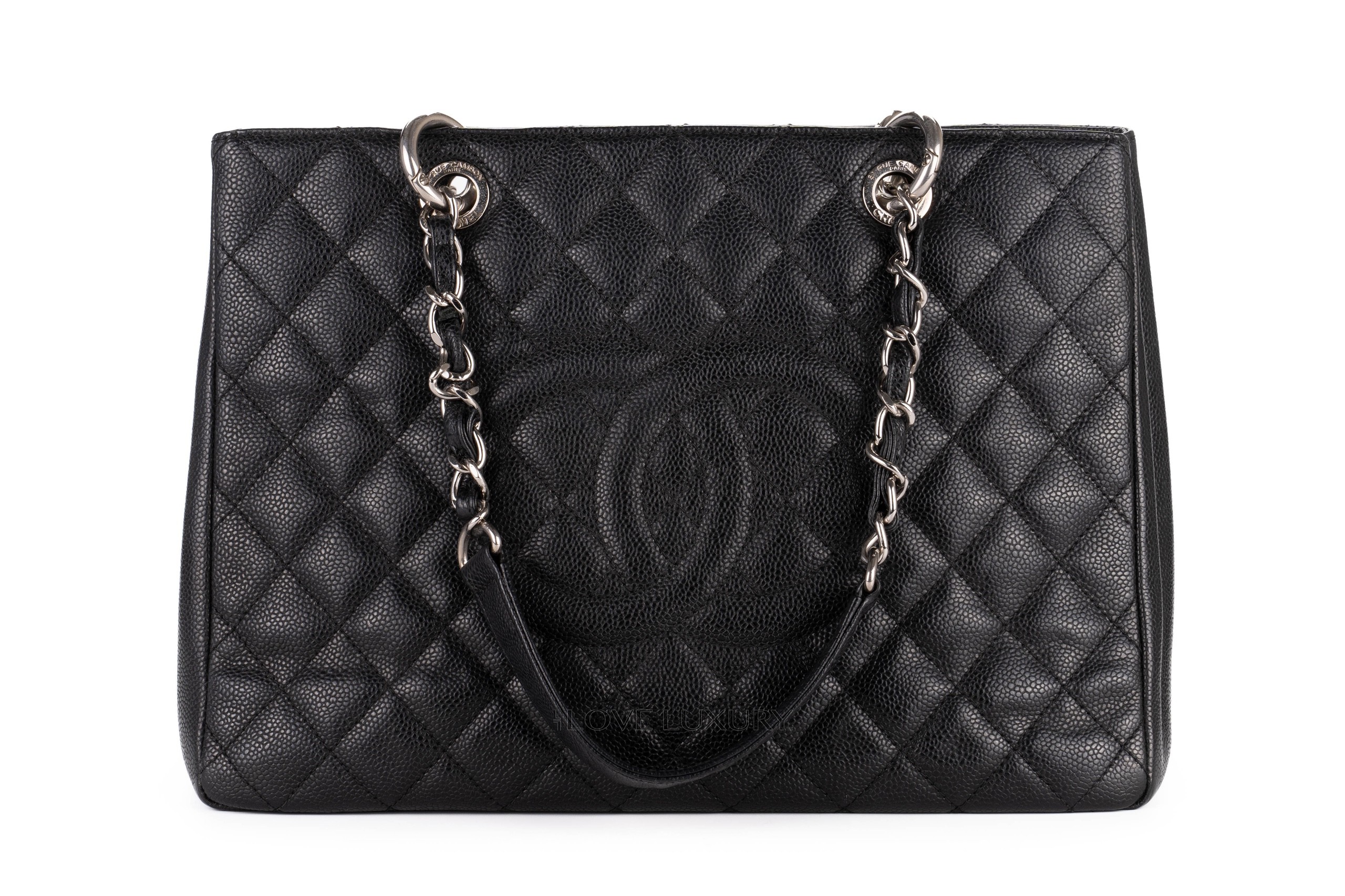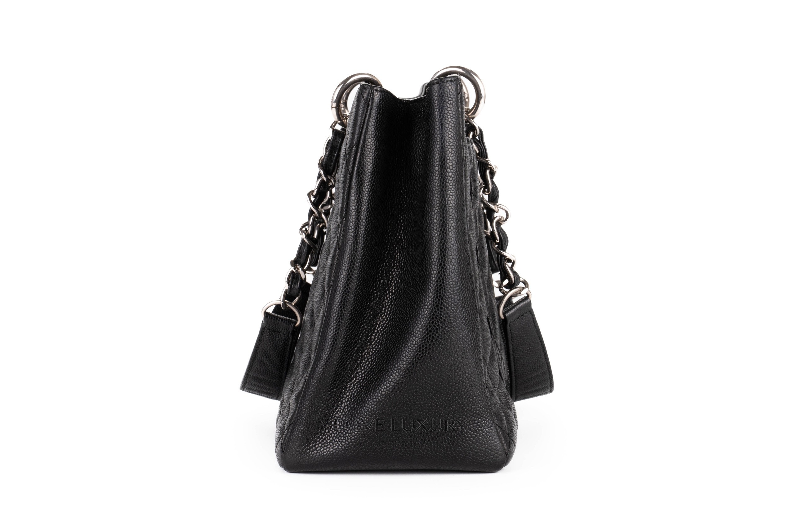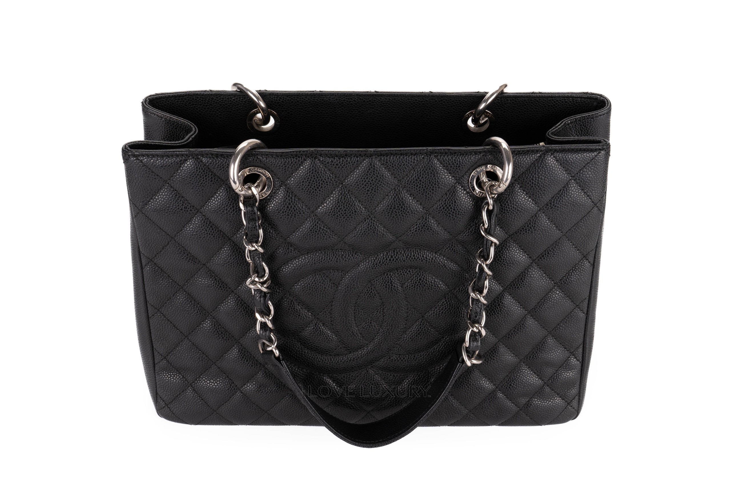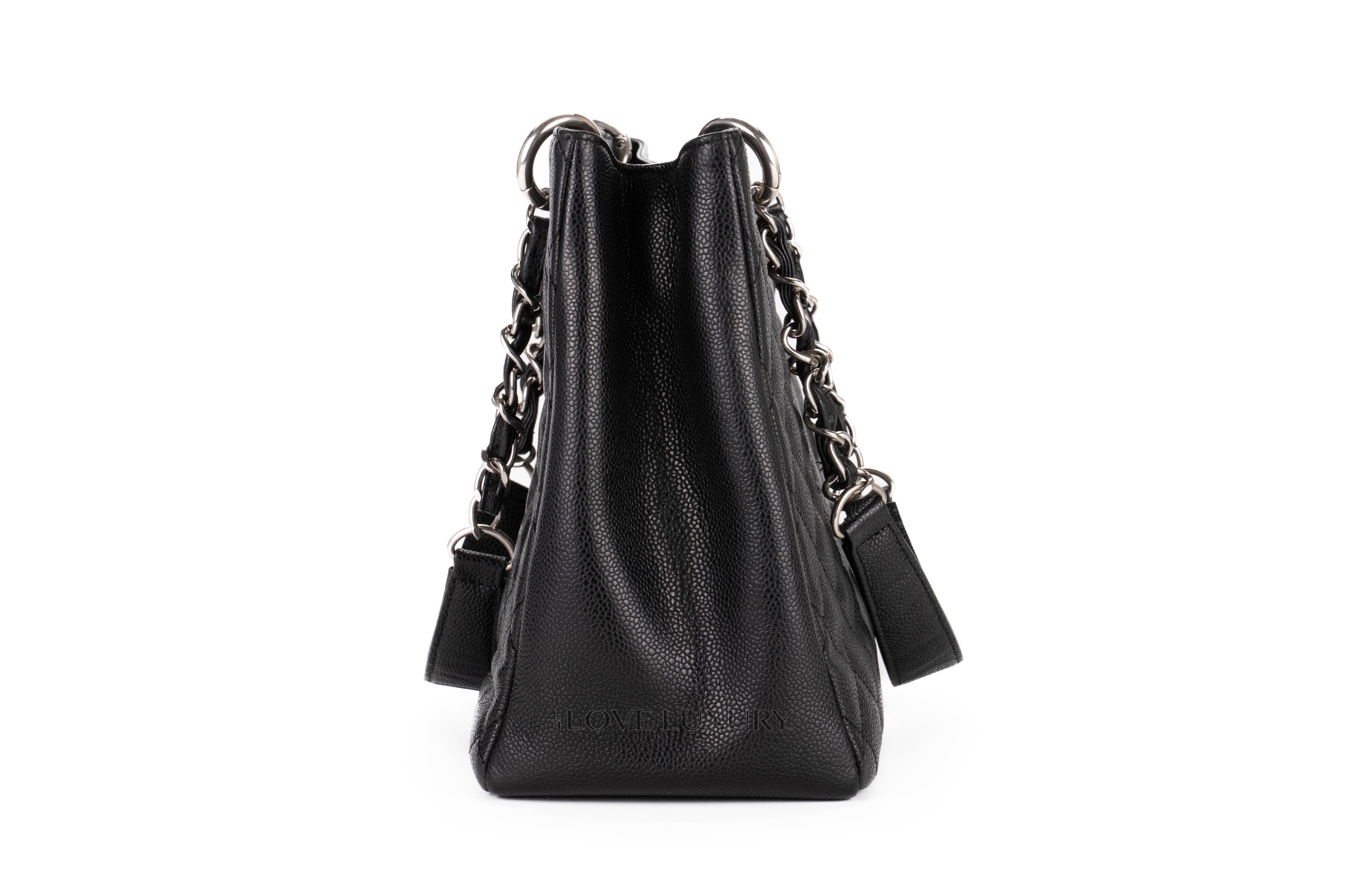 The Chanel GST is a now discontinued bag, the last of these bags were produced in 2014. This bag has a double chain strap with leather shoulder straps for comfort. Internally there are multi pockets including a zipper compartment. This bag is big enough to fit all of your work and daily needs and also works well as a bag for travelling. This is the standard GST size which is substantially smaller than the GST XL. The GST Grand Shoppoing Tote is crafted from caviar leather and accented with shiny Silver hardware.