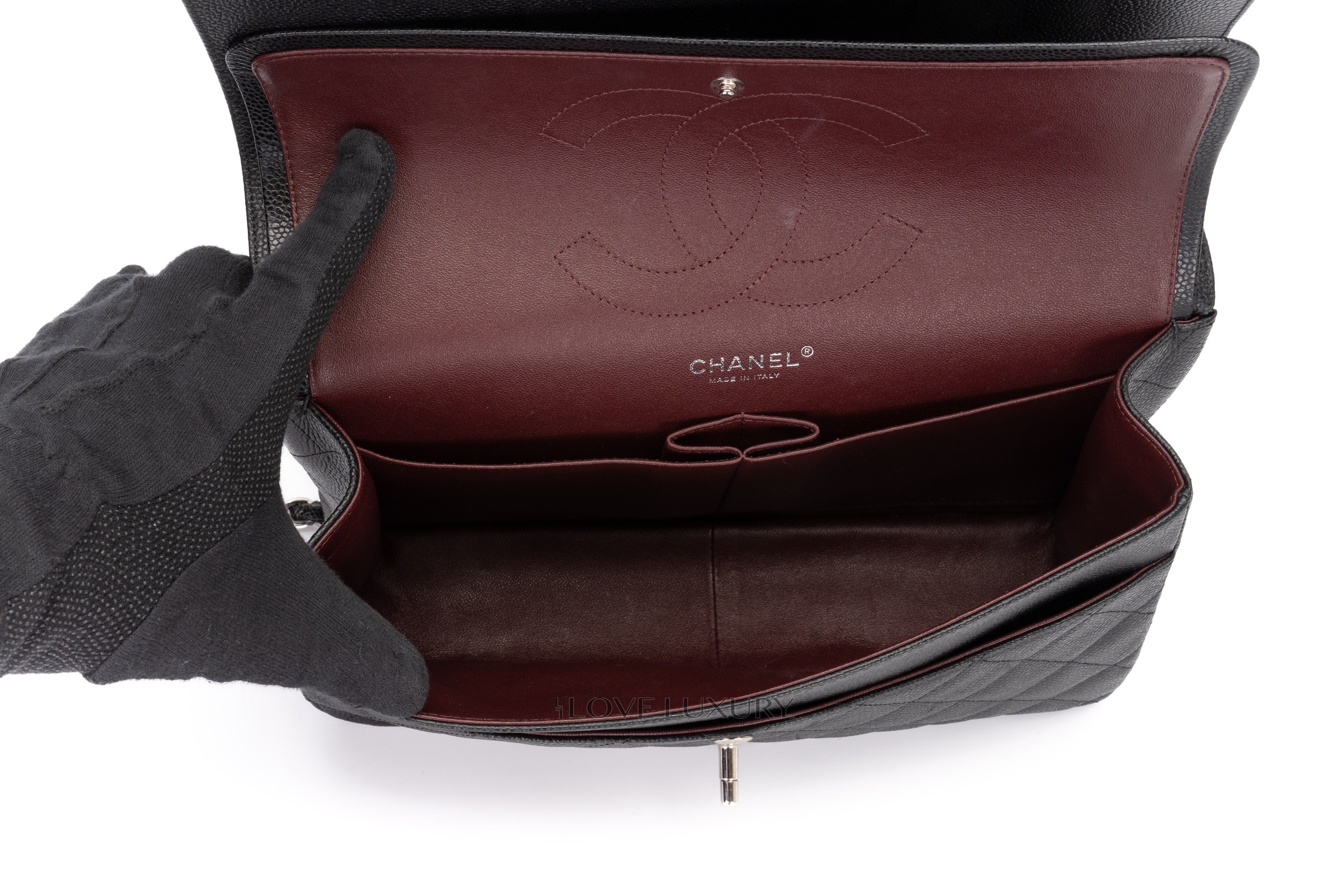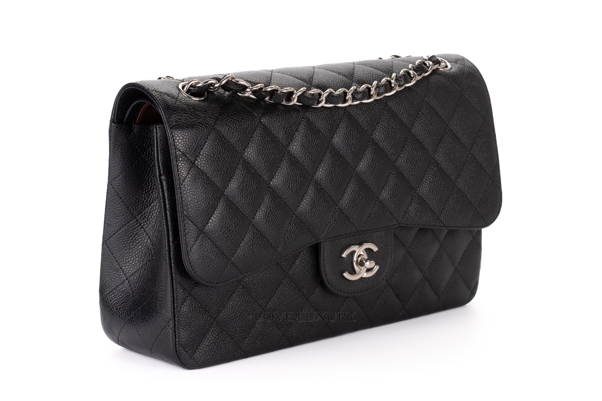As one of the larger models in the Classic flap collection this bag carries everything you need, it can be worn cross-body or on the shoulder. This model is complimented by the silver hardware and Bordeaux lining. This bag comes in a pre-loved condition please refer to the images closely for a detailed view.