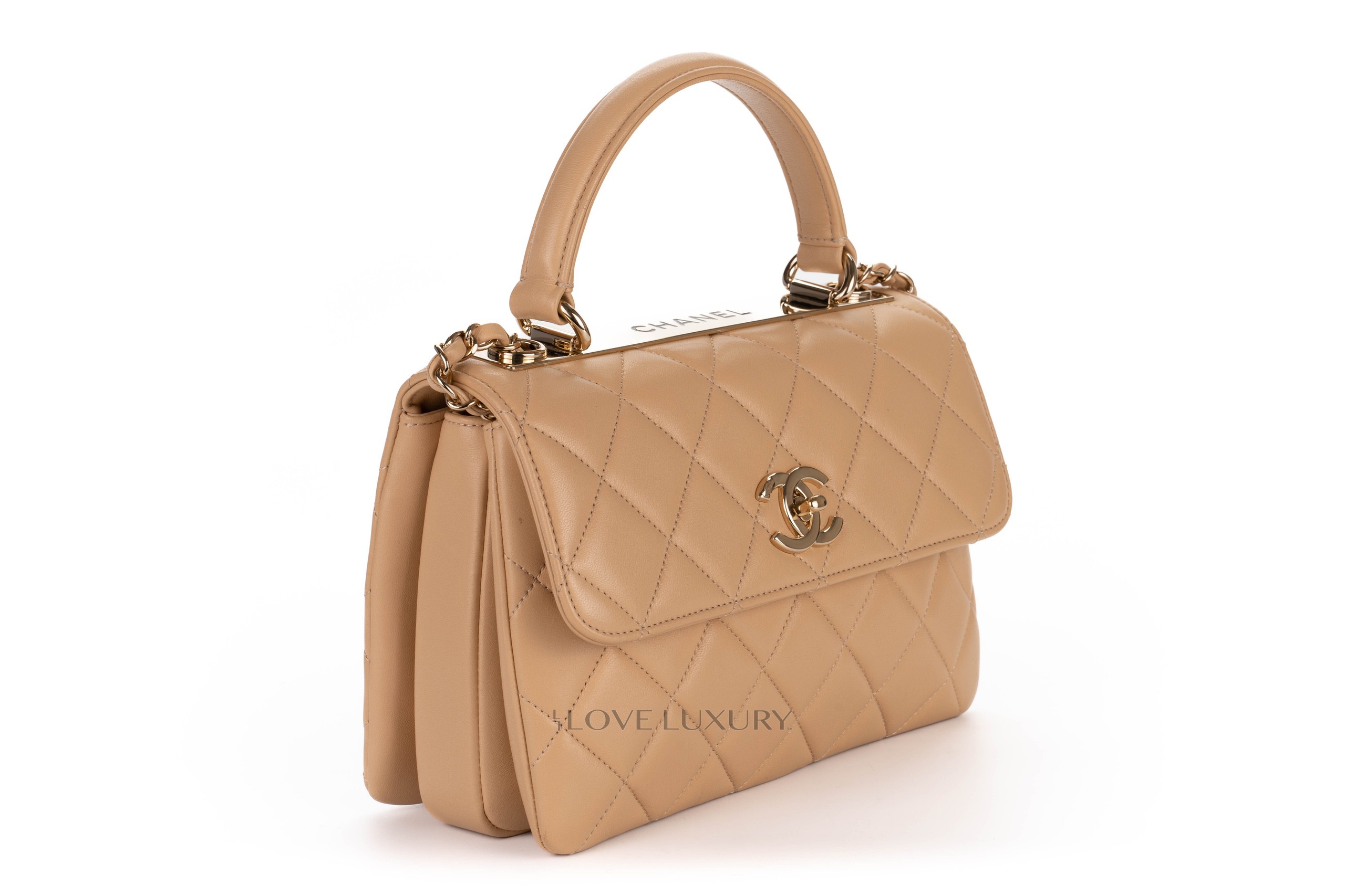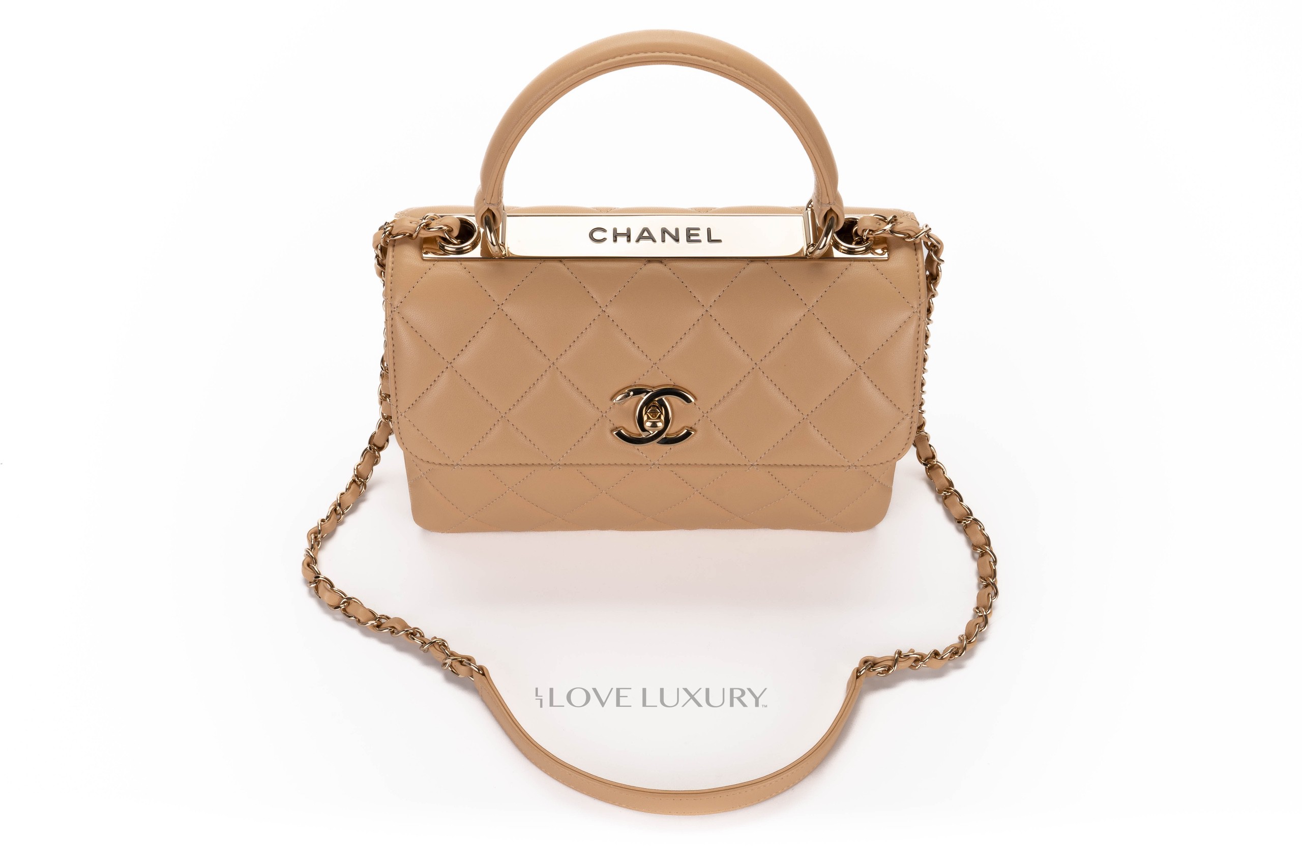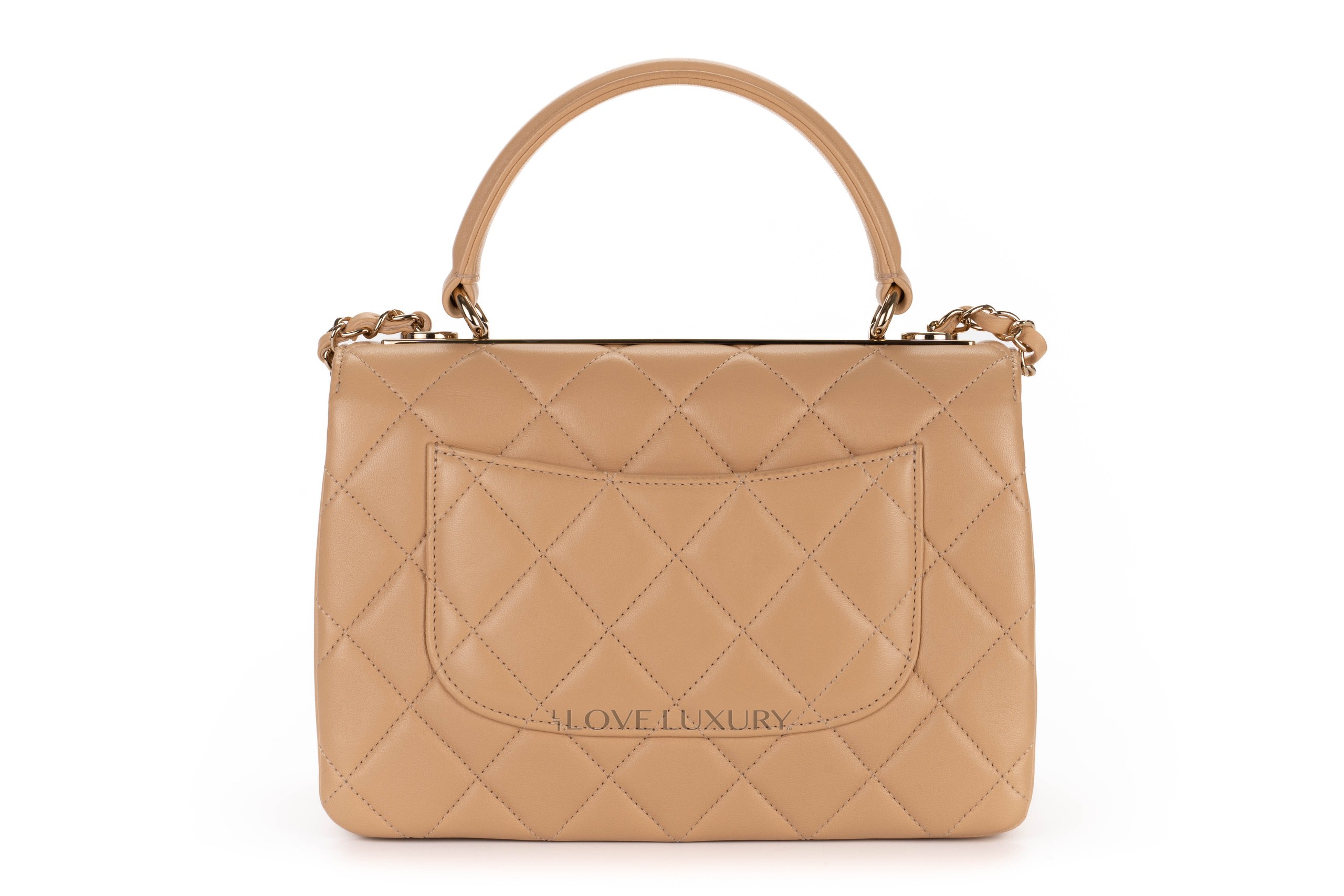 The Chanel Trendy CC was first launched in 2014 as a seasonal bag, then due to such huge demand Chanel decided to make it a permanent collection. This particular model is crafted from lambskin in beige with gold hardware with the famous diamond quilt design. This bag comes as a full set and in excellent pre-loved condition. Please view images and videos.
