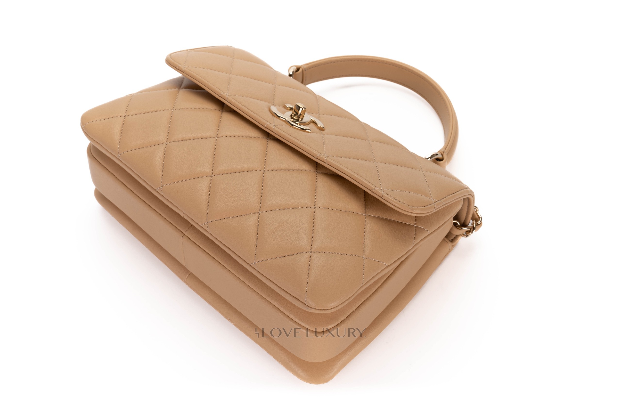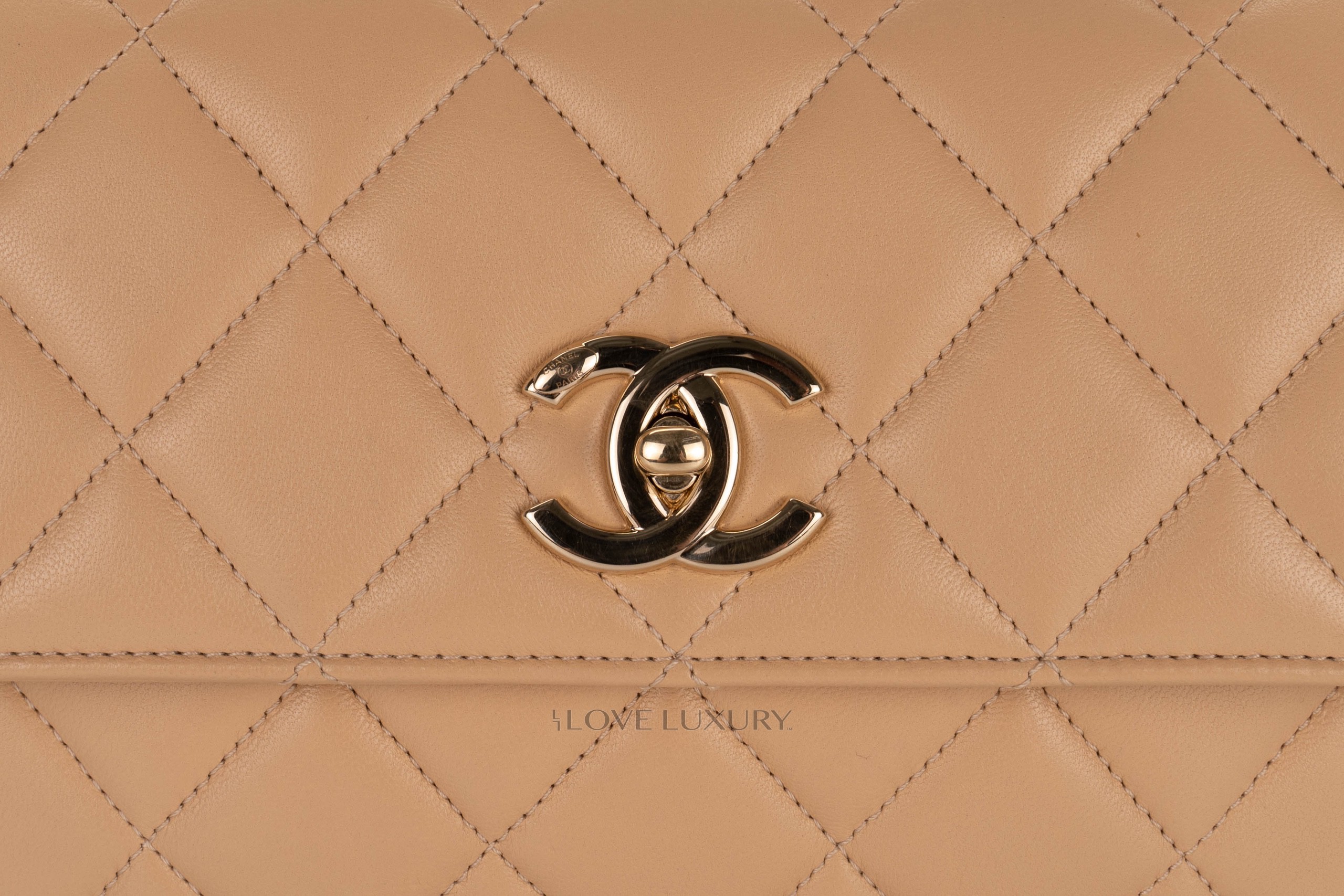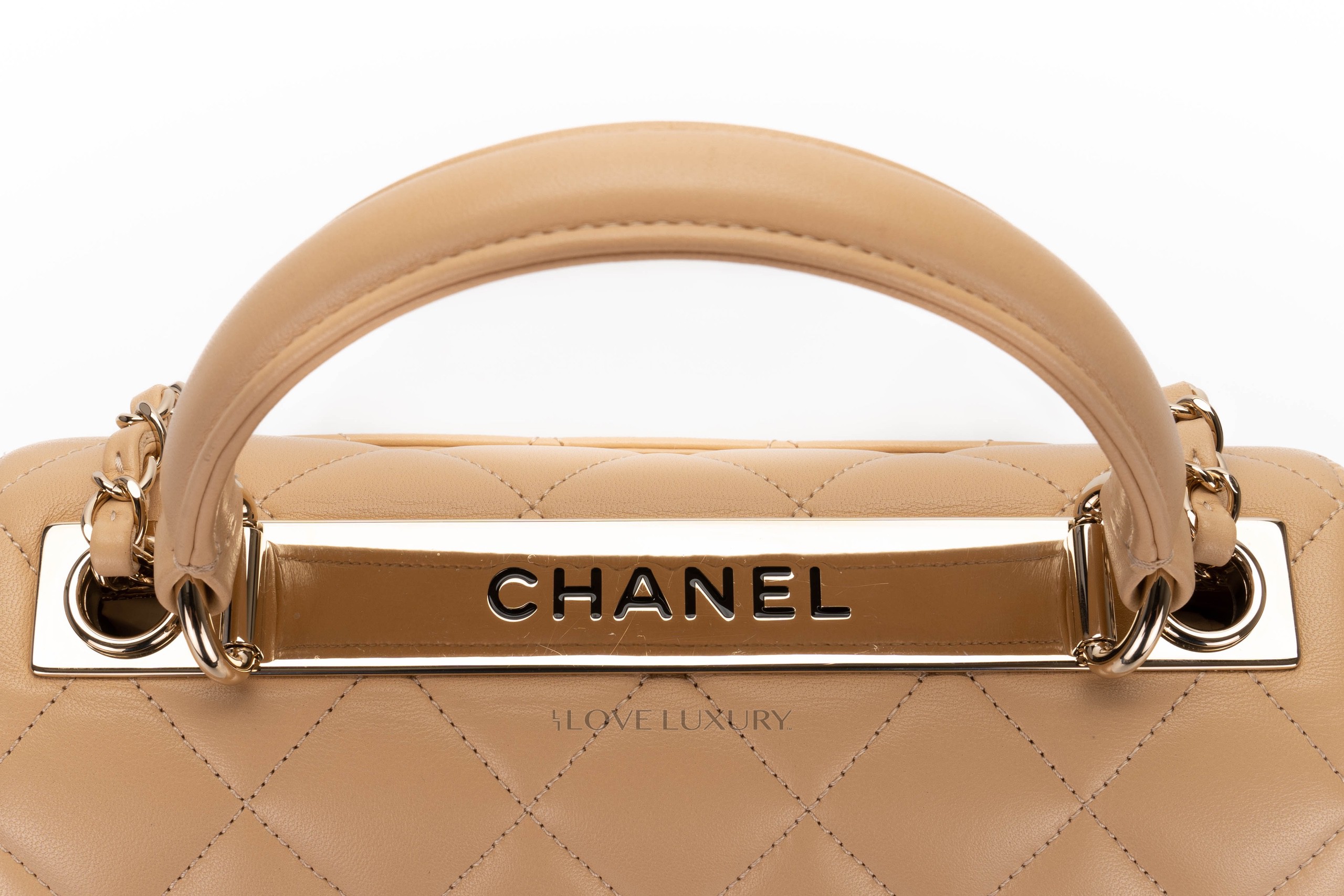 The Chanel Trendy CC was first launched in 2014 as a seasonal bag, then due to such huge demand Chanel decided to make it a permanent collection. This particular model is crafted from lambskin in beige with gold hardware with the famous diamond quilt design. This bag comes as a full set and in excellent pre-loved condition. Please view images and videos.