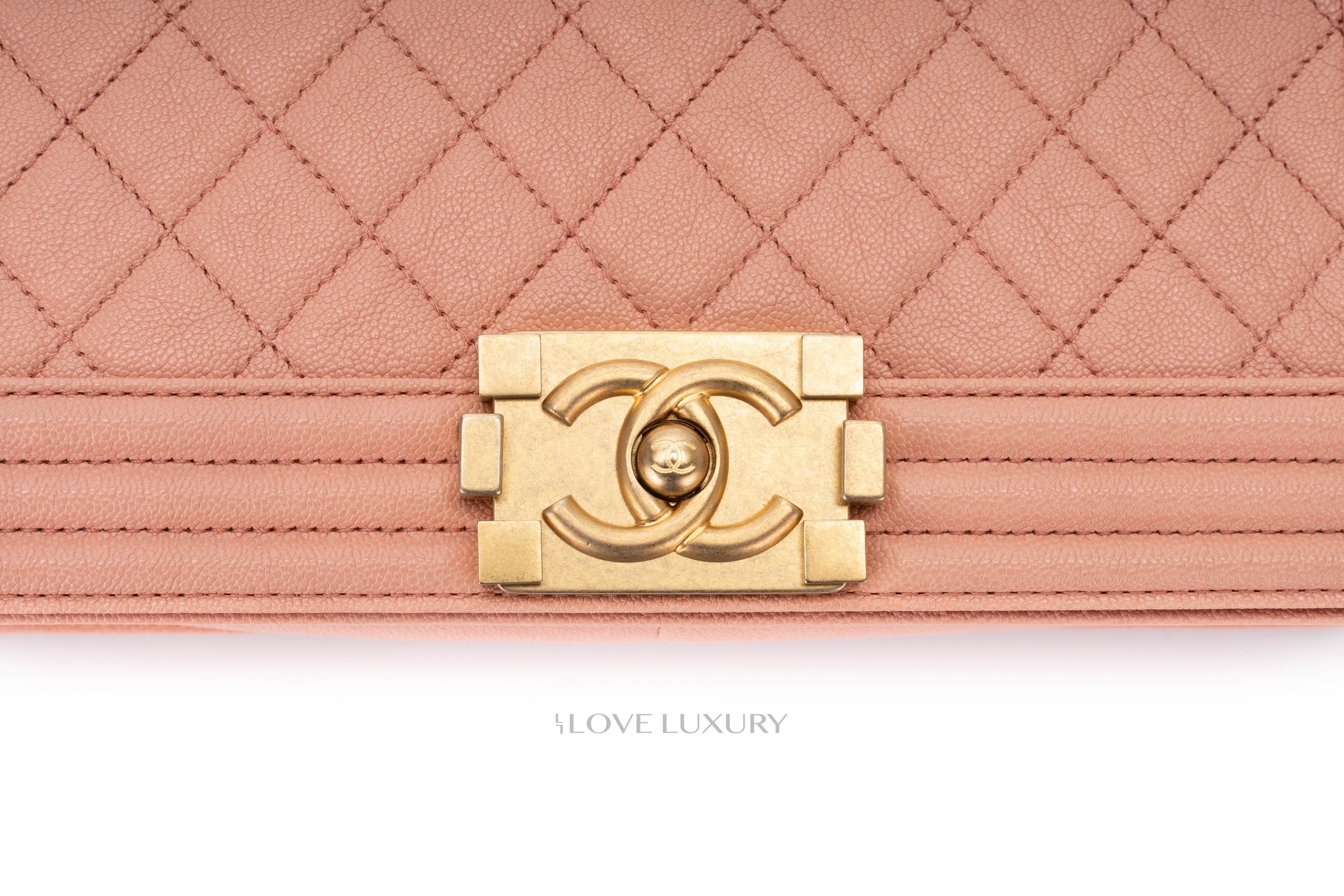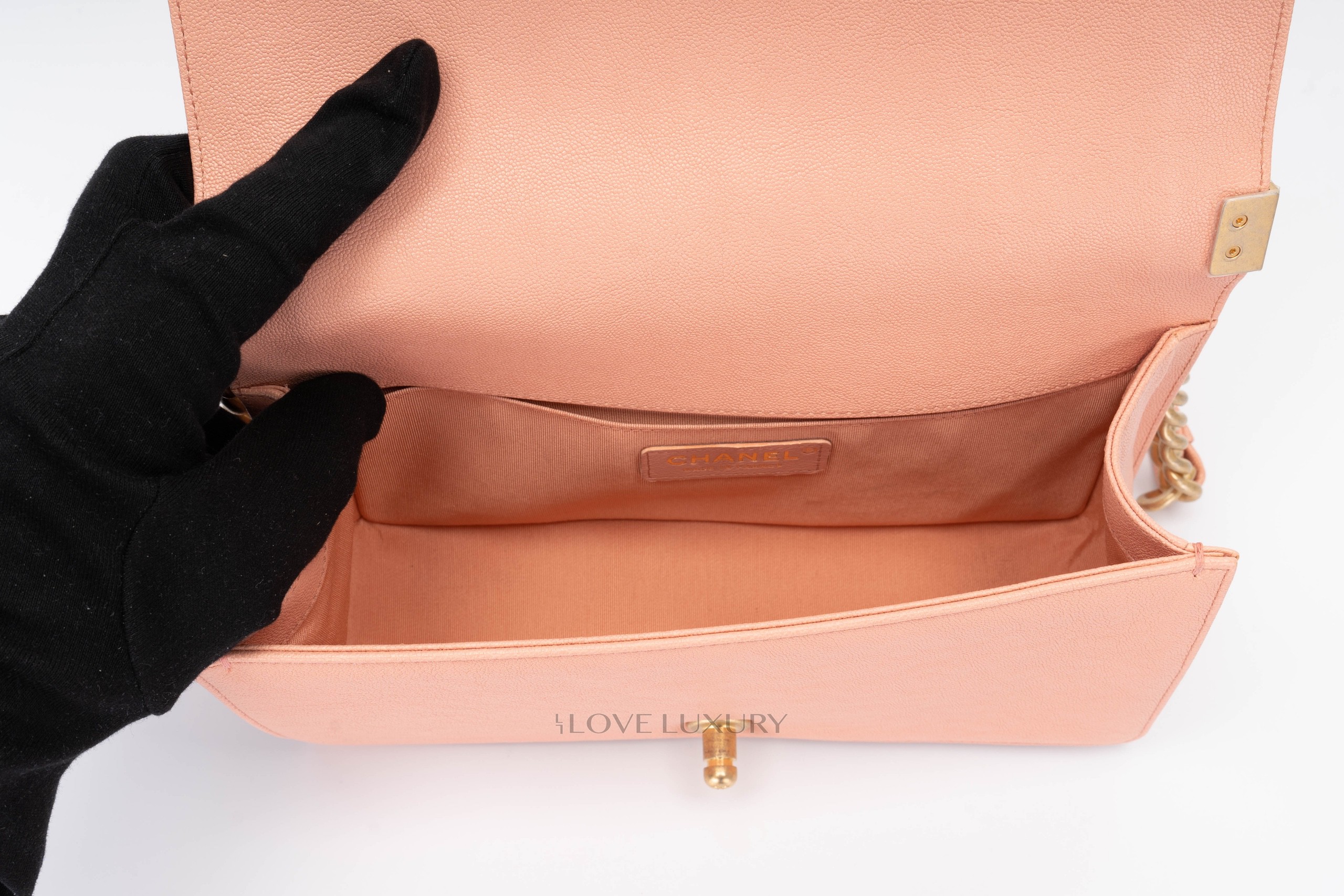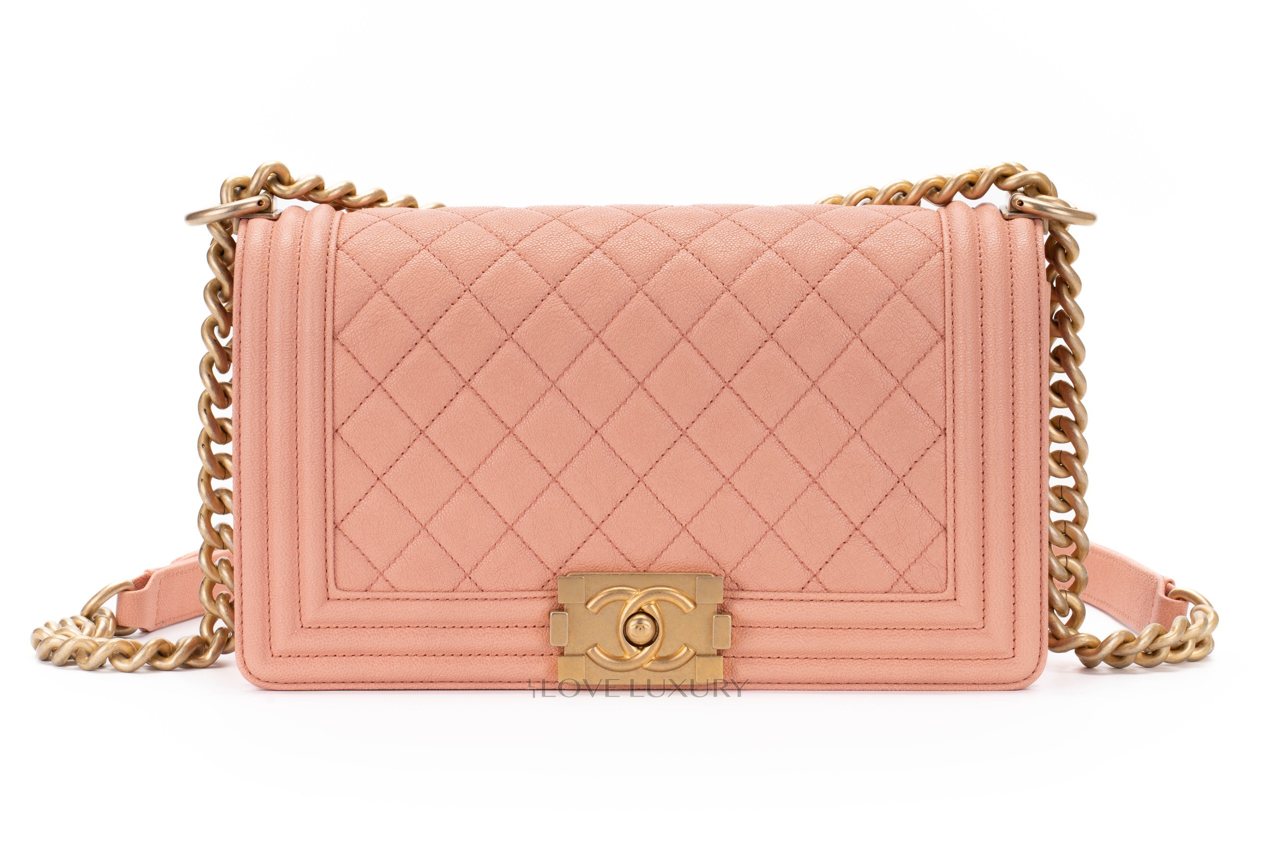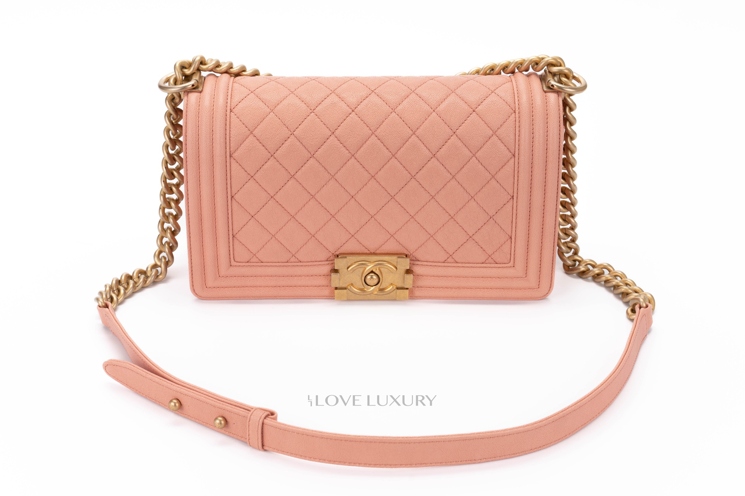 Chanel Medium Boy Bag Quilted Caviar Light Pink Light Gold Hardware / 2019 Excellent Pre-Loved condition.