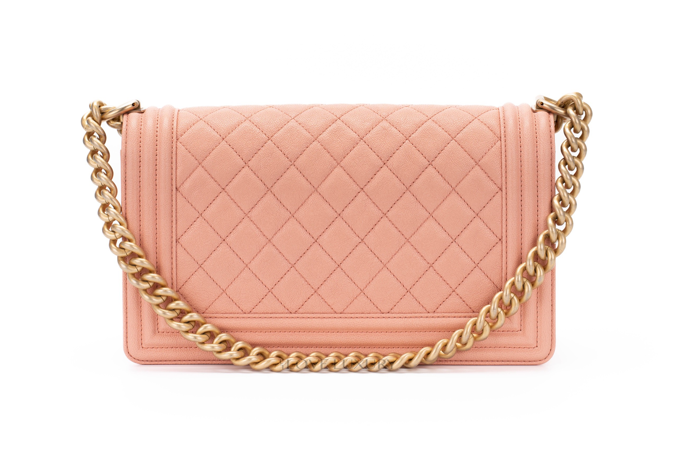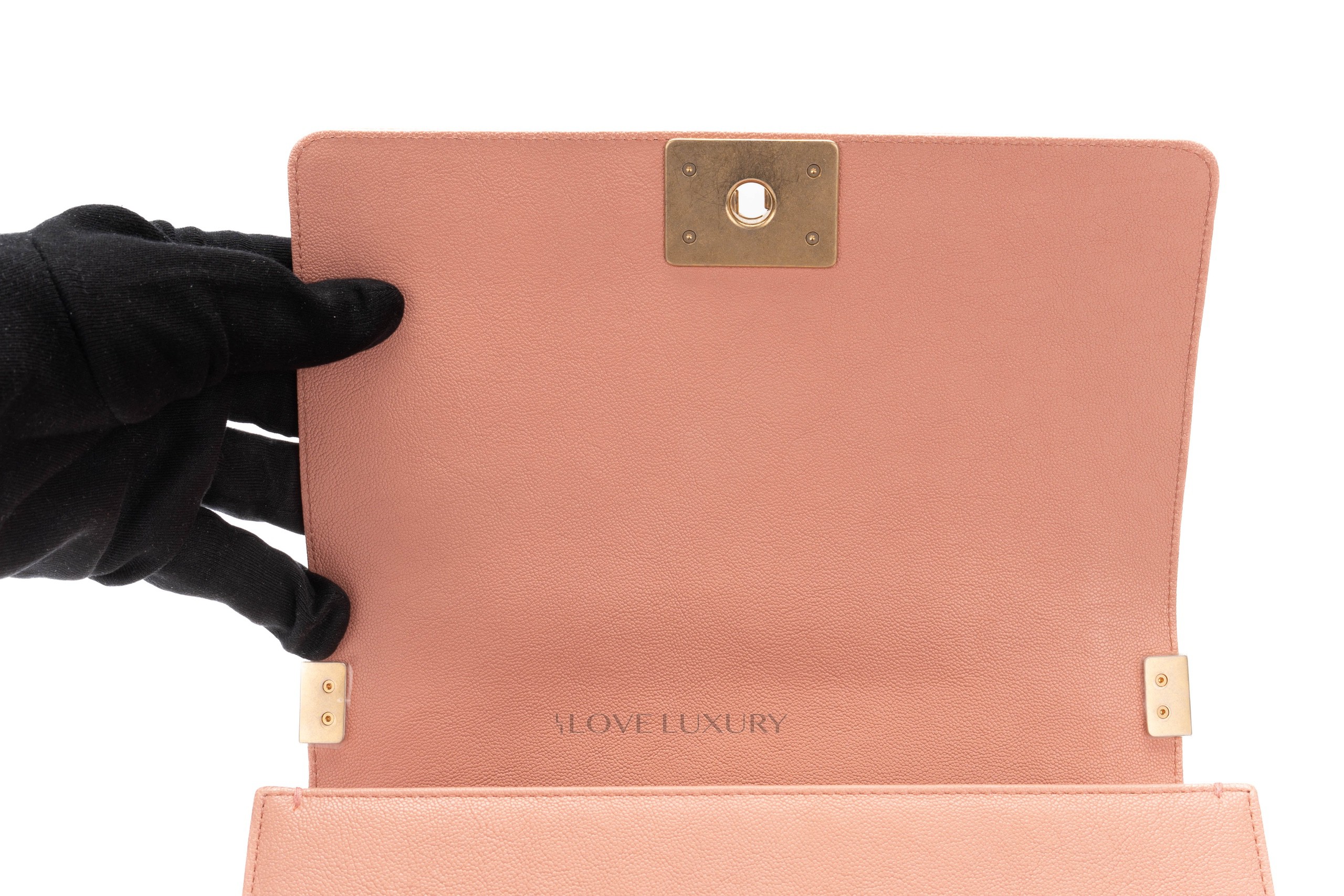 Chanel Le Boy bags were named after ‘Boy Capel’, Gabrielle’s long term partner. This is an old medium size making it a smaller version of the new medium boy bag. This model is crafted from grained lamb caviar finished leather in a salmon pink accented with aged gold hardware. This bag is in excellent pre-loved condition with box, dustbag, booklet, card and authentication.