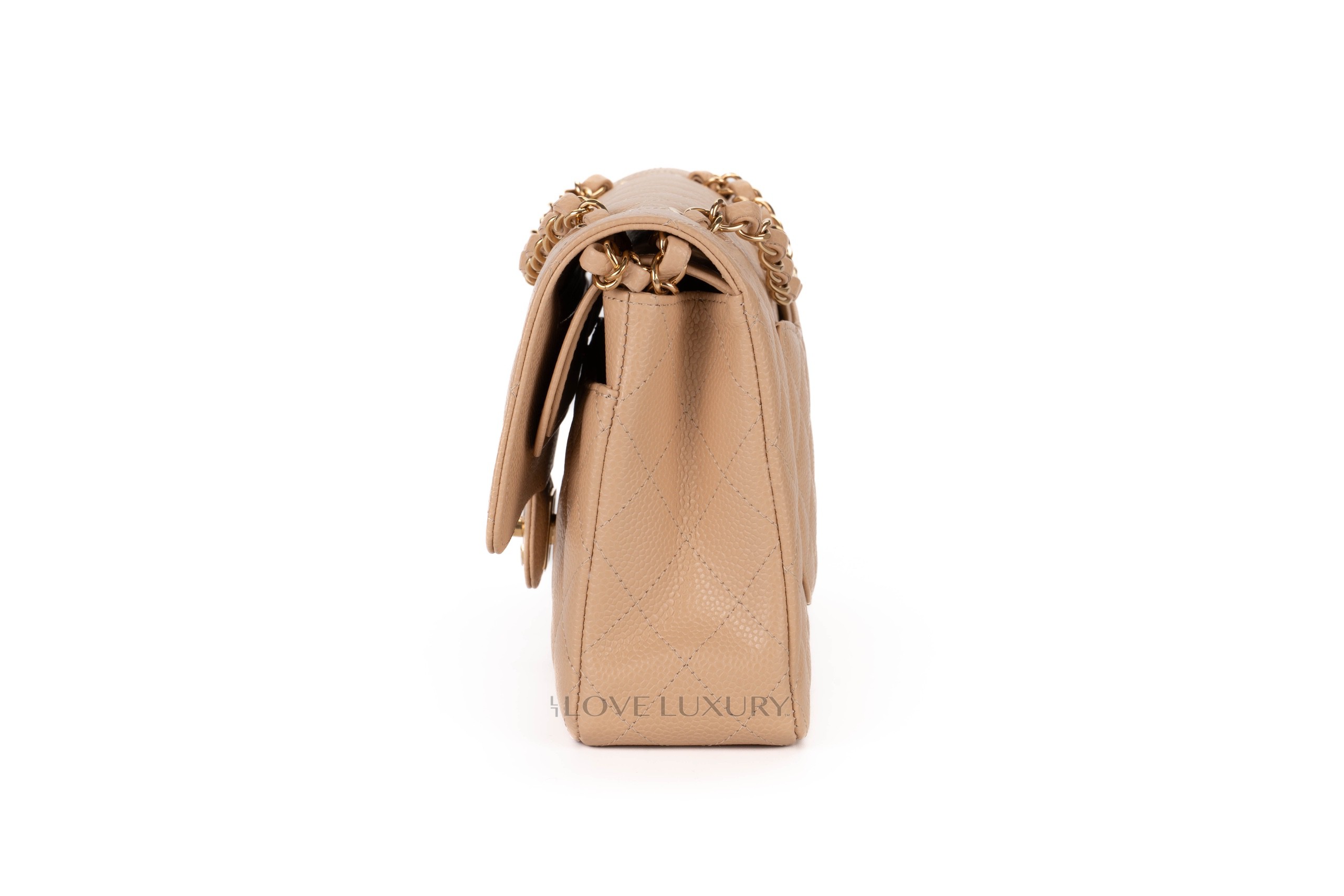Chanel classic flap bags are instantly recognisable from their diamond quilt pattern, cc lock and interwoven chain. The classic flap bags feature the ‘secret’ compartment in the upper flap where it is reported Chanel herself kept her love letters from her secret lover. The Beige Clair is one of the most sought after colours Chanel produce after black. The bag is crafted from caviar leather and the lining is also beige clair, with the warmth of the gold hardware, this colour combination is classy and easy to wear. This bag is in excellent pre-loved condition.