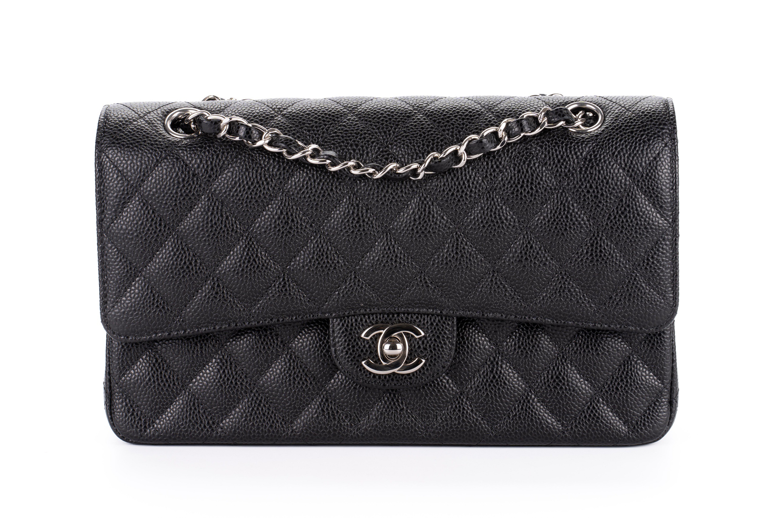 This Chanel Medium Classic flap bag is crafted from Caviar leather which is a grained leather that is very robust and durable. The black leather is complimented by the shiny silver hardware and is in excellent pre-loved condition. This bag comes as a full set including receipt. With the recent price hikes from Chanel this bag is a bargain, an opportunity not to be missed. Caviar bags really are an investement for your money.