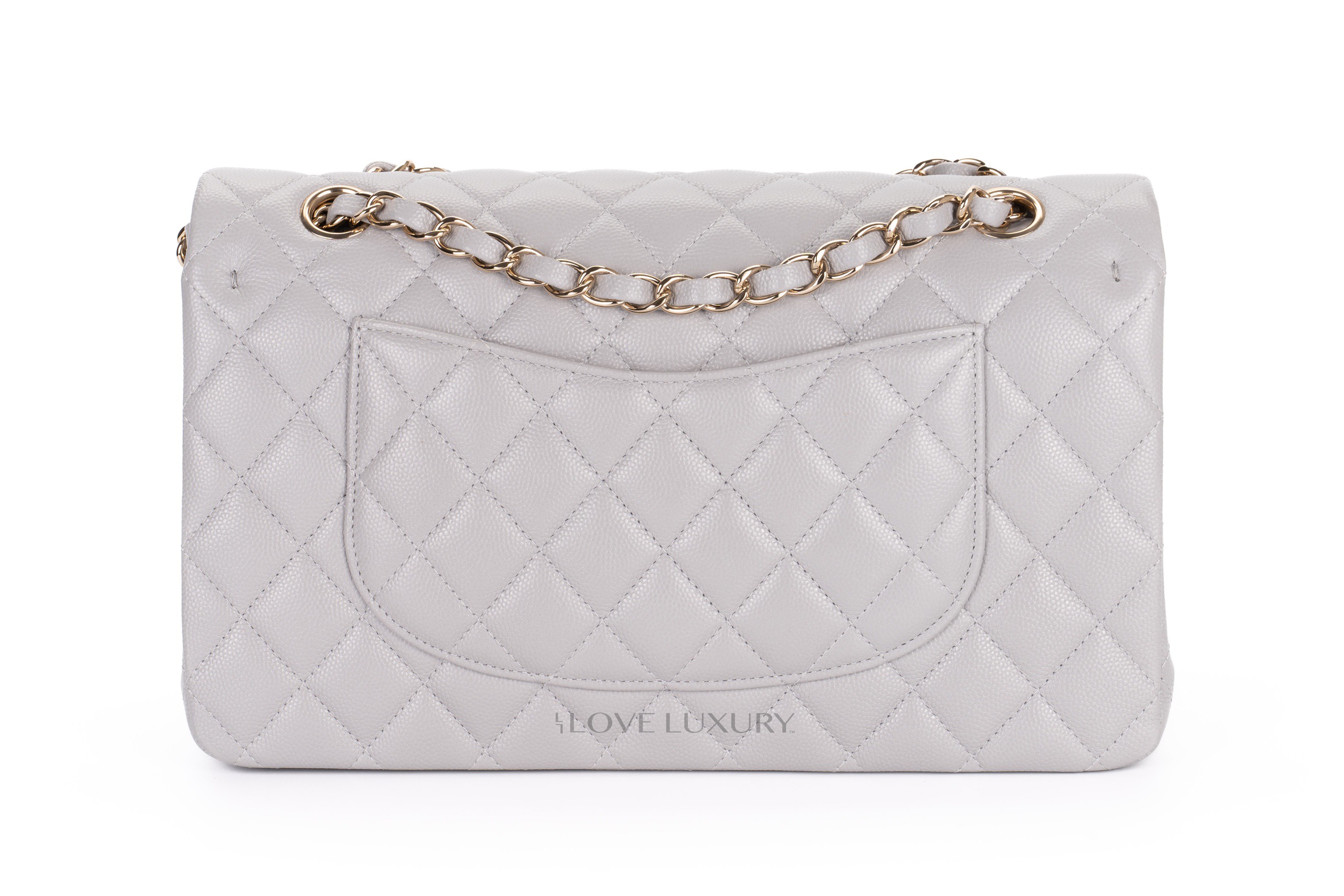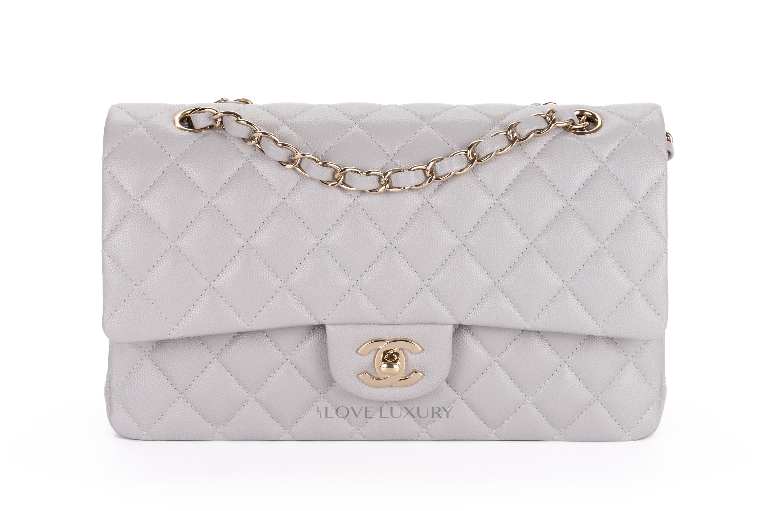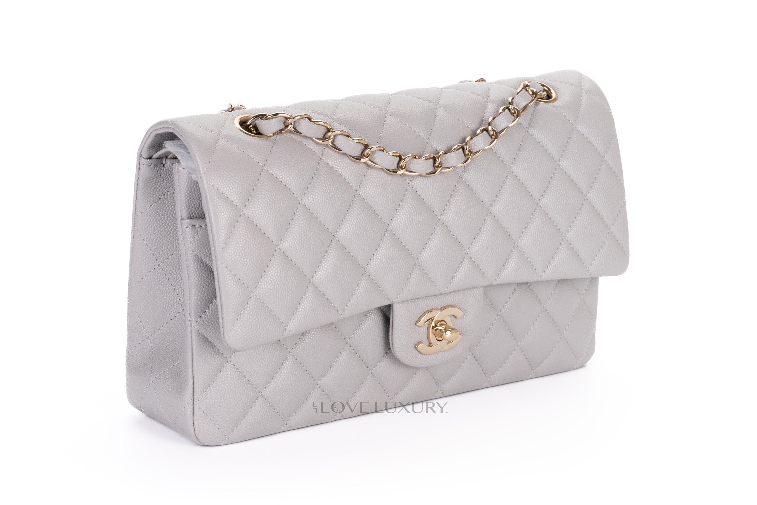 Chanel Medium Classic Flap Caviar Pastel Grey Champagne Hardware / Microchipped Box Fresh 2021 Receipt