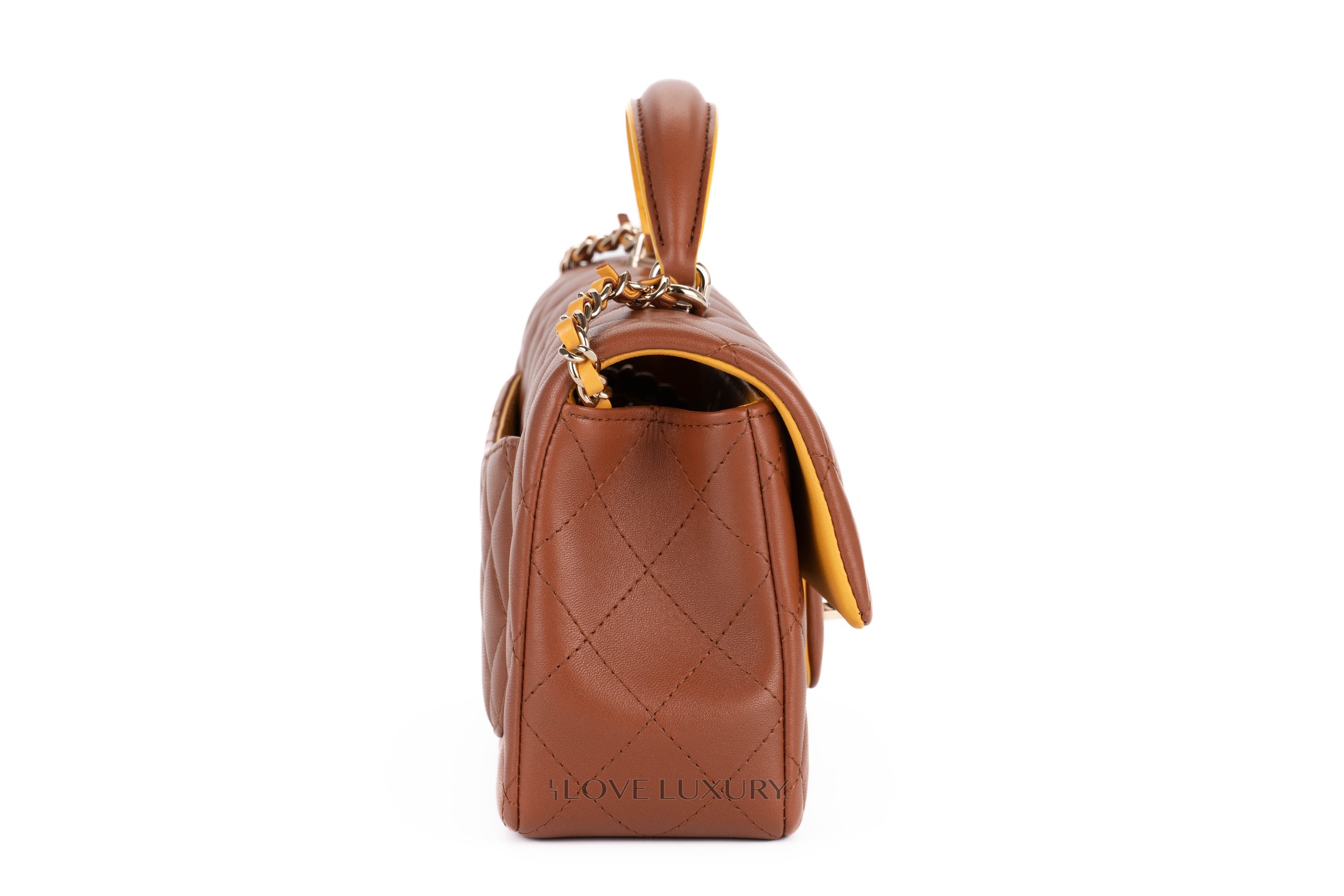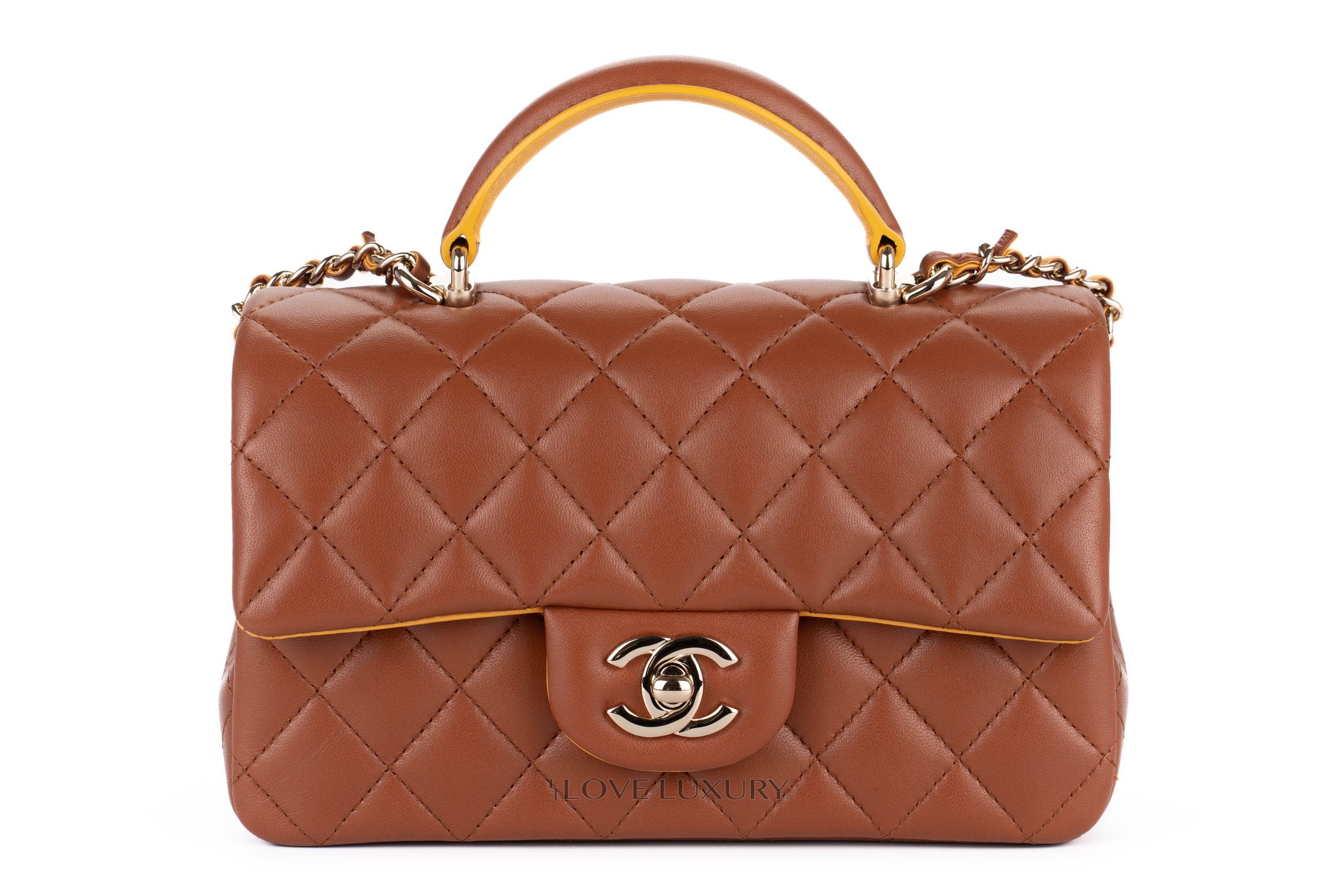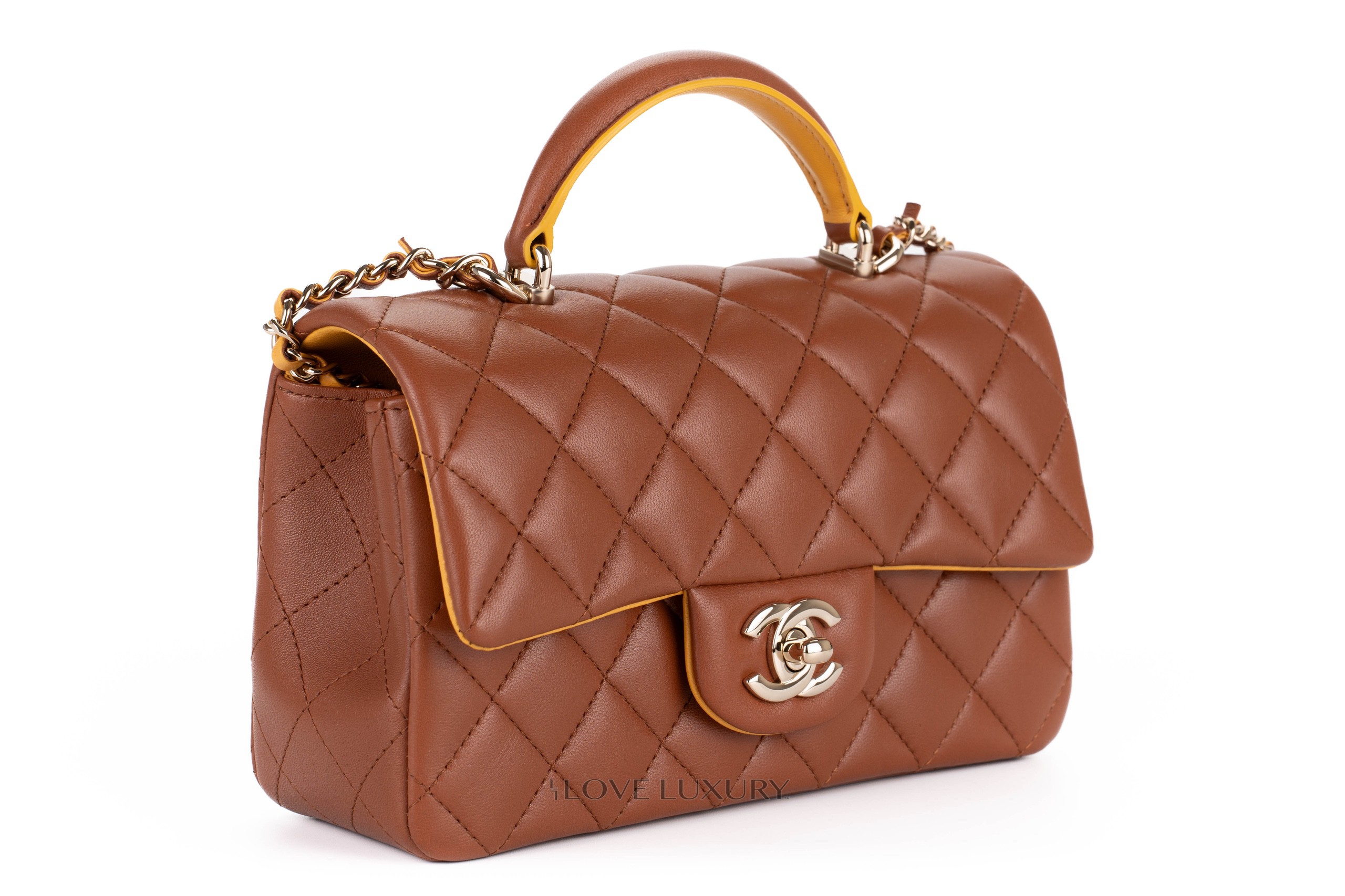 Chanel Mini Flap Bag Top Handle Brown & Yellow Lambskin Light Gold Hardware / 2023 Box Fresh