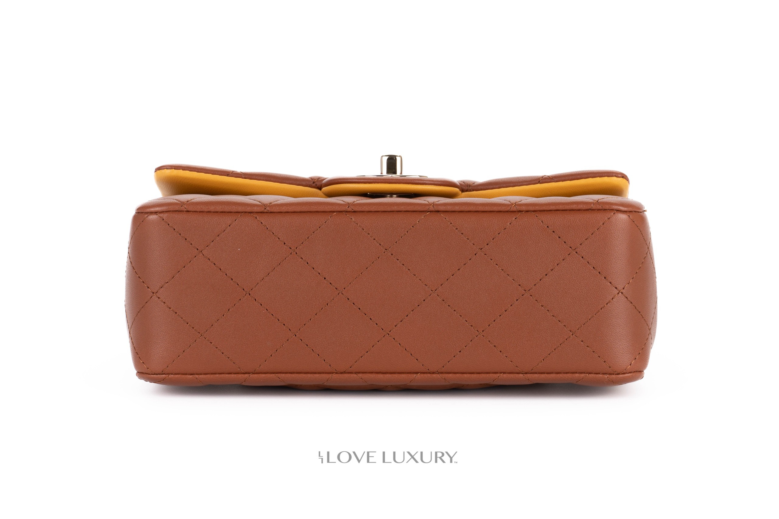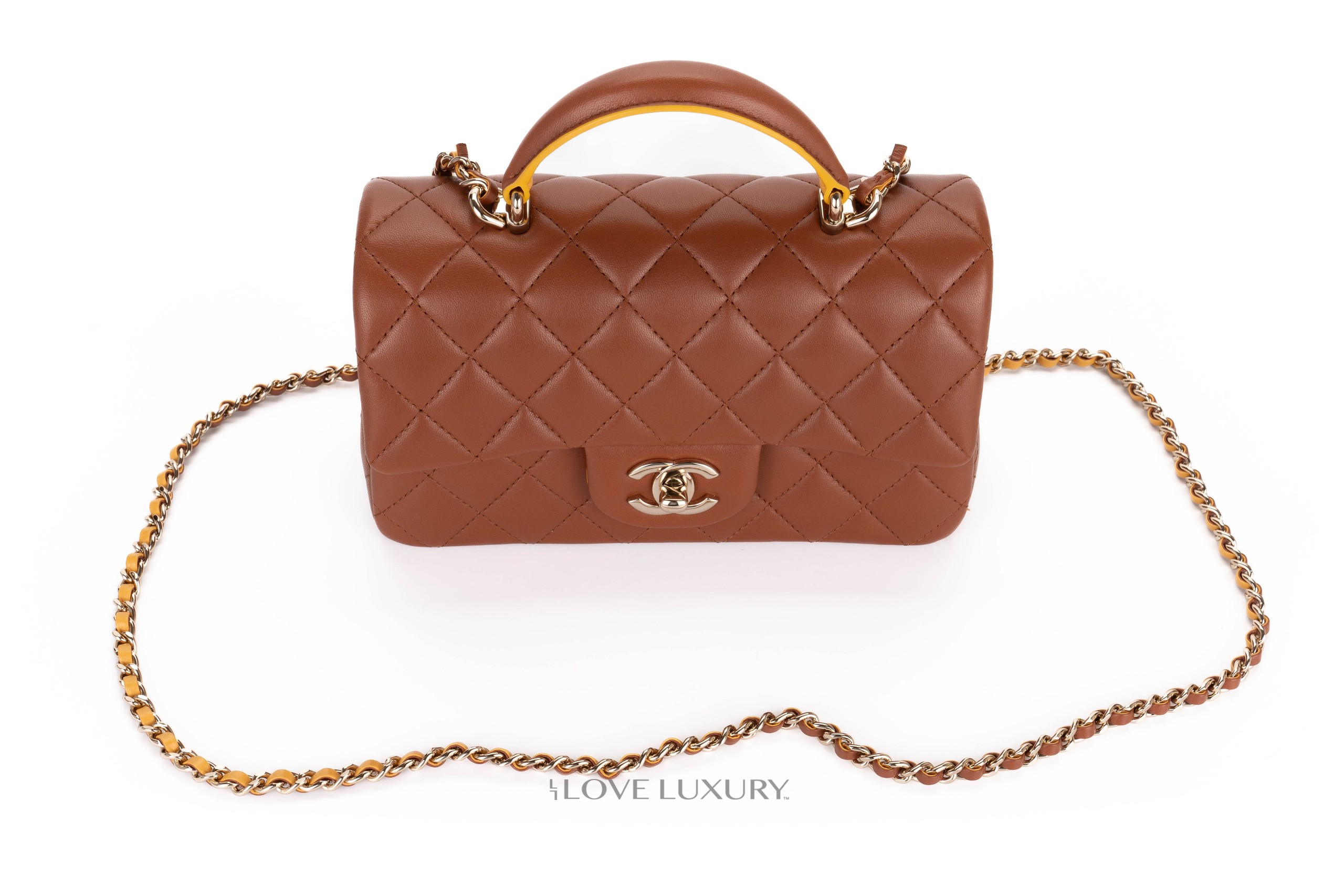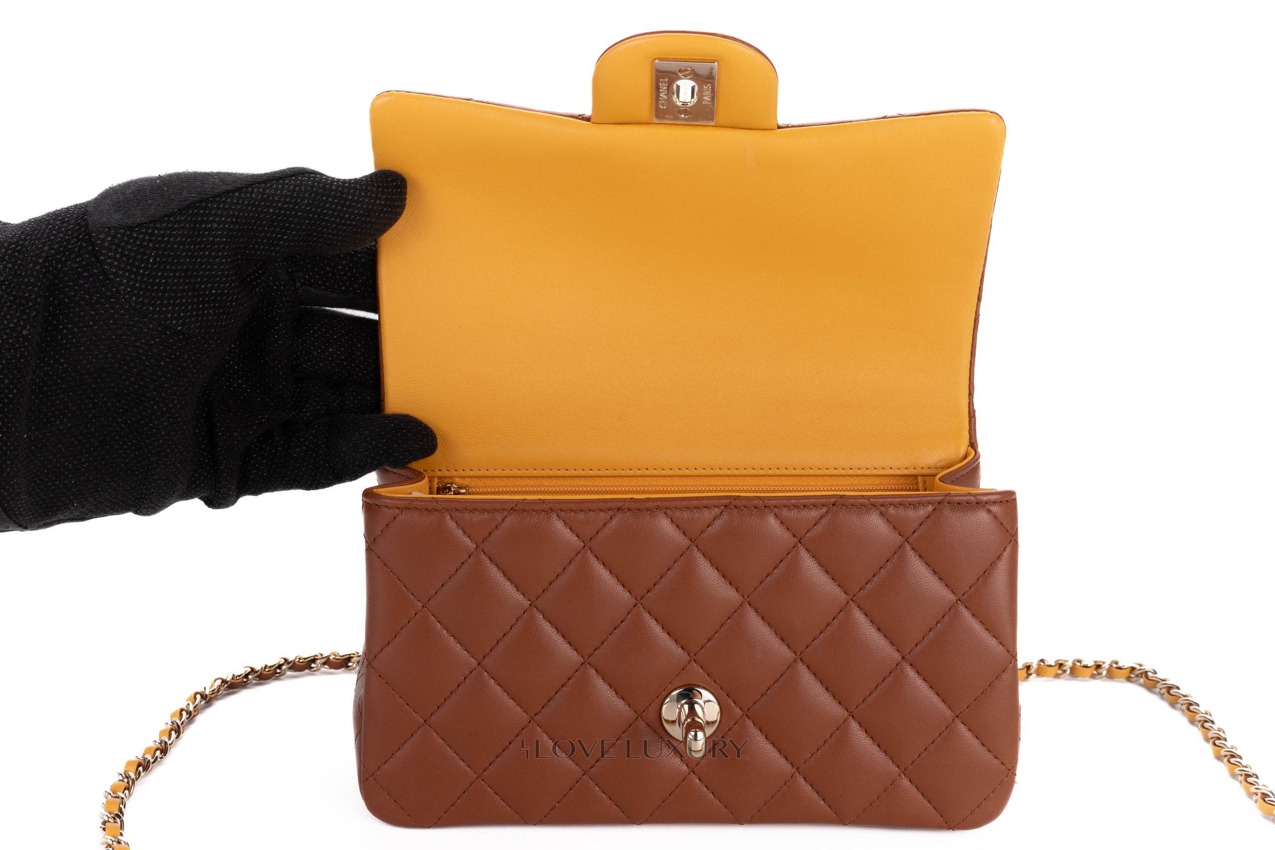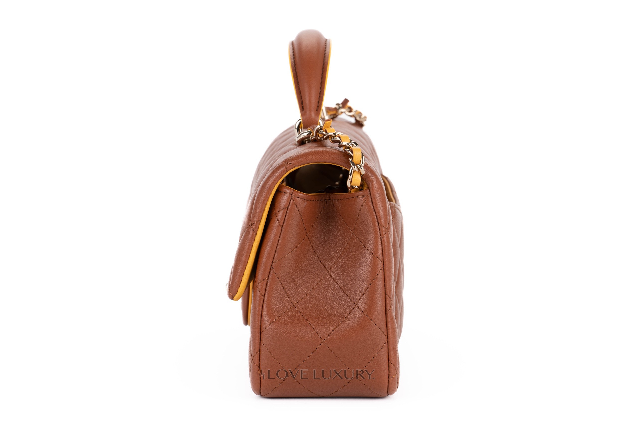 Chanel Mini Flap Bag Top Handle Brown & Yellow Lambskin Light Gold Hardware / 2023 Box Fresh