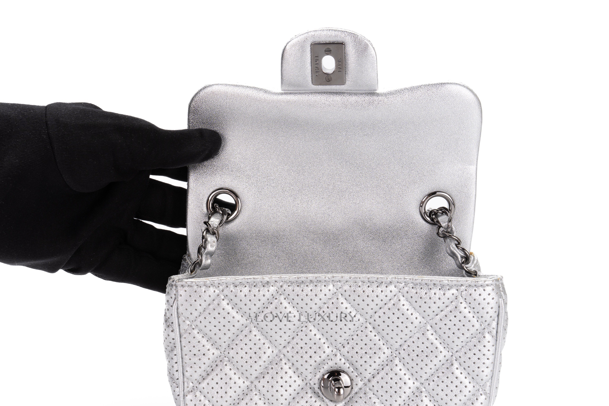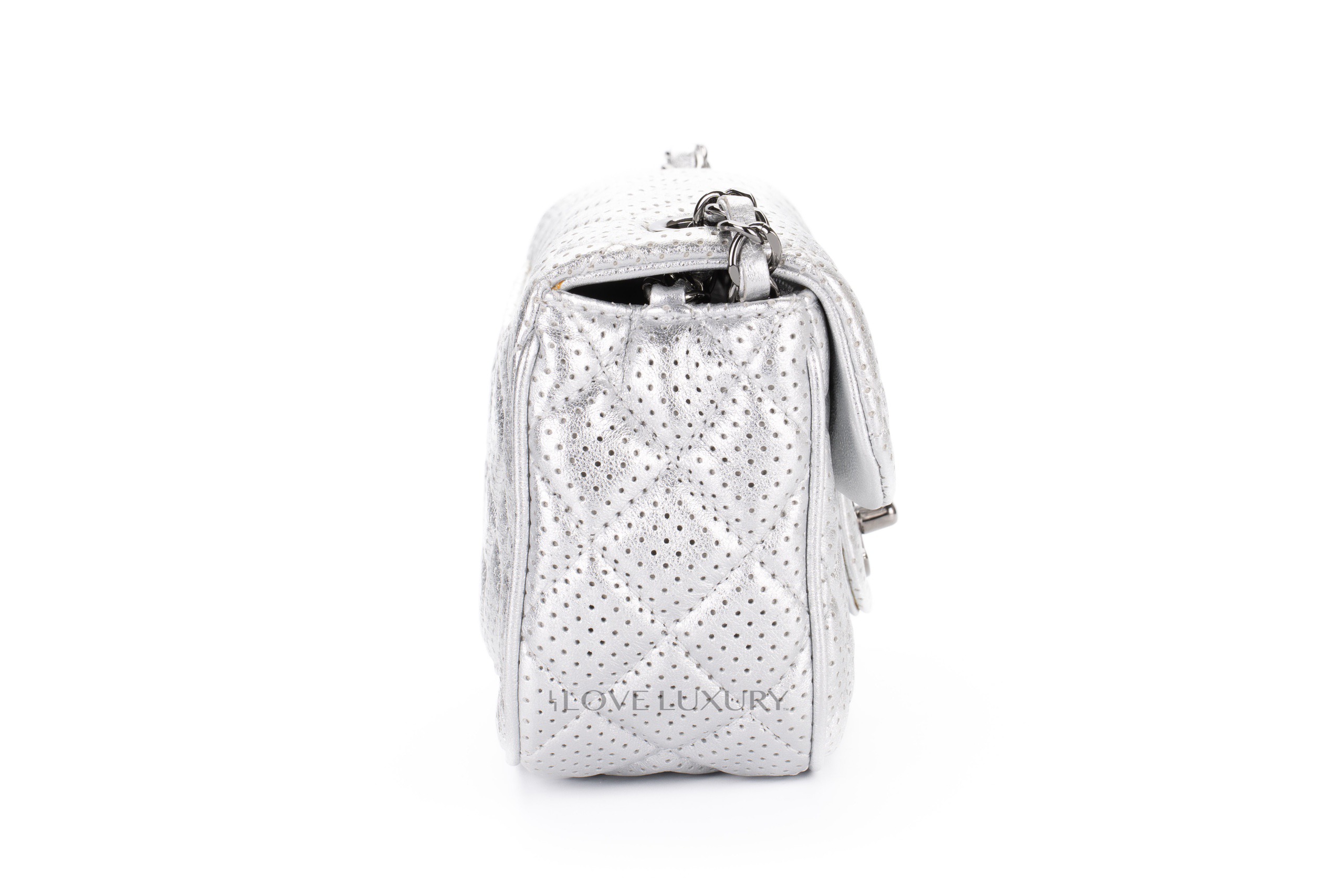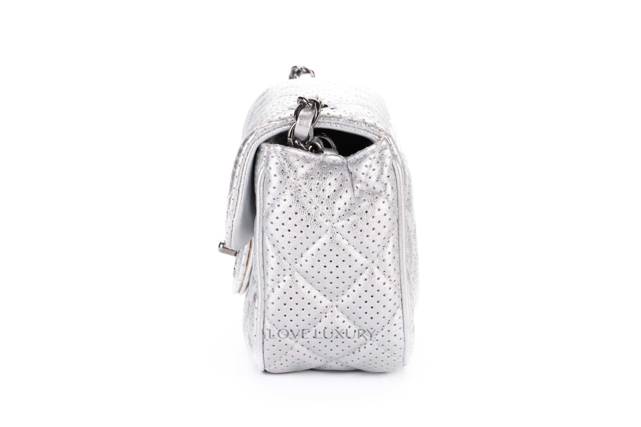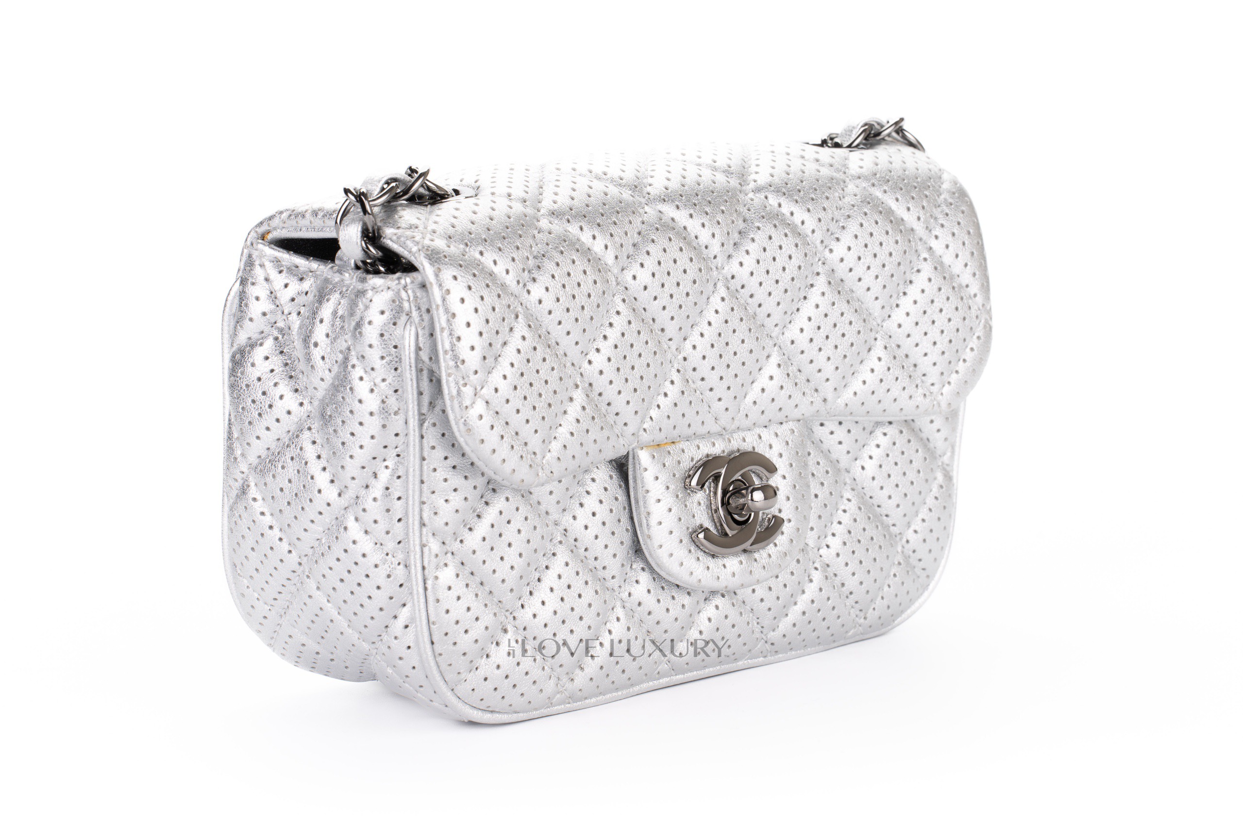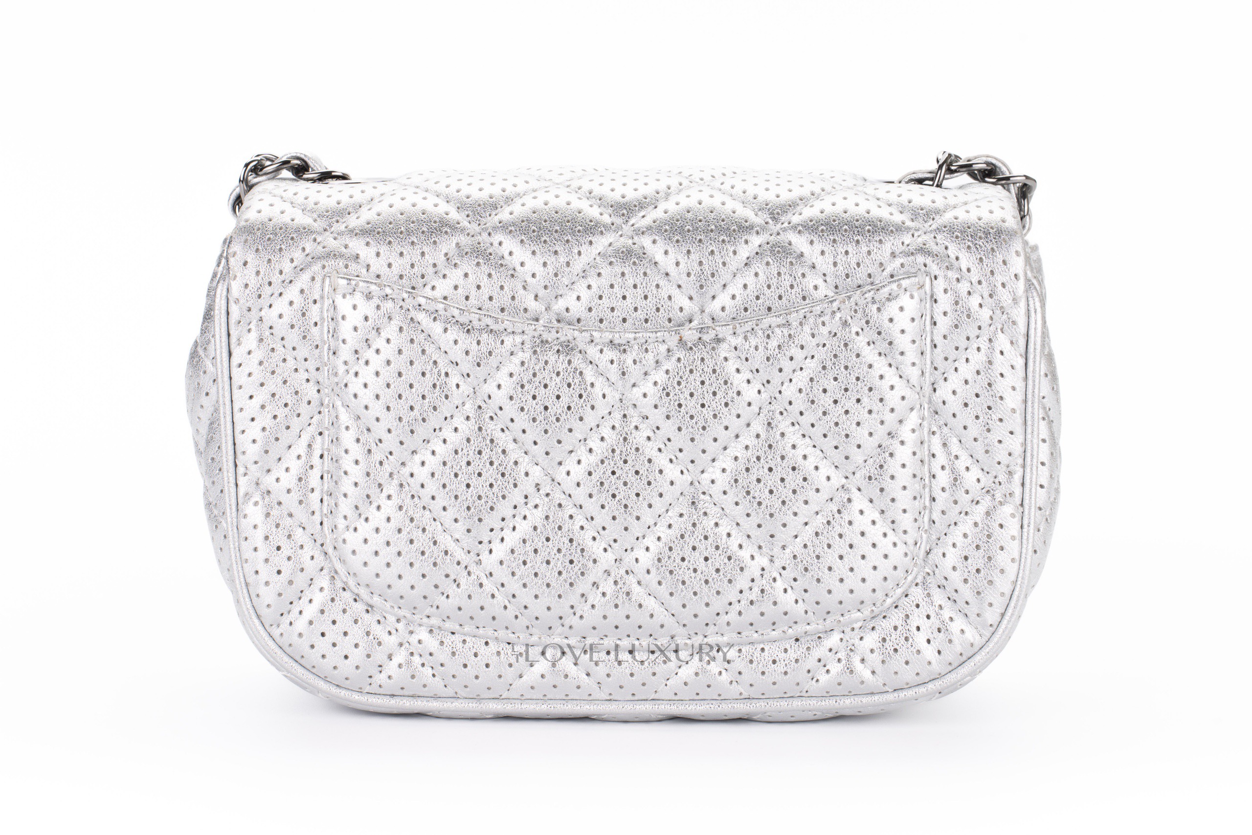 The Chanel perforated leather is an edgy take on the classic styles. This particualr model is a Chanel mini rectangle however it presents slightly different dimentions to the classic flap mini rectangle. This leather is finished with a silver lame effect which gives it a very 1980’s cool chic feel. This bag is in excellent pre-loved condition and comes as a full set without the receipt but to inlude authentication.