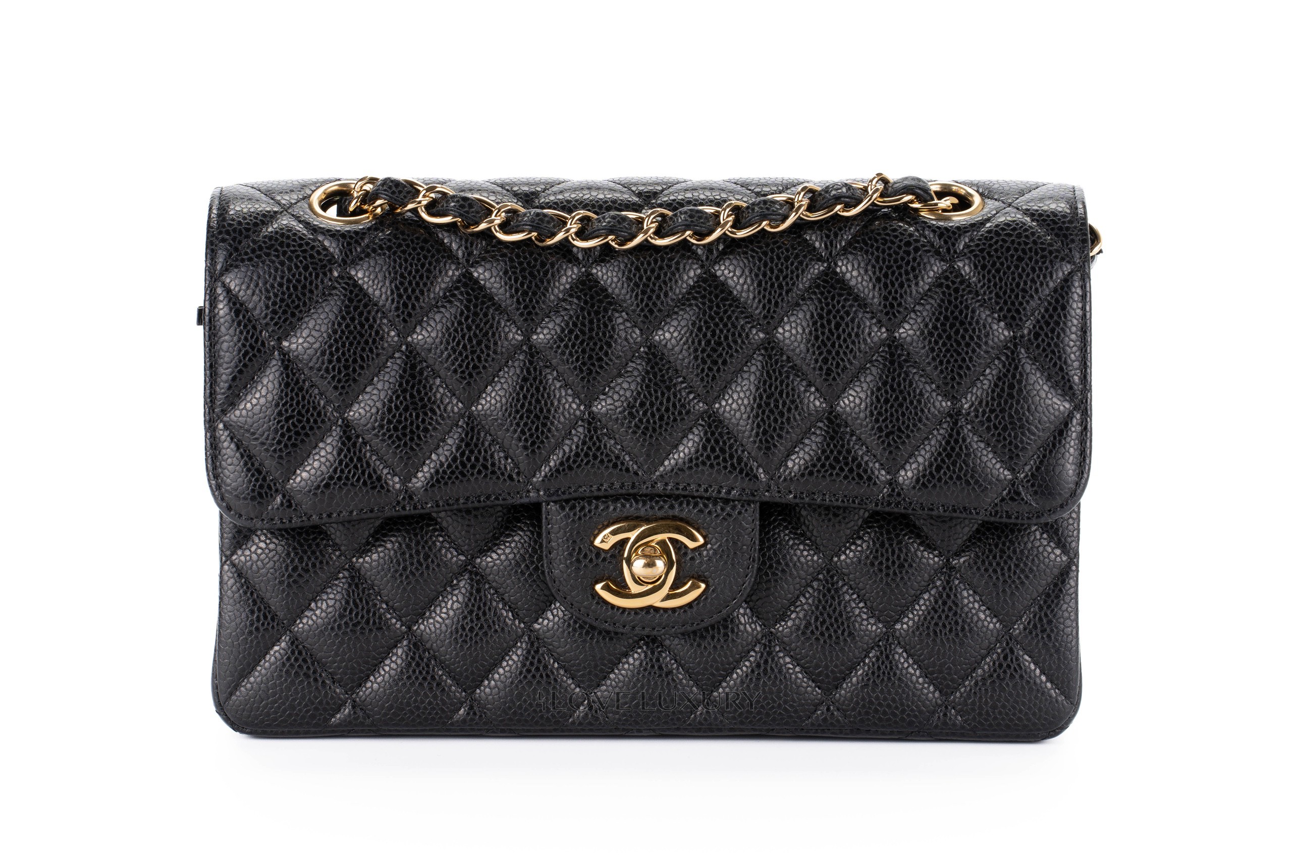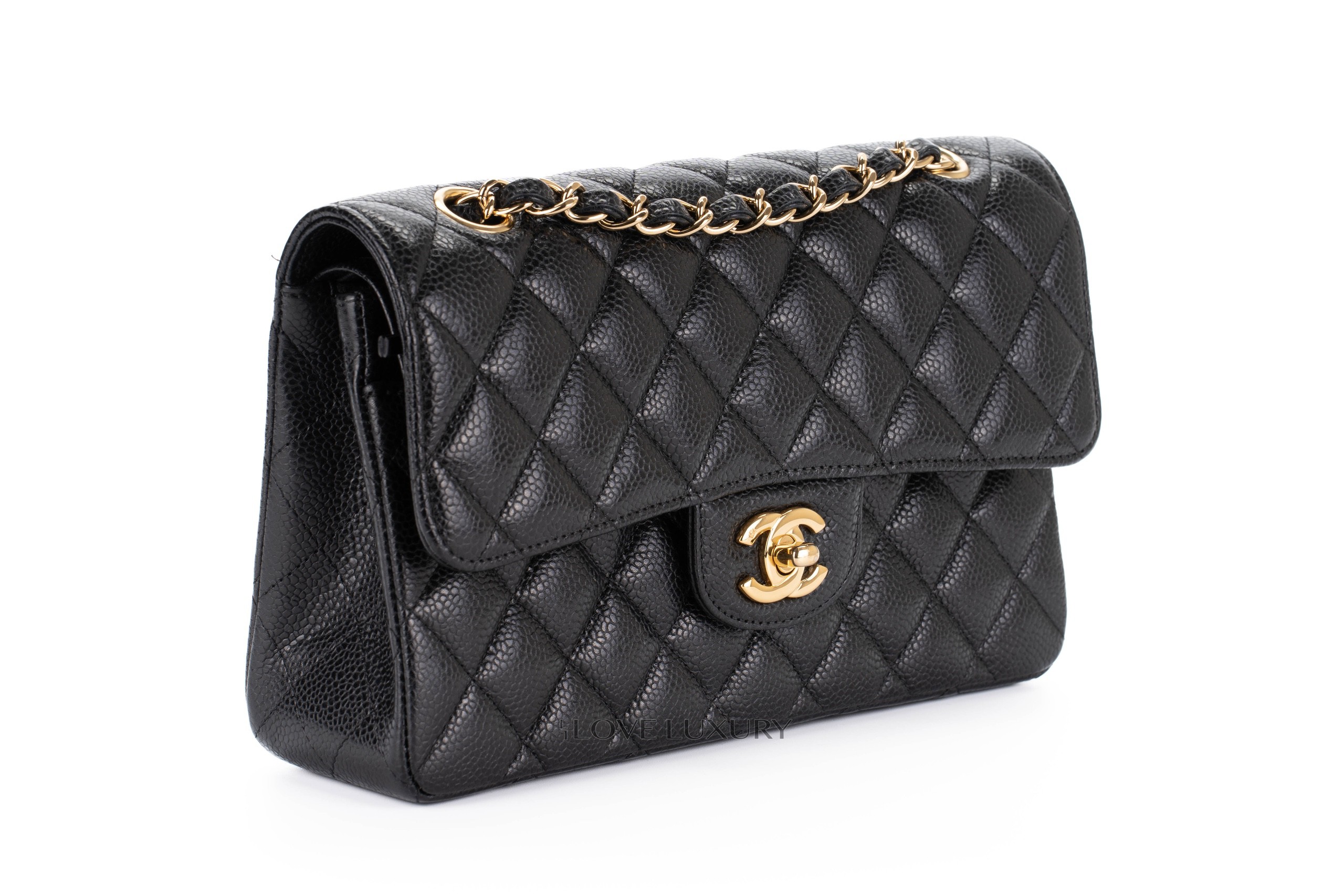 Chanel stopped producing 24 carat gold plated hardware in 2008, this bag is a 12 series that means it was one of the final bags produced with the gold plate hardware as opposed to the gold coloured hardware. This bag is extra special as it also has the limited edition black lining, that was only released in a few seasons. Add on top of that the fact that this is a small classic flap and caviar, you have a hat trick. This bag is in very good pre loved cindition with the only major sign of use a small silver spot on the turn lock post. No corner damage and the rest of the bag is in lovely condition however there are som minor signs of use internally and a dent from the zipper.