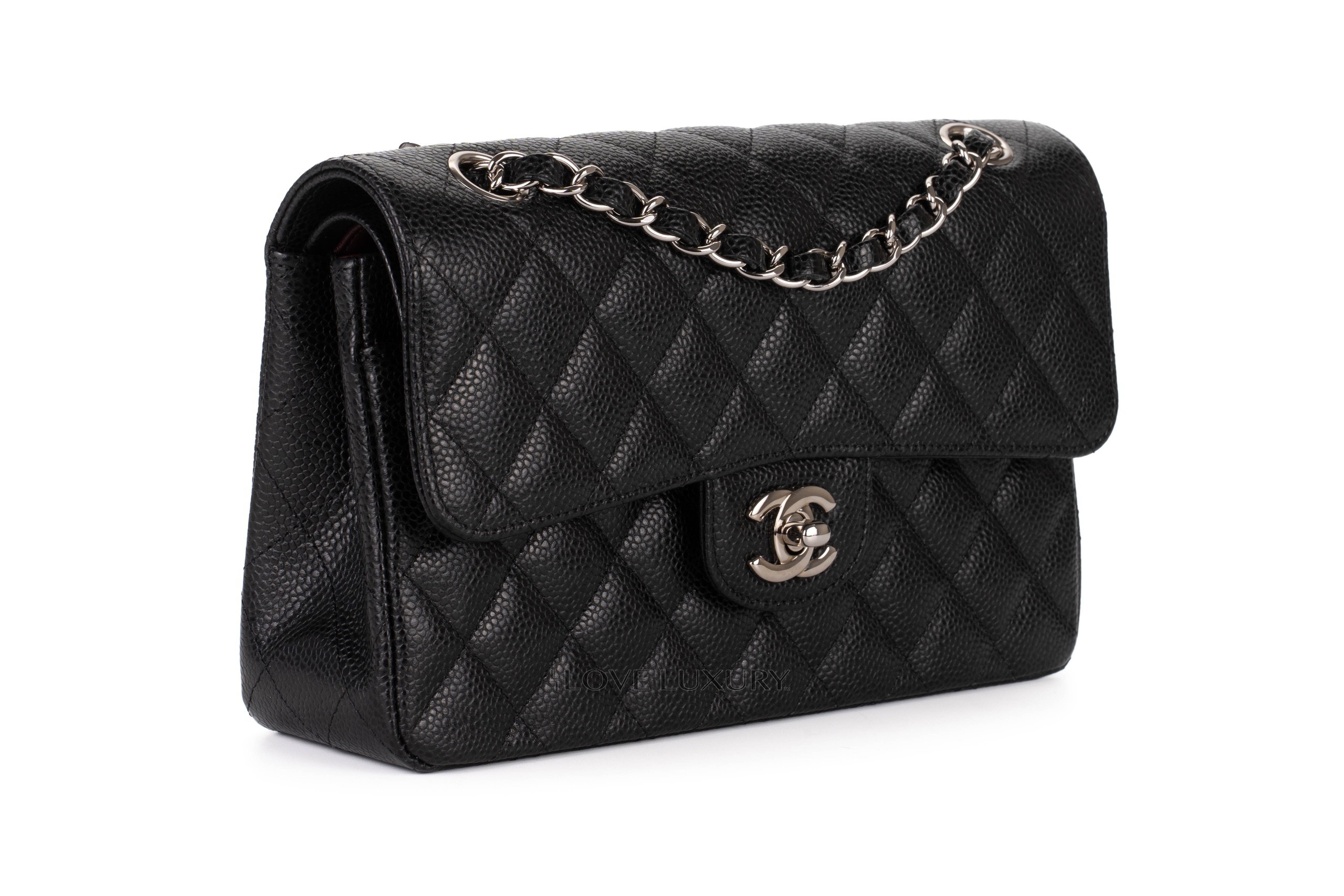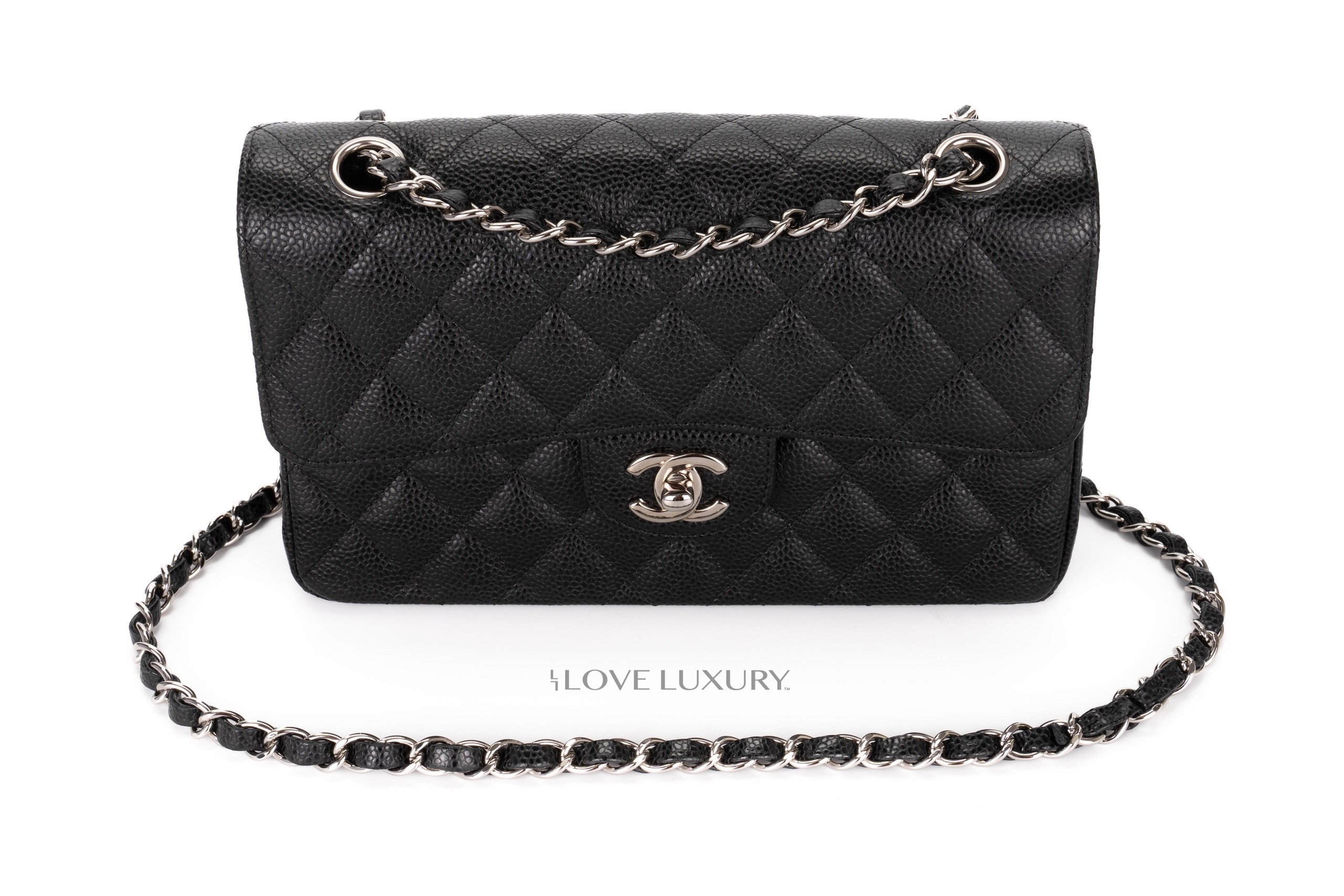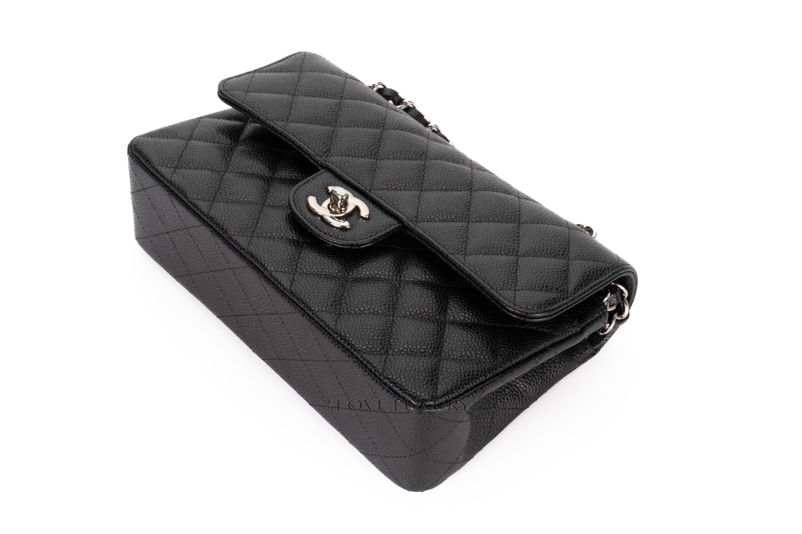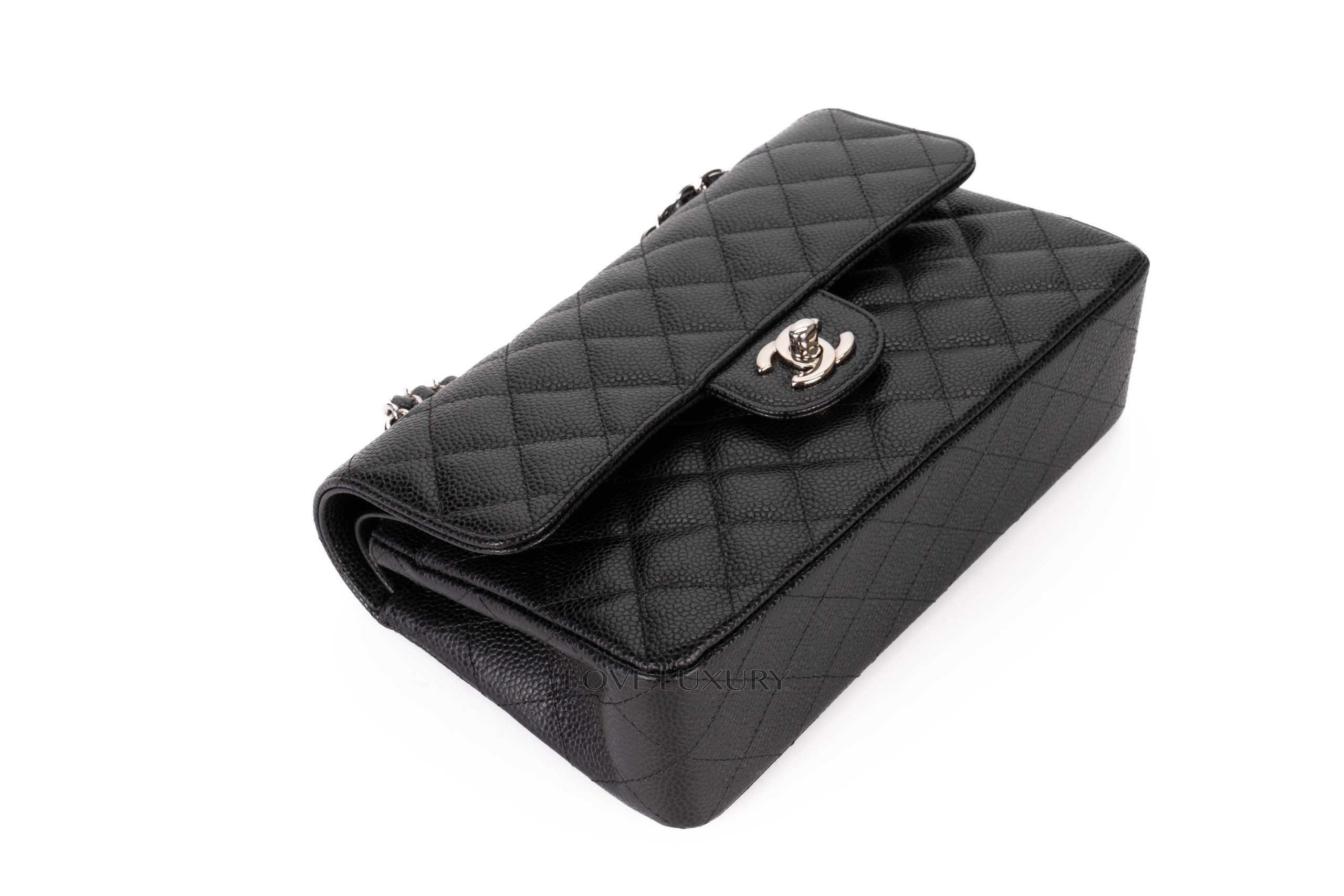 Chanel small classic flap is our most purchased bag here at Love Luxury. The model we have in this listing is crafted from black caviar, which lends itself to being a robust and hardwaring leather. The hardware on this model is shiny silver. This bag is in excellent pre-loved condition there are no signs of use on the corners and miniscule marks on the hardware. This is a micro chipped bag which means it doesnt come with the black card. Comes as a full set with authentication