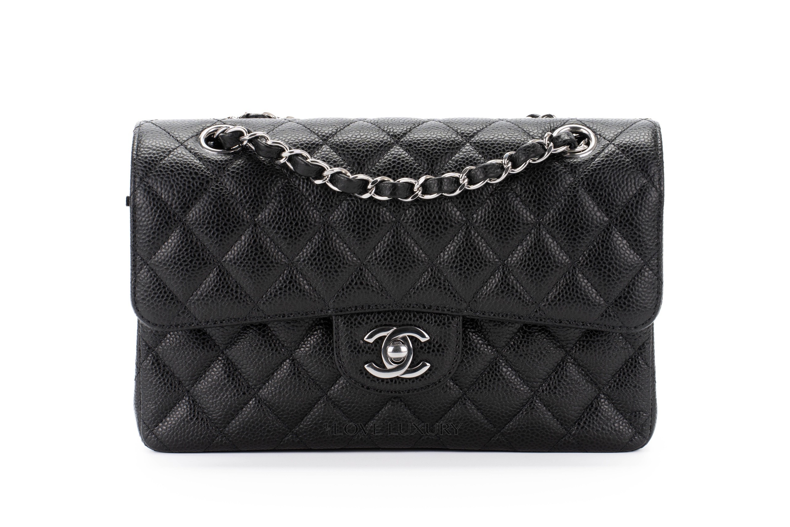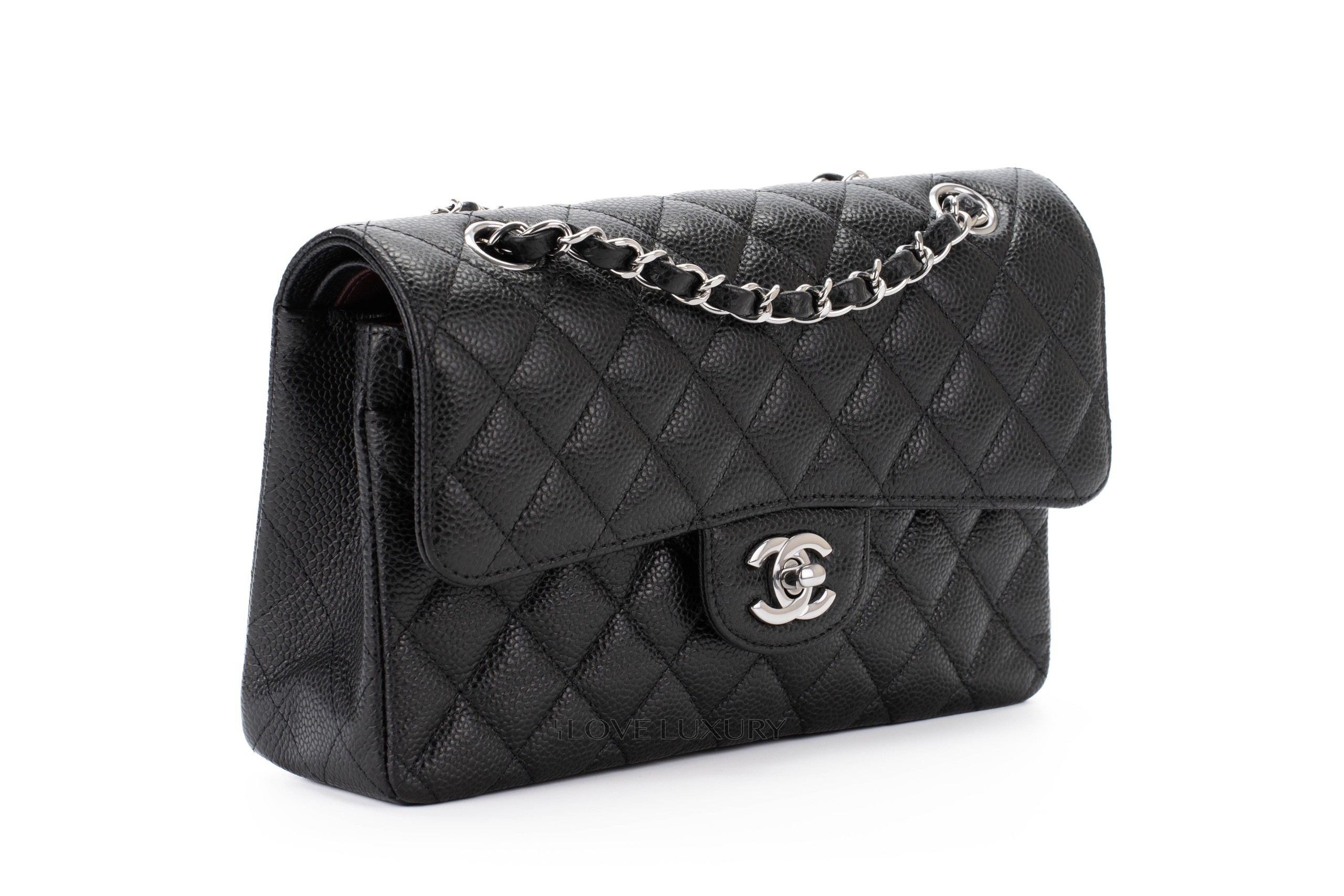 Chanel small classic flap is our most purchased bag here at Love Luxury. The model we have in this listing is crafted from black caviar, which lends itself to being a robust and hardwaring leather. The hardware on this model is shiny silver. This bag is in excellent pre-loved condition there are no signs of use on the corners and miniscule marks on the hardware. This is a mocro chipped bag which means it doesnt come with the black card. This bag comes alone with dustbag and authentication.