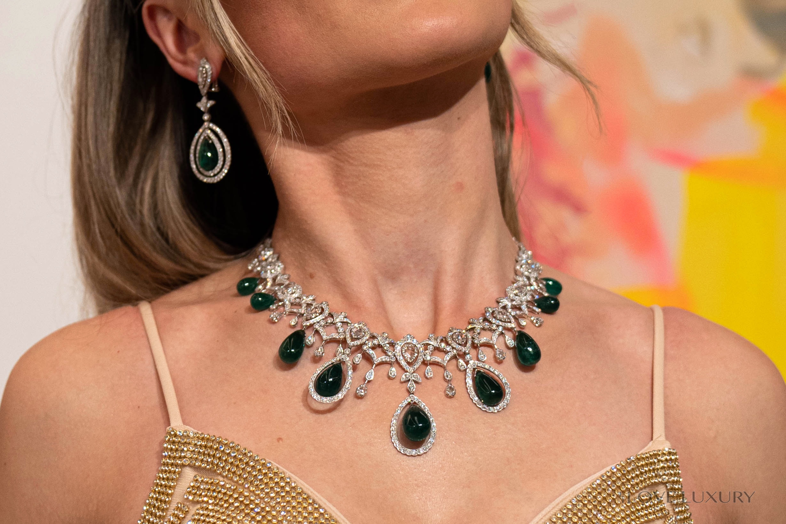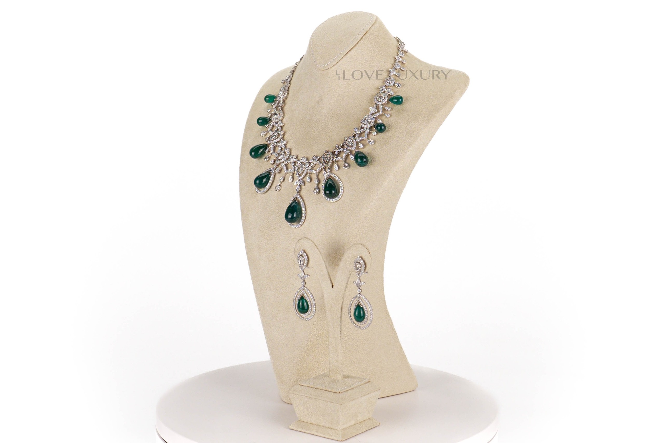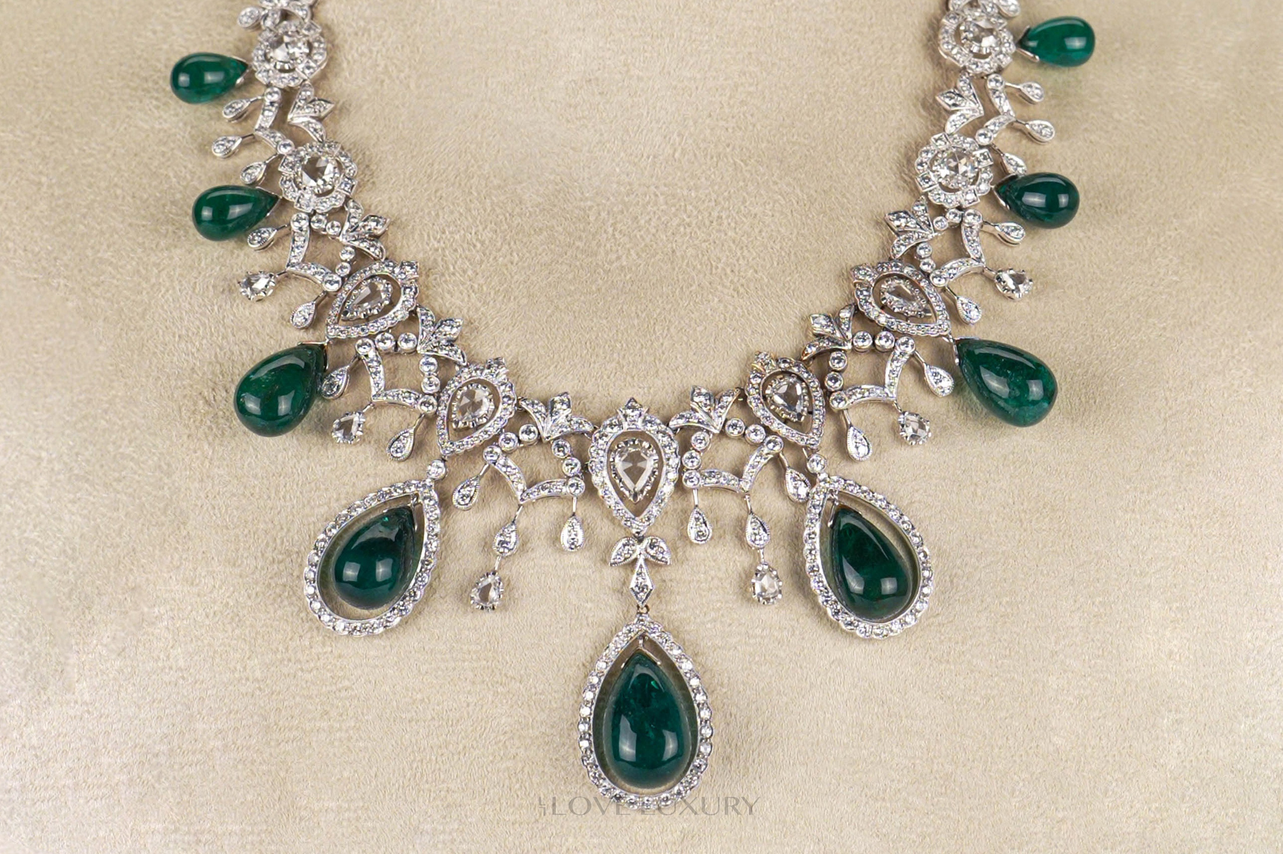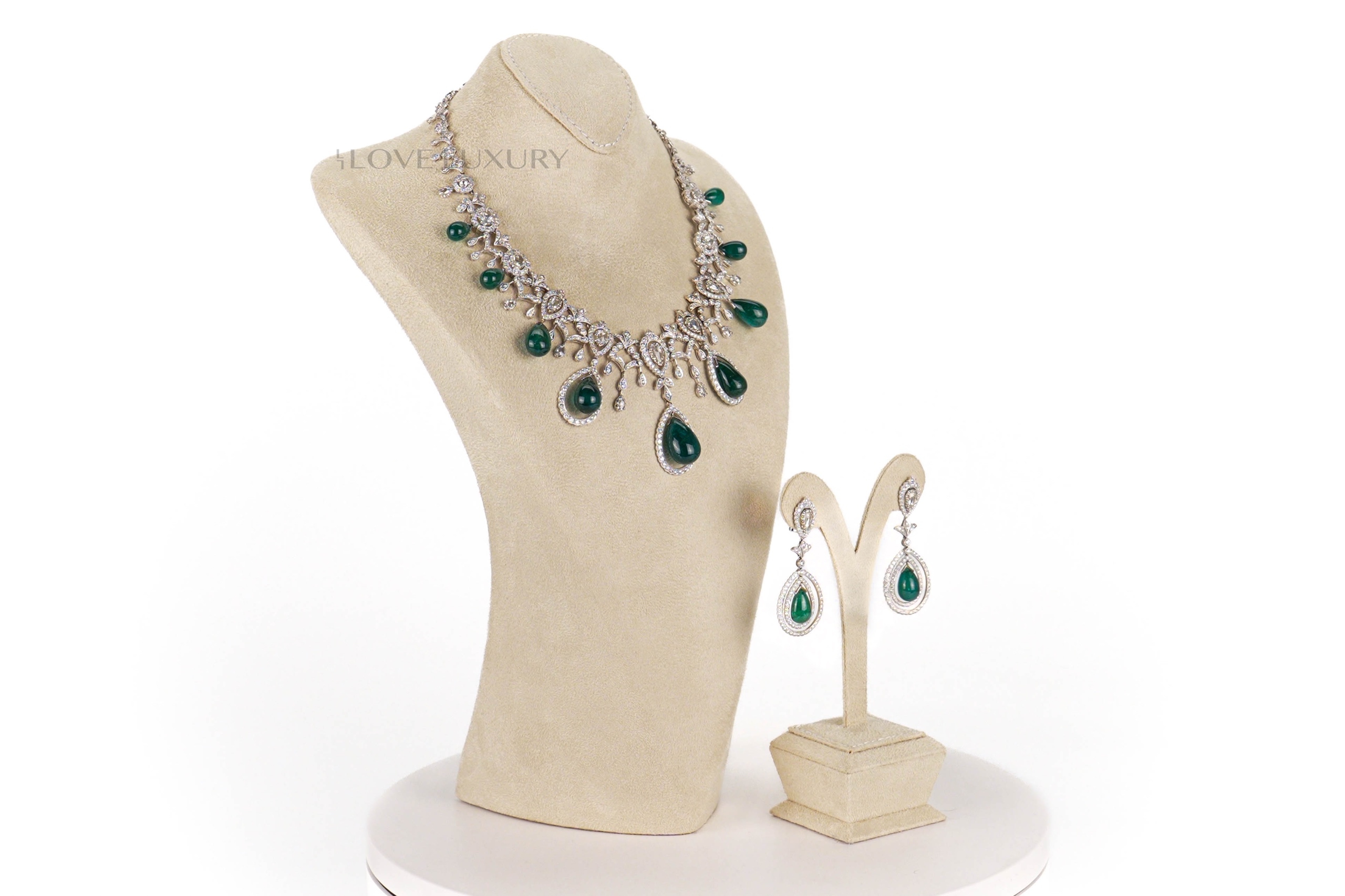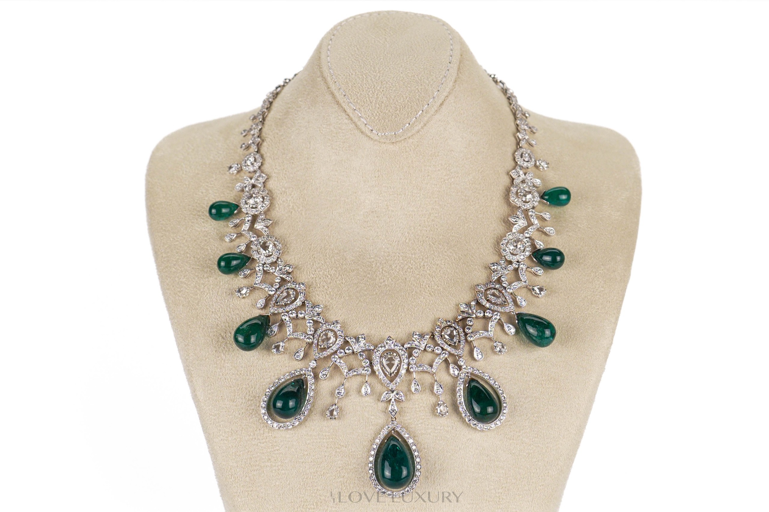 When we say Emeralds we do not mess around, this set has a total Emerald weight of 119ct cut into 9 cabochon pear shaped stones. Not only that but you also have the added extra of 17.3carat round brilliant and rose cut white diamonds, all laid in 18k white gold. Both the emeralds and diamonds in this set are natural stones and not lab grown, true beauties to meet the eye. This suite looks amazing on all skin tones and is a real head turning piece, our model said “I feel like a princess”. Please contact us for more information on this piece or to make a sensible offer.