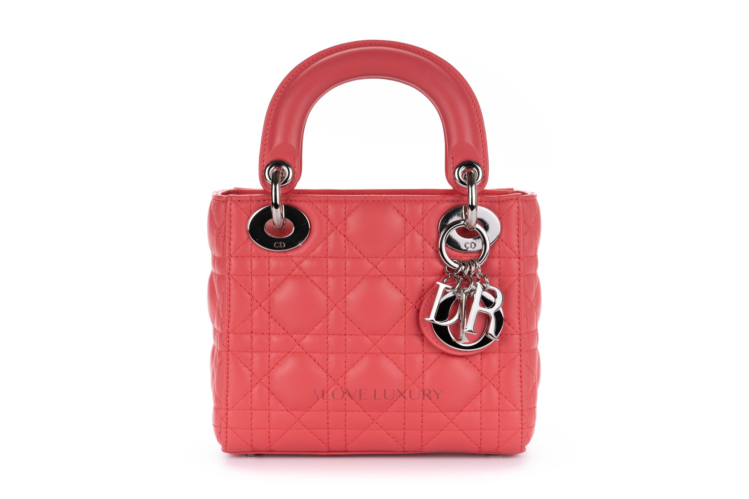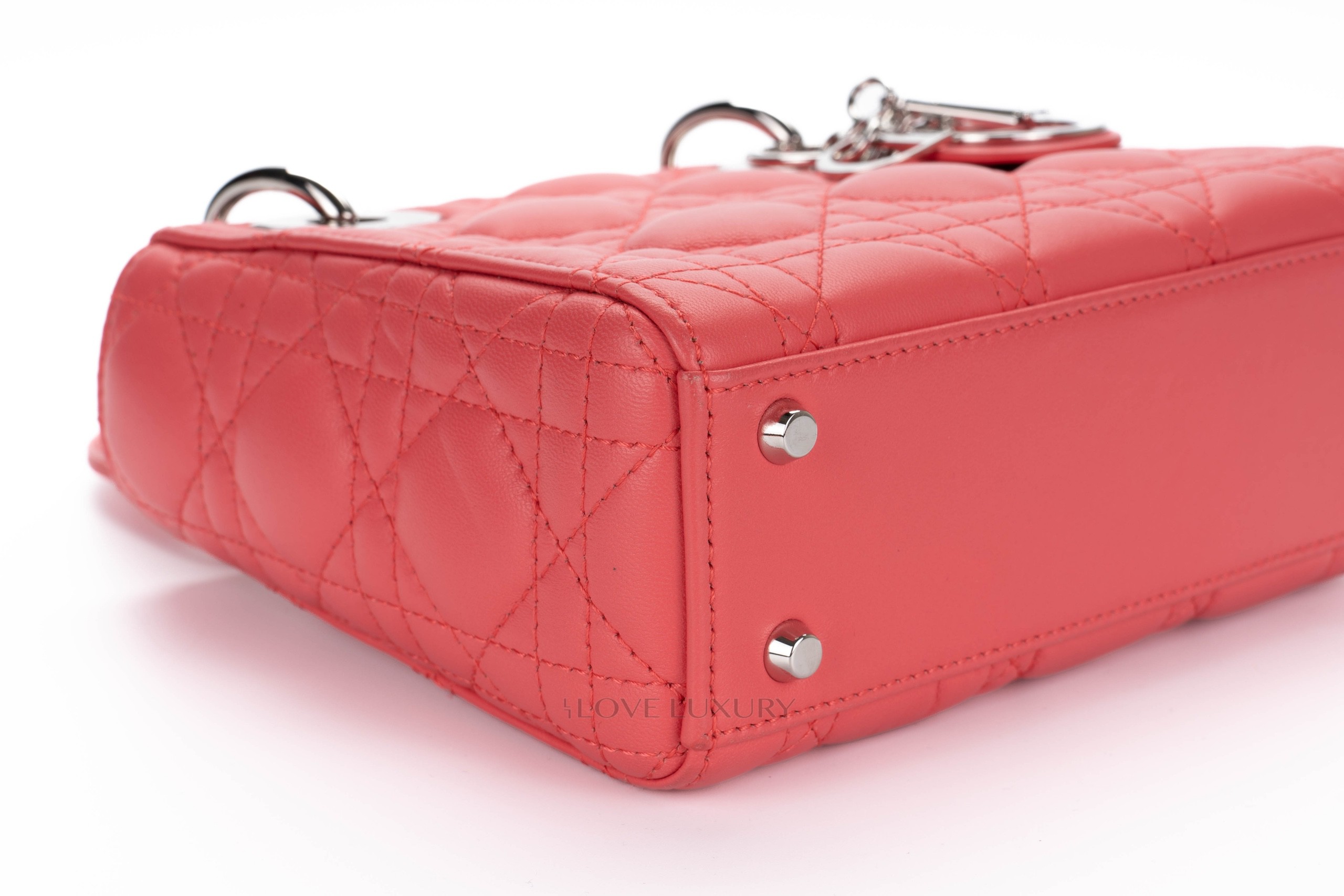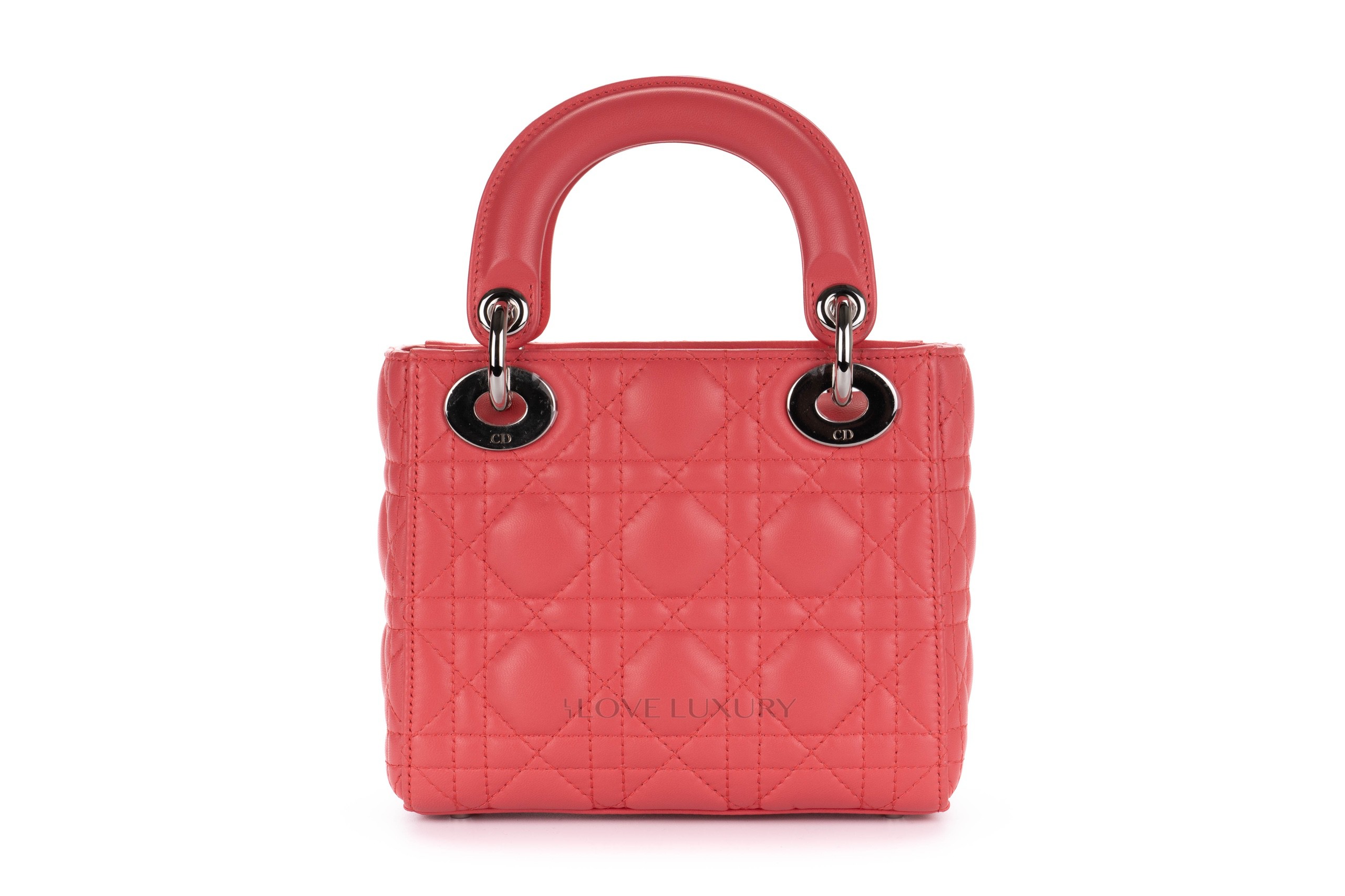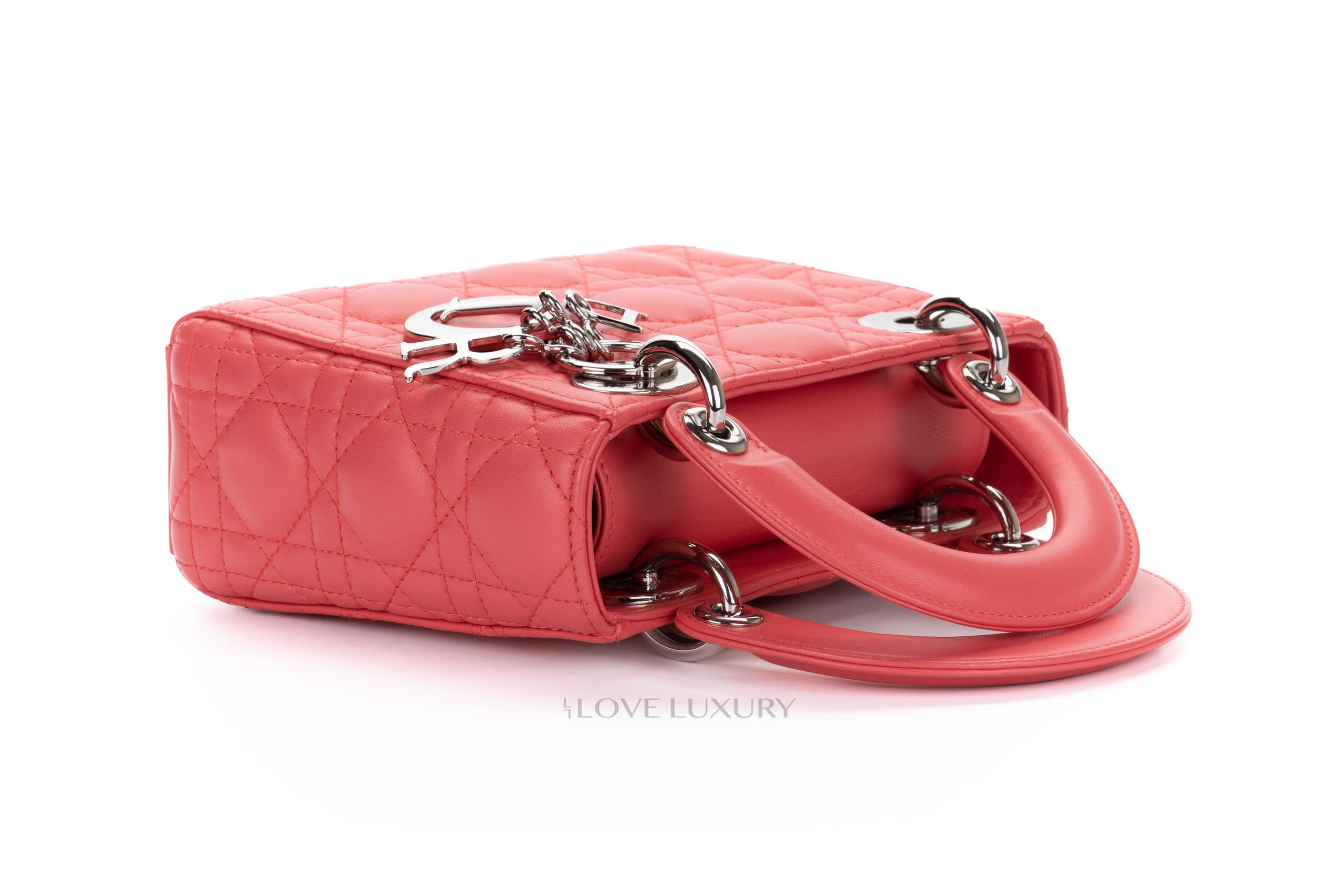 This Mini Lady Dior is from 2012 therefore it comes with the leather shoulder strap rather than the chain of the newer models. The bag is crafted from the finest Italian lambskin leather enhanced with the stiched cannage motif so well known from Dior. This bag has light signs of use on all 4 corners of the top and bottom of the bag however this is very minimal, the hardware is mostly stickered and the feet show some light scratching as does the DIOR charm. Internally there is a few dots of black only. The handles and strap are in lovely condition however there is a small blavk mark on the strap approx 1cm long. This bag comes with strap, dustbag, card and authentication.