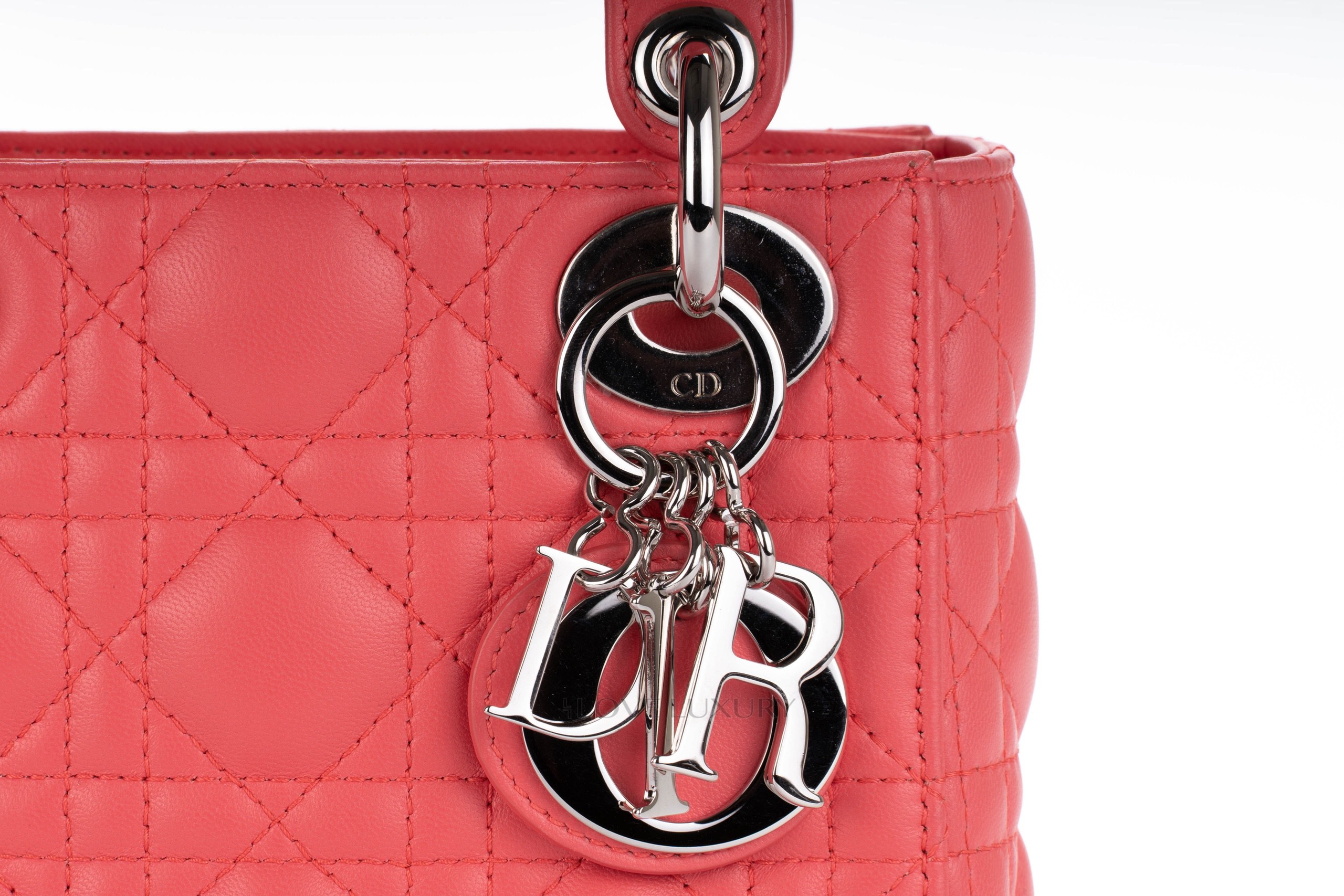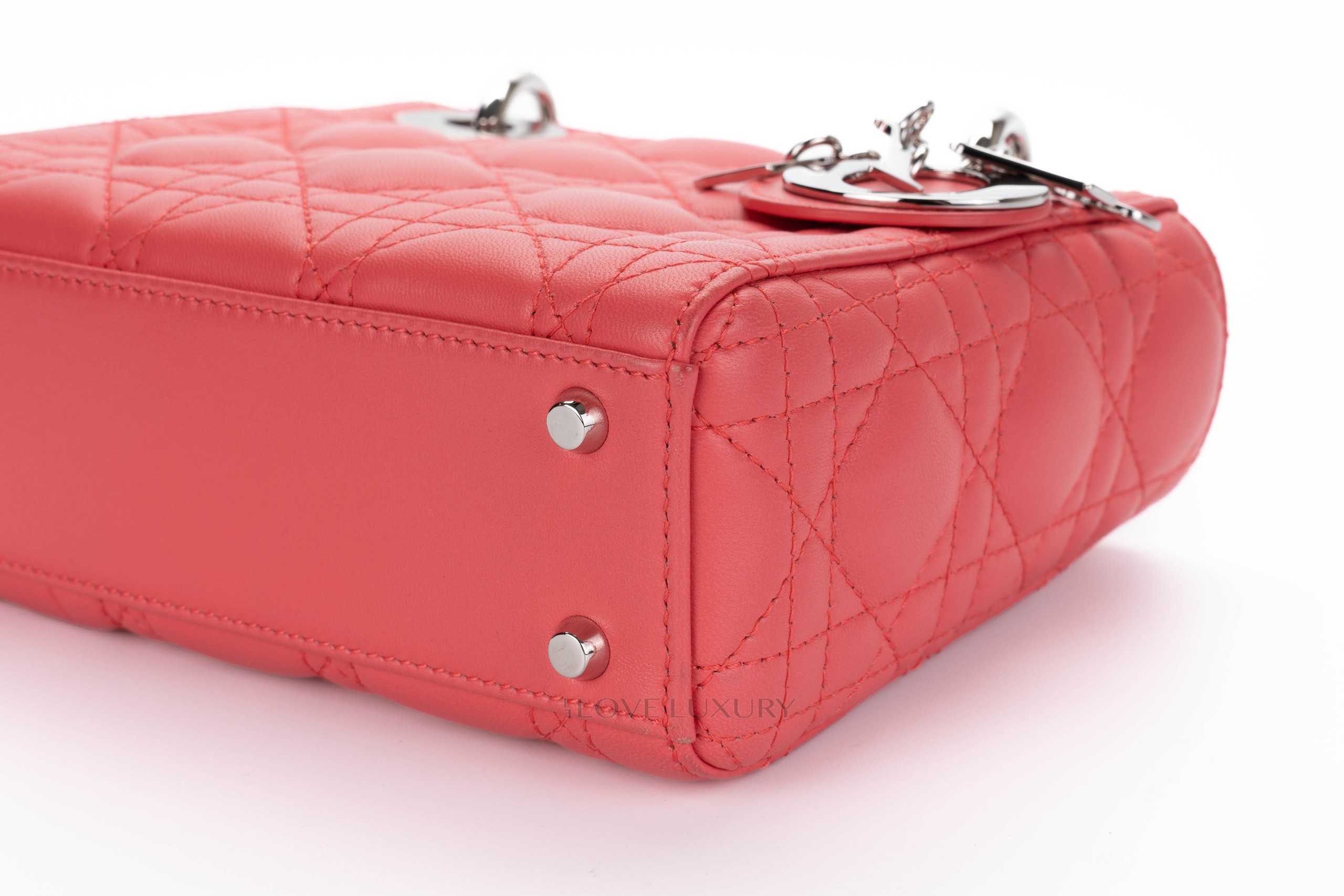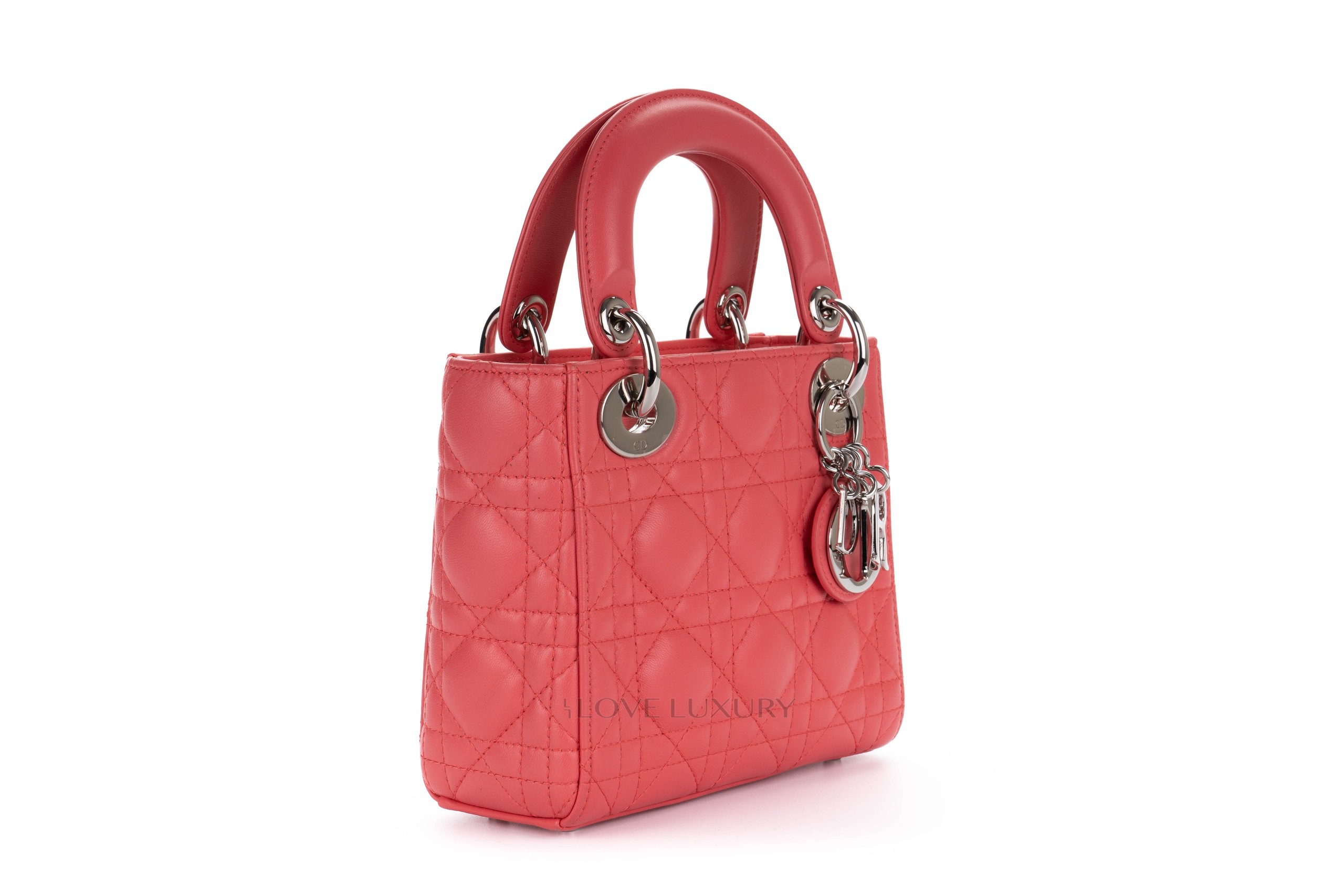 This Mini Lady Dior is from 2012 therefore it comes with the leather shoulder strap rather than the chain of the newer models. The bag is crafted from the finest Italian lambskin leather enhanced with the stiched cannage motif so well known from Dior. This bag has light signs of use on all 4 corners of the top and bottom of the bag however this is very minimal, the hardware is mostly stickered and the feet show some light scratching as does the DIOR charm. Internally there is a few dots of black only. The handles and strap are in lovely condition however there is a small blavk mark on the strap approx 1cm long. This bag comes with strap, dustbag, card and authentication.