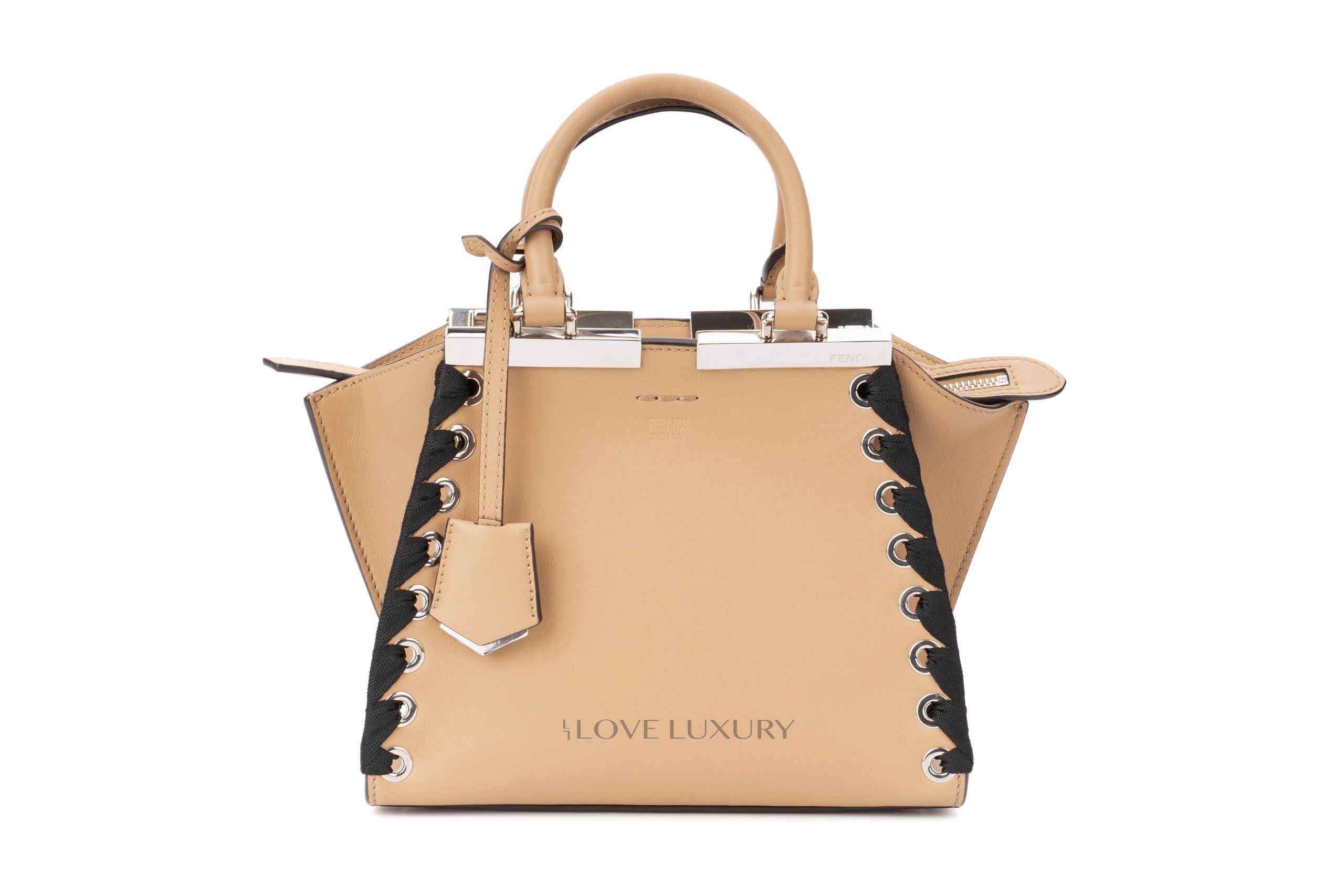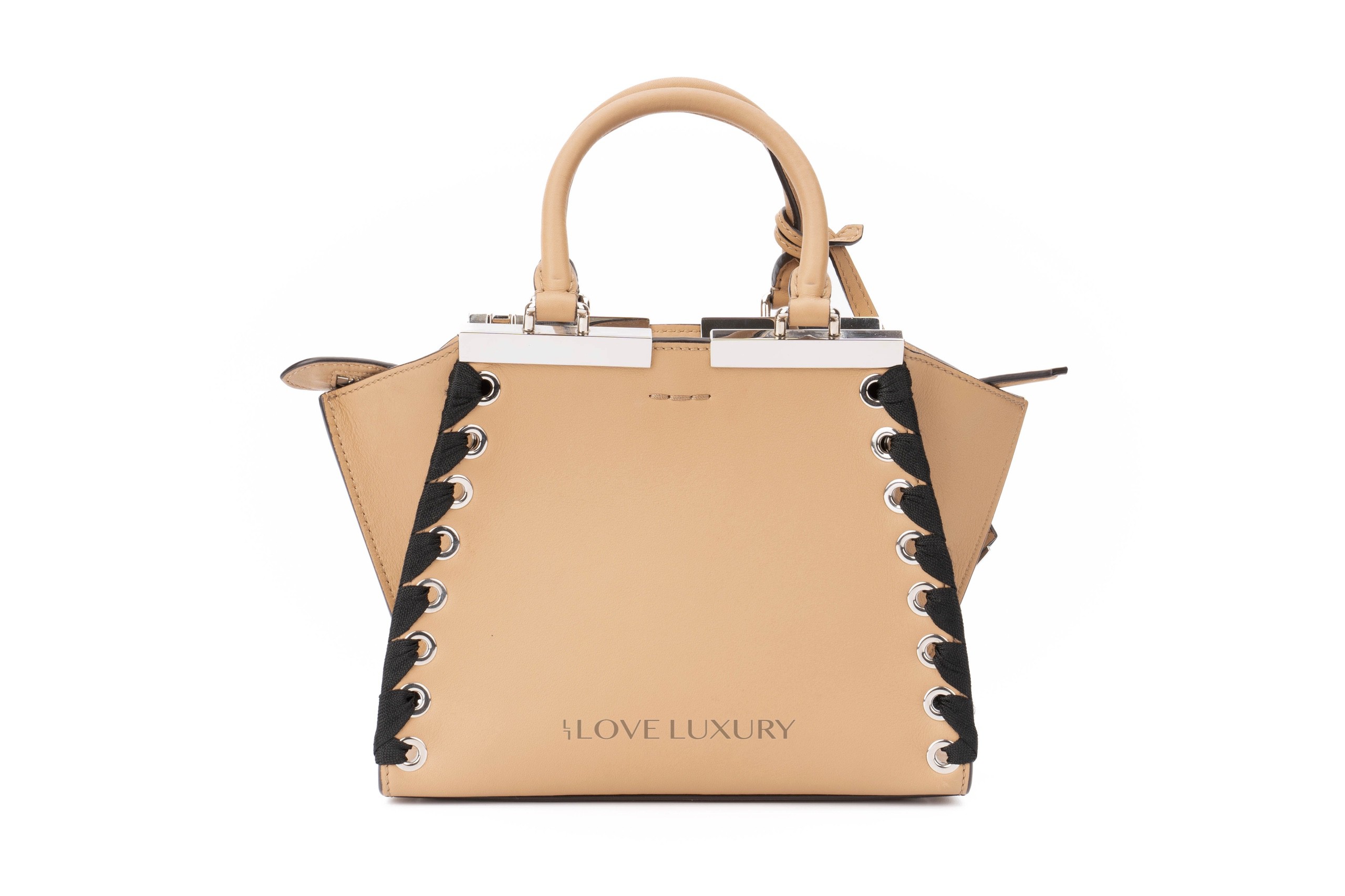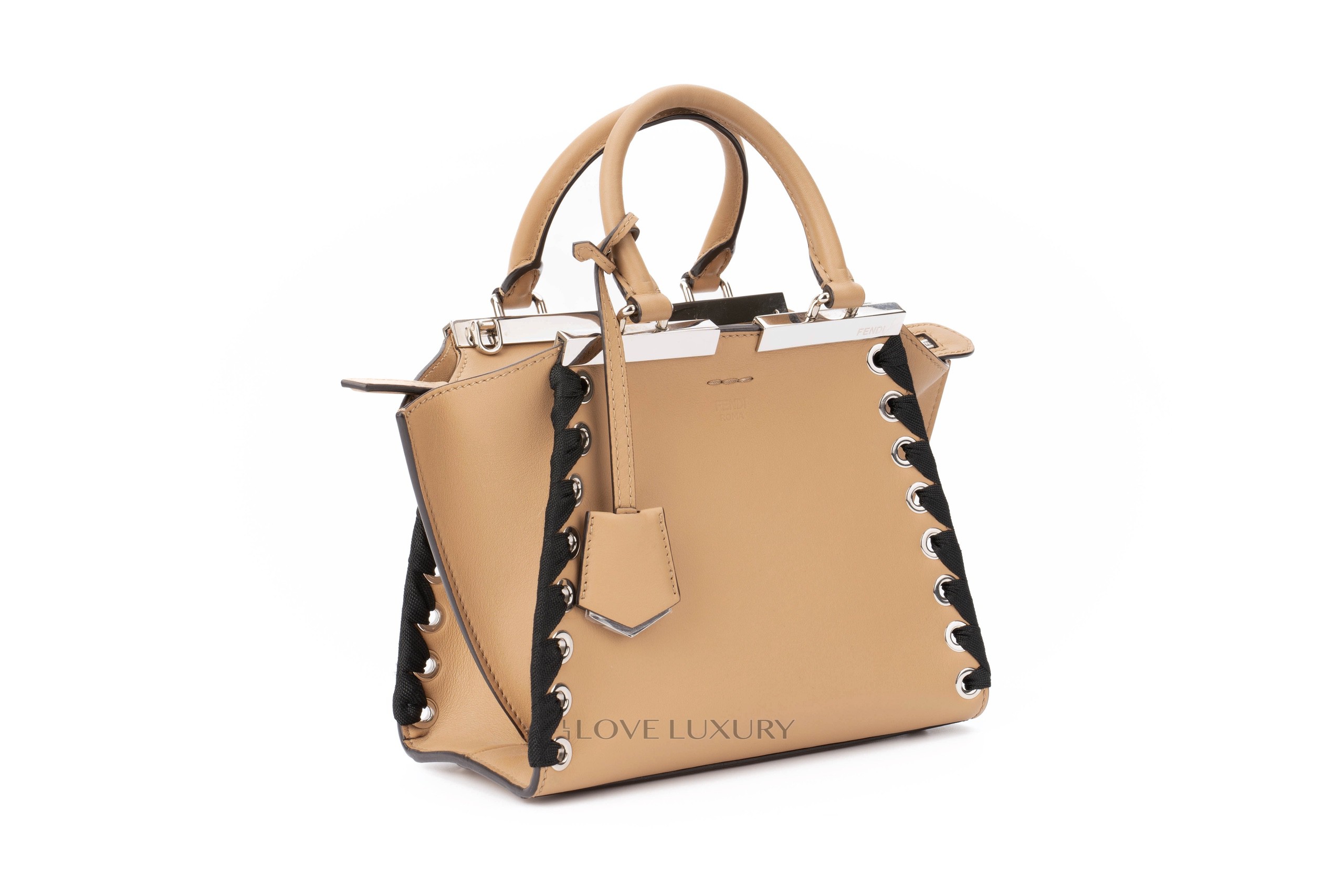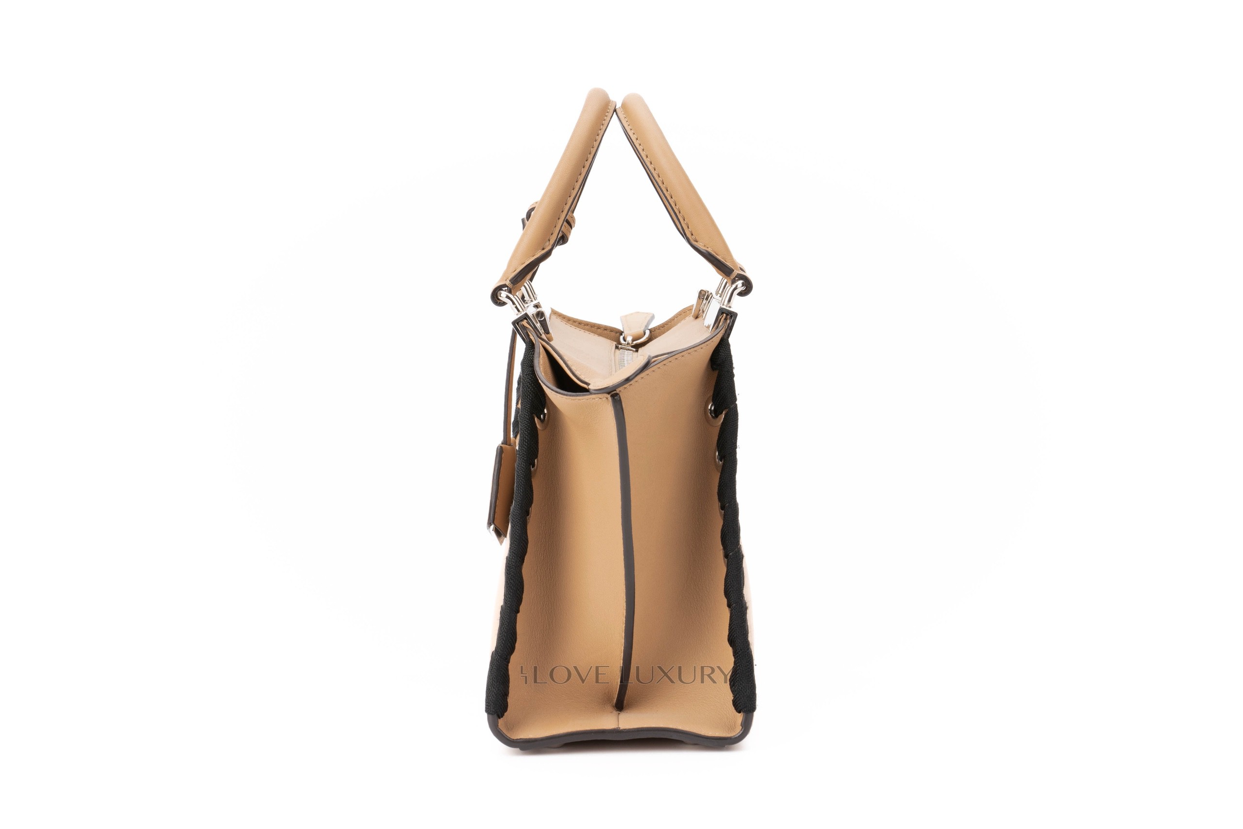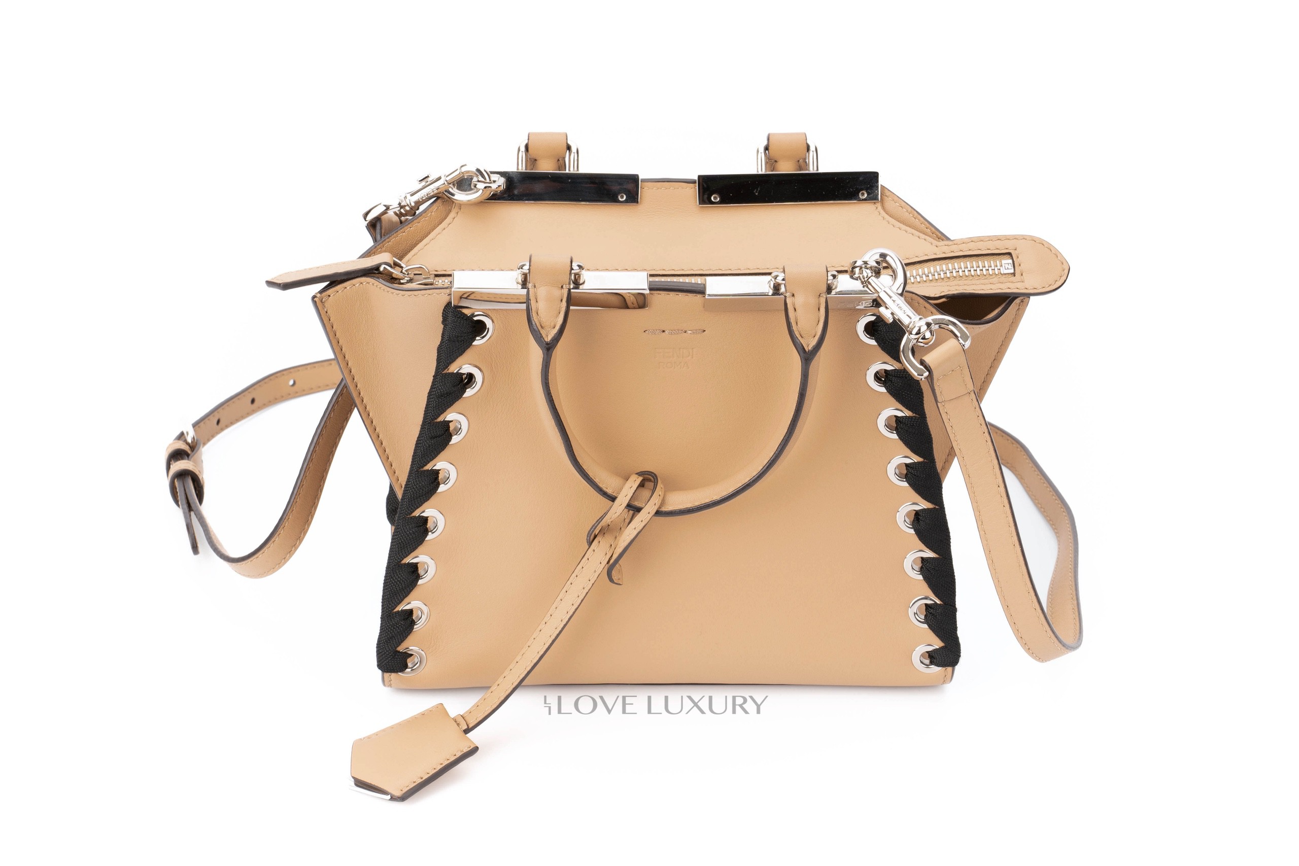 This Fendi 3 Jours is accented with Black ribbon whipstitch on the caramel beige leather through silver eyelets.  The bag comes with a Clochette and detachable strap.  The condition of this bag is as new, it has been VERY well cared for.
