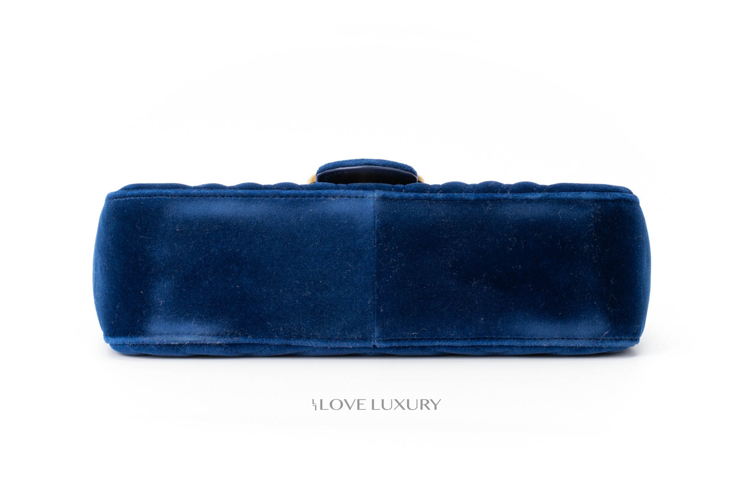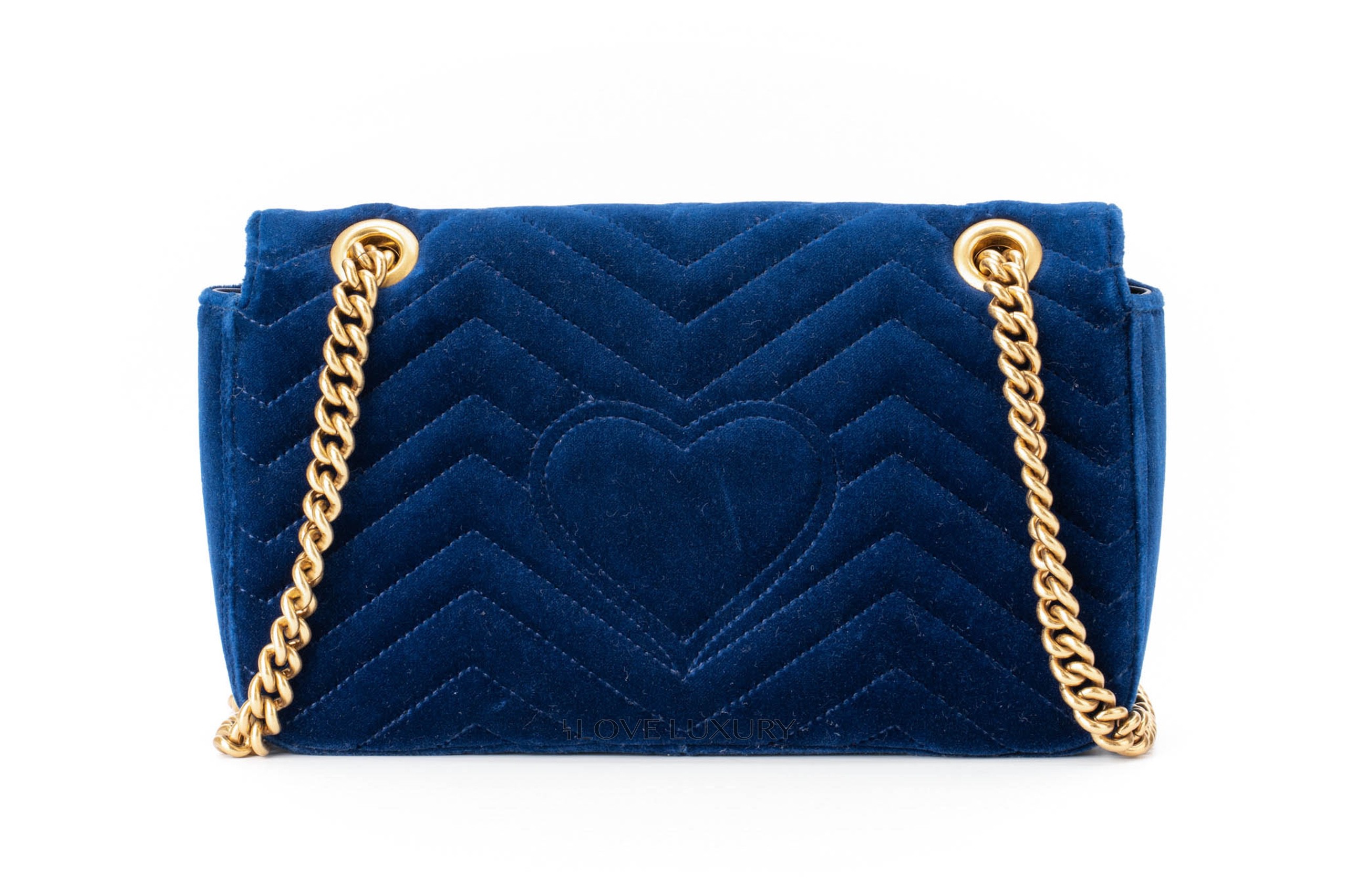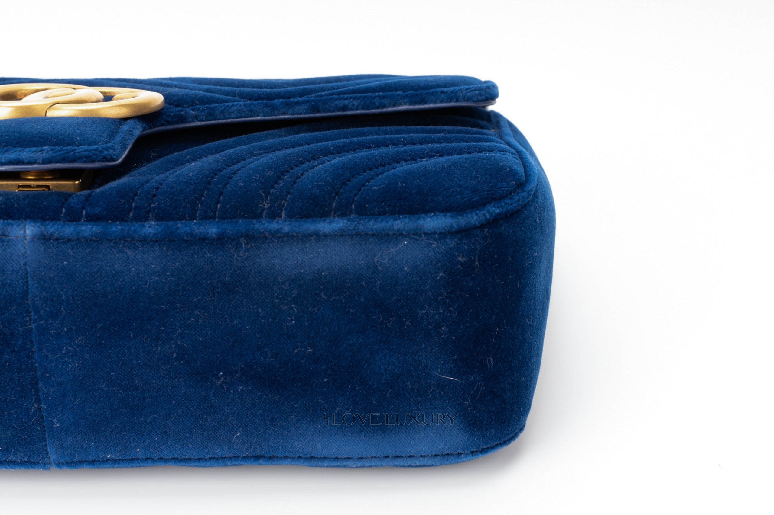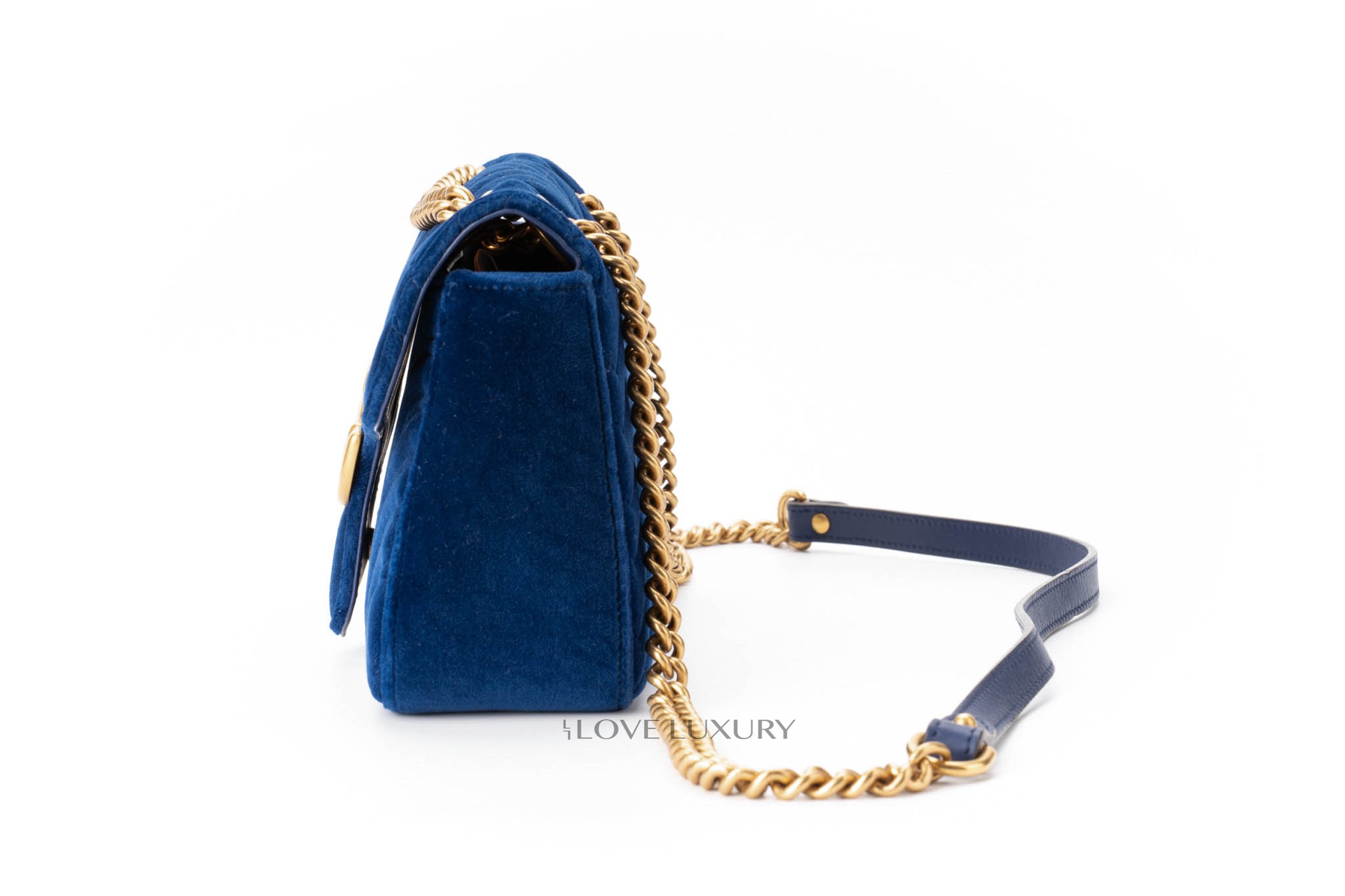 This Gucci Marmont is in a beautiful royal blue velvet giving it a very luxurious style. It is complemented by the aged gold hardware and chevron stitching. This bag only shows signs of use on the internal smooth leather flap where there are some fine nail marks and very light indentations from the strap on the front.