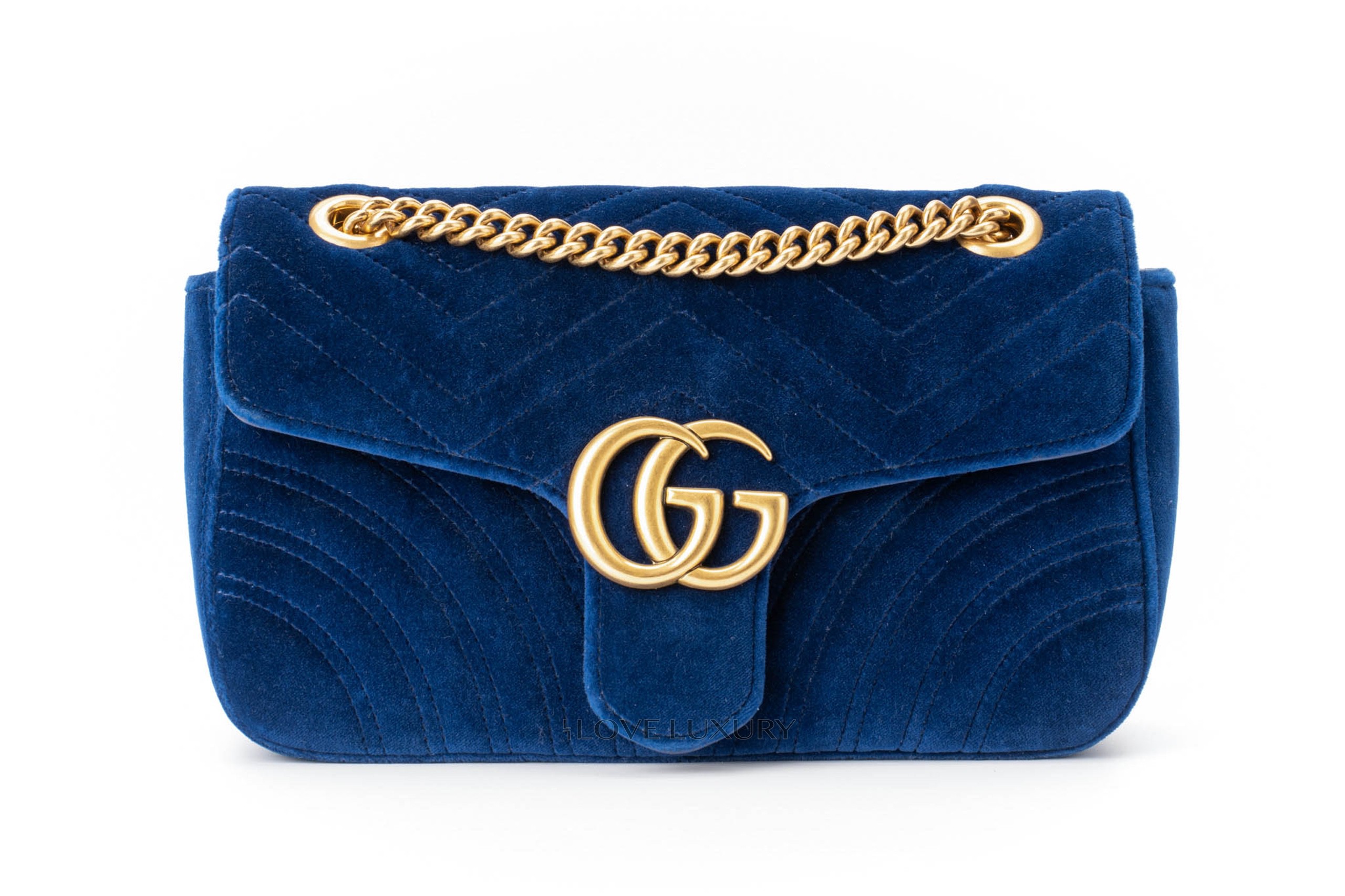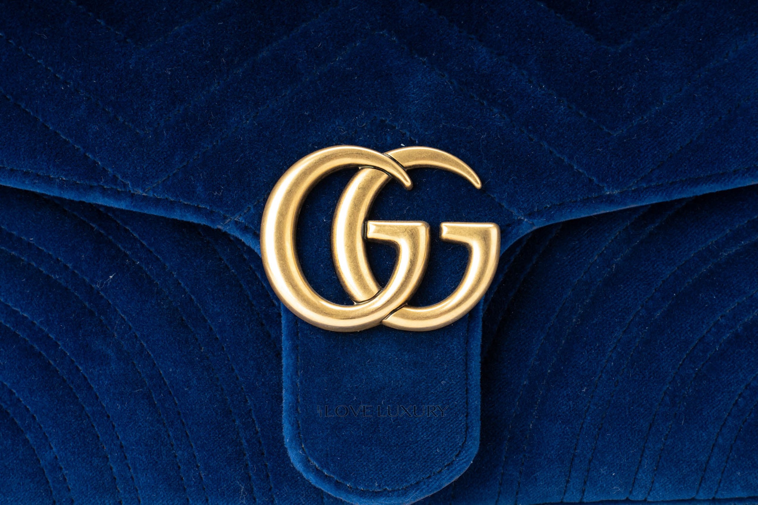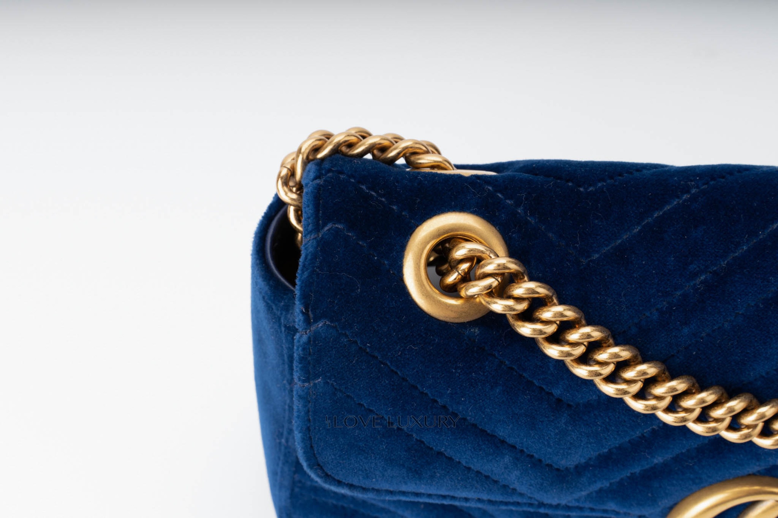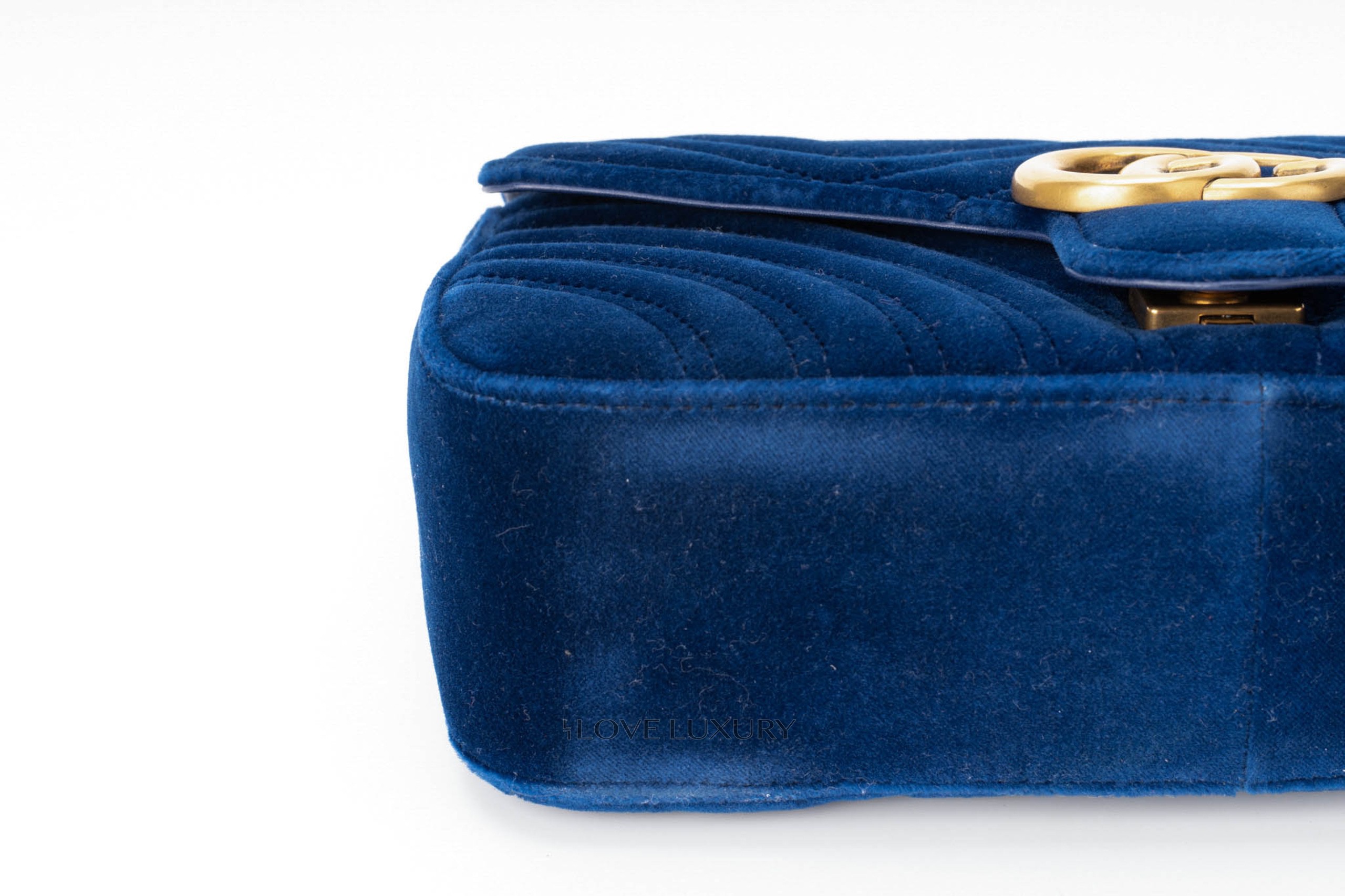 This Gucci Marmont is in a beautiful royal blue velvet giving it a very luxurious style. It is complemented by the aged gold hardware and chevron stitching. This bag only shows signs of use on the internal smooth leather flap where there are some fine nail marks and very light indentations from the strap on the front.