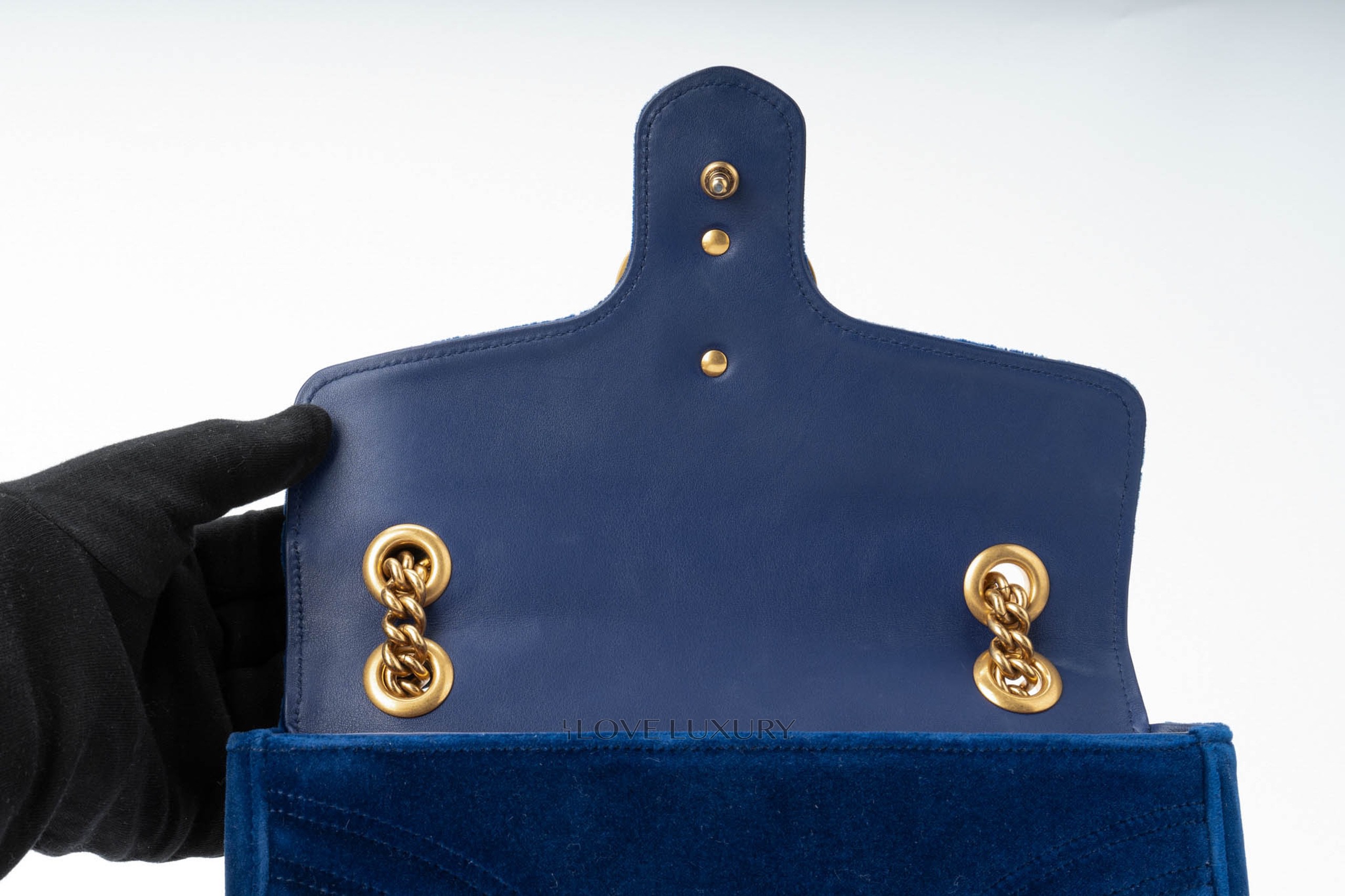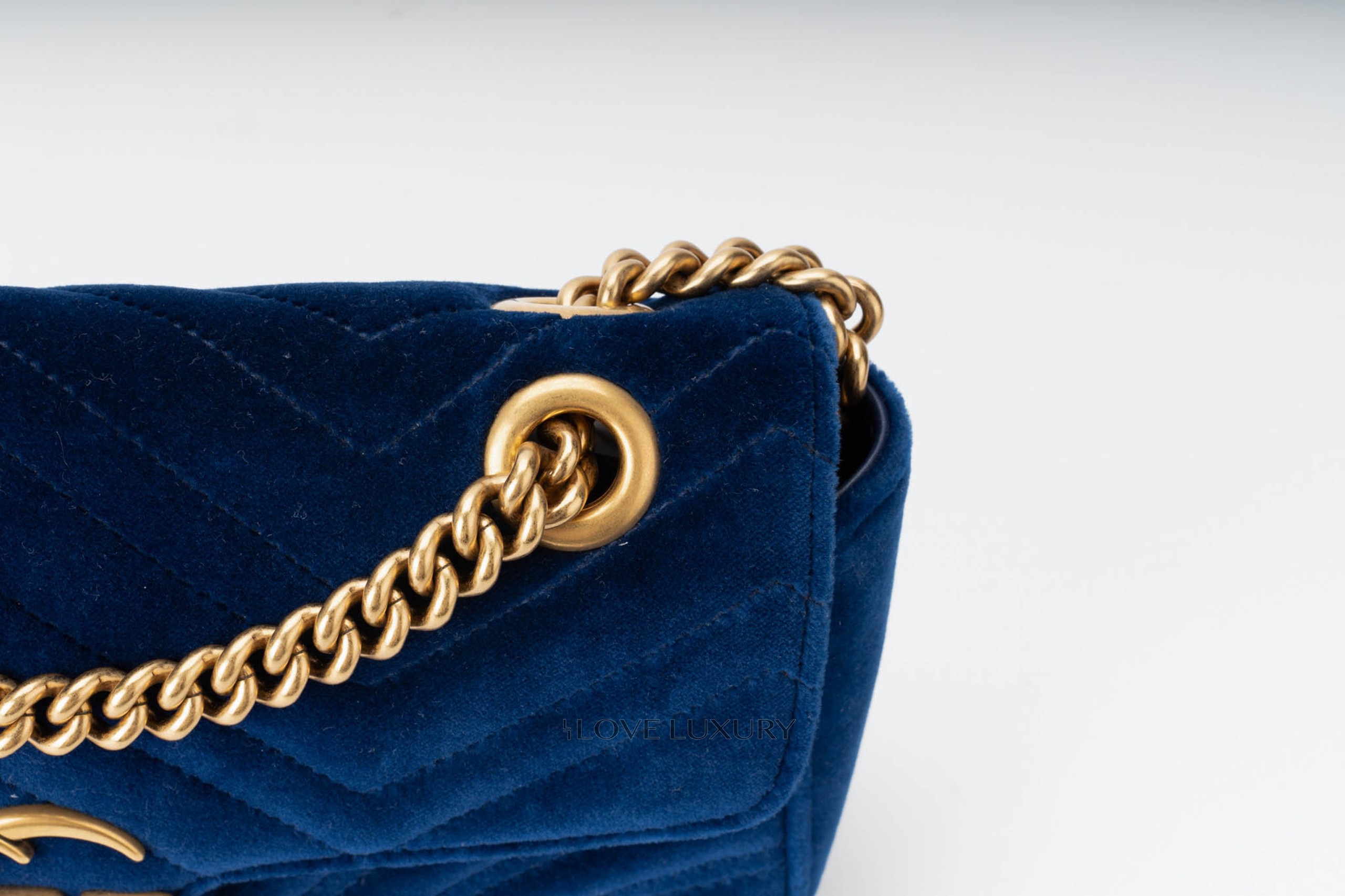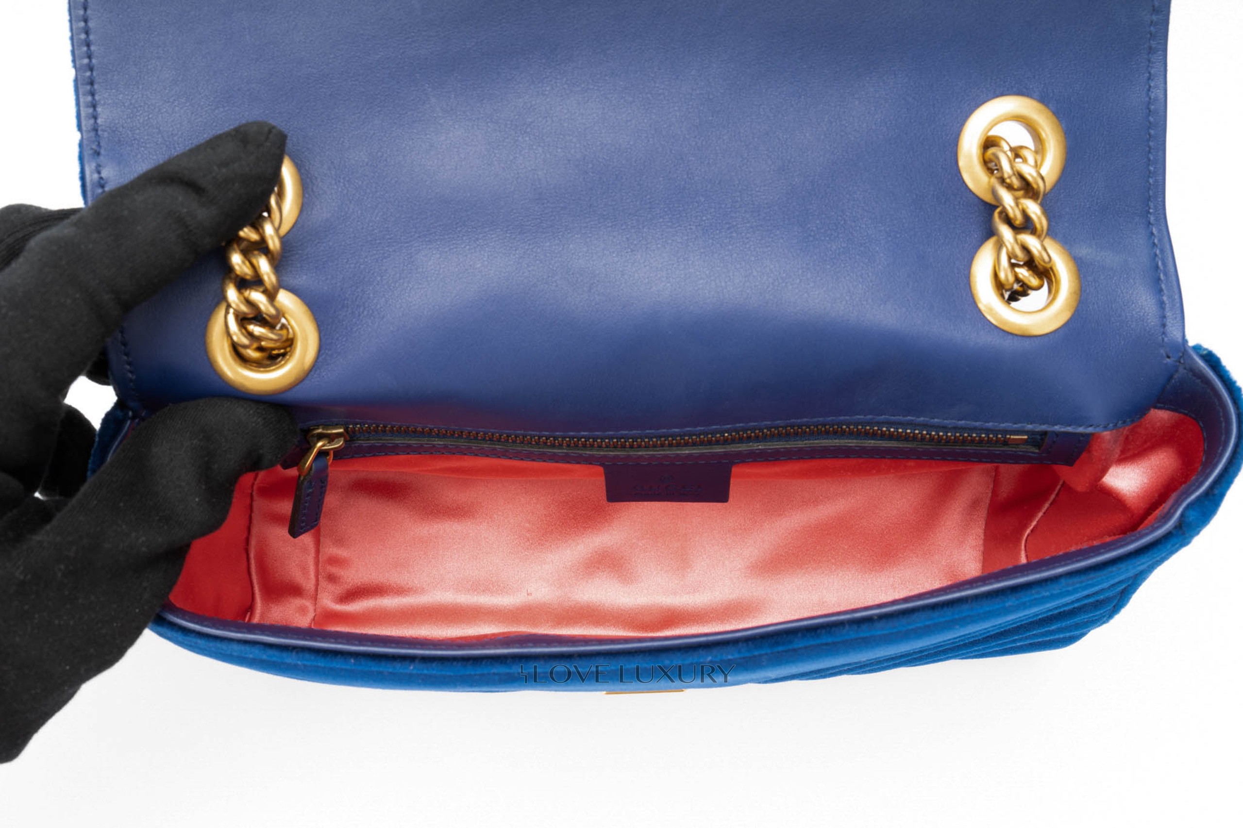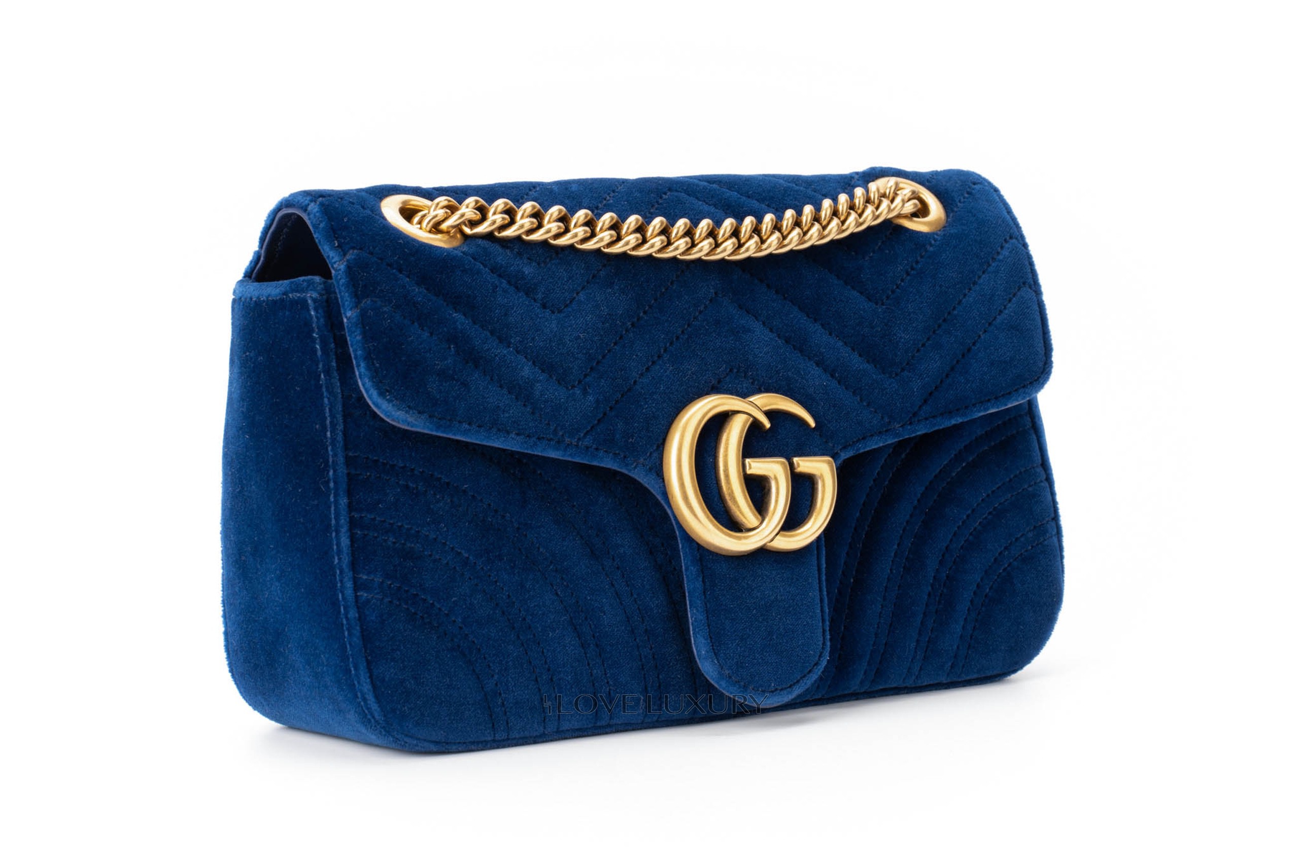 This Gucci Marmont is in a beautiful royal blue velvet giving it a very luxurious style. It is complemented by the aged gold hardware and chevron stitching. This bag only shows signs of use on the internal smooth leather flap where there are some fine nail marks and very light indentations from the strap on the front.