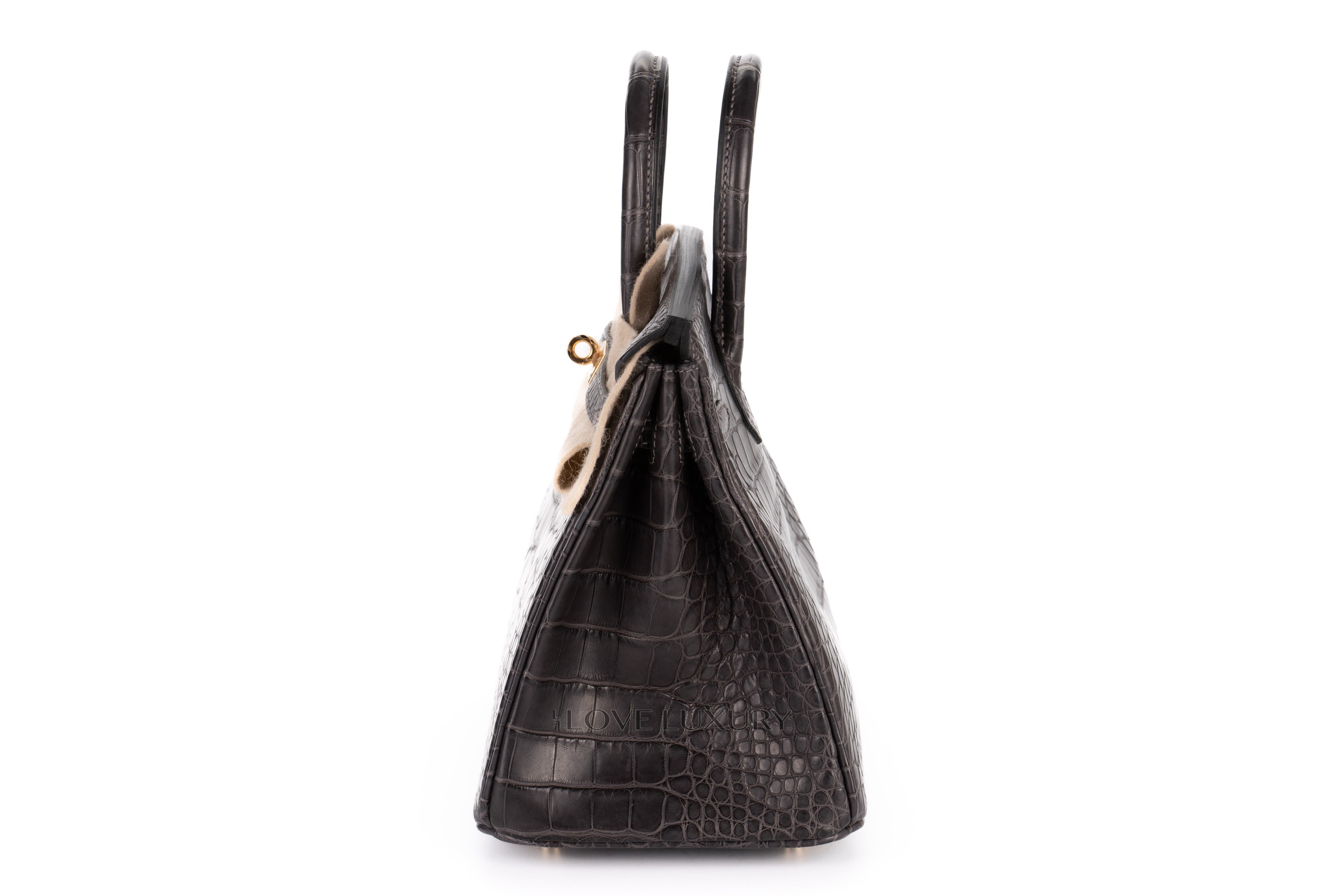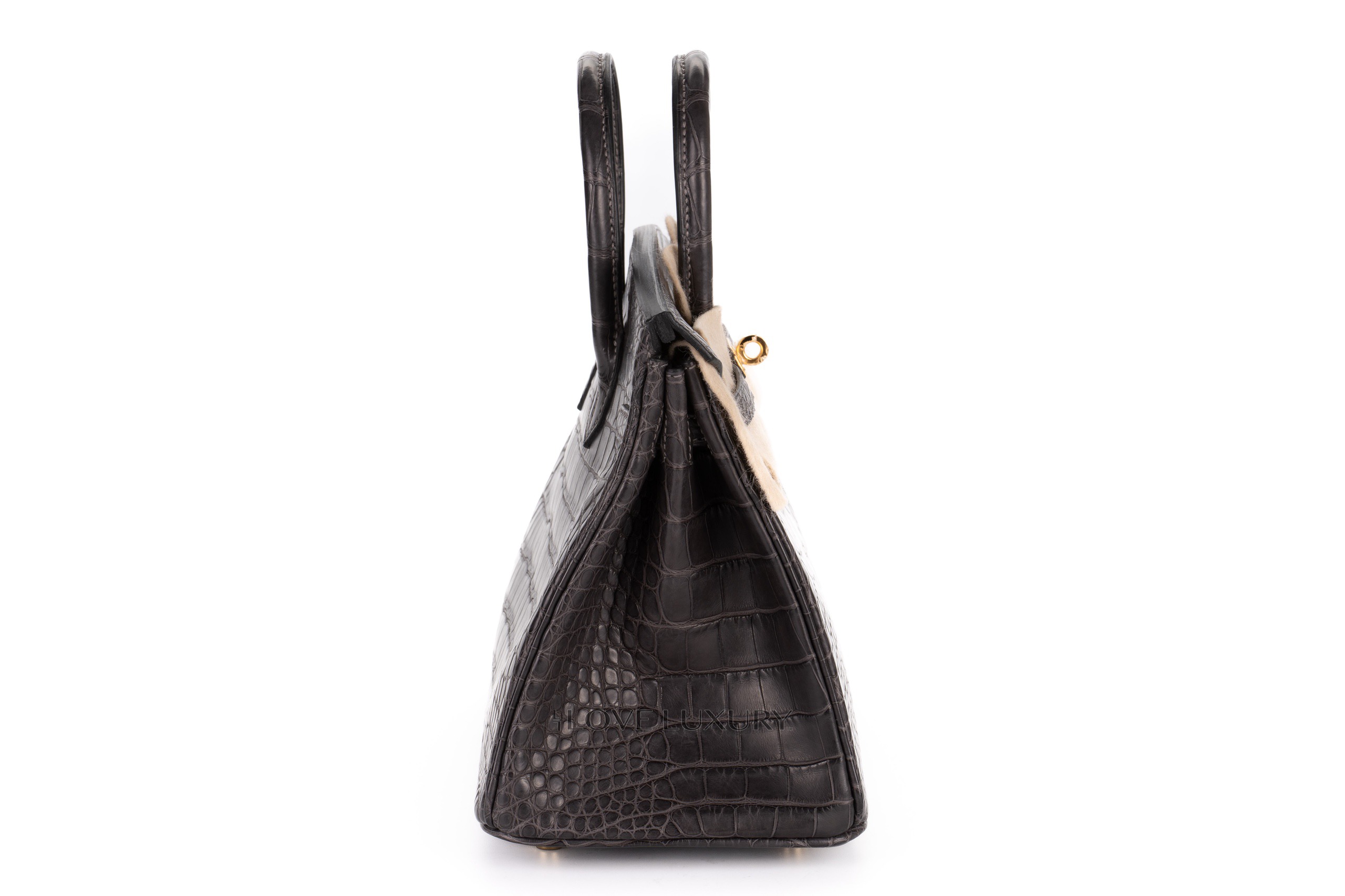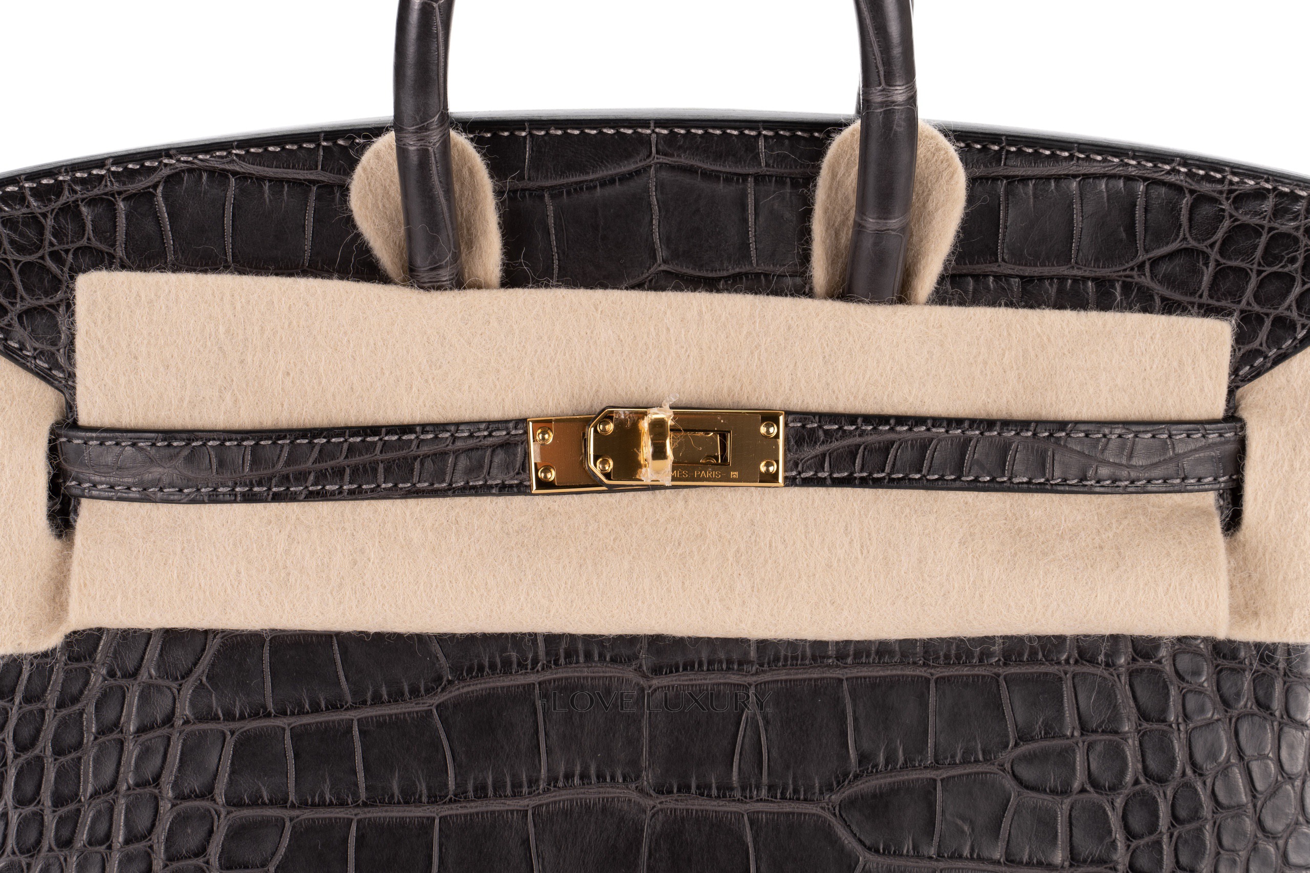 Hermès Birkin 25 in Alligator Mississippiensis graphite with gold hardware is a stunning matte bag that almost has a look of black about it. The matte finish is created using a wool felt that is buffed against the skin to achive this silky smooth finish that becomes maliable over time. This bag is box fresh and comes as a full set minus the receipt but to include the cities and third party authentication.