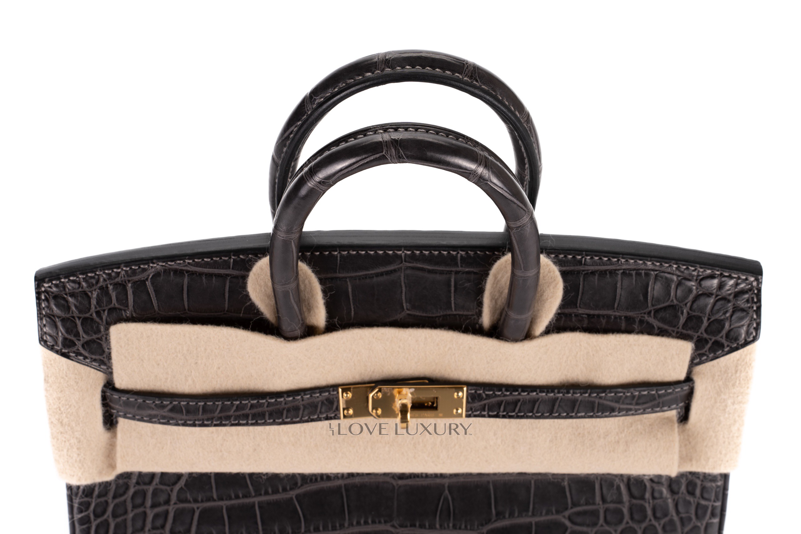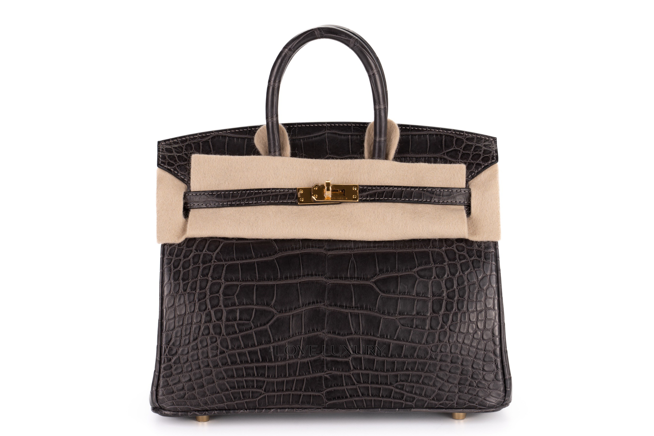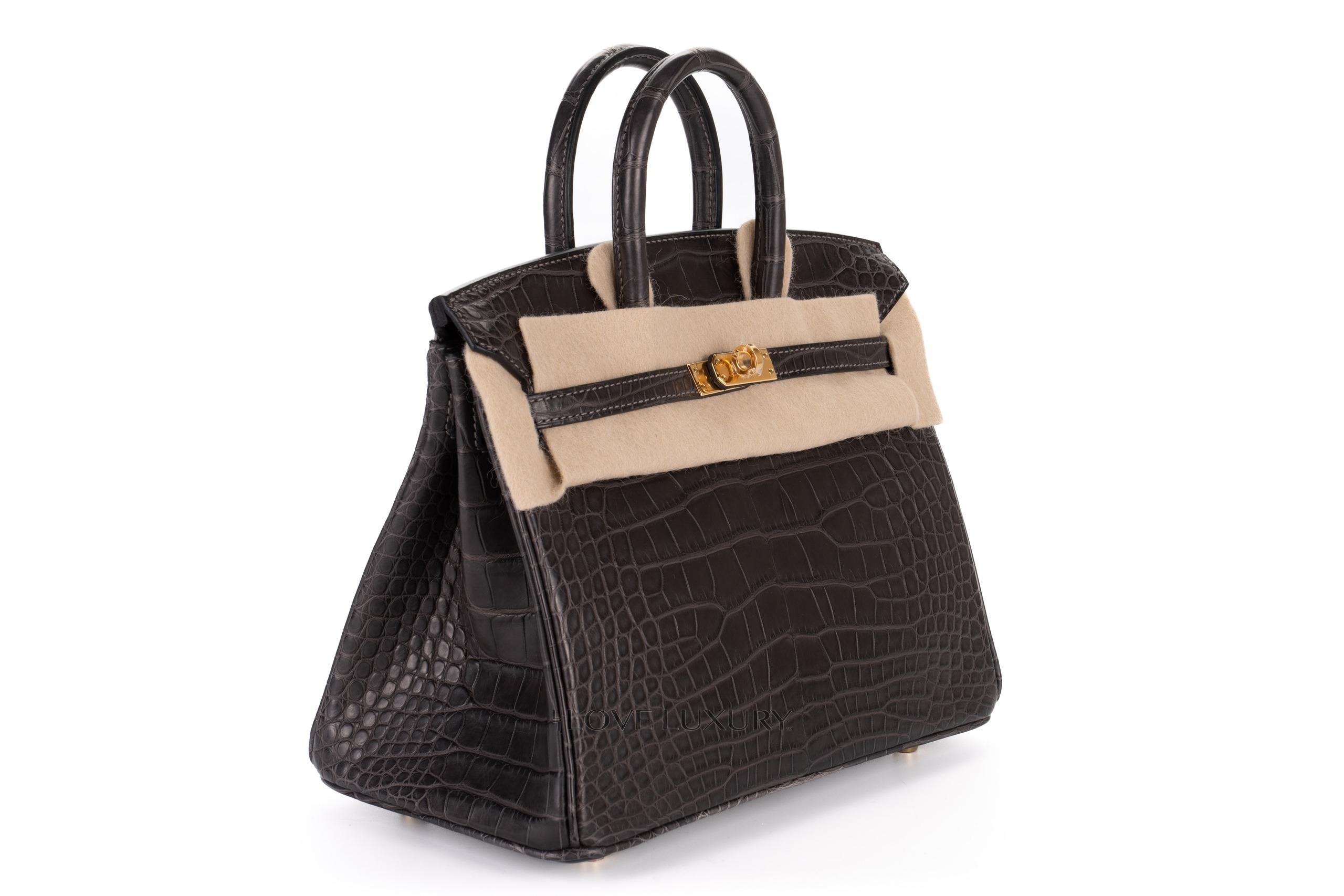 Hermès Birkin 25 in Alligator Mississippiensis graphite with gold hardware is a stunning matte bag that almost has a look of black about it. The matte finish is created using a wool felt that is buffed against the skin to achive this silky smooth finish that becomes maliable over time. This bag is box fresh and comes as a full set minus the receipt but to include the cities and third party authentication.