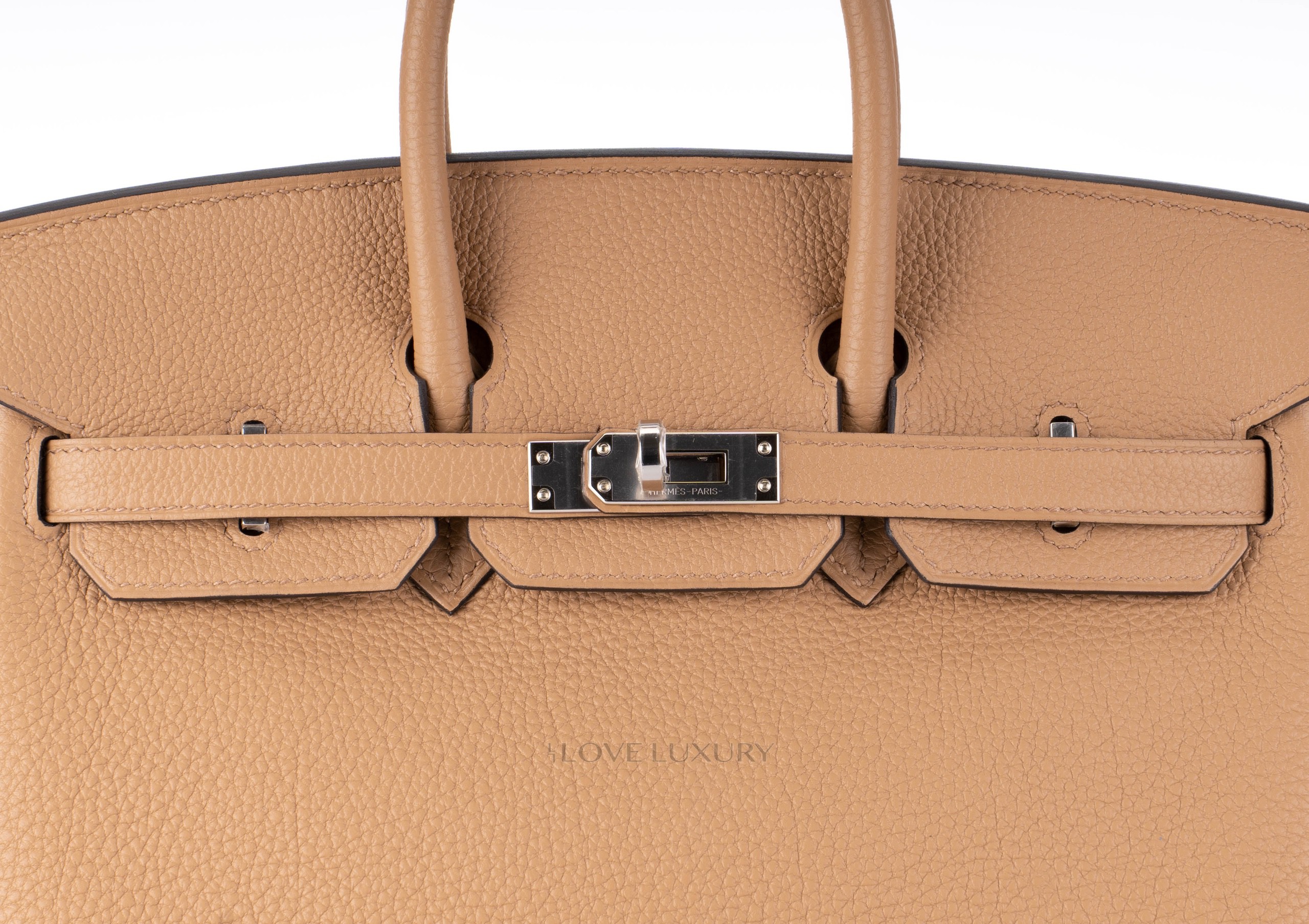 Hermès introduced the Chai colour in 2022 and since its release, no re-seller can keep this colour on the shelf and we at Love Luxury can see why. An Hermès neutral is always a winner amongst buyers and sellers alike. Chai hails its name from the masala tea in India with its creamy notes pulling it away from its gold/quebracho and biscuit counterparts. In this instance complimented by the palladium hardware and tonal stitching this Birkin 25 is an easy winner to slide into your wardrobe and fit with nearly every colour in there. This bag will come to you Box fresh.