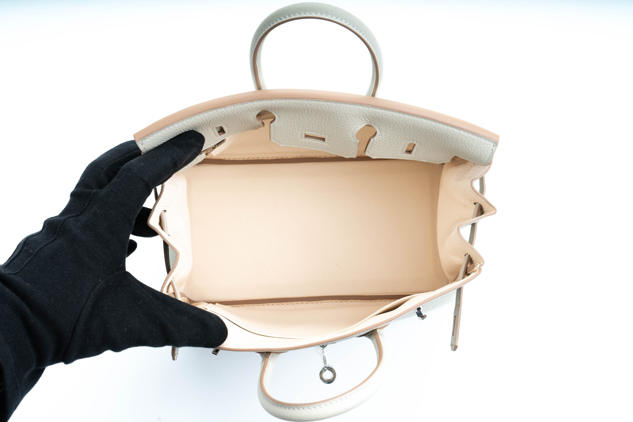 This Hermes Birkin 25 is a little more special thann your average Birkin, it is a verso Birkin which means that the iner chevre lining is a different colour to the external Togo leather. In this instance the two colours happen to be 2 of the most sought after Hermès colours produced, which are Gris Perle and Nata. The cool undertone of the Gris Perle is complimented by palladium hardware. This Bag is Box fresh and comes as a full set.