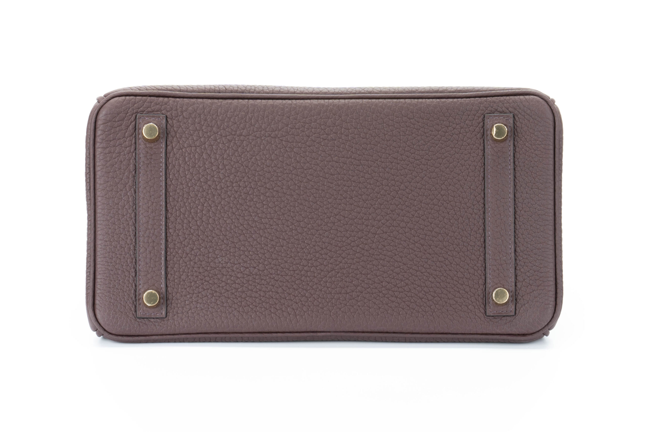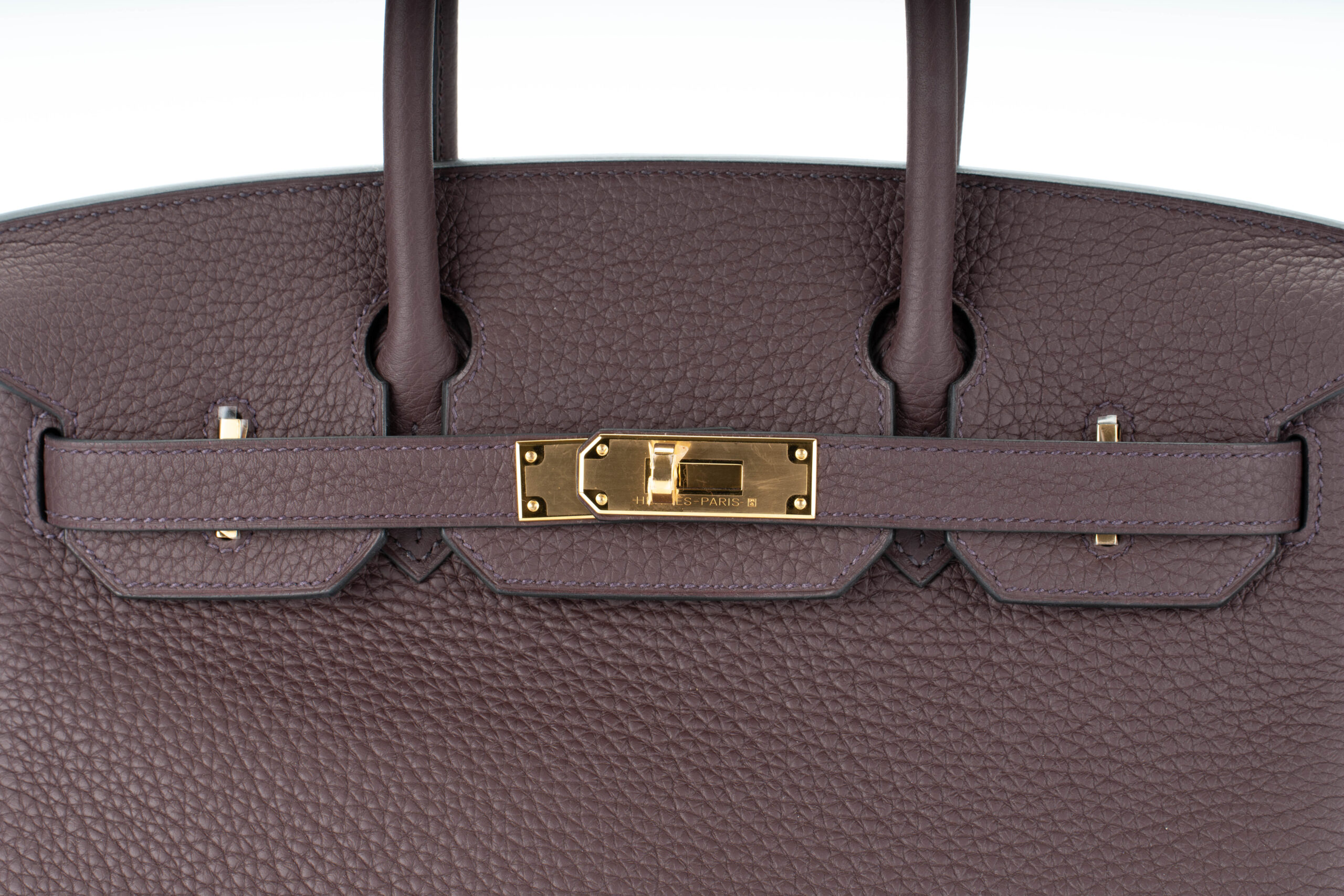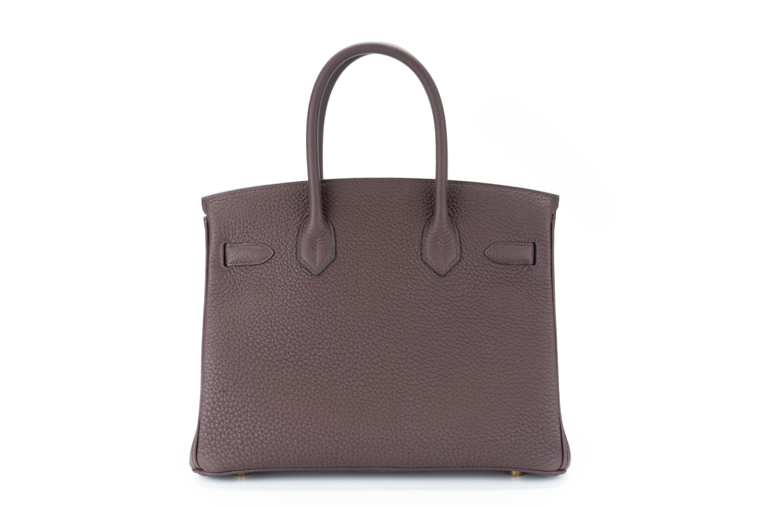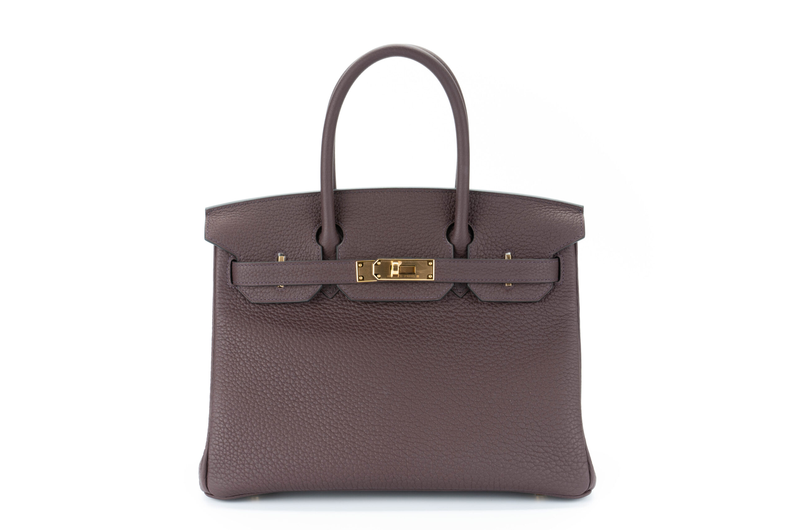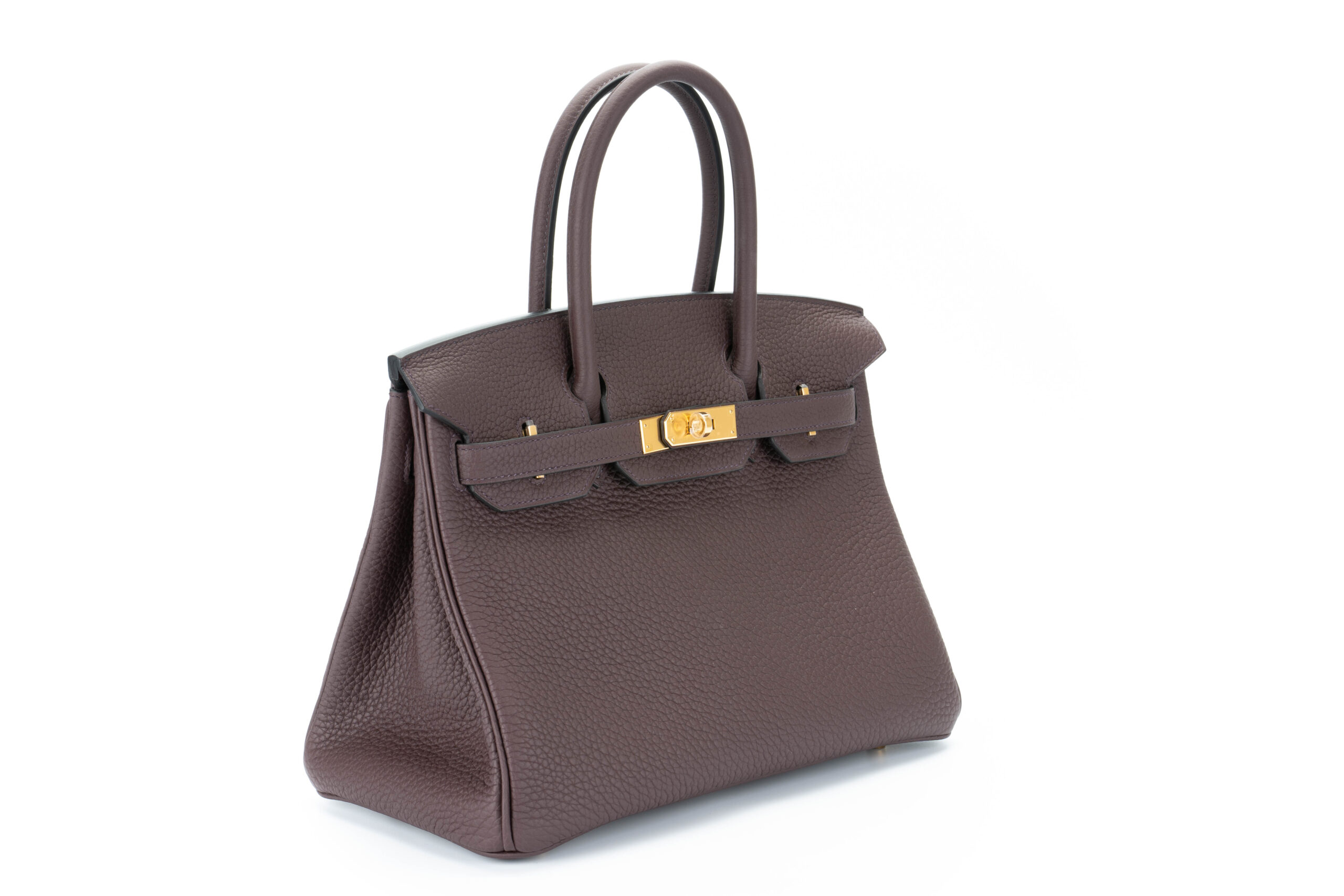 This Birkin 30 comes in the deep purpley hue of burgundy. The Leather is Hermès most sought after Togo. The deep shade of burgundy is perfectly complimented by the gold hardware. This bag is in box fresh condition and cones as a full set.
