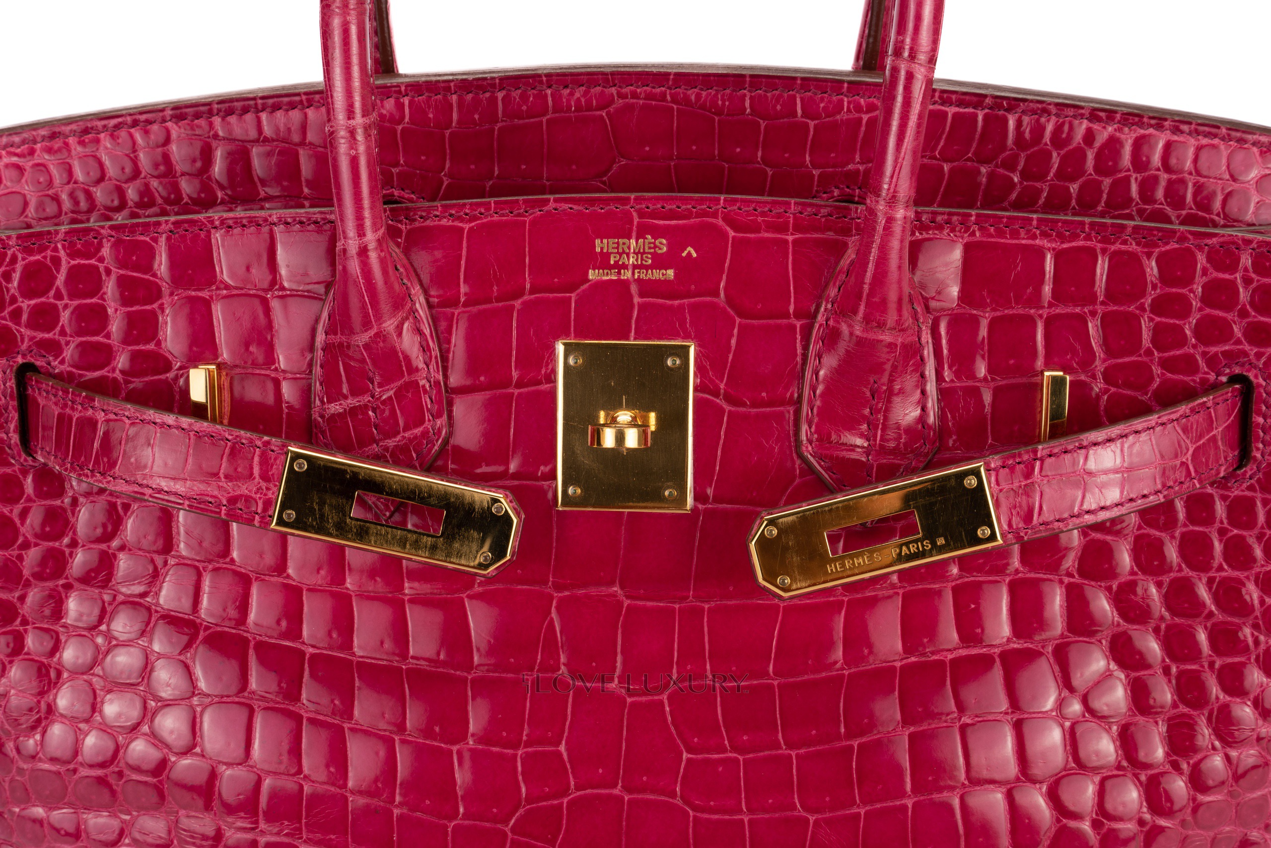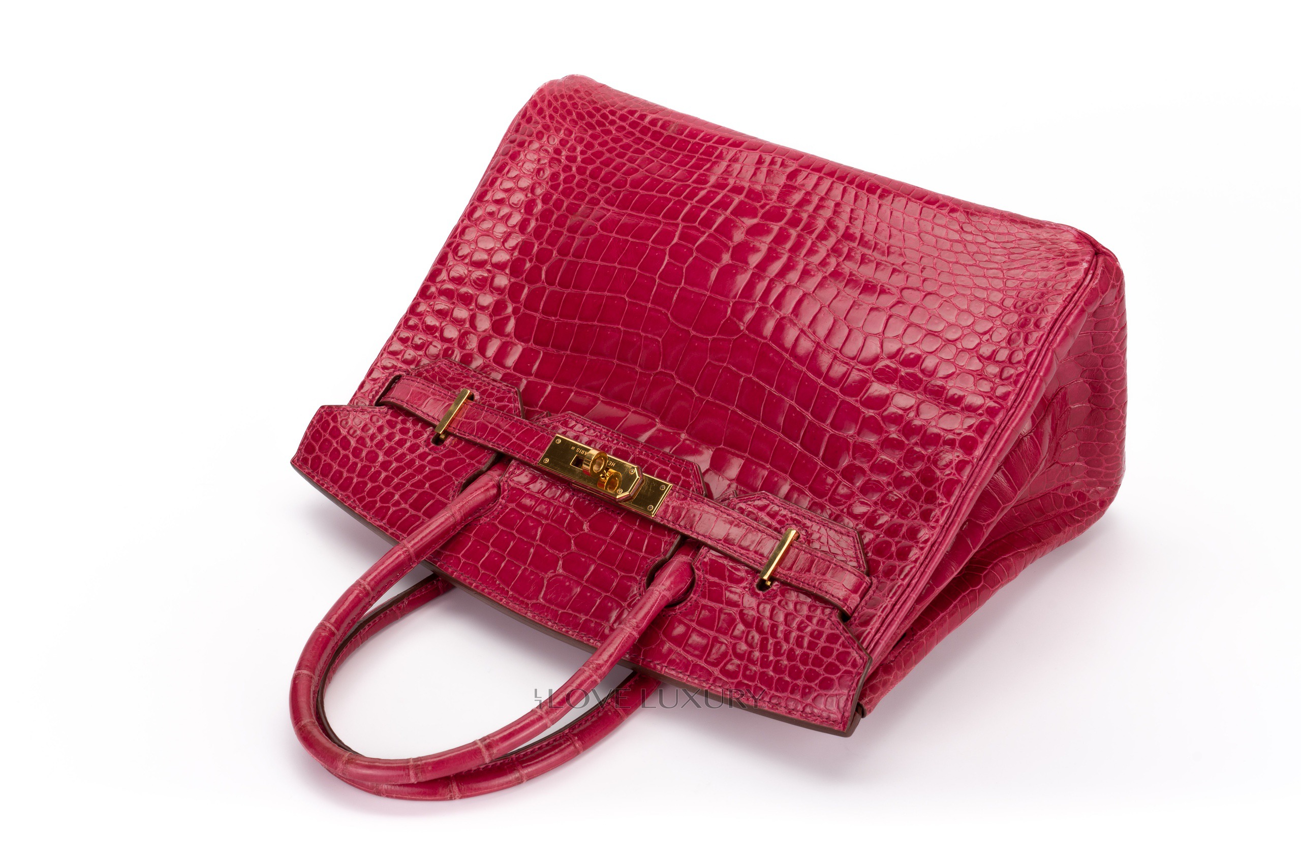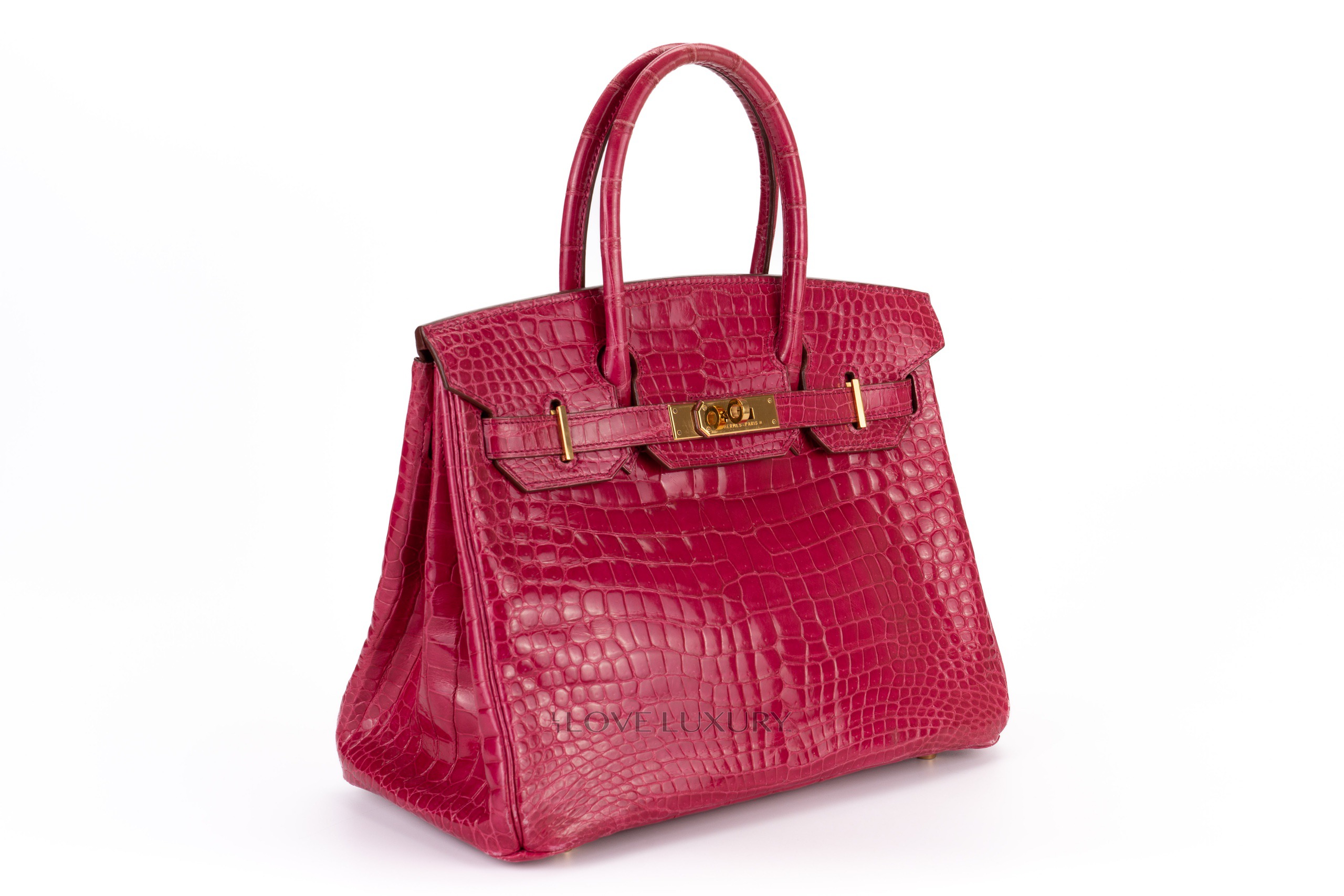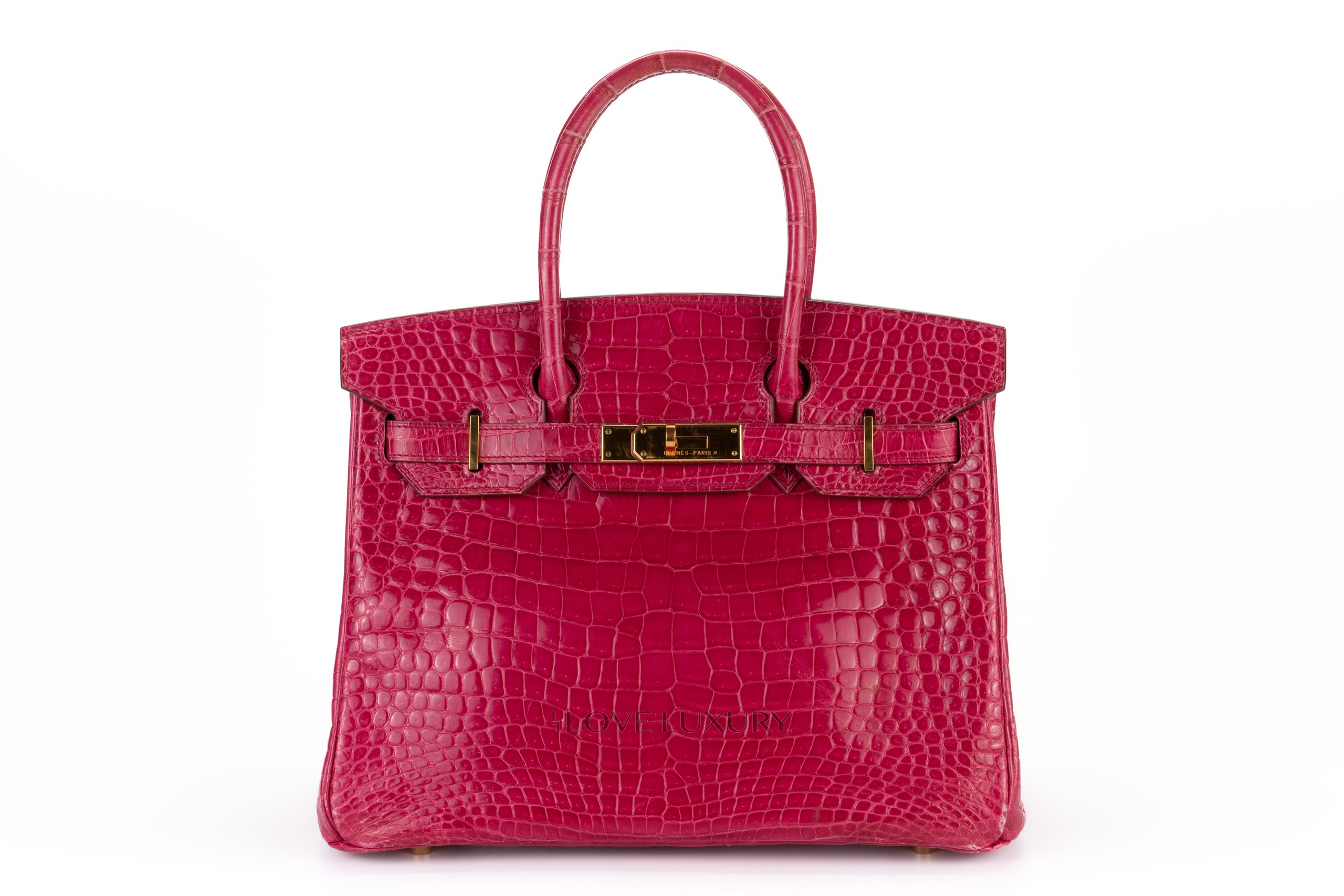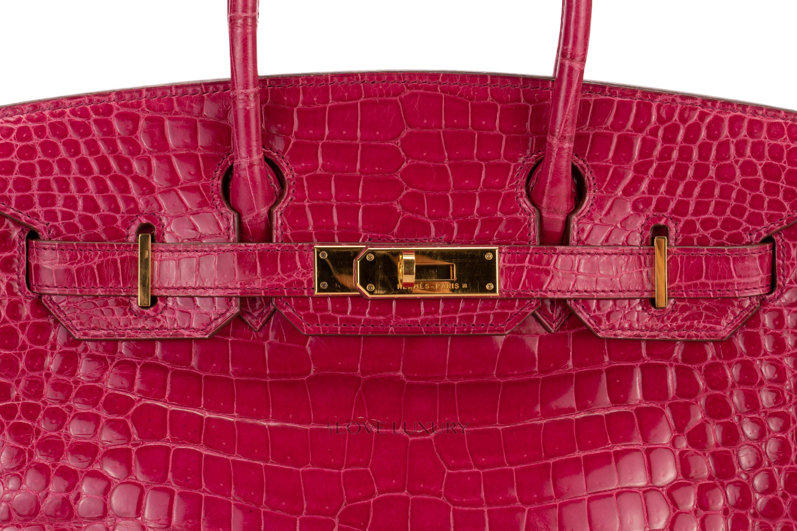 Hermès Birkin 30’s in exotic skins are not so common on the market, we tend to see bigger bags such as the b35 and smaller bags such as the b25. The Birkin 30 in Lisse (shiny) Crocodile is in Scheherazade colour with gold hardware. This fabulous colour combination is a beauty to behold, the bright pink with the gold accents really is a rich but fun combination. This bag is F Square 2002 with visable signs of use on the corners and light, not deep scratches to the hardware. This bag comes with dustbag, lock, key, clochette and authentication, no box, no receipt and no cities. The combination of the colour way, hardware and size is actually a very rare combination to find as not many of them were crafted.
