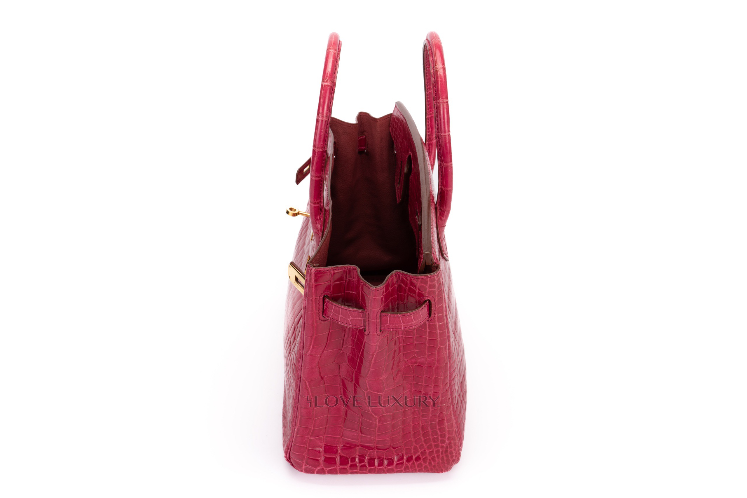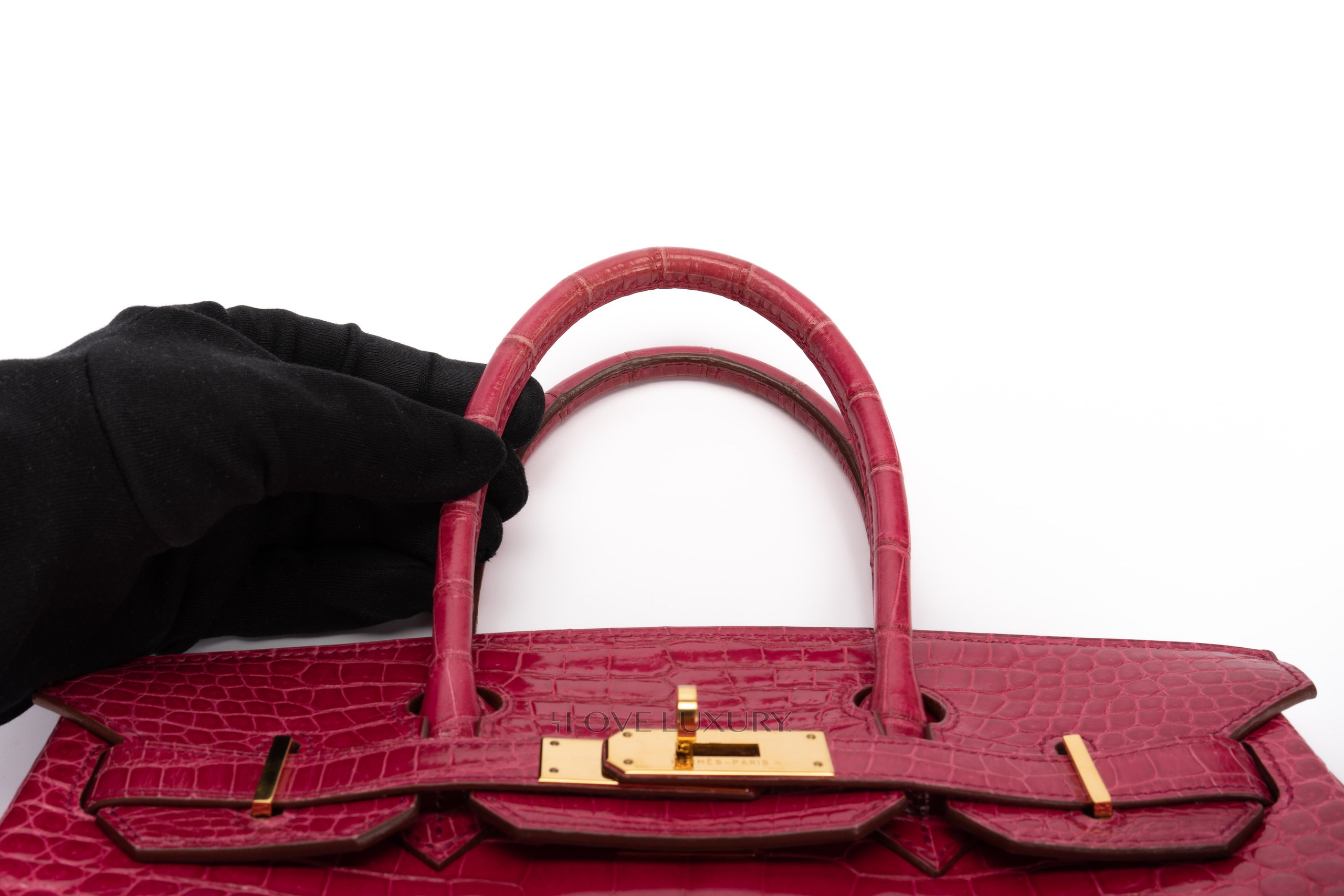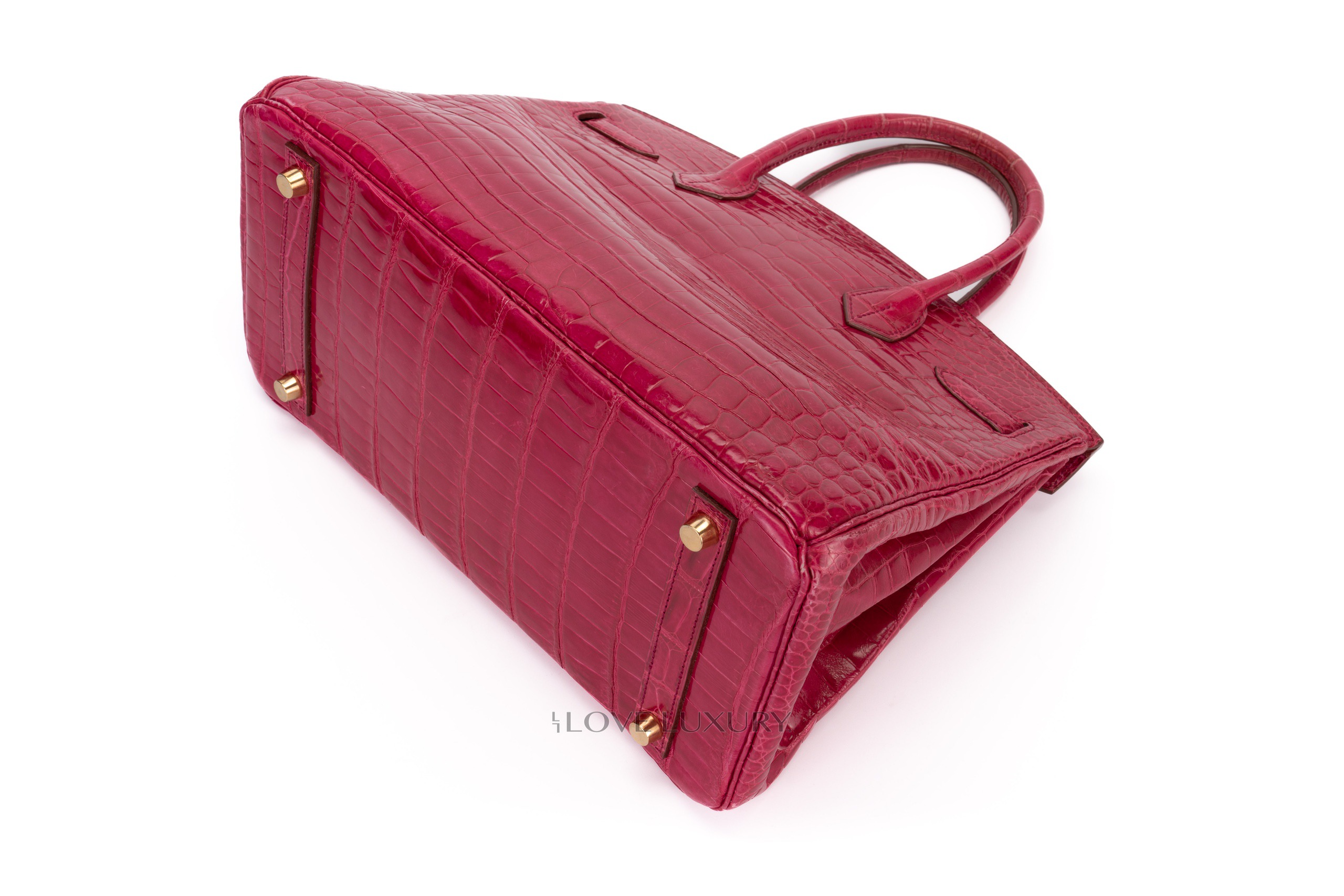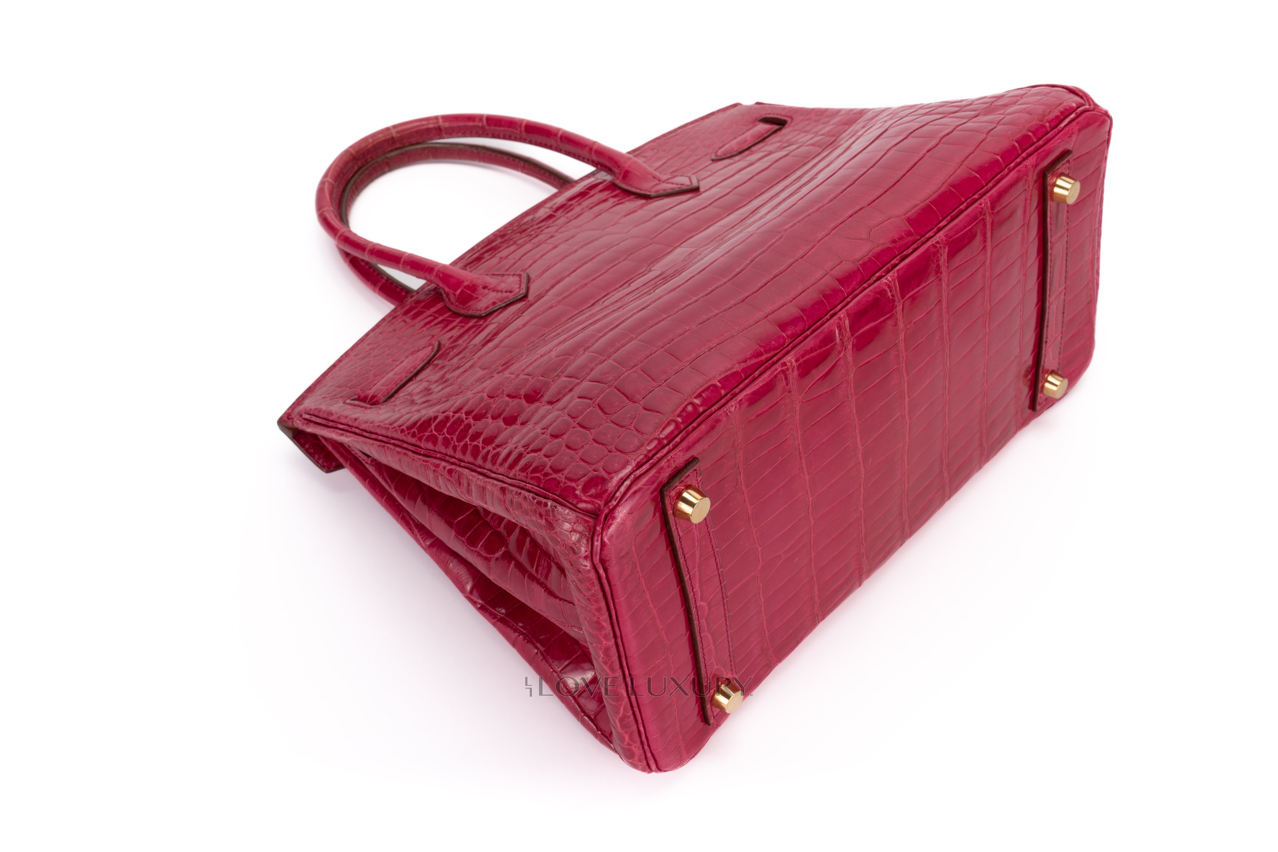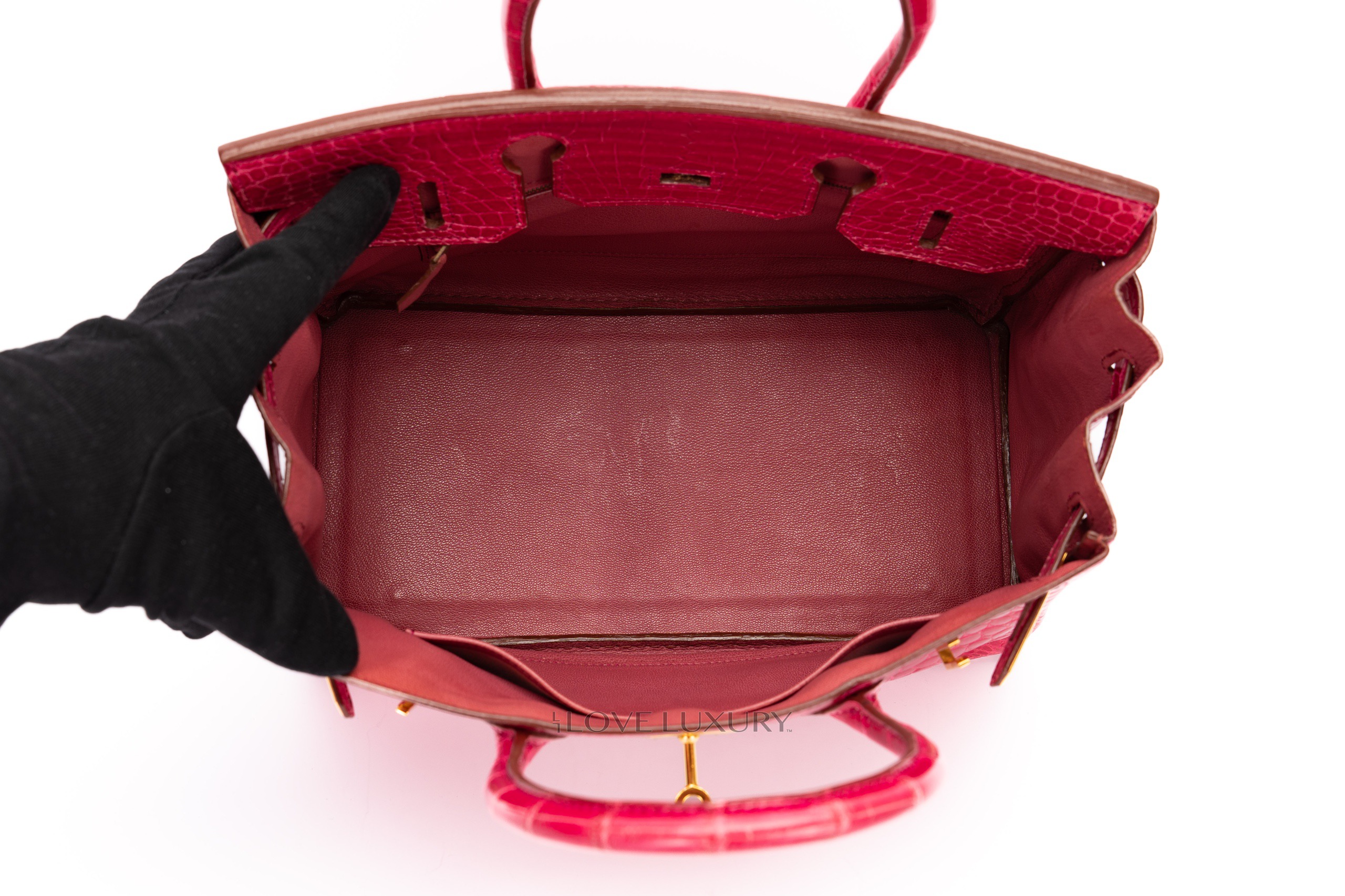 Hermès Birkin 30’s in exotic skins are not so common on the market, we tend to see bigger bags such as the b35 and smaller bags such as the b25. The Birkin 30 in Lisse (shiny) Crocodile is in Scheherazade colour with gold hardware. This fabulous colour combination is a beauty to behold, the bright pink with the gold accents really is a rich but fun combination. This bag is F Square 2002 with visable signs of use on the corners and light, not deep scratches to the hardware. This bag comes with dustbag, lock, key, clochette and authentication, no box, no receipt and no cities. The combination of the colour way, hardware and size is actually a very rare combination to find as not many of them were crafted.