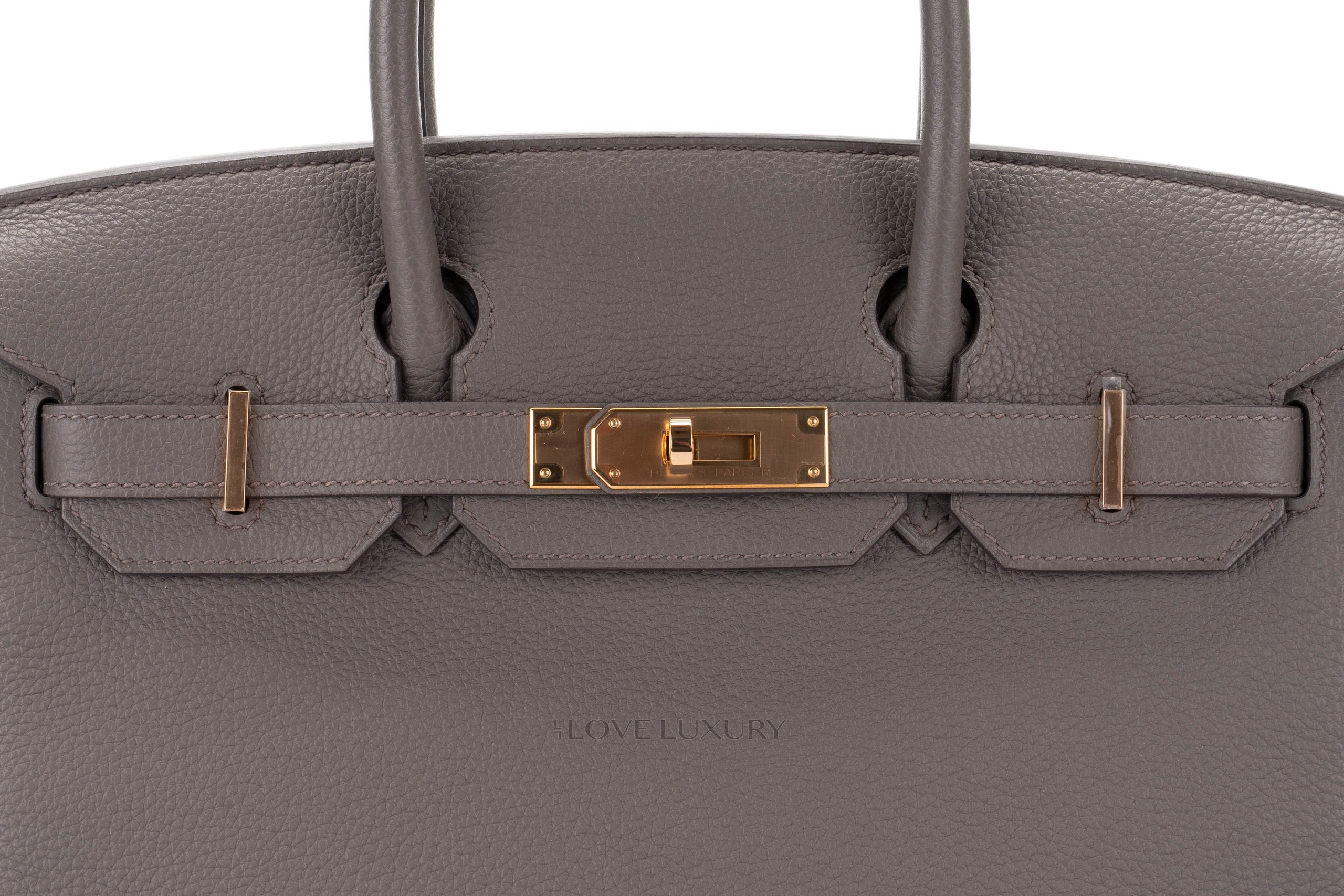 Herms Gris Etain is the modern Etain colour, in recent years the gris etain shows a slightly deeper shade of grey with less of the brown notes and the resin is now a tonal shade rather than a contrasting shade as per the old etain colour way. This New shade of gris etain looks fabulous with gold hardware and is crafted in the infamous Togo leather which lends itself so well to durability and scratch resistance. This bag comes in Box fresh condition.