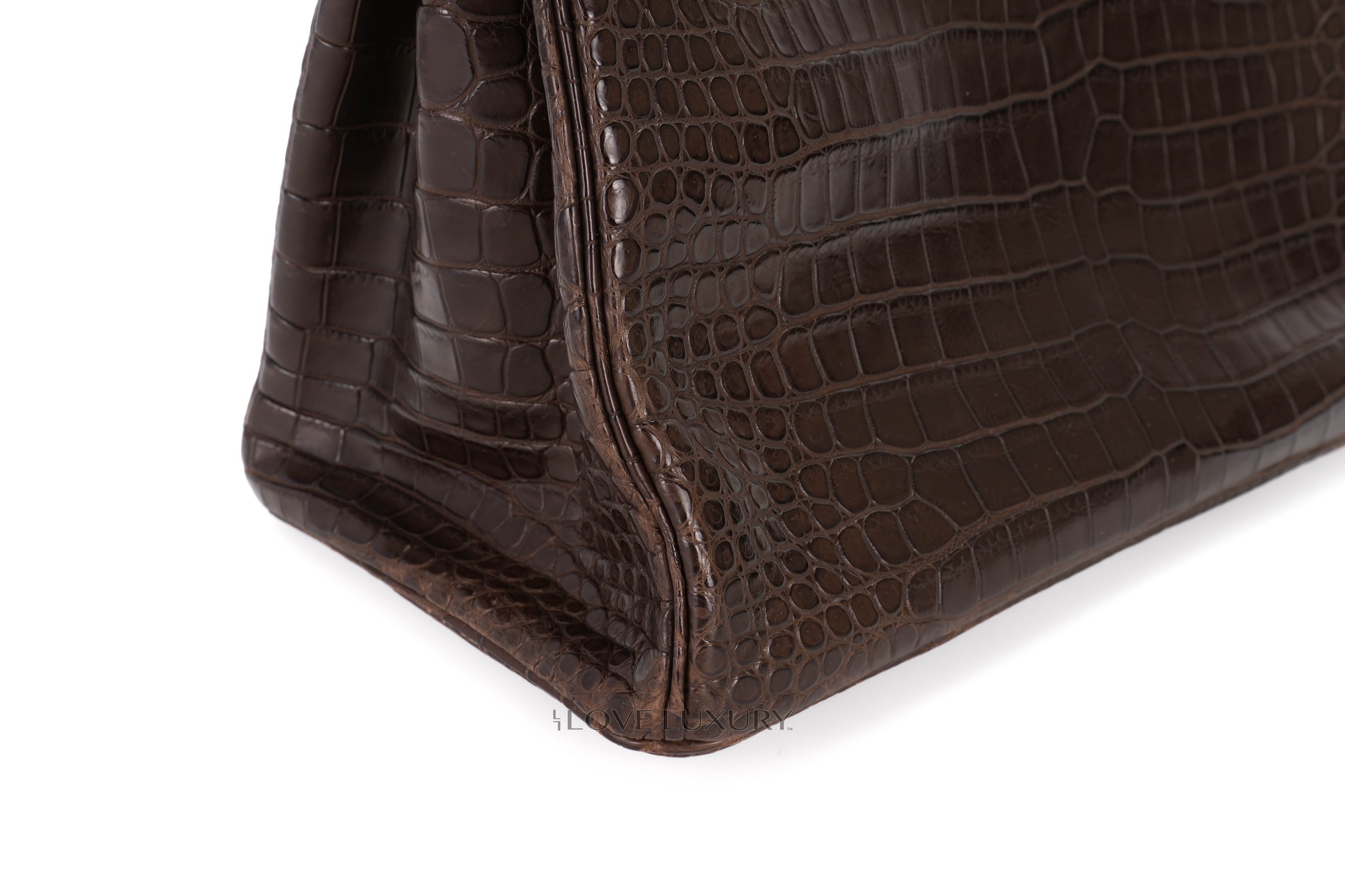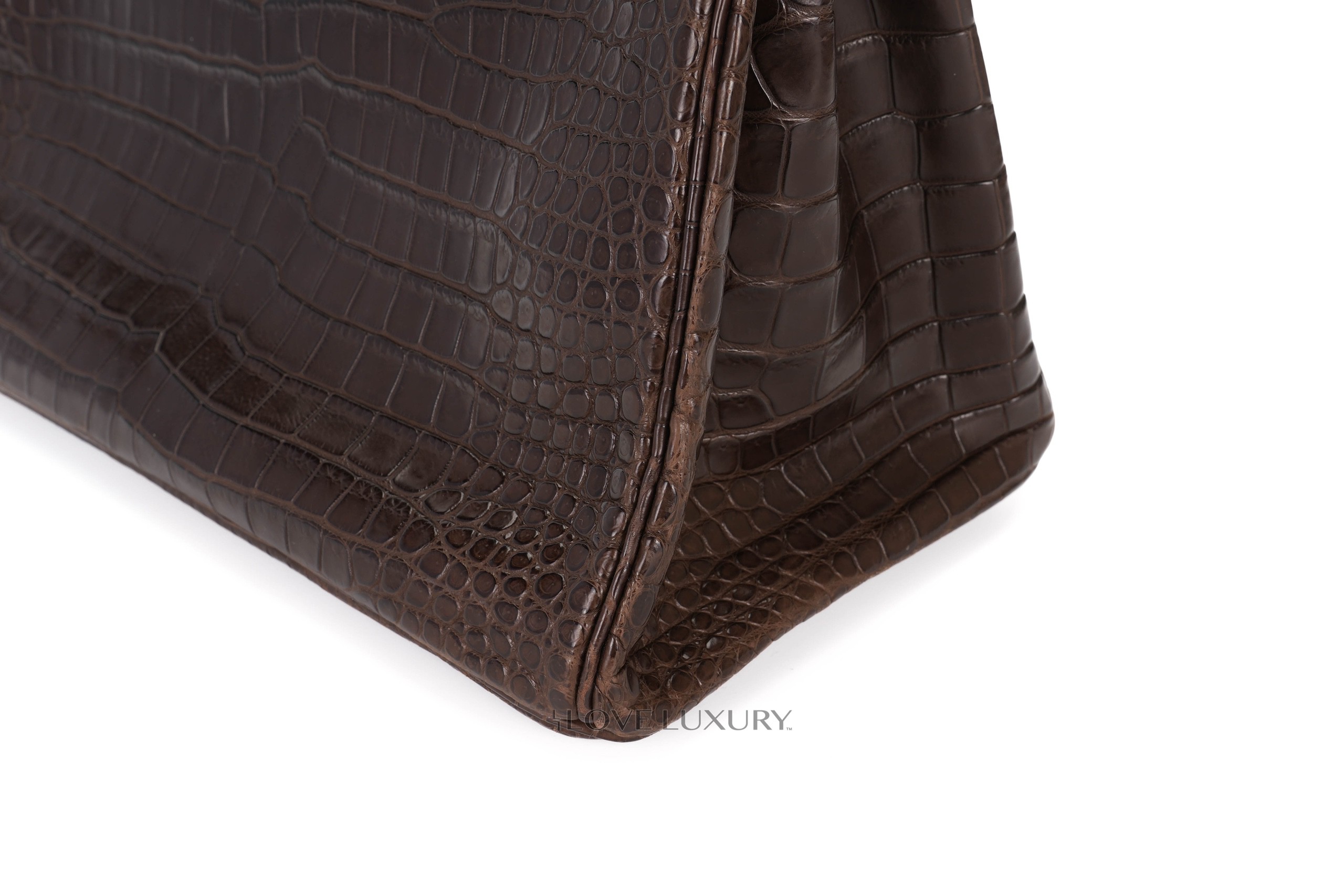 Havane is a very rich and deep shade of brown that looks naturally chic shown against the matte finish of the Niloticus Crocodile skin. This bag is in the larger 35 size which is great for those of us that like a bigger bag. Crafted in 2008 this bag is pre-loved and does show signs of use, this is normal for a bag of this age and we do request that you view the images and video closely. This bag comes withLock, Key, Clochette, Dustbag, and Authentication.