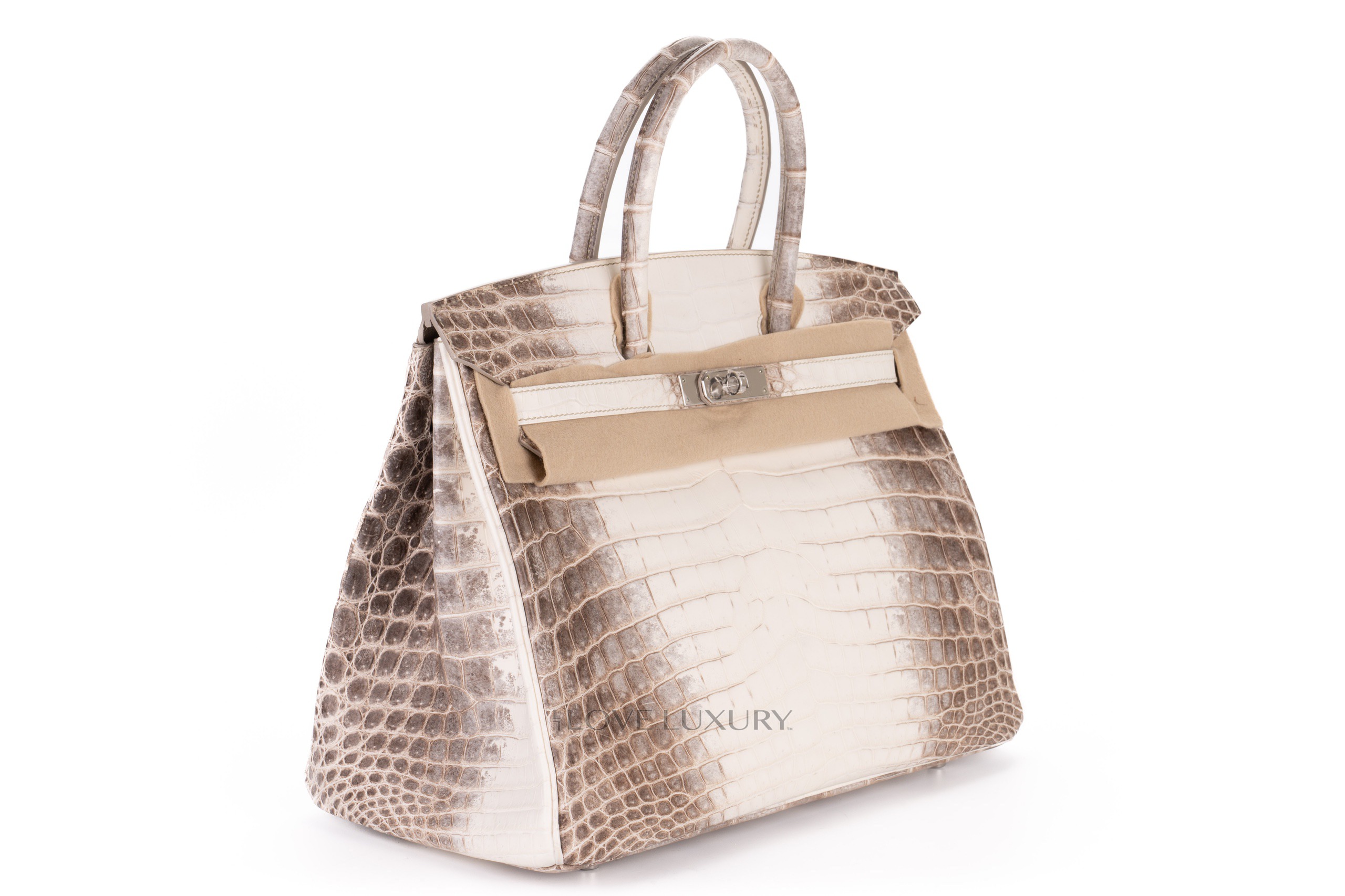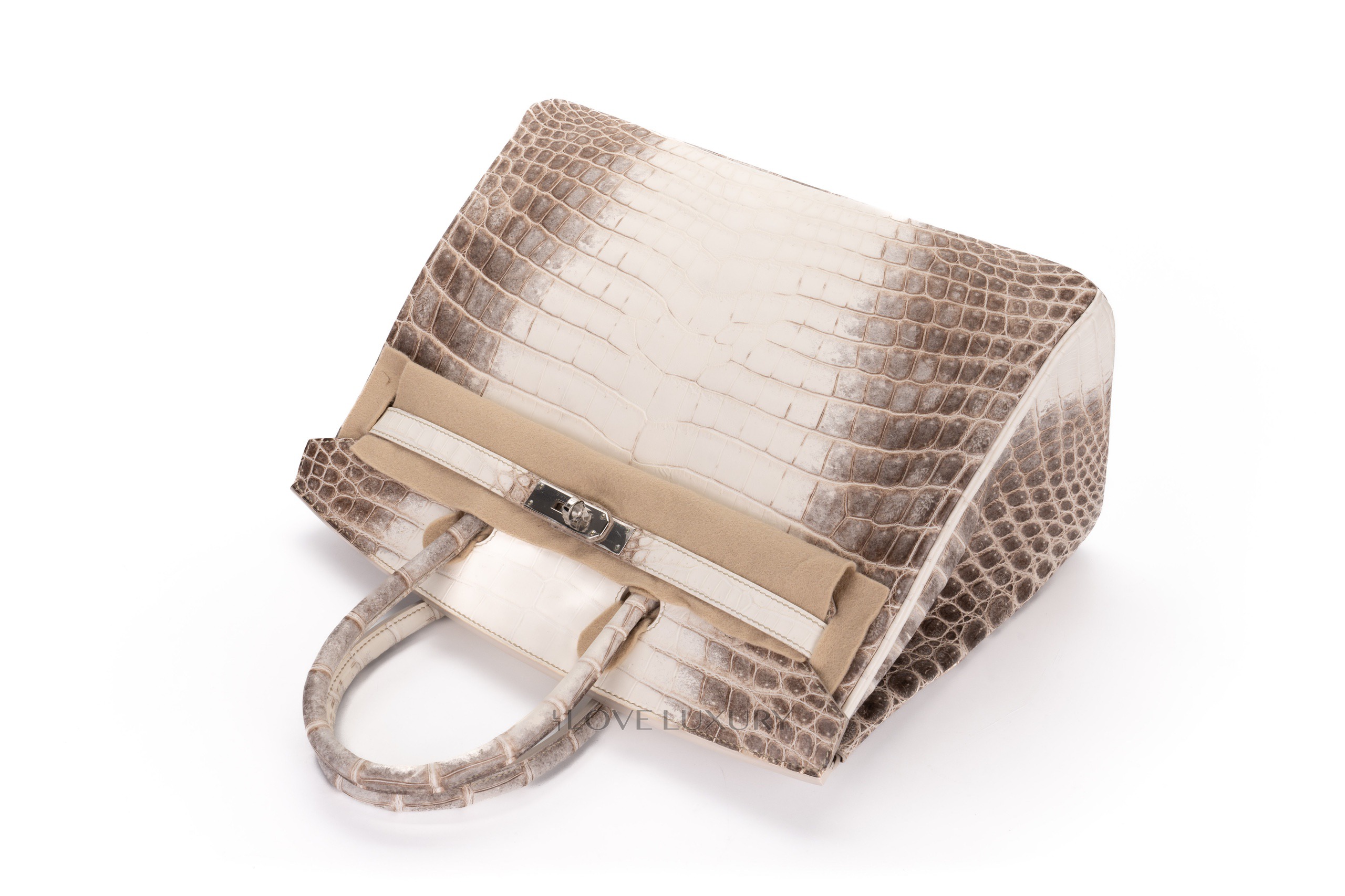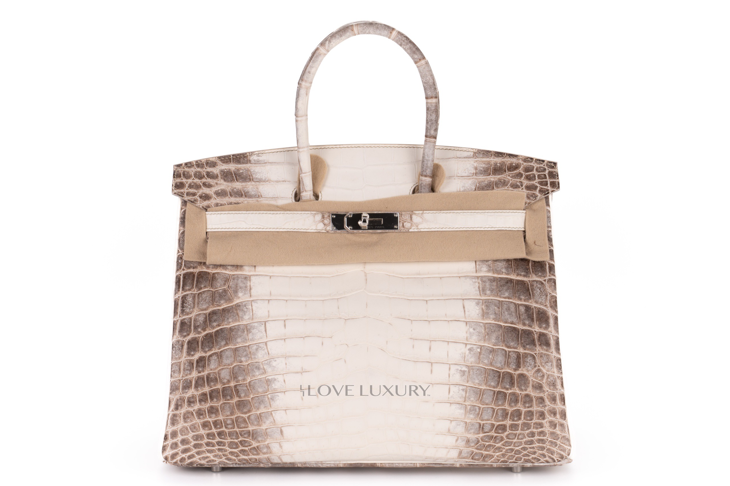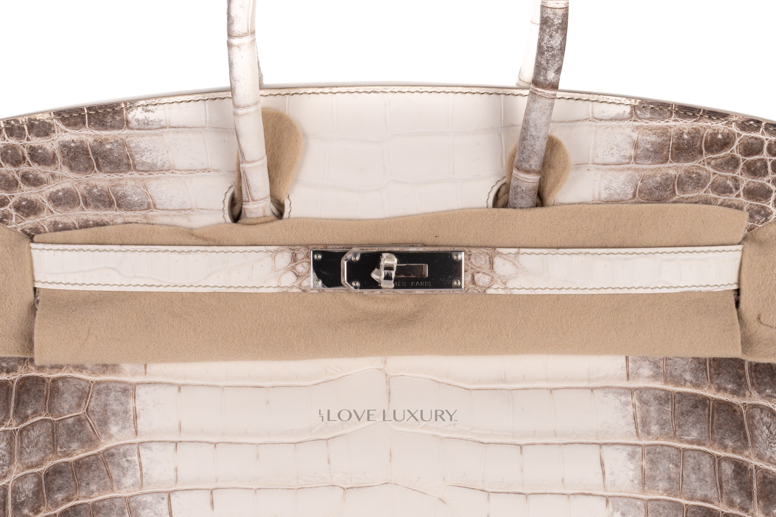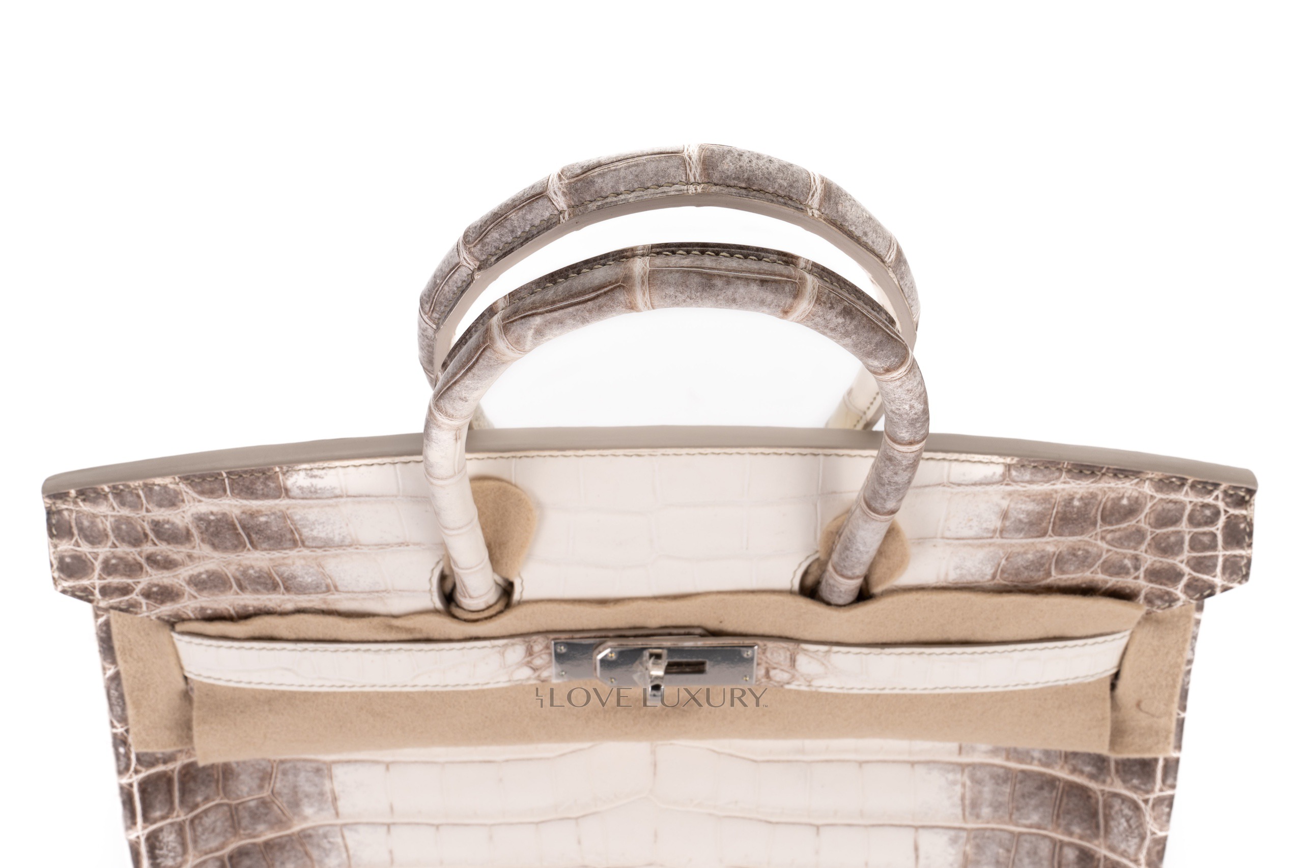 The Hermès Himalaya Birkin is a true unicorn handbag. Even the highest rated celebrities find aquiring one of these exclusive bags nigh impossible and turn to the secondary market to get their hands on these uber rare bags. The Himalaya is crafted from Niloticus Crocodile with palladium hardware. The ‘Himalaya’ in the name refers to the look of the bag which is designed to look liek the snow capped Himalaya mountains. This process is time consuming and arduous. This particular model is T which is 2015 and comes to you box fresh with everything except the receipt to include the CITIES and the authentication.