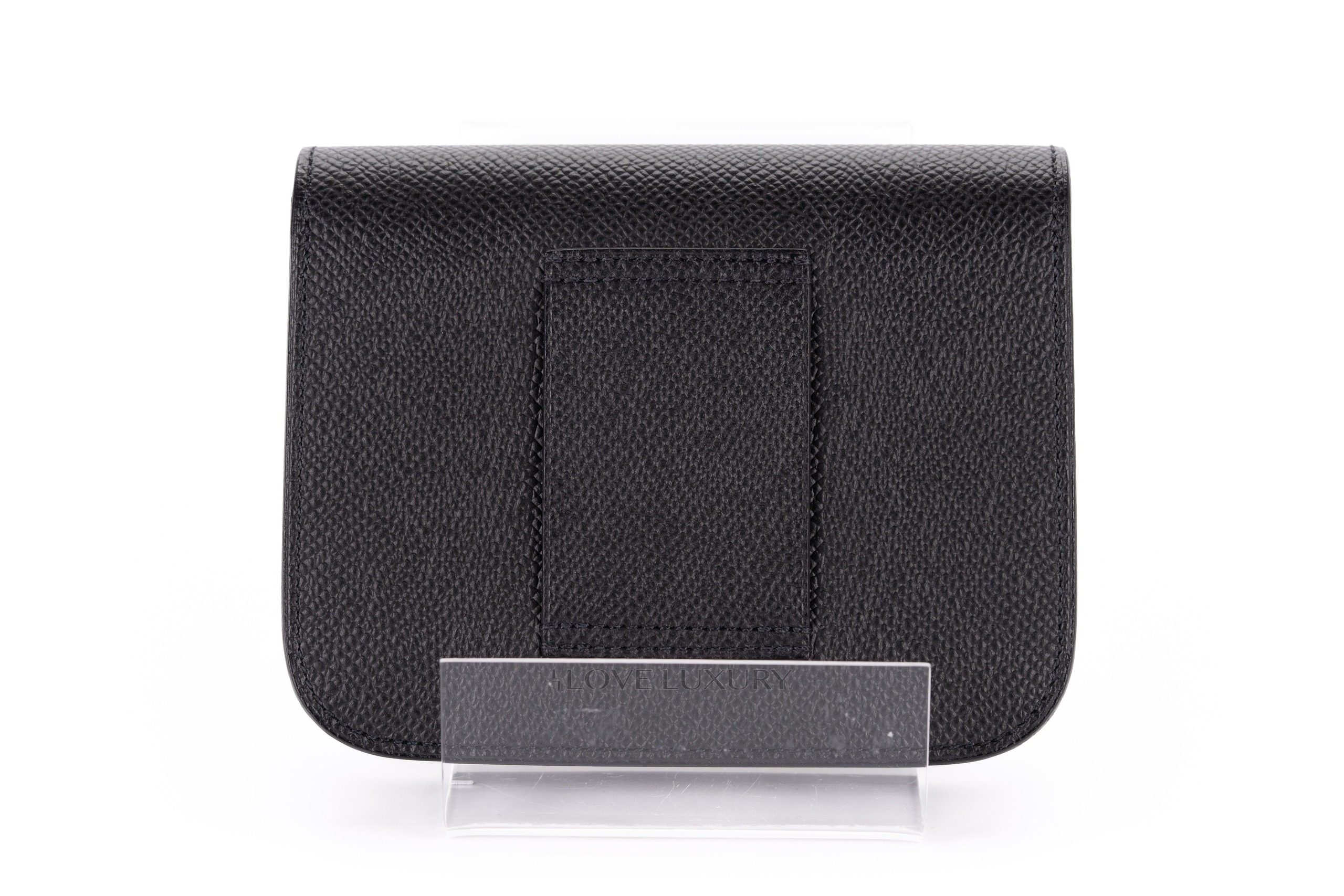The Slim wallet Constance can be used as a card holder or as a belt bag by adding a belt to it. it crafted in Black Epsom calfskin with removable zipped change purse, 2 credit card slots, belt loop and yellow gold-plated closure. This bag is box fresh and comes with box, dustbag, booklet