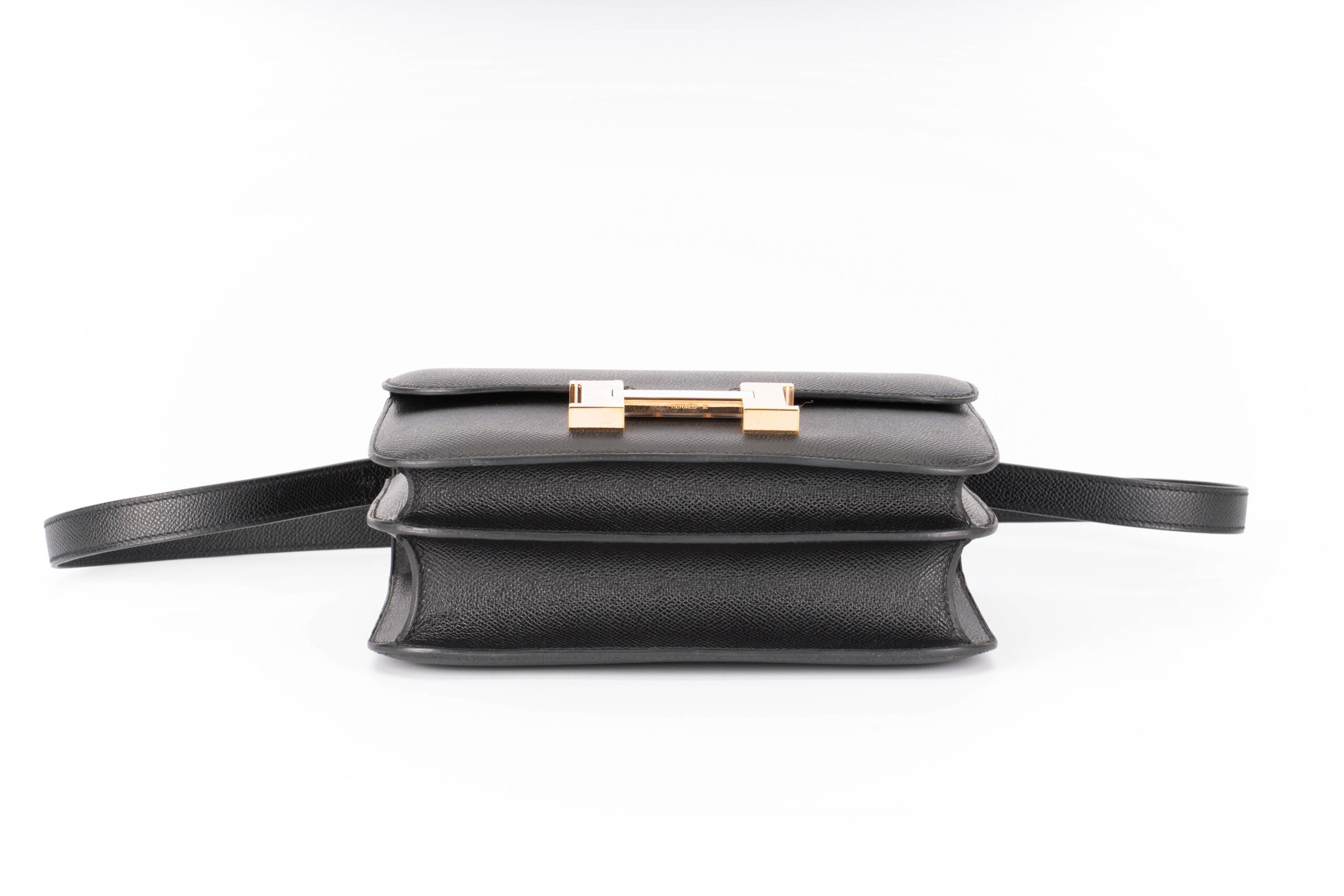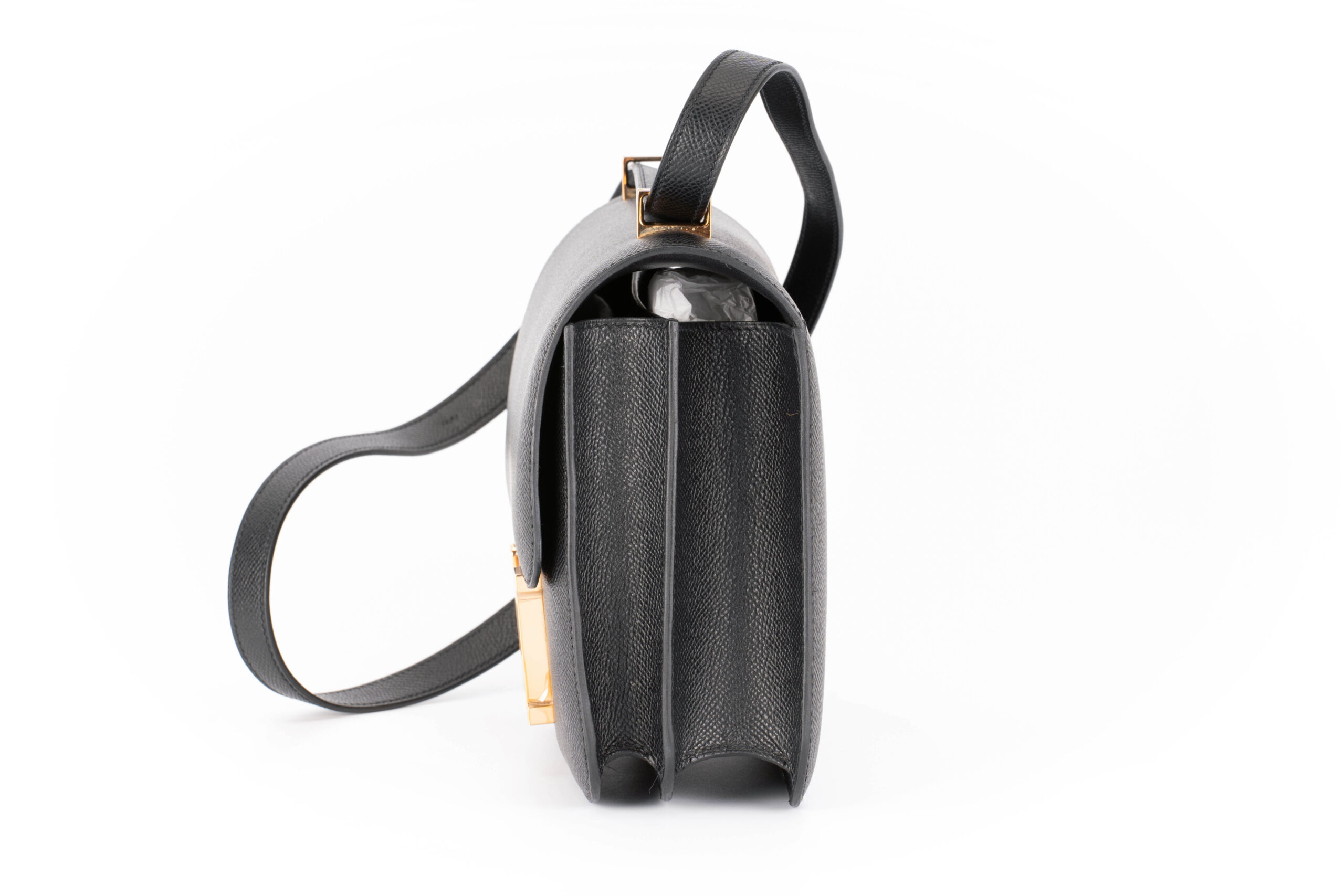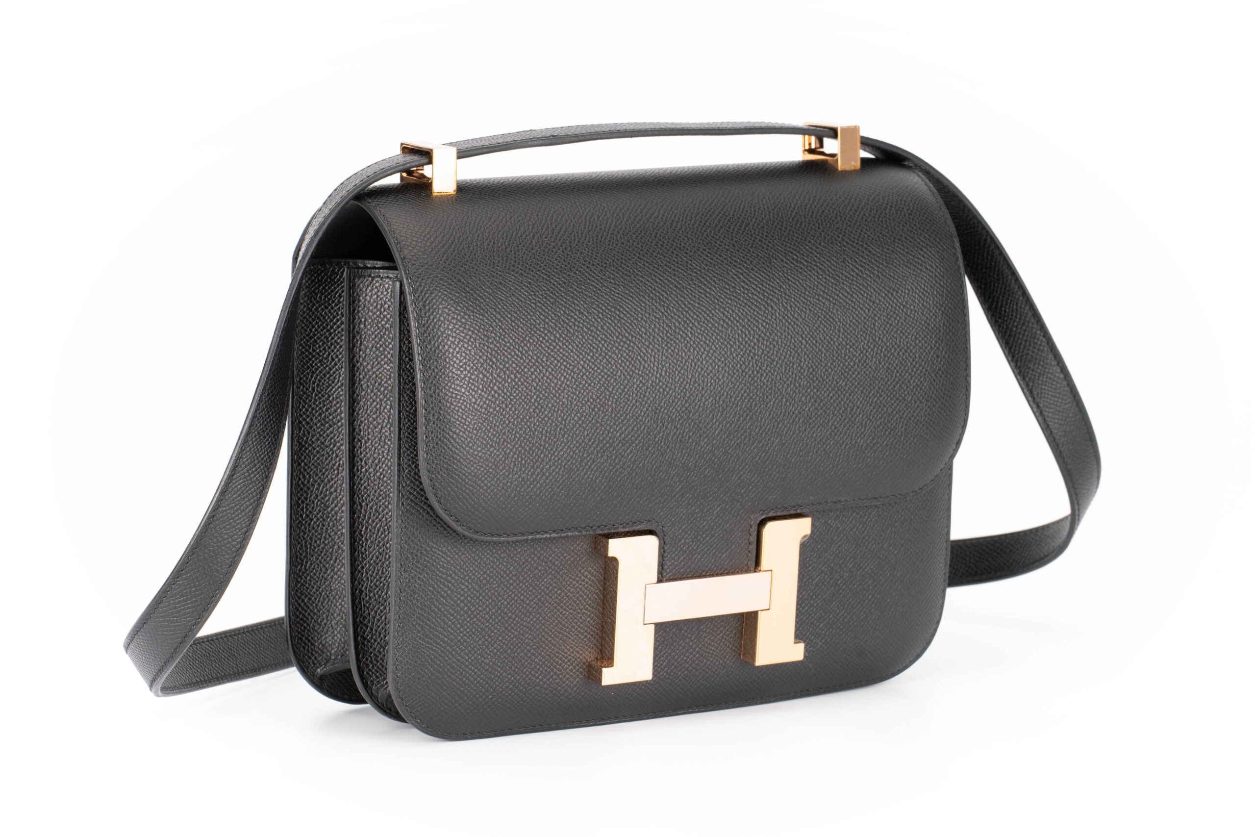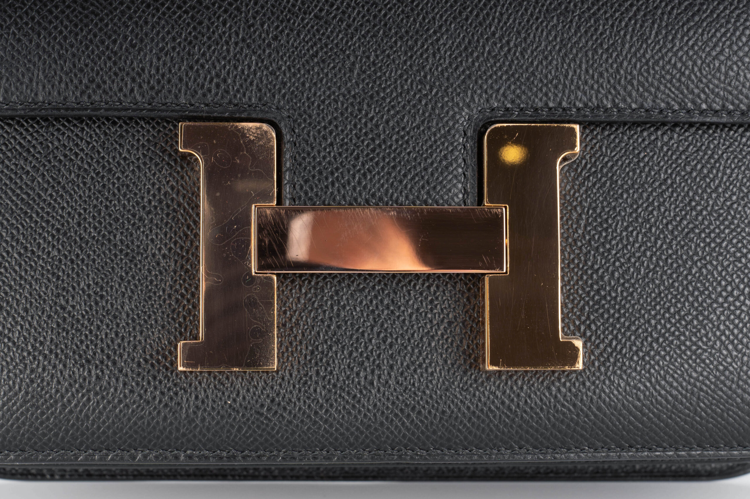The Constance model is one of the quota bags from Hermès. Constance bags are one of the last model bags the artisans get to craft due to the complexity of the shape. This model comes in black Epsom with rose gold hardware making it even more special and rare. The Constance 24 can be worn cross-body on a single strap or on the shoulder o a doubled strap The condition of this bag is a very good pre-loved condition, the only sign of use is on the cross-bar of the H closure this has very slightly faded and shows some light scratching. This is due to the sticker on this section being removed. The leather is immaculate.