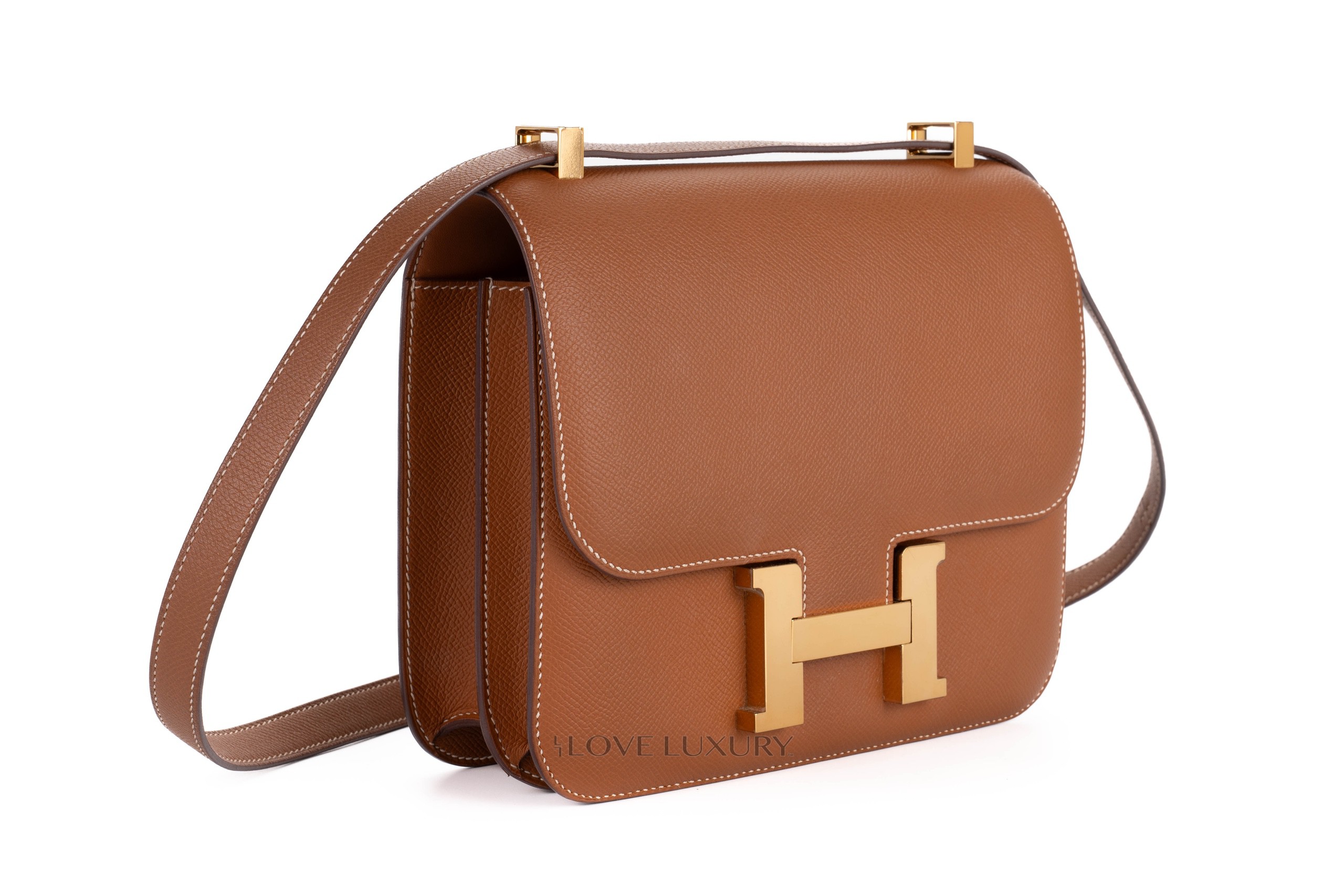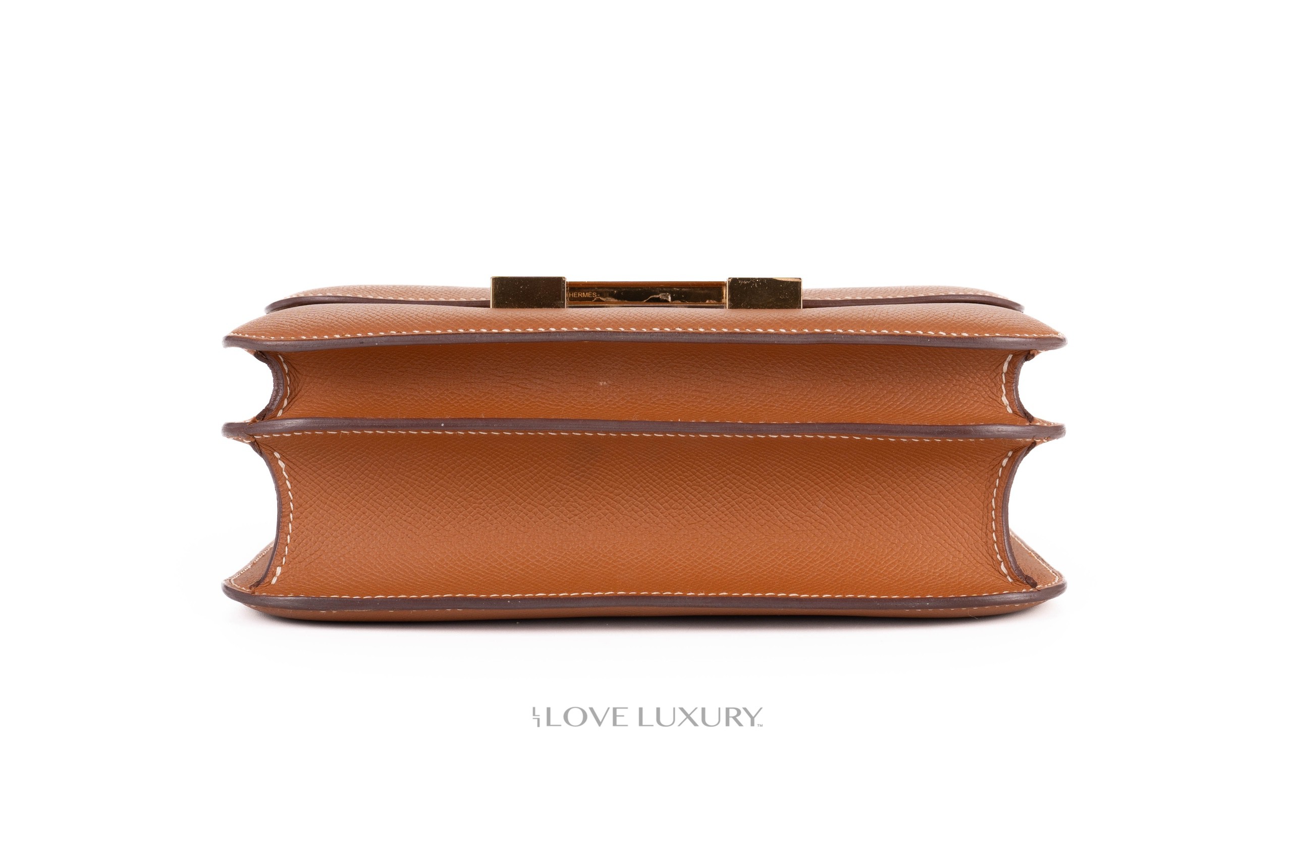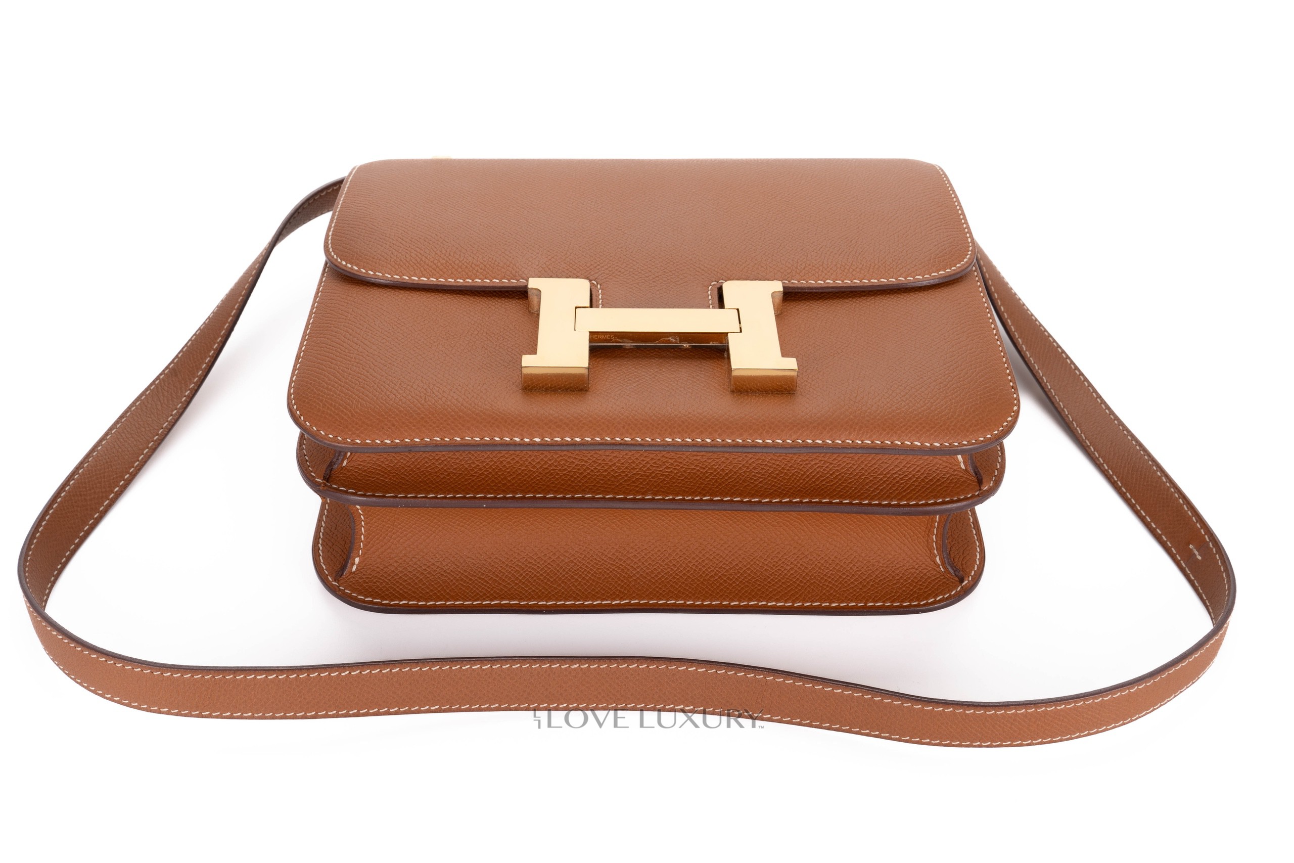 The Constance 24 comes in 2 current models, the “mirror” and the double gusset models. The double gusset is the more modern model due to the mirror being a re-release with the addition of the little internal mirror. The new mirror version also comes with a slightly longer strap making it a better fit for crossbody wear. This model comes in gold epsom leather with gold hardware, it is in a preloved condition please view the images closely.
