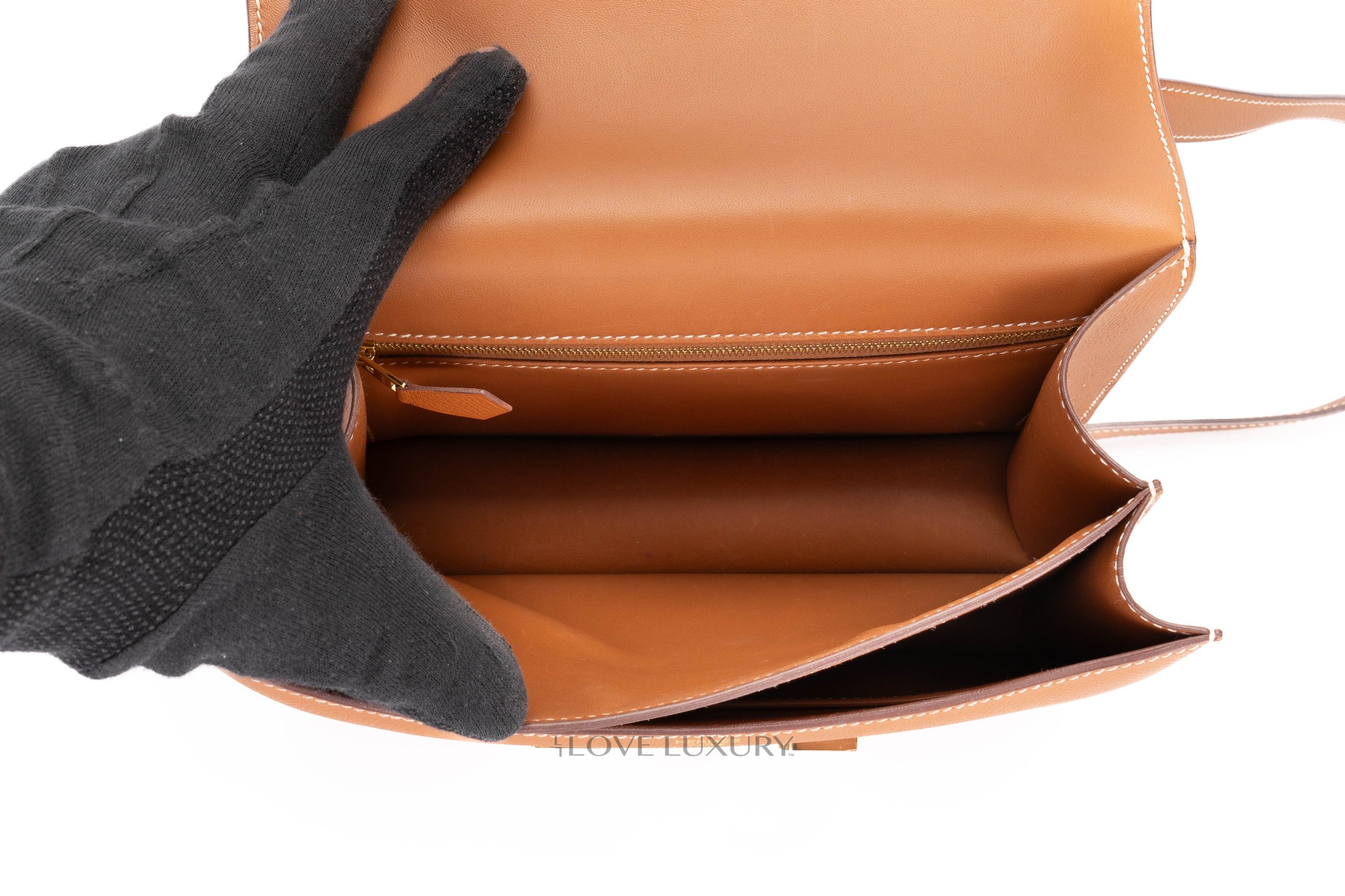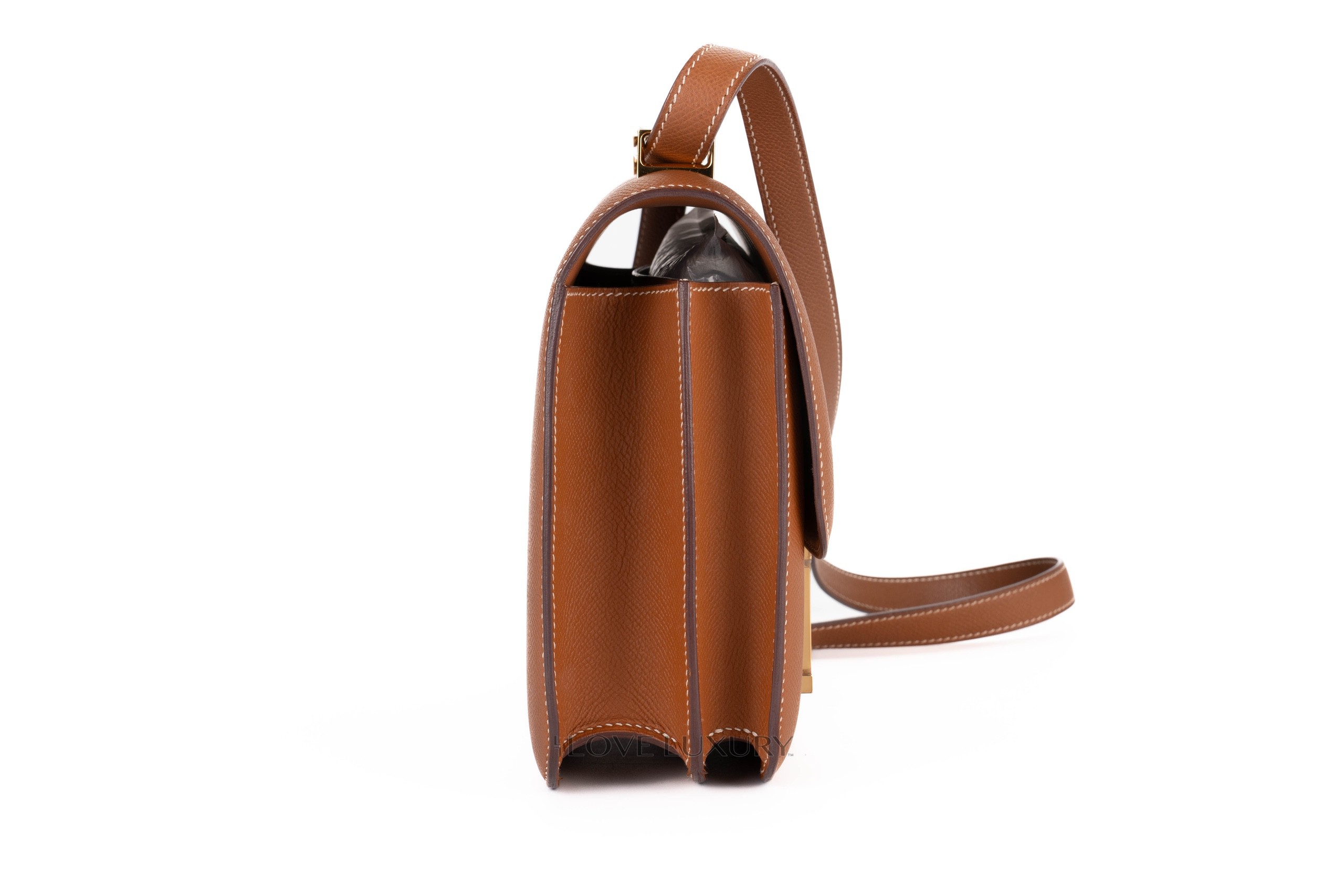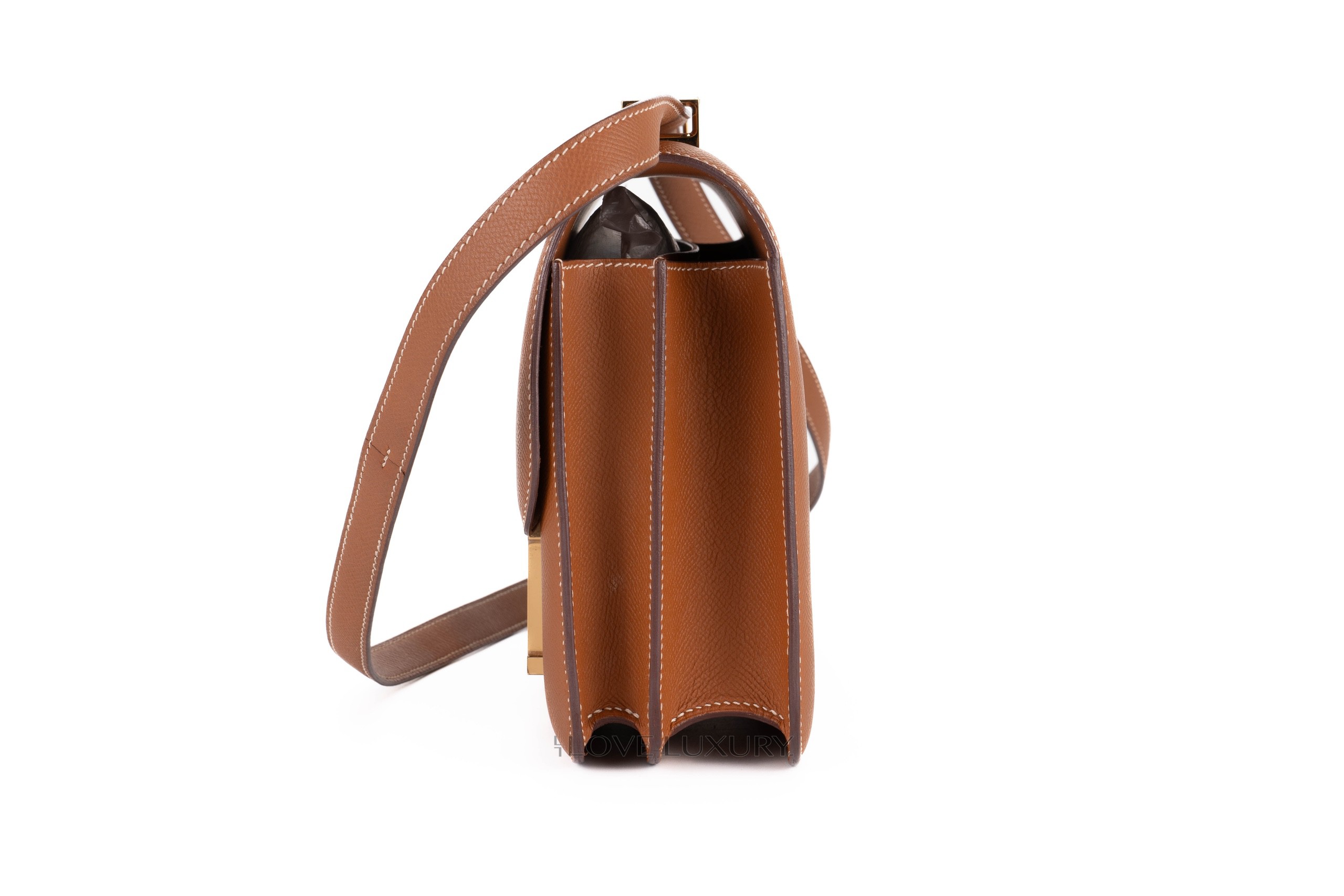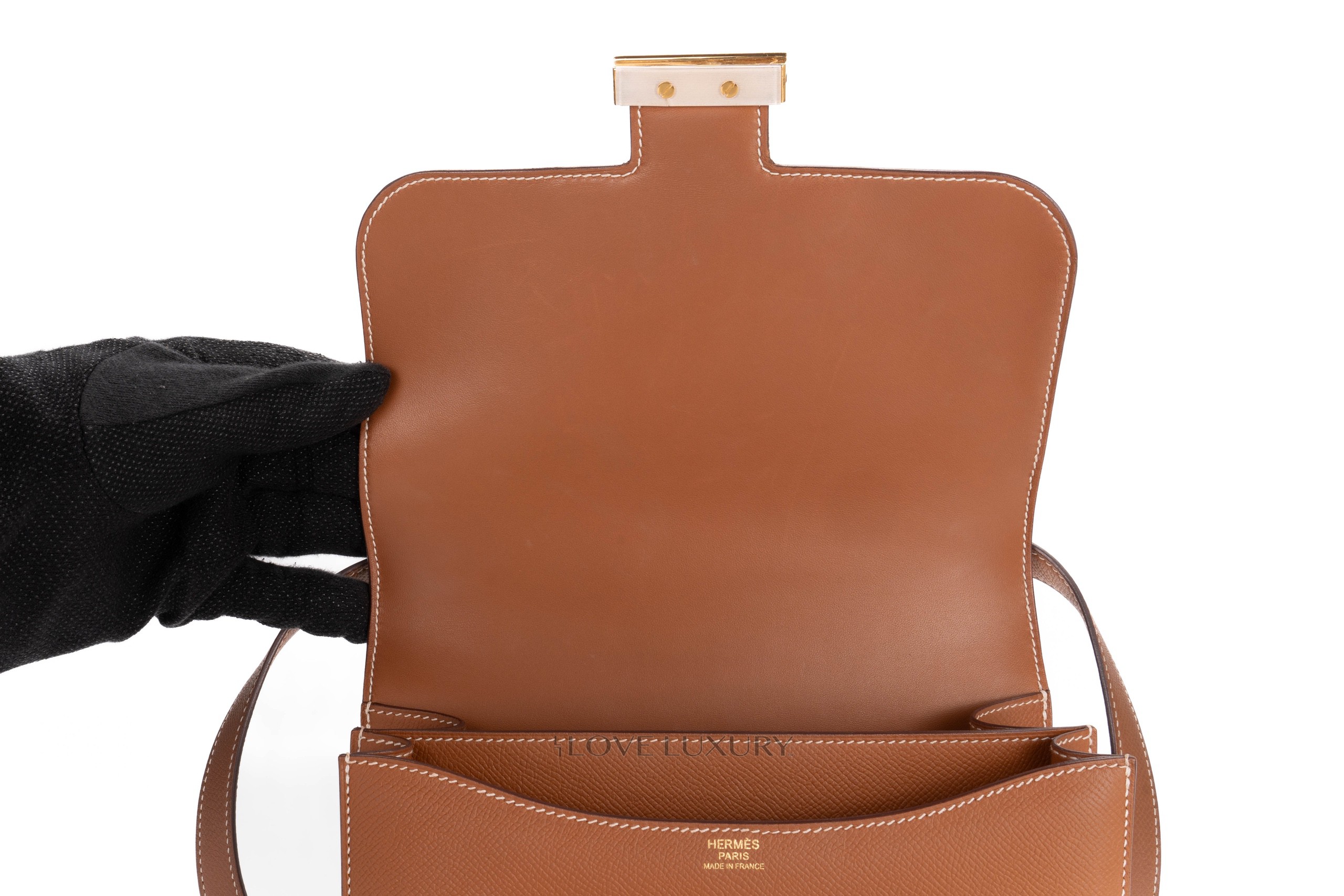 The Constance 24 comes in 2 current models, the “mirror” and the double gusset models. The double gusset is the more modern model due to the mirror being a re-release with the addition of the little internal mirror. The new mirror version also comes with a slightly longer strap making it a better fit for crossbody wear. This model comes in gold epsom leather with gold hardware, it is in a preloved condition please view the images closely.