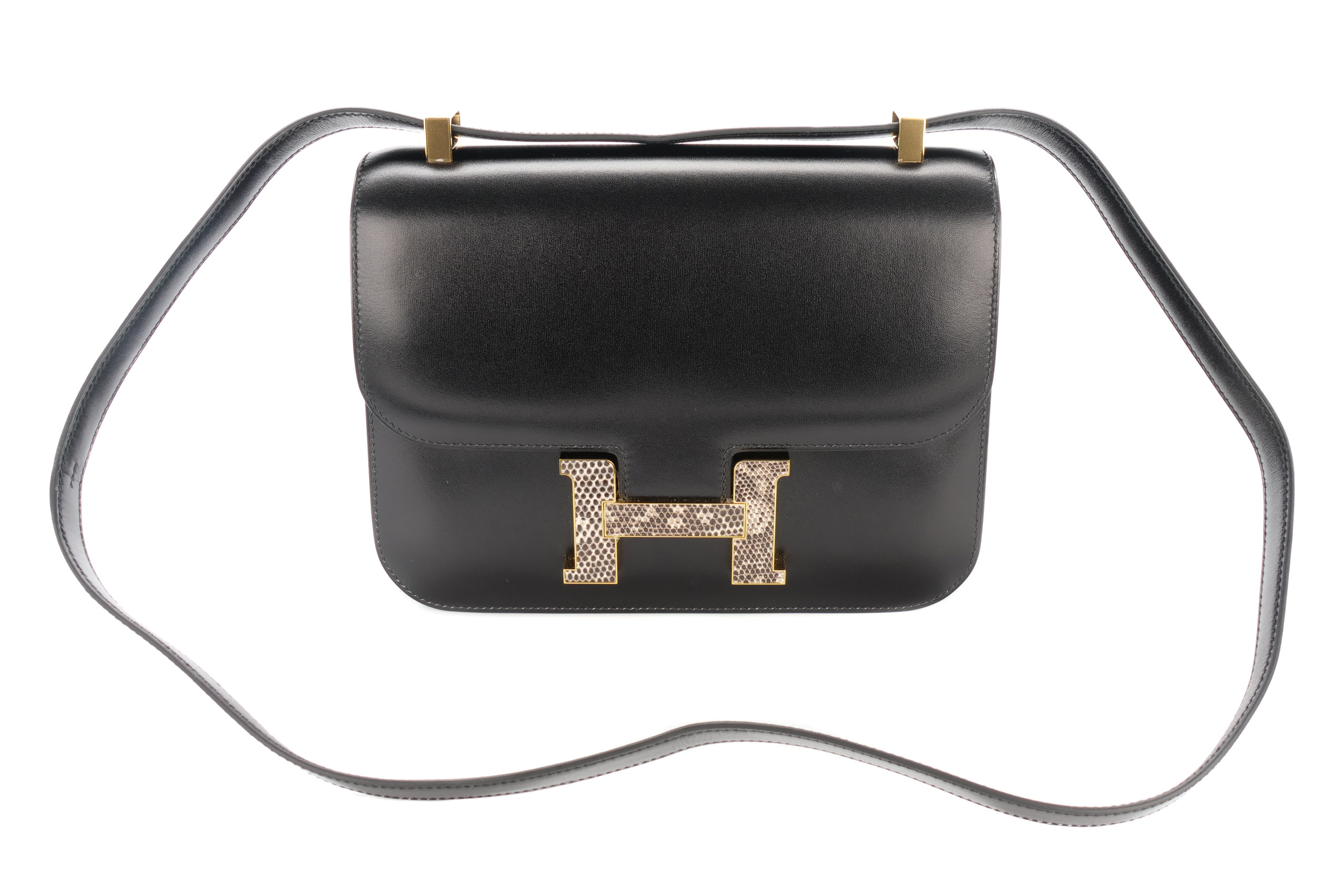 Hermès Constance 24 Noir / Black Box Leather & Lizard Gold Hardware / U Stamp 2022, Brand New