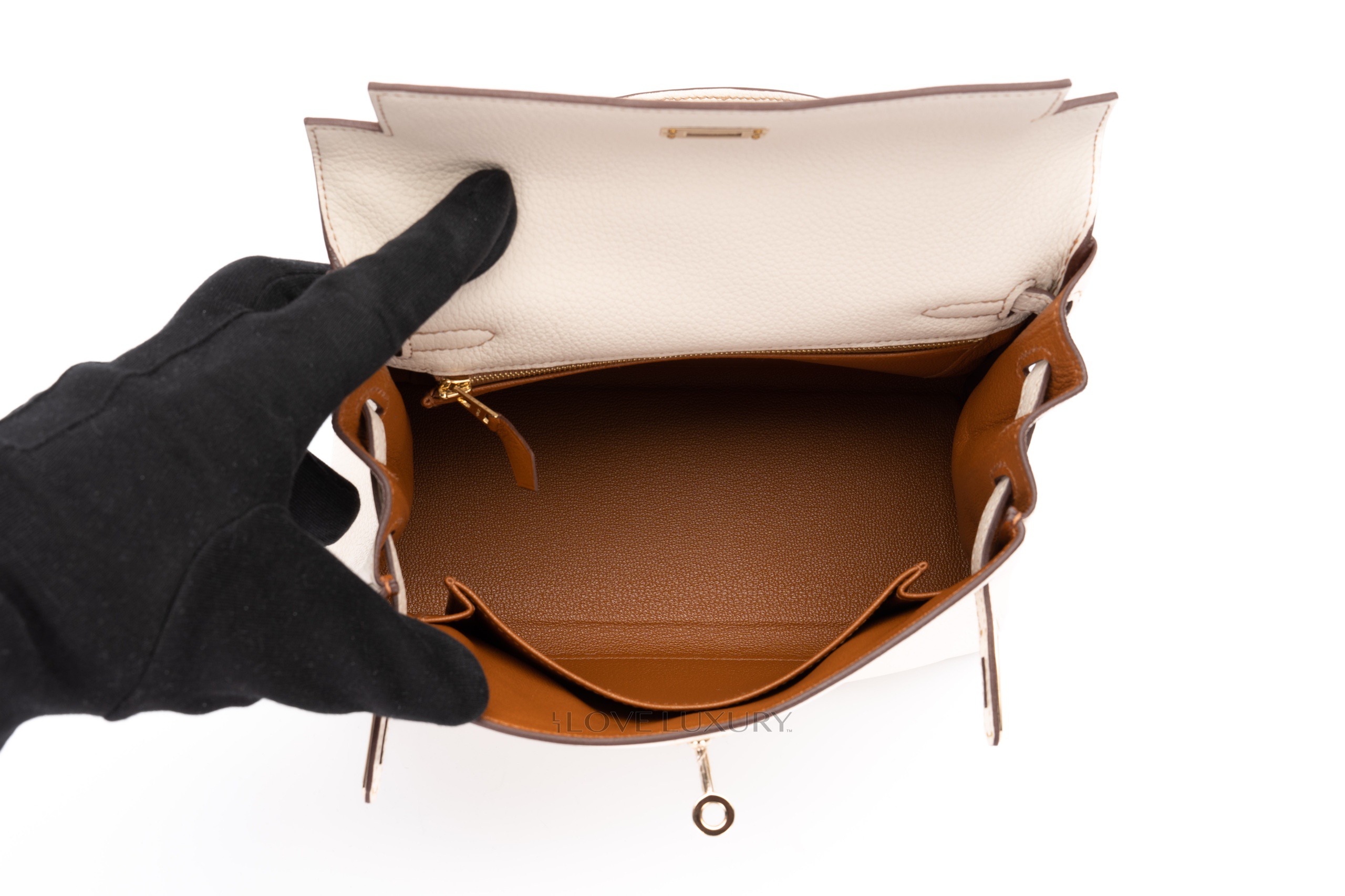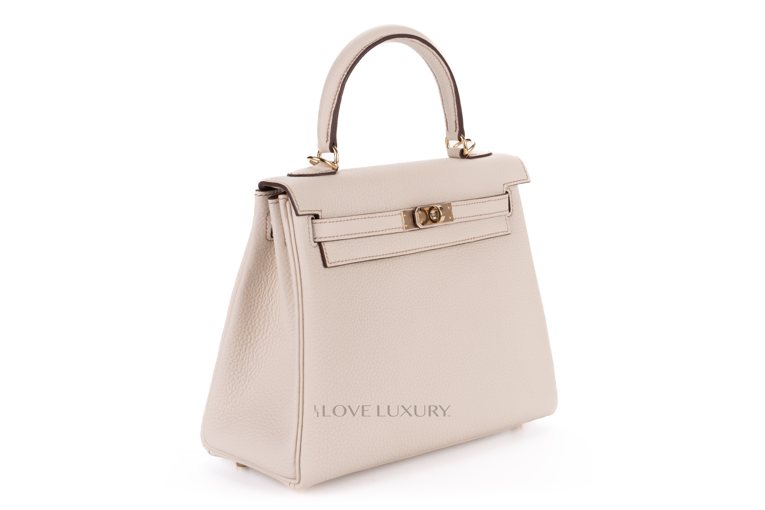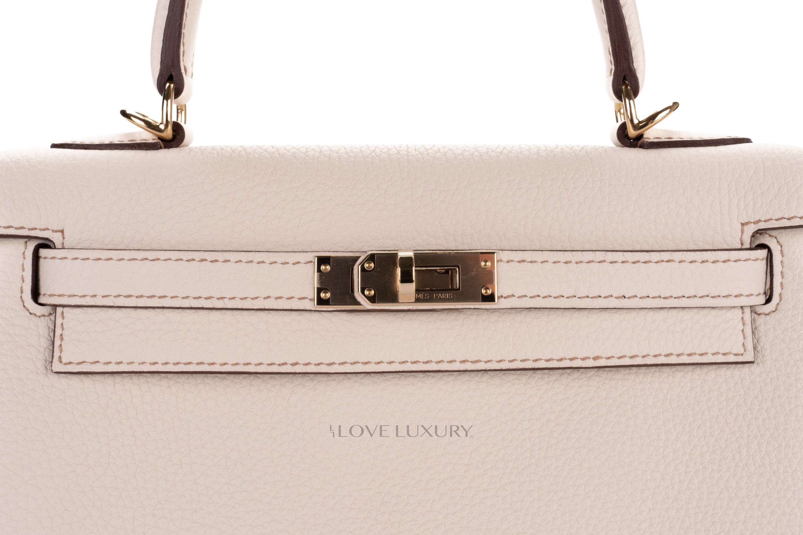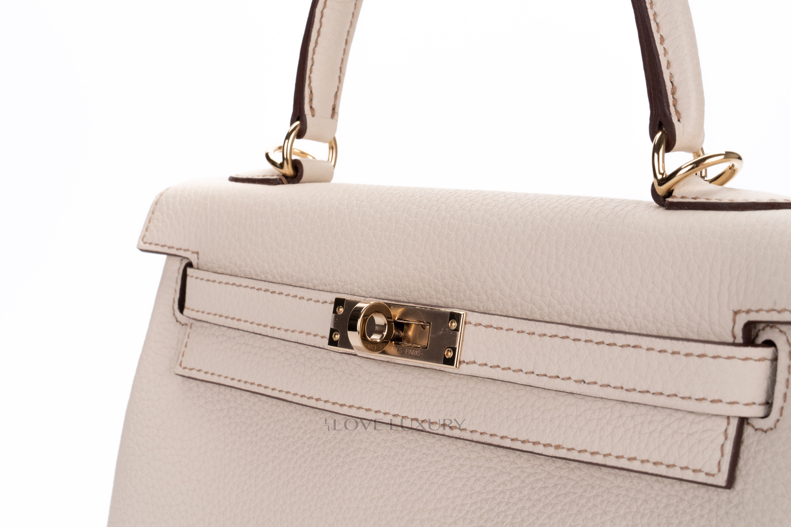 Hermès Kelly 25 Craie Togo Horse Shoe Stamp HSS Permabrass Hardware / U stamp 2023 receipt Pre-Loved condition