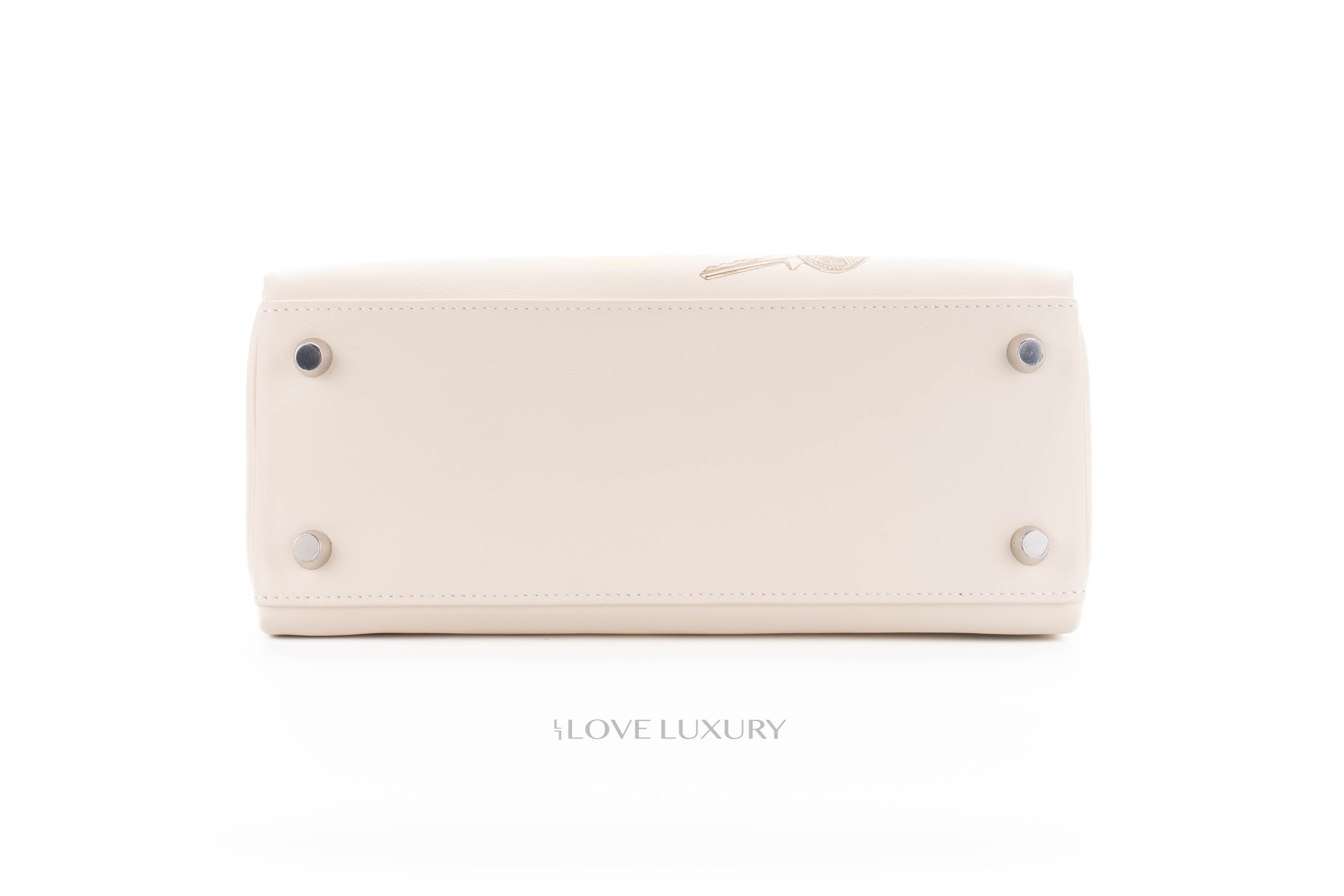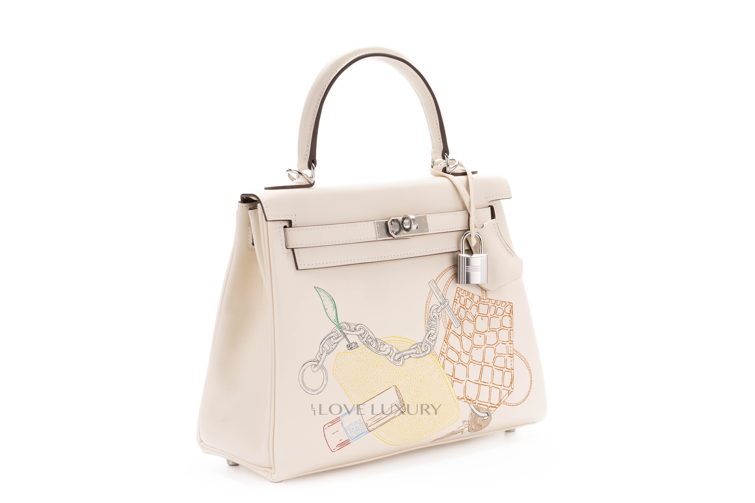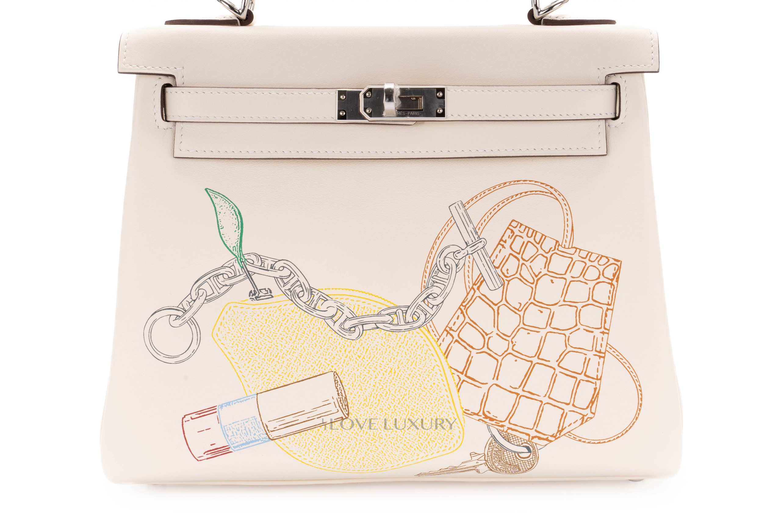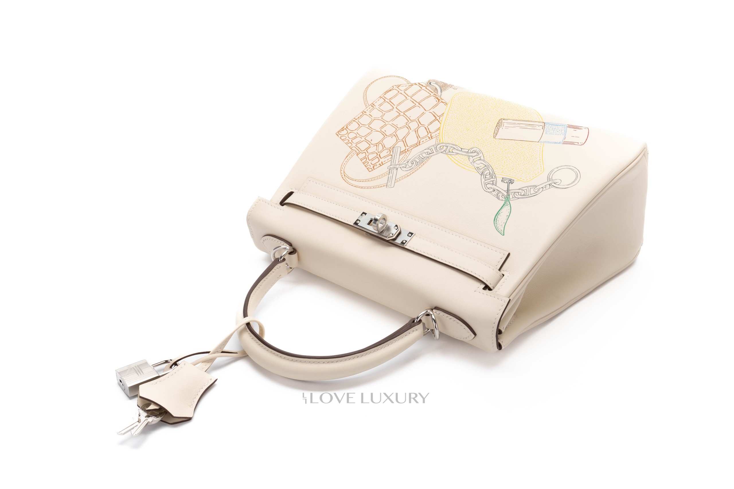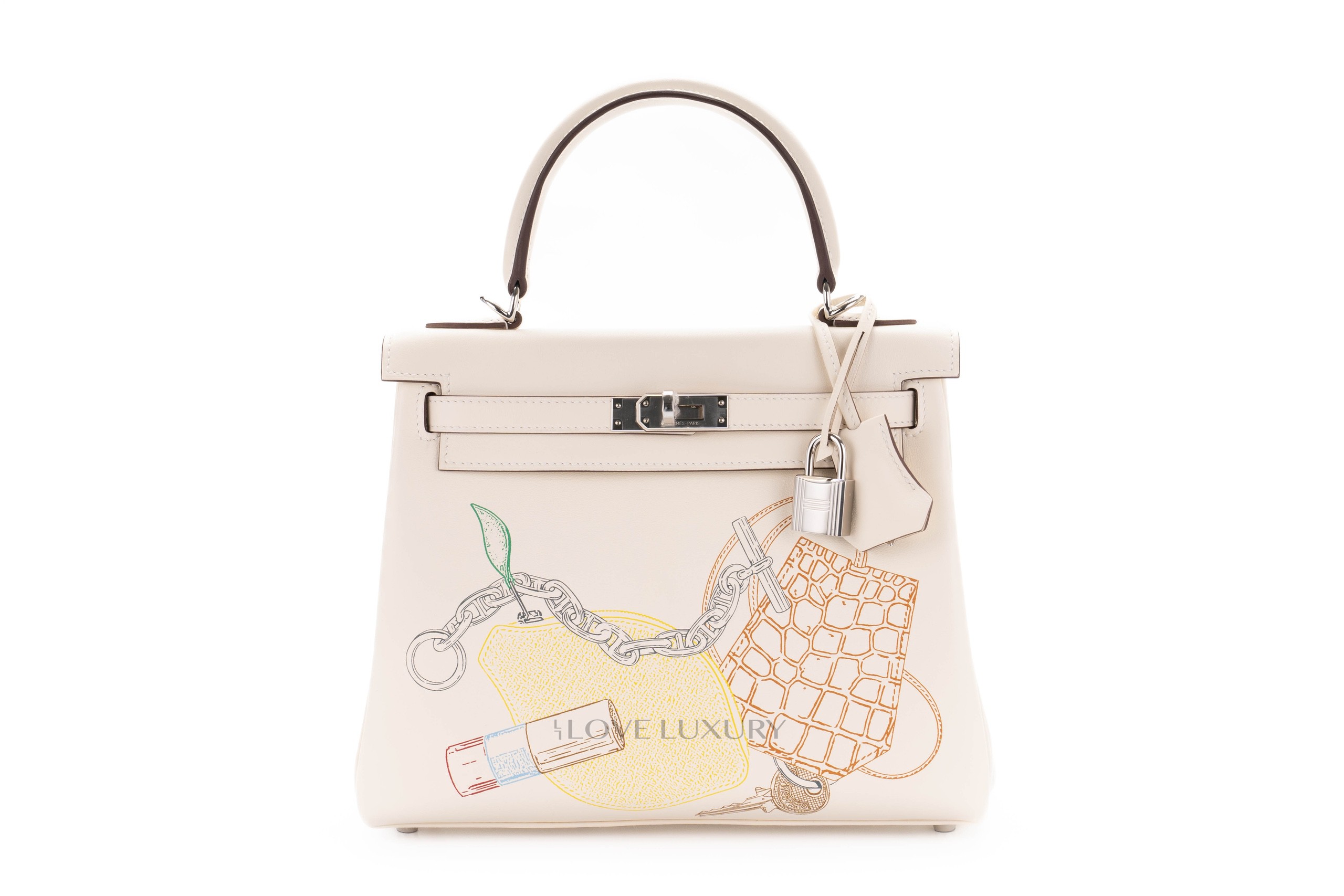 This limited edition Kelly 25 is highly sought after crafted with Swift leather with In and Out image. This bag was released at the end of 2021 and has been very hard to get since then. The design is set to show an X-ray image of what is inside the bag. This bag comes in a special Hermès box featuring a navy interior, which only shows that this bag is a must for an Hermès collector. This bag comes with everything and is box fresh.