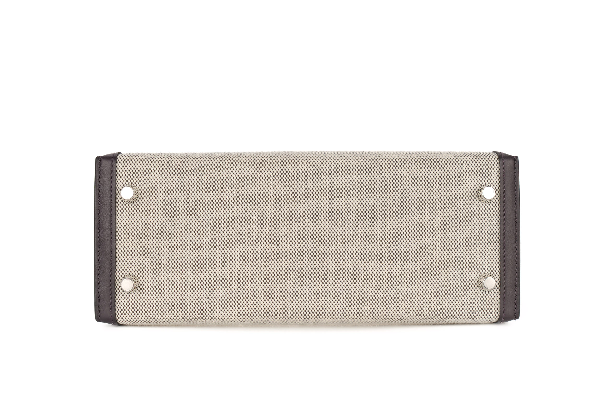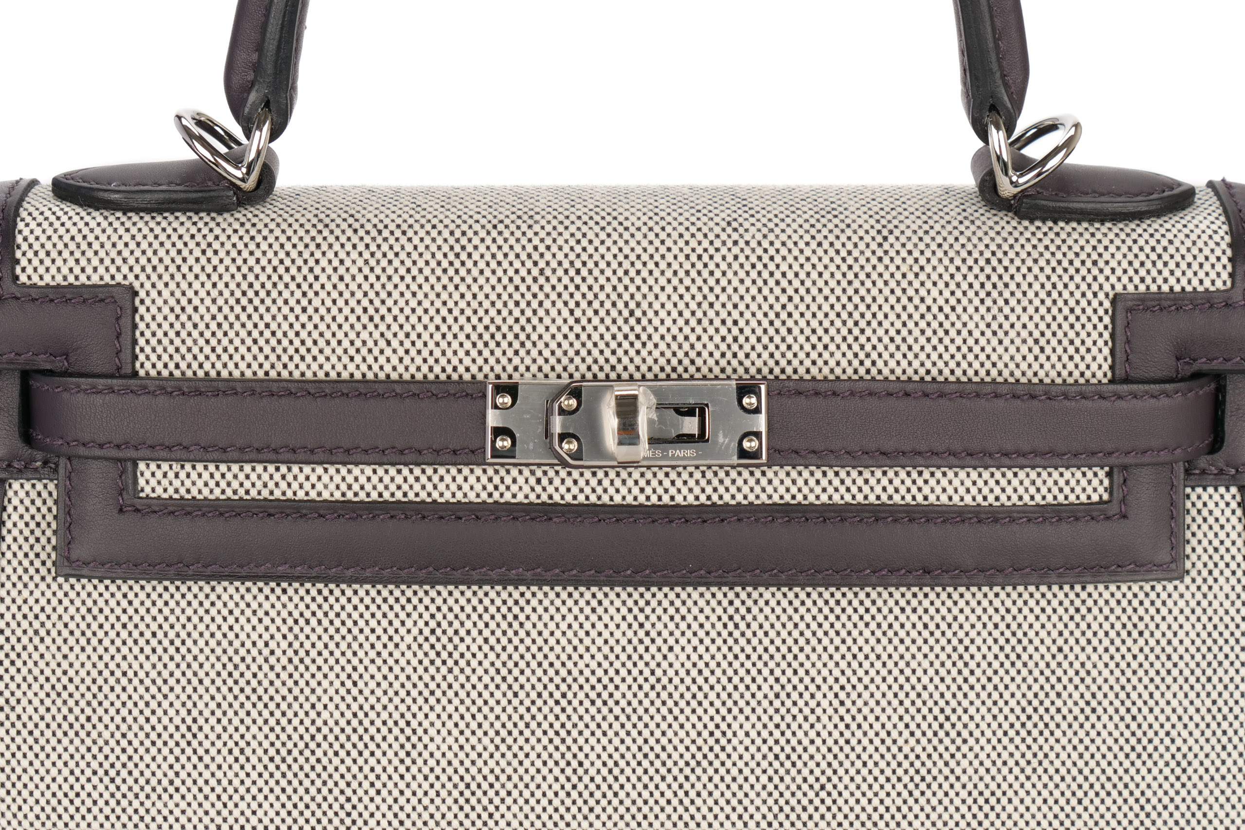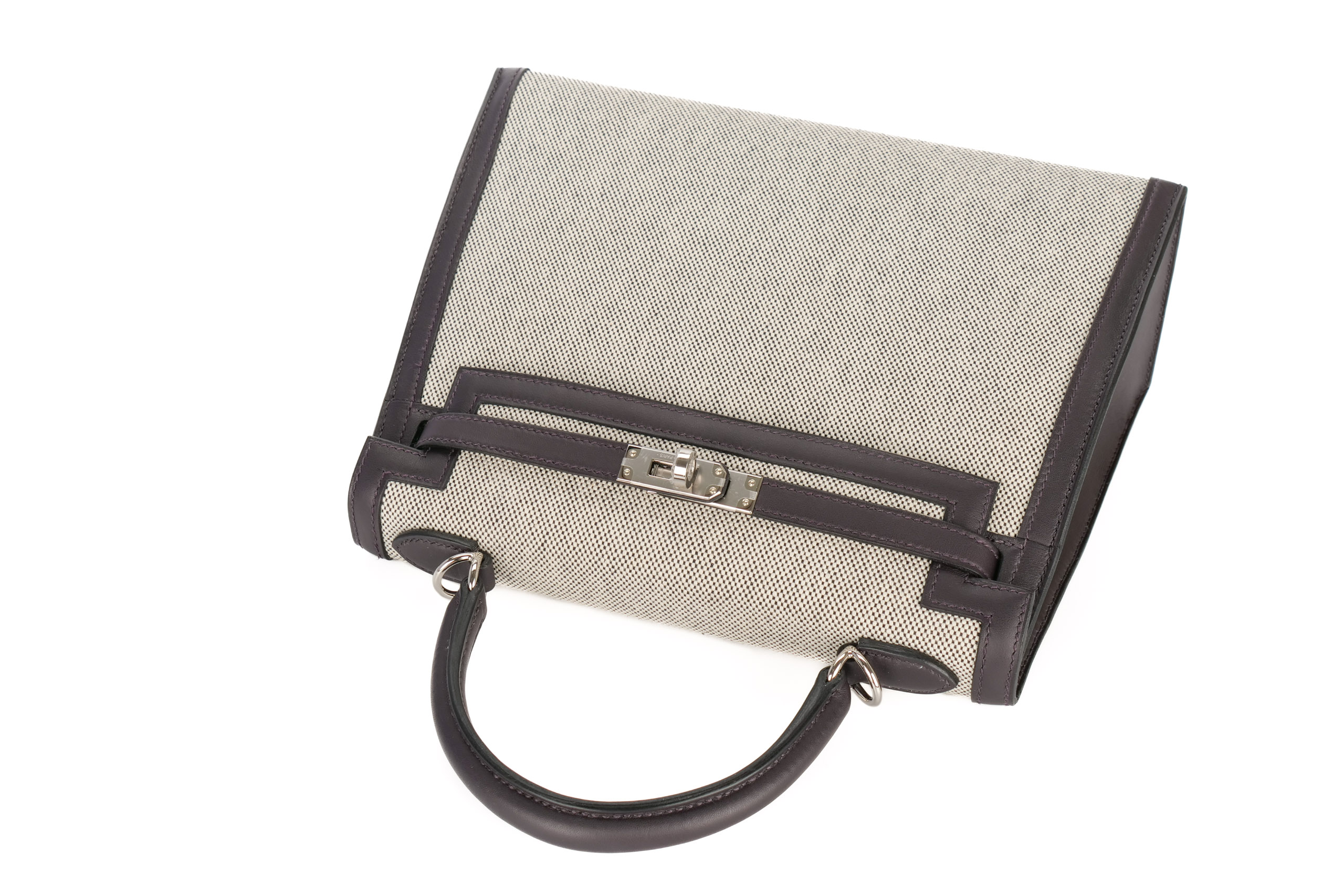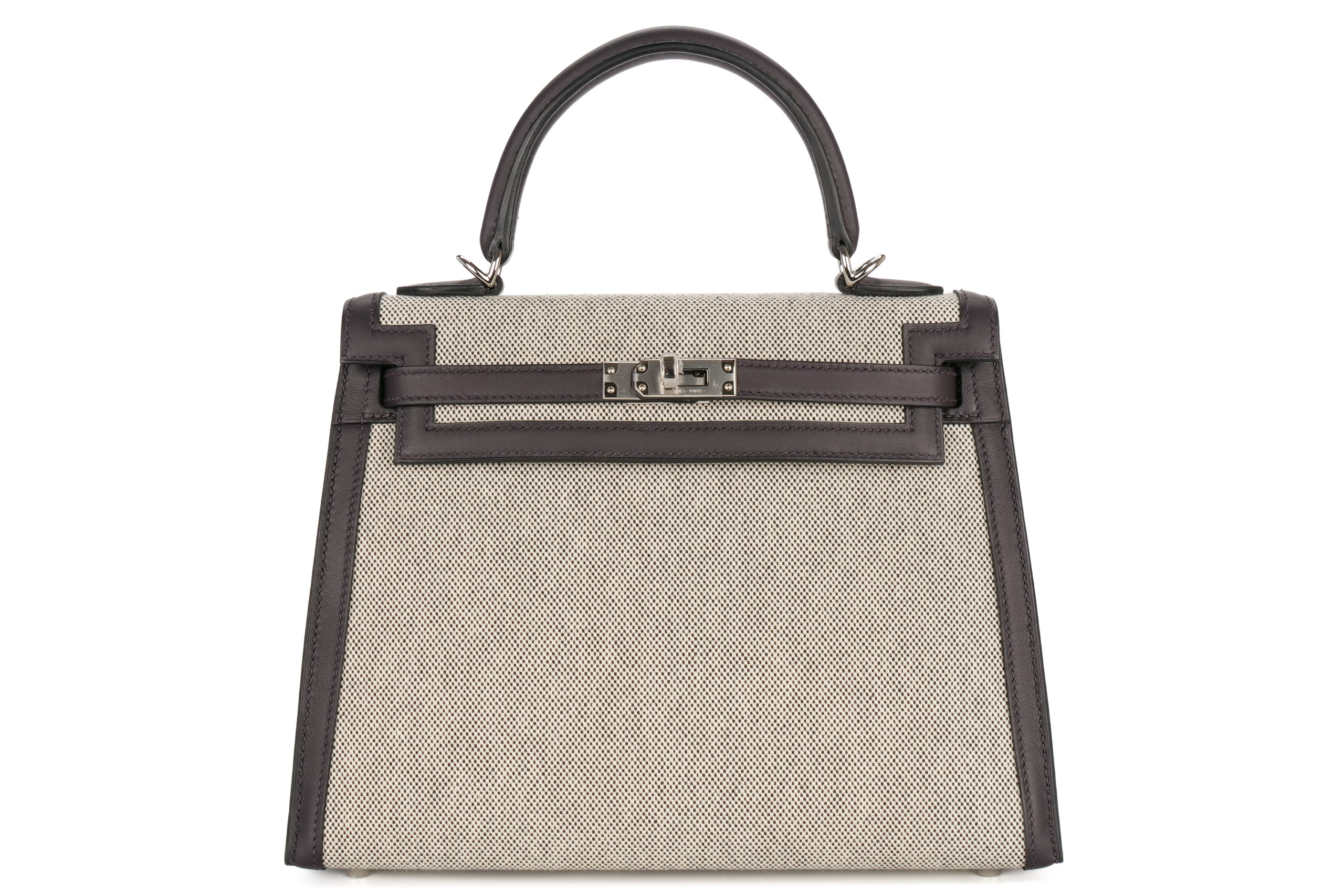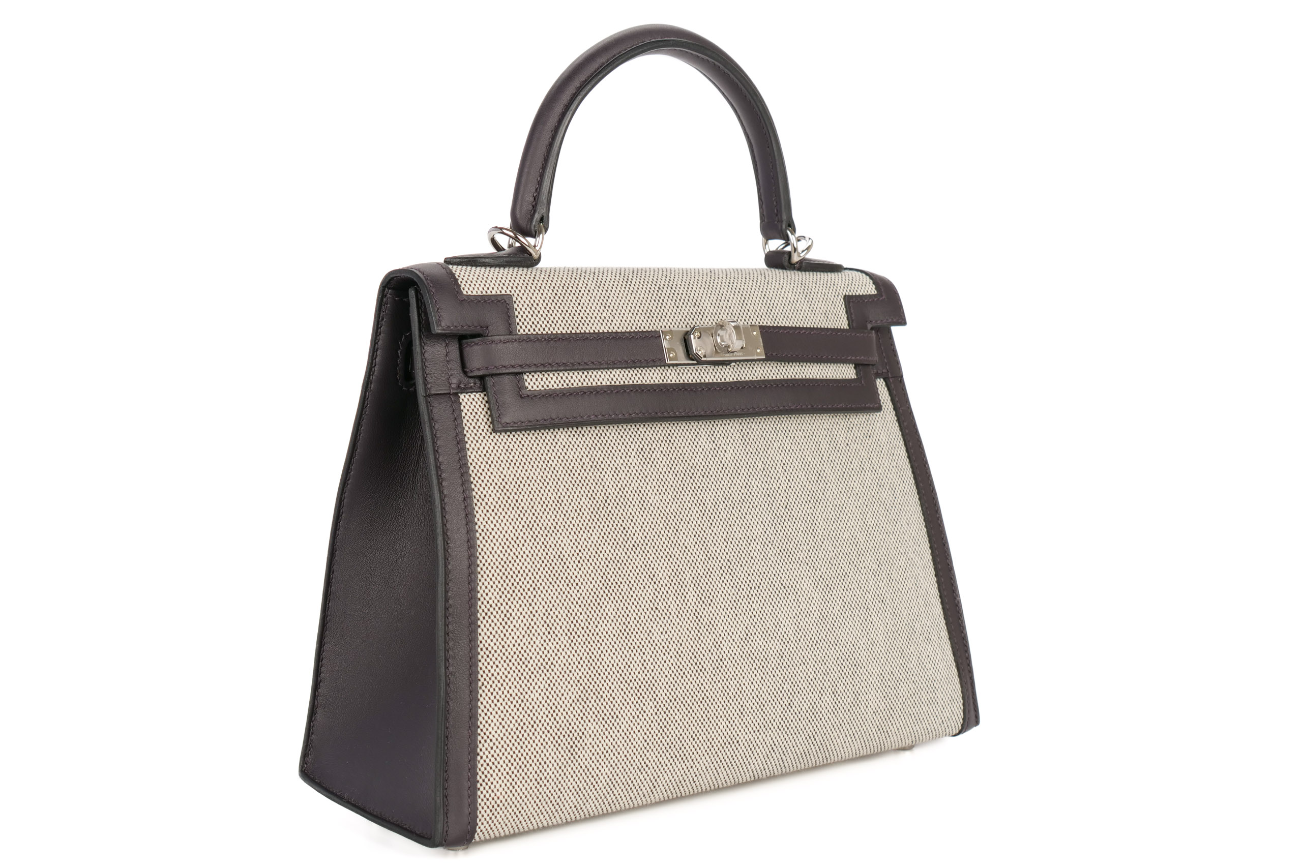 Hermès Kelly 25 Prunoir / Noir / Ecru Toile / Swift Palladium Hardware