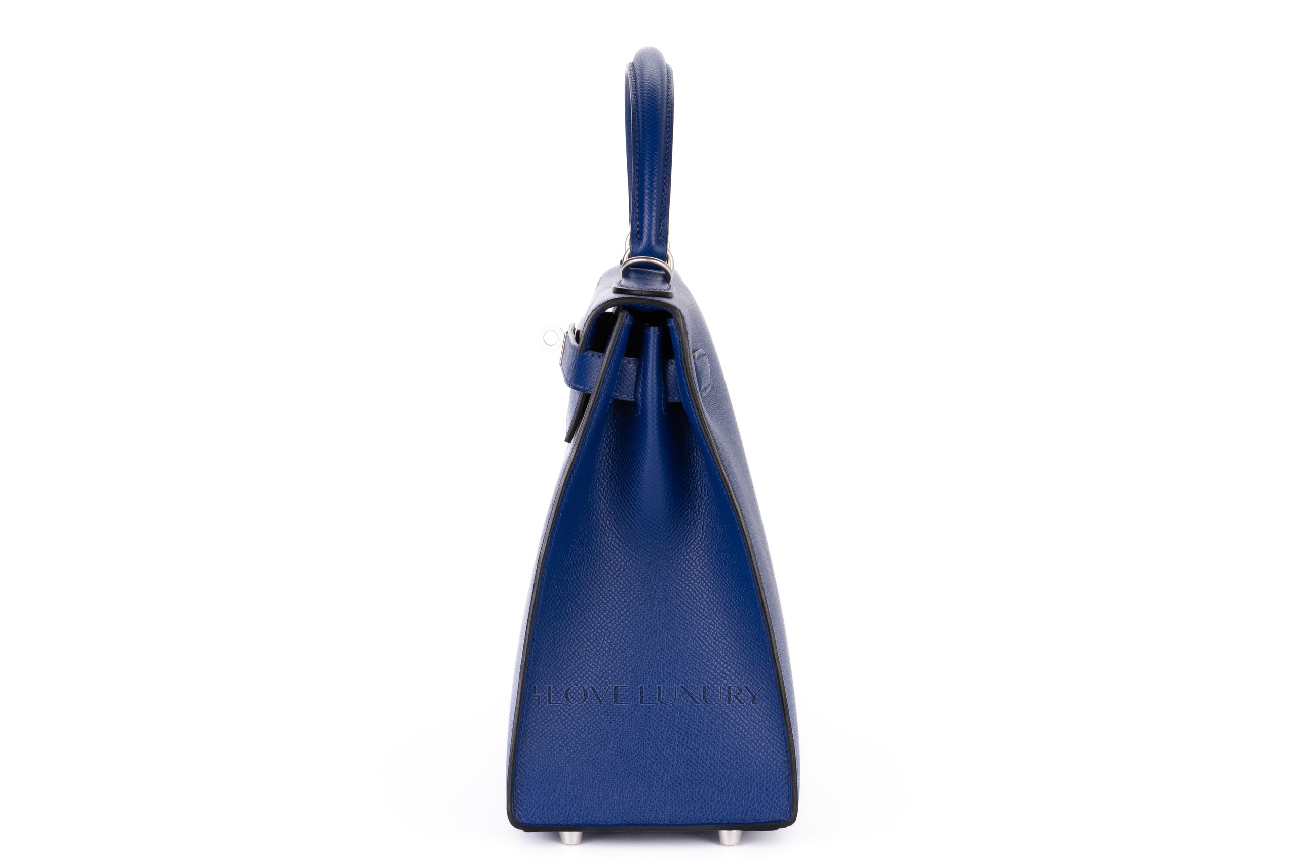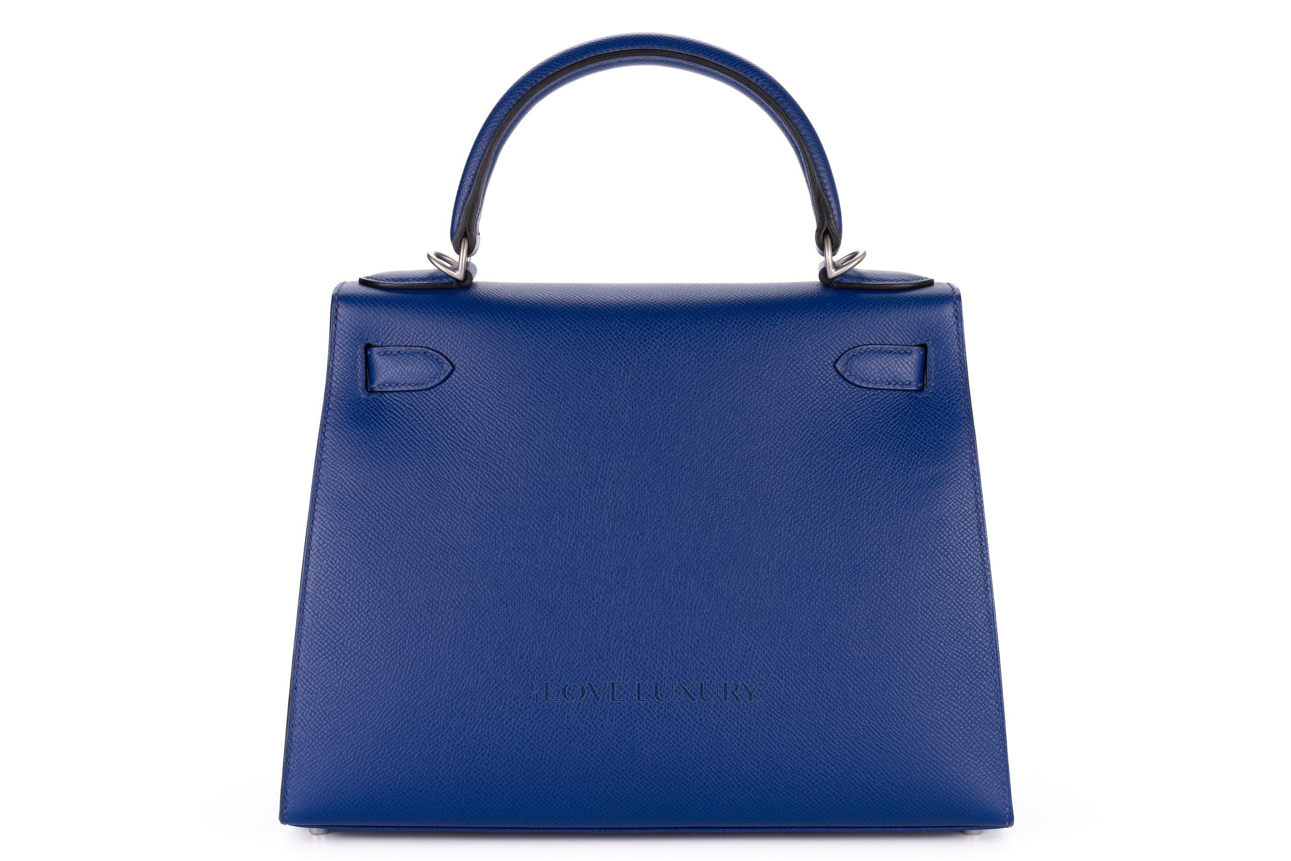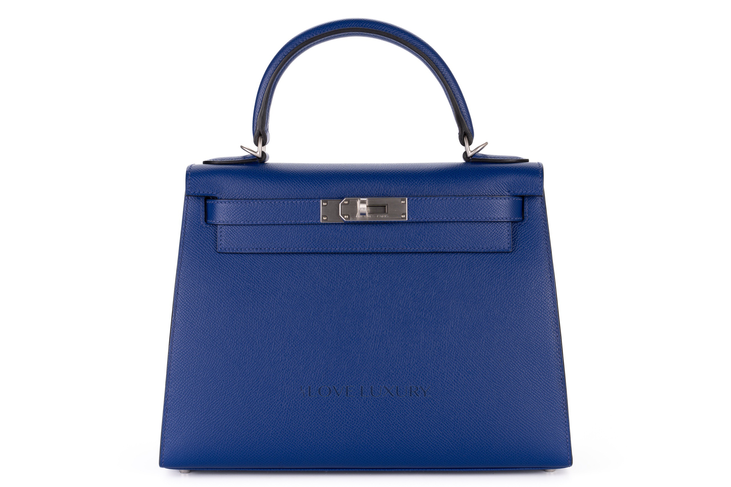 Here we have a beautiful example of the Hermès Kelly 28 in bleu electrique with brushed palladium hardware. What a stunning combination of leather, design, colour and hardware. This bag is the sellier model which is a more structured look, with clean sharp lines. This sellier model is crafted from epsom leather and comes as a full set including authentication and will reach you box fresh.