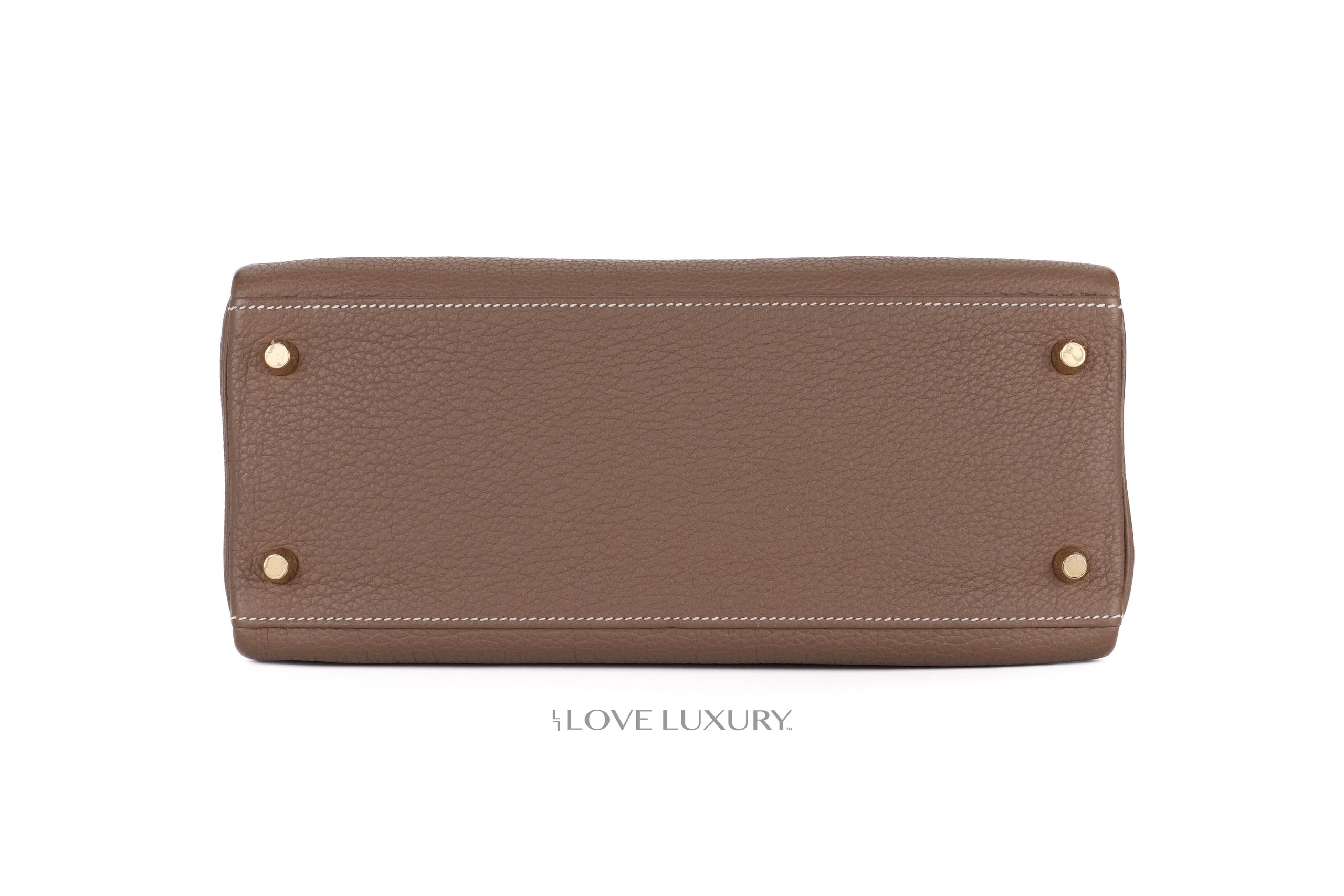 The Kelly 28 is a great bag for those of us that like to carry a little more in their bag. The sellier model is the version that has the stitching on the outside of the bag as opposed to the retourne that has the stitching inside, this is a retourne style bag in the color Etoupe and complemented with Gold hardware. This particular bag is cafted in Togo leather and is in excellent preloved condition.