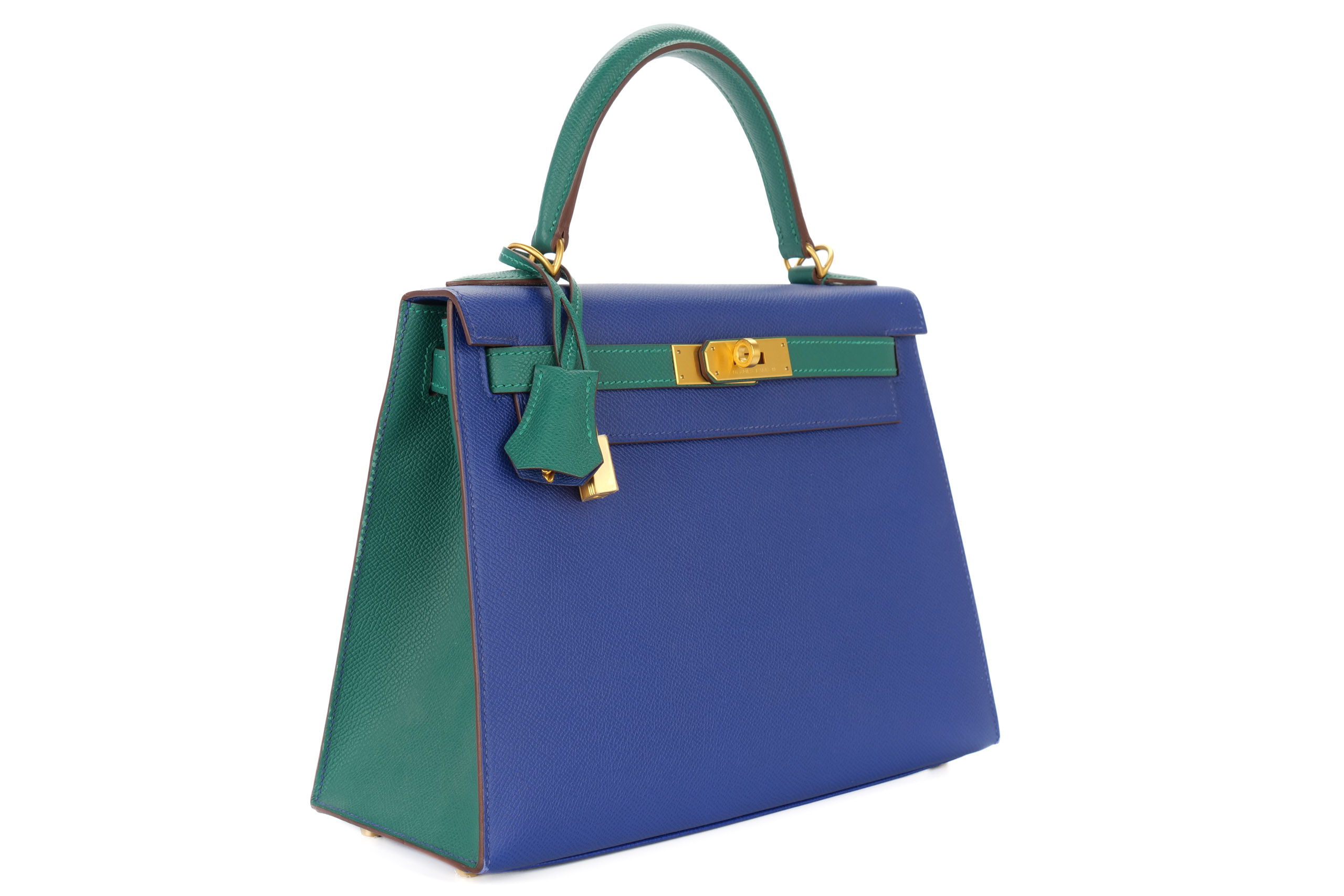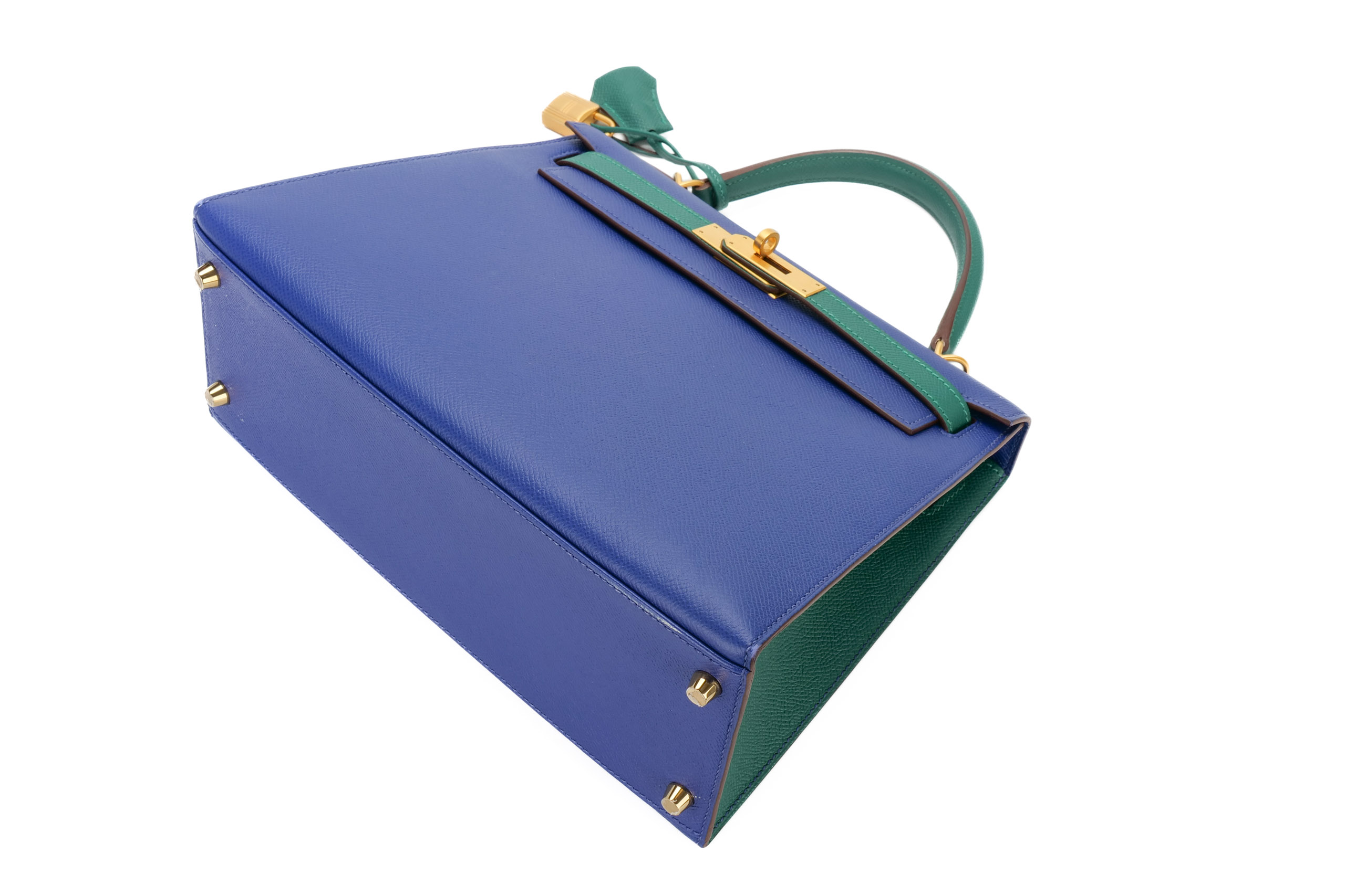 Hermès Kelly 28 Horse Shoe Stamp Bleu Electric / Malachite Epsom Brushed Gold Hardware / A Stamp 2017, Preloved