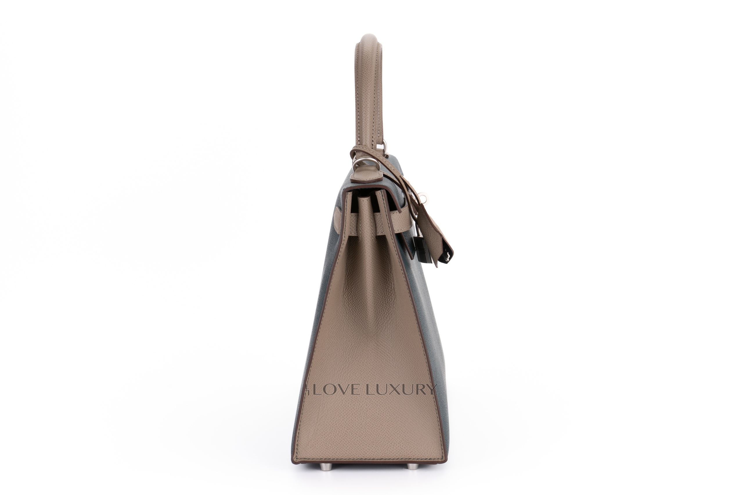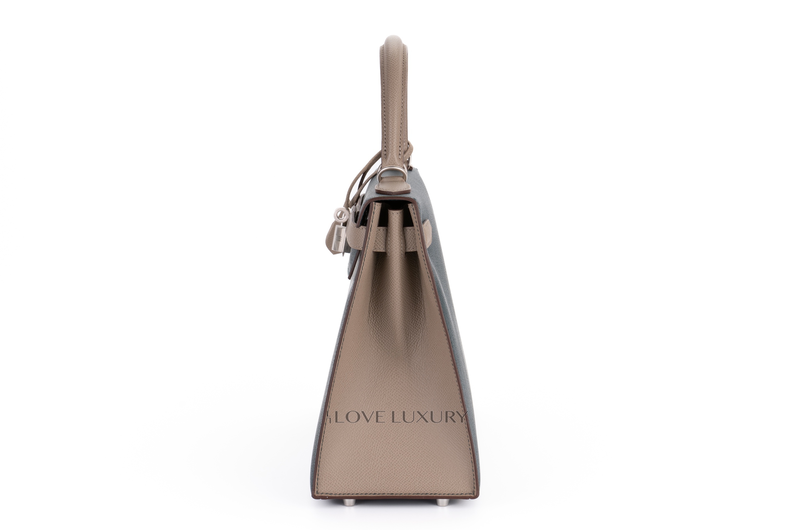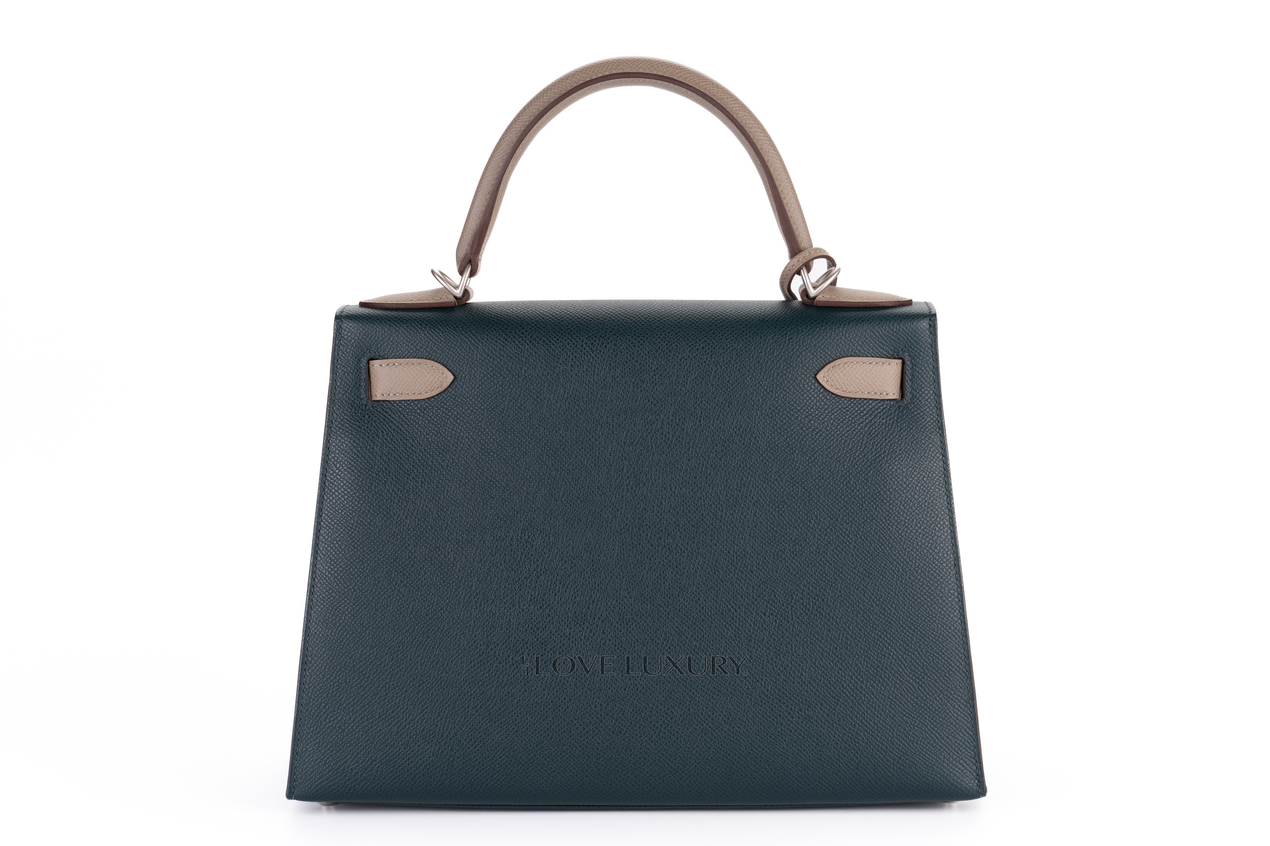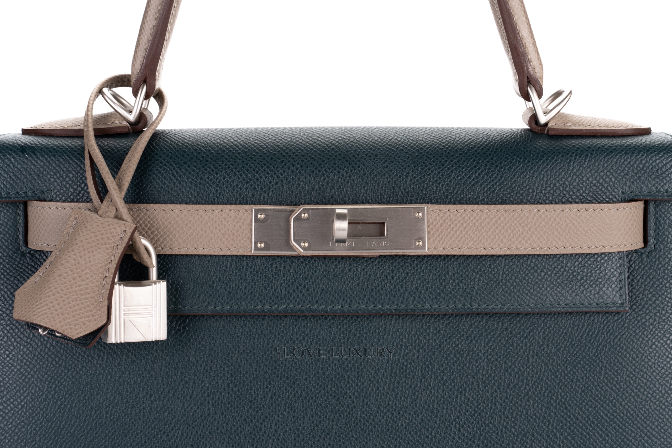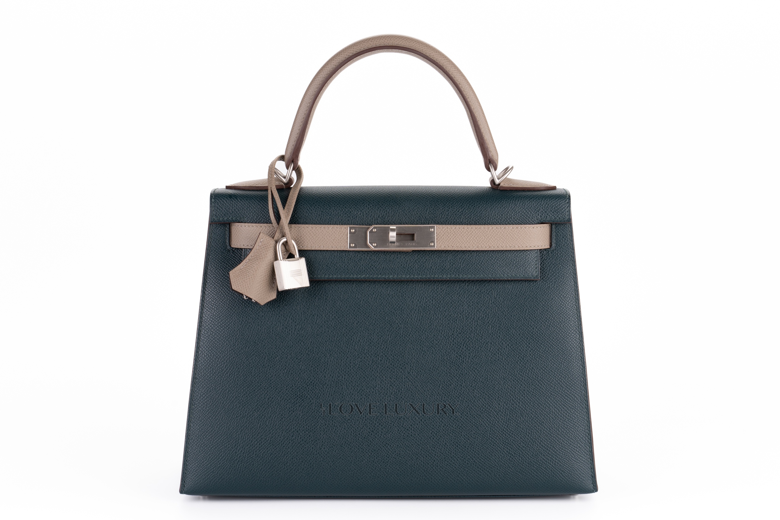 The Hermès Kelly Sellier is a highly classic model and was infat the model wich was carried by its namesake, Grace Kelly. Grace Kelly used the bag to hide her growing baby bump from paparazzi. Then the bag was re-names the Kelly. This is to this day one of the most iconic bags Hermès produce. The sellier model is a bag that has the stitching on the outside of the bag as opposed to the retourne which has the stitching inside. The Sellier model is a more formal model bag. This particular model is a very special bag, with the famous and highly sought after Horse Shoe Stamp (HSS) which means that this bag was designed by the consumer for themselves and features a tiny stamp of a horse shoe next to the Hermès Paris stamp. This model HSS is crafted from epsom leather and has brushed palladium hardware which is exceptionally rare. The colour combination is Vert Cypress and Gris Tourterelle. This bag is As New and comes as a full set.